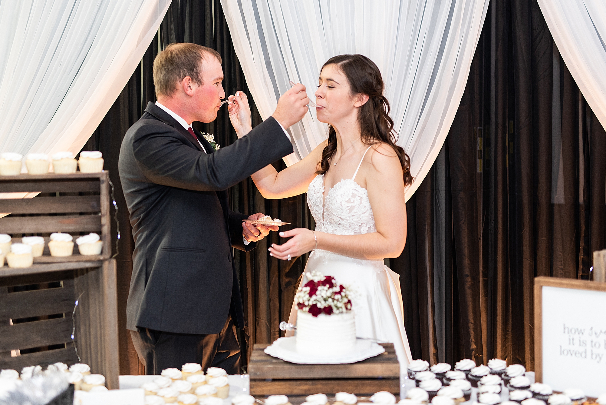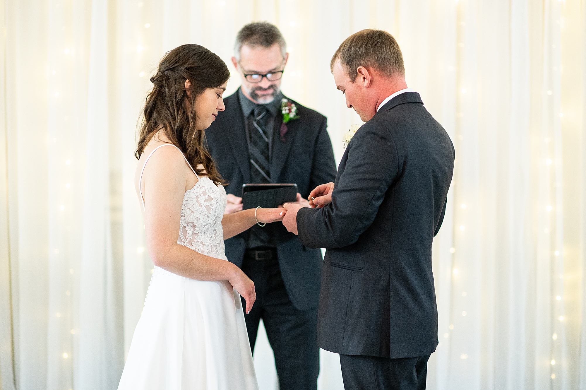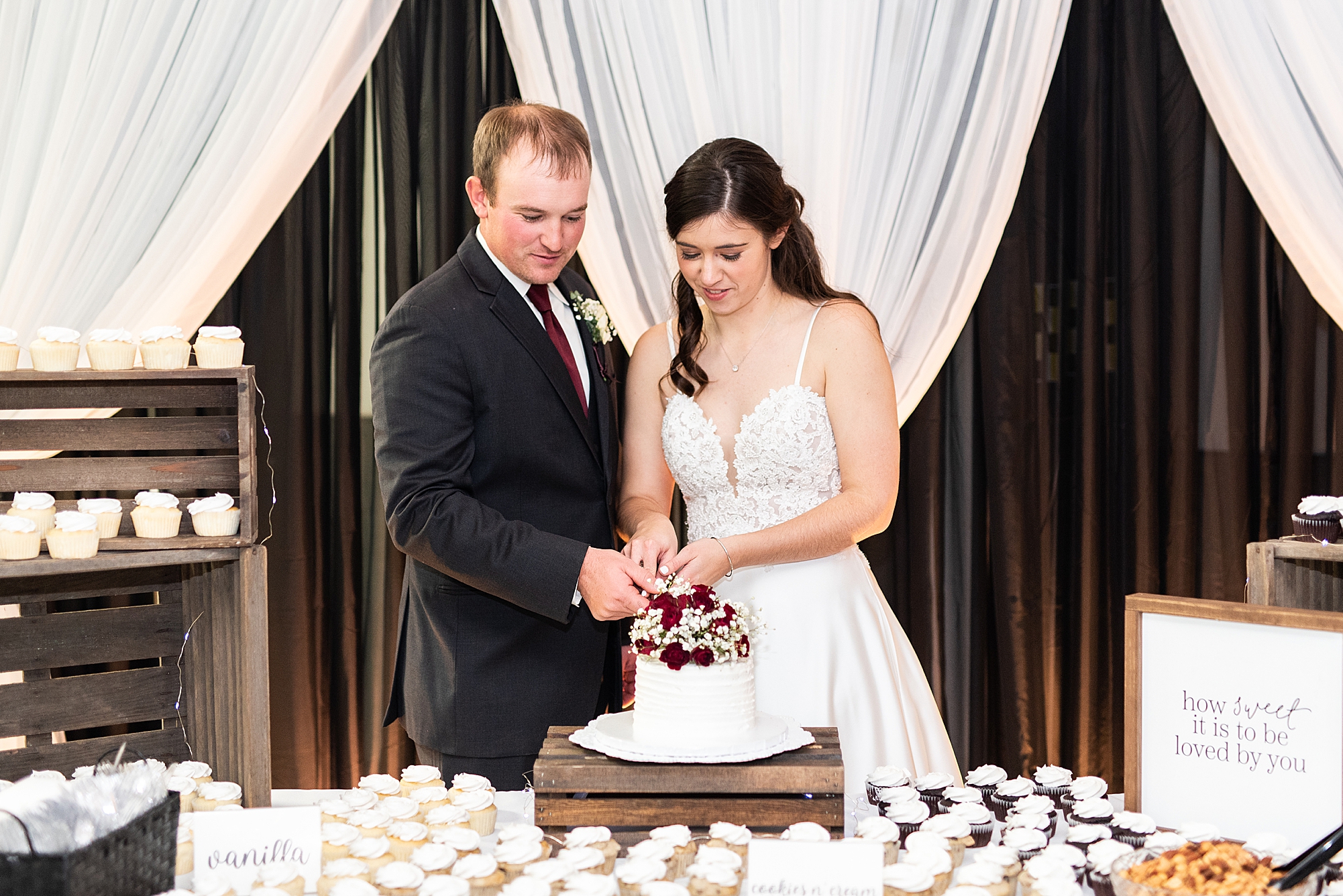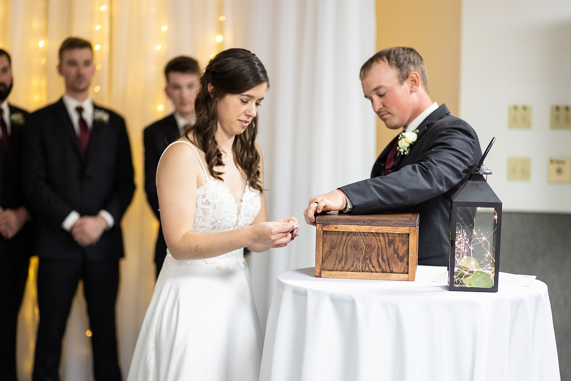 Alexis’s dad was so proud as he walked his only daughter down the aisle to a smiling Brady. Their pastor married them in an intimate ceremony with just their closest friends and family to witness it. They exchanged rings and vows and their mothers placed letters in a unity box which they sealed up to open on their first anniversary. Their fathers signed their marriage license as witnesses add even more special touches to their ceremony. Finally, Alexis and Brady shared their first kiss as husband and wife and they officially became Mr. and Mrs. Friesland!
