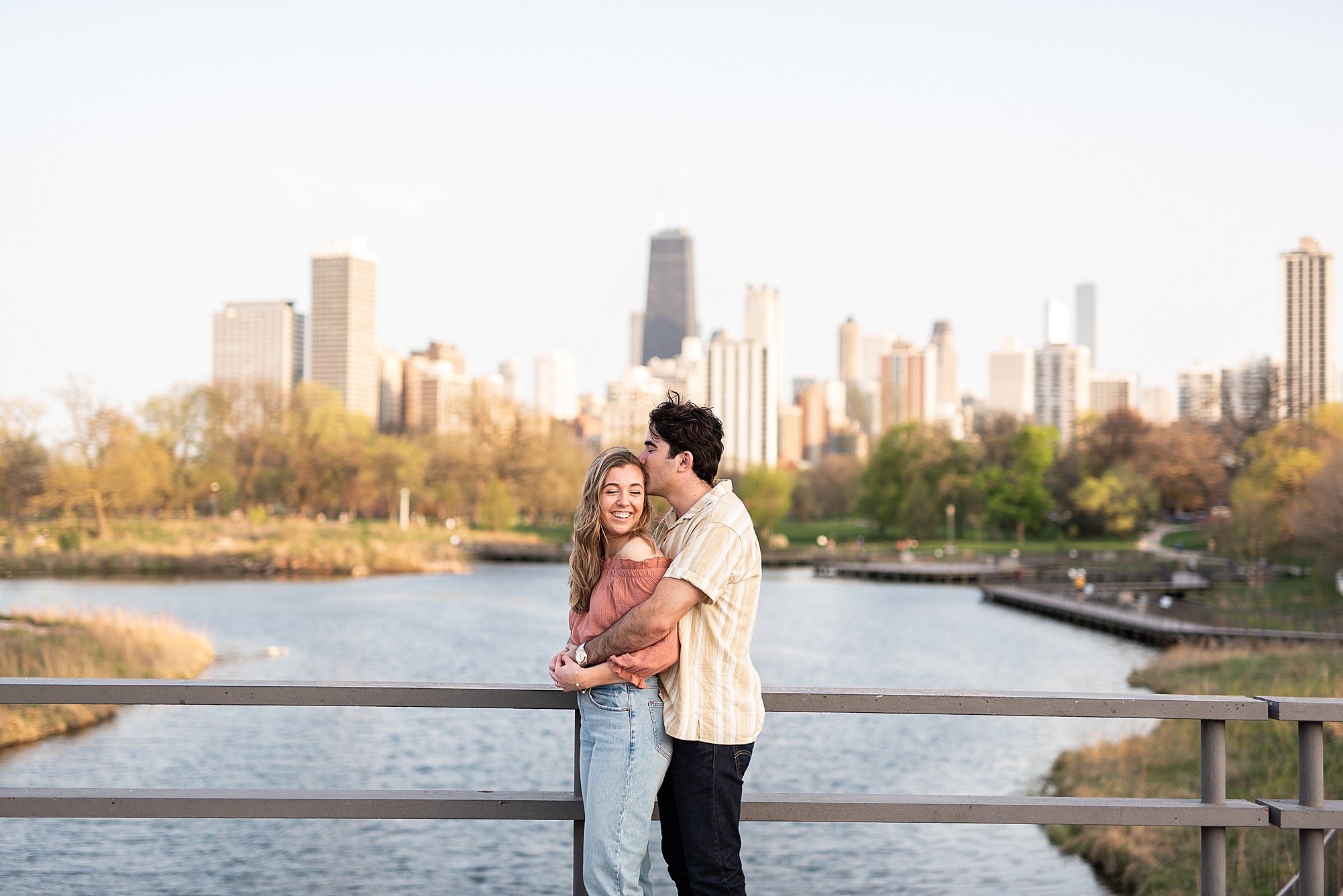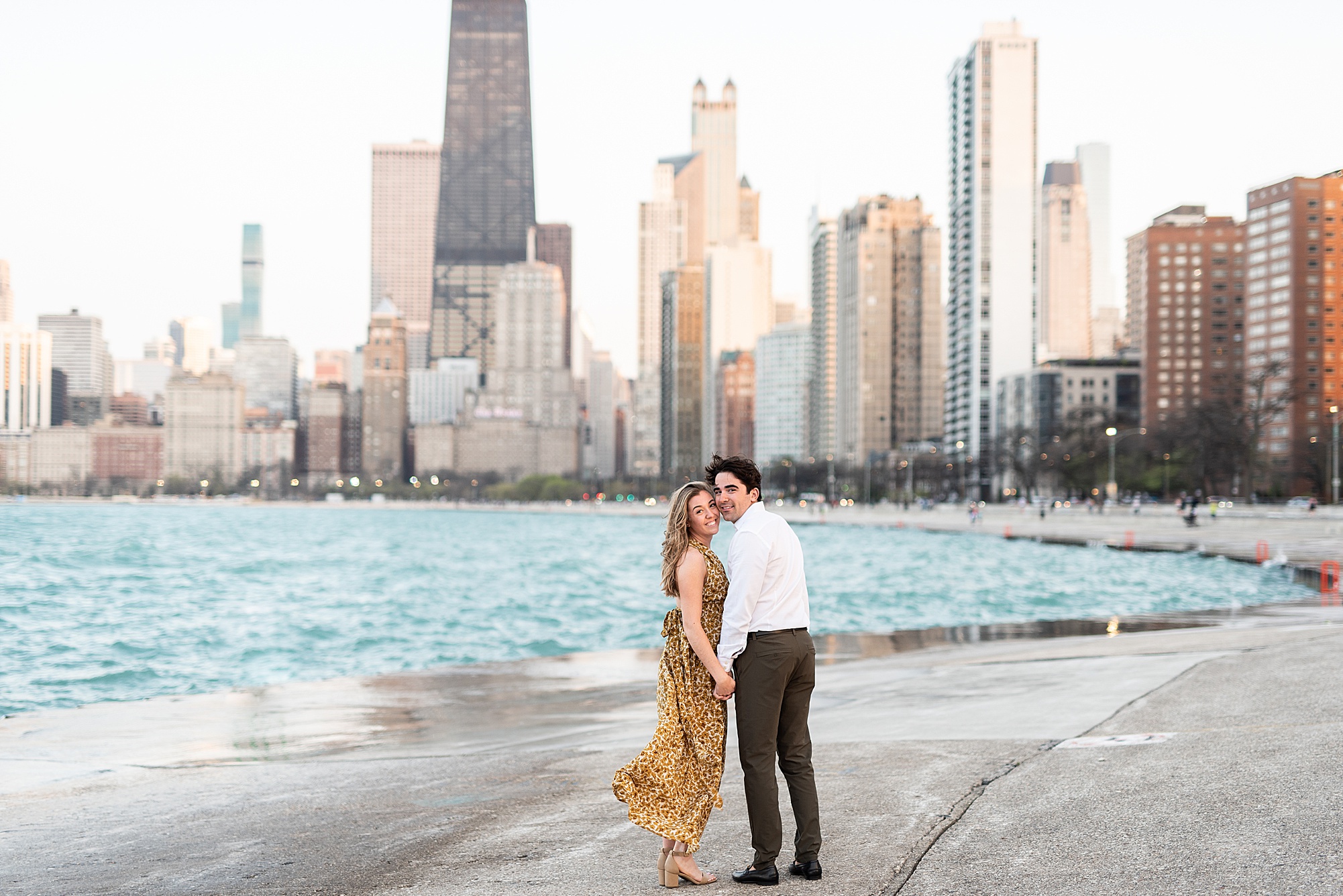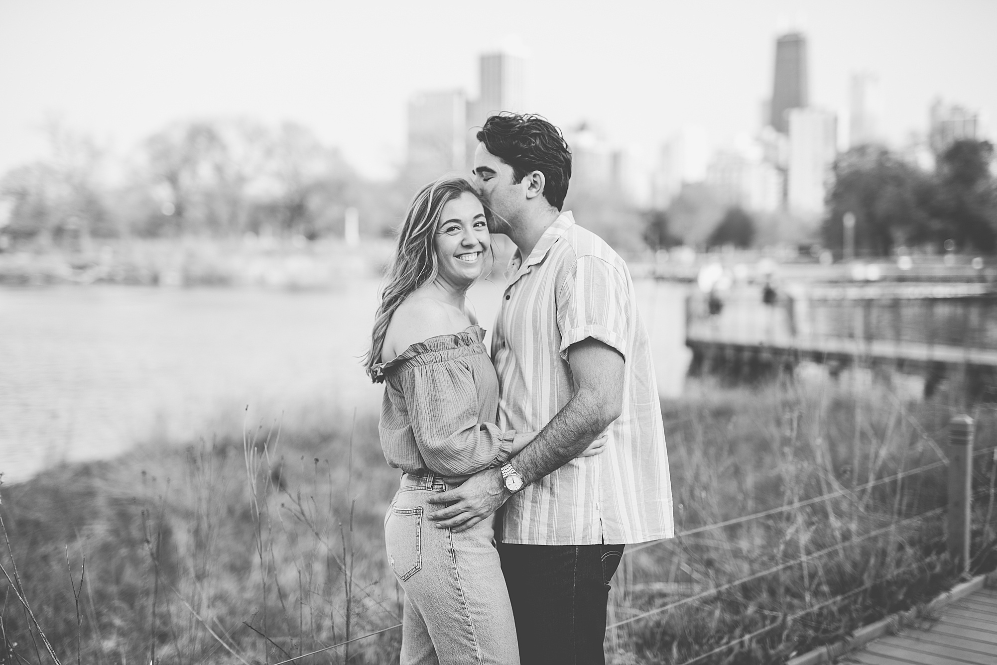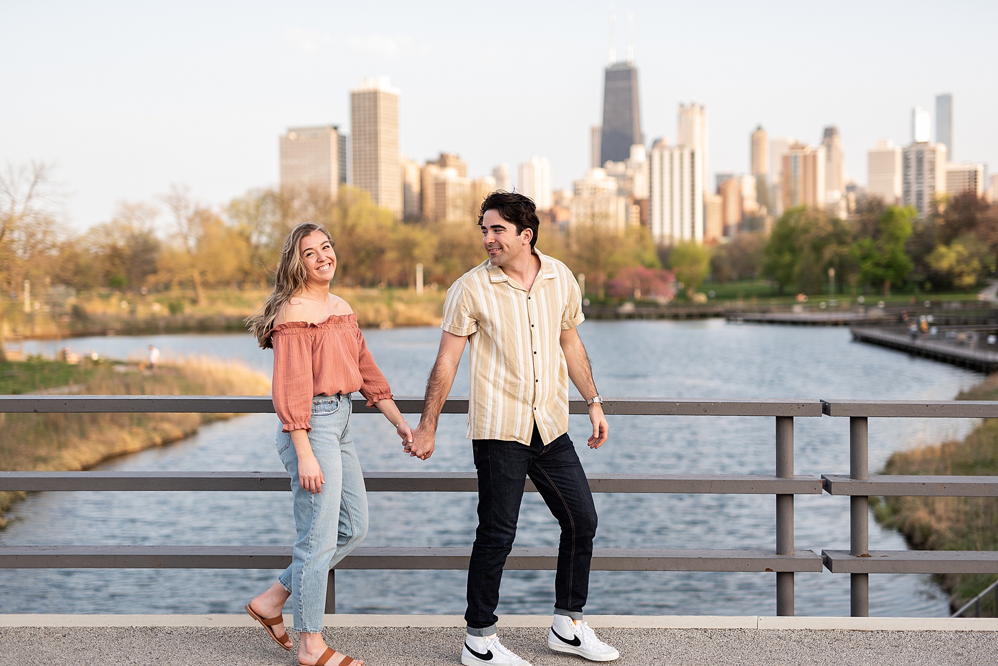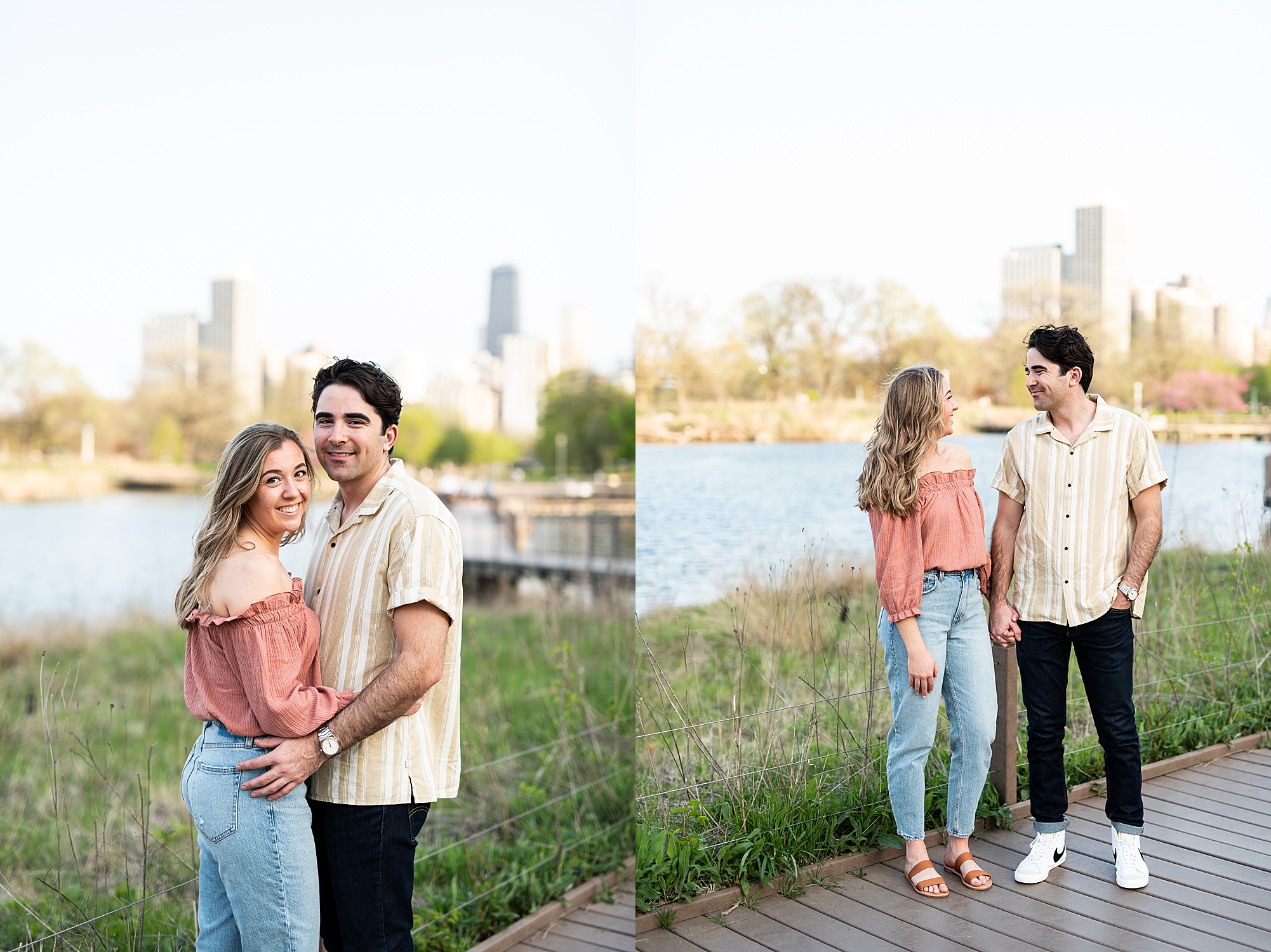 Andrea and Mickey currently live in Chicago and they love city living! One of their favorite parts is this small Italian restaurant, Lucia’s right near their apartment. They wanted to start there for their engagement session and I love new places, so I was absolutely in! They got to share a cannoli and take a few pictures in one of their favorite date night spots before we headed down to Lincoln Park Nature Boardwalk. These two are getting married in the country in Springfield next summer, so it was important to have the city as their backdrop for engagement photos. Lincoln Park was the perfect spot to capture them with a little nature and then finally we made it to North Avenue Beach for some skyline shots! We had a very windy night to deal with, but these two totally rocked it and kept laughing through it all. I seriously gushed at how cute they are together!