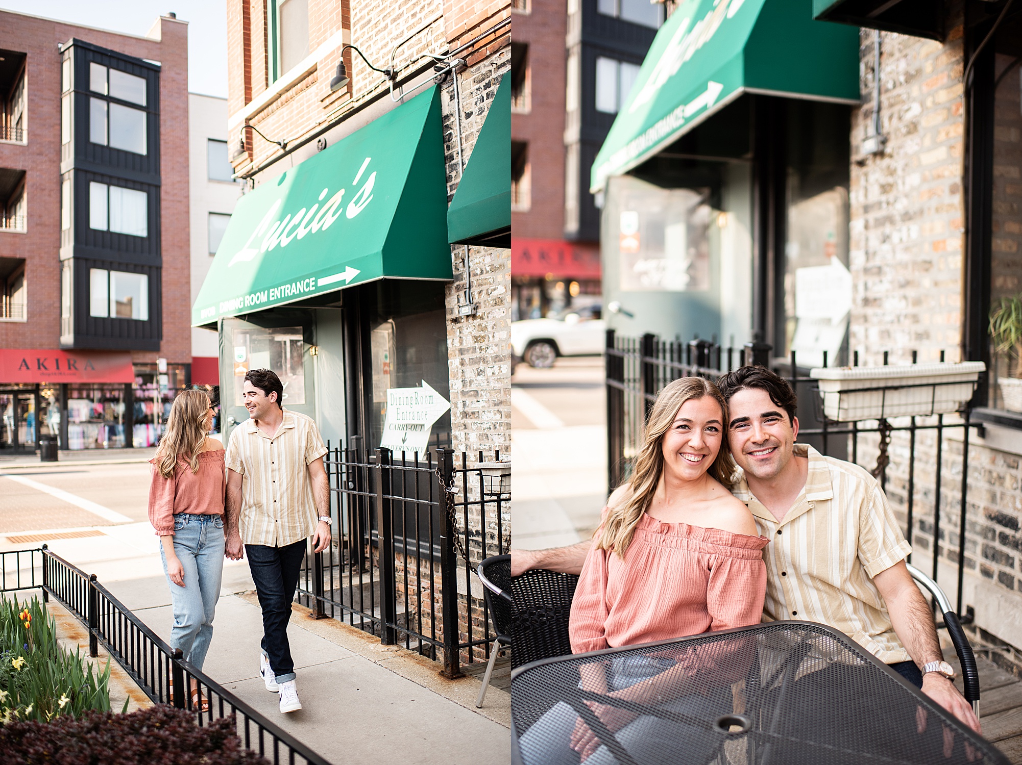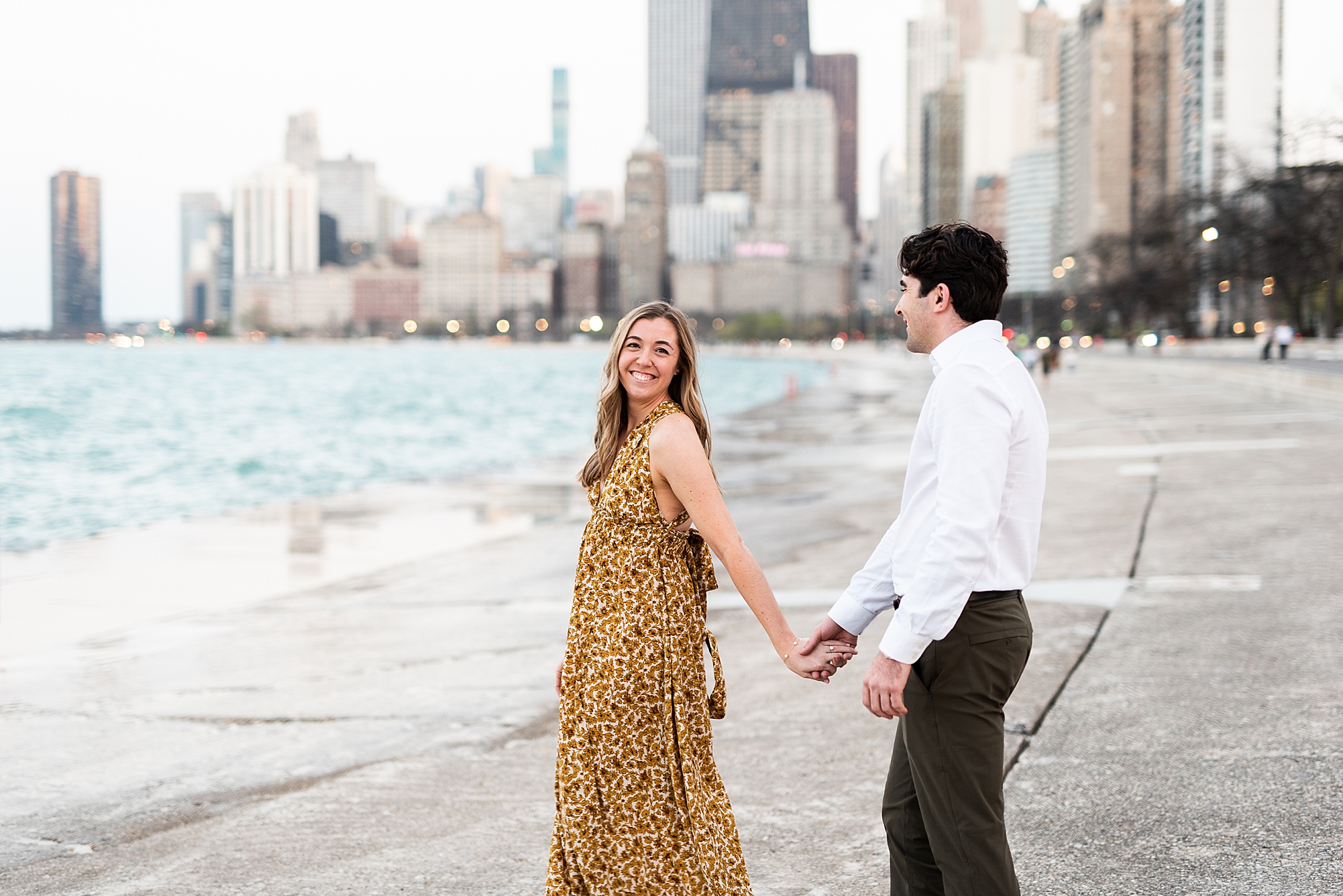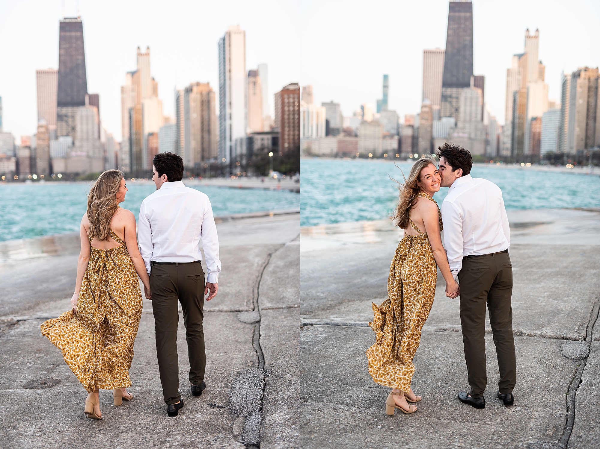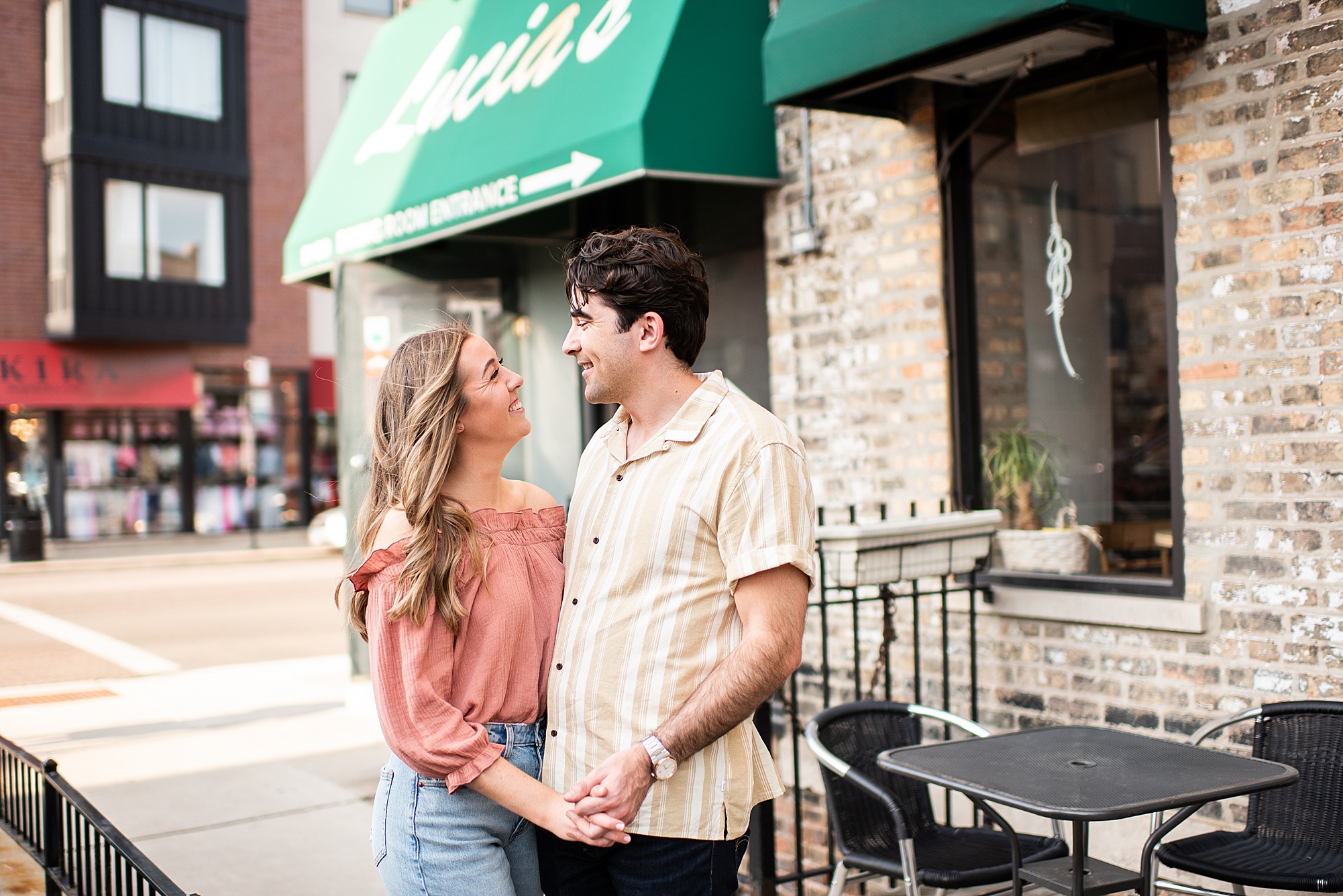 Andrea and Mickey currently live in Chicago and they love city living! One of their favorite parts is this small Italian restaurant, Lucia’s right near their apartment. They wanted to start there for their engagement session and I love new places, so I was absolutely in! They got to share a cannoli and take a few pictures in one of their favorite date night spots before we headed down to Lincoln Park Nature Boardwalk. These two are getting married in the country in Springfield next summer, so it was important to have the city as their backdrop for engagement photos. Lincoln Park was the perfect spot to capture them with a little nature and then finally we made it to North Avenue Beach for some skyline shots! We had a very windy night to deal with, but these two totally rocked it and kept laughing through it all. I seriously gushed at how cute they are together!