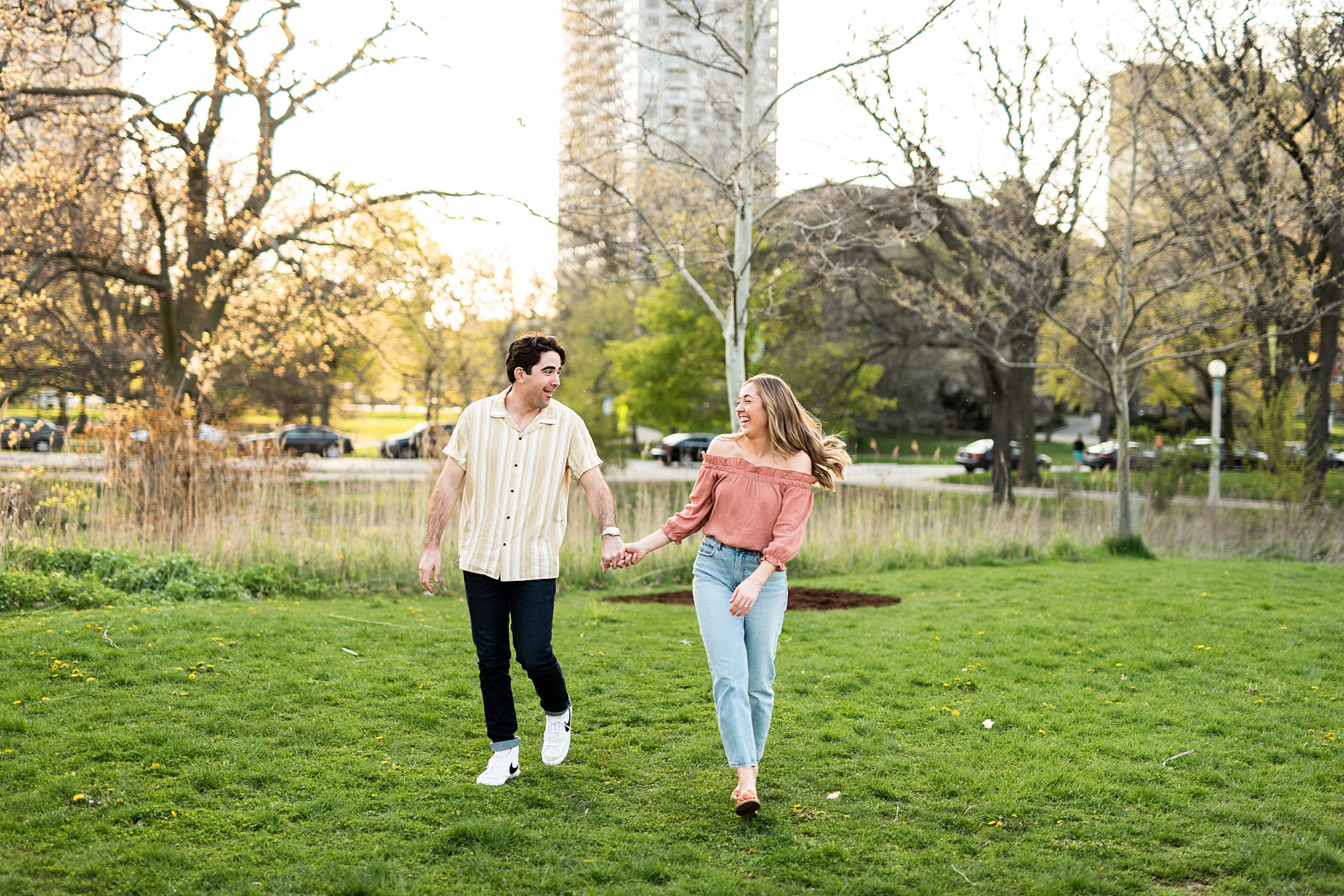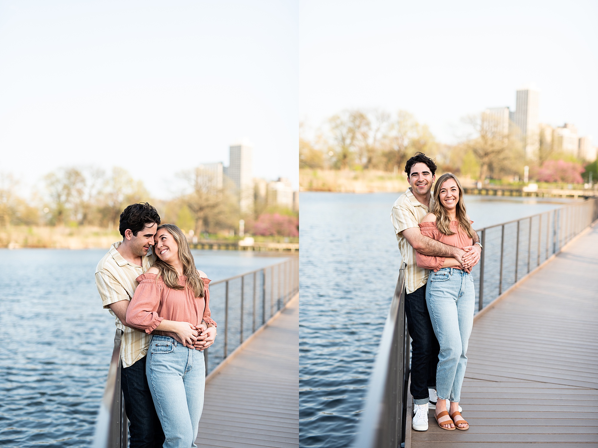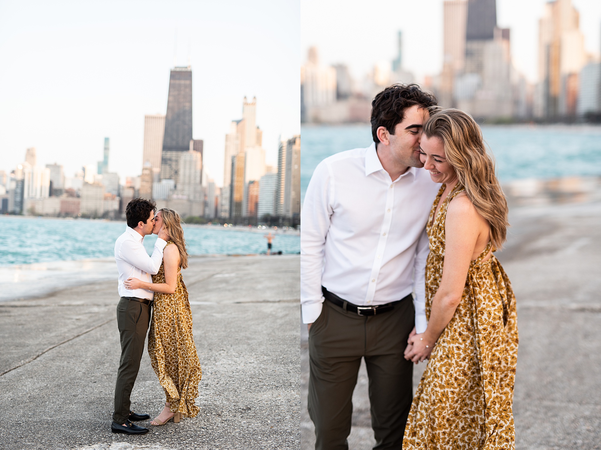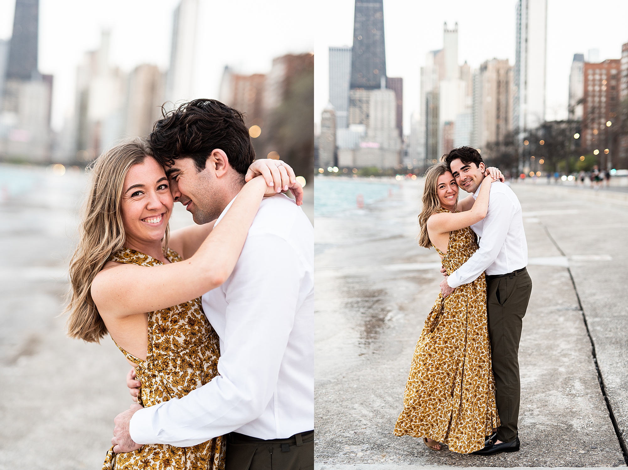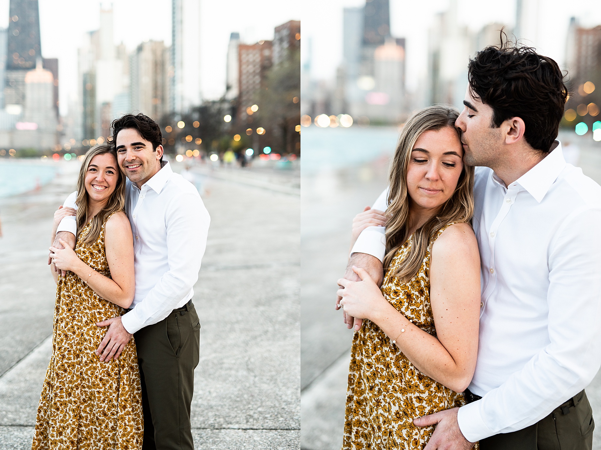 Andrea and Mickey currently live in Chicago and they love city living! One of their favorite parts is this small Italian restaurant, Lucia’s right near their apartment. They wanted to start there for their engagement session and I love new places, so I was absolutely in! They got to share a cannoli and take a few pictures in one of their favorite date night spots before we headed down to Lincoln Park Nature Boardwalk. These two are getting married in the country in Springfield next summer, so it was important to have the city as their backdrop for engagement photos. Lincoln Park was the perfect spot to capture them with a little nature and then finally we made it to North Avenue Beach for some skyline shots! We had a very windy night to deal with, but these two totally rocked it and kept laughing through it all. I seriously gushed at how cute they are together!