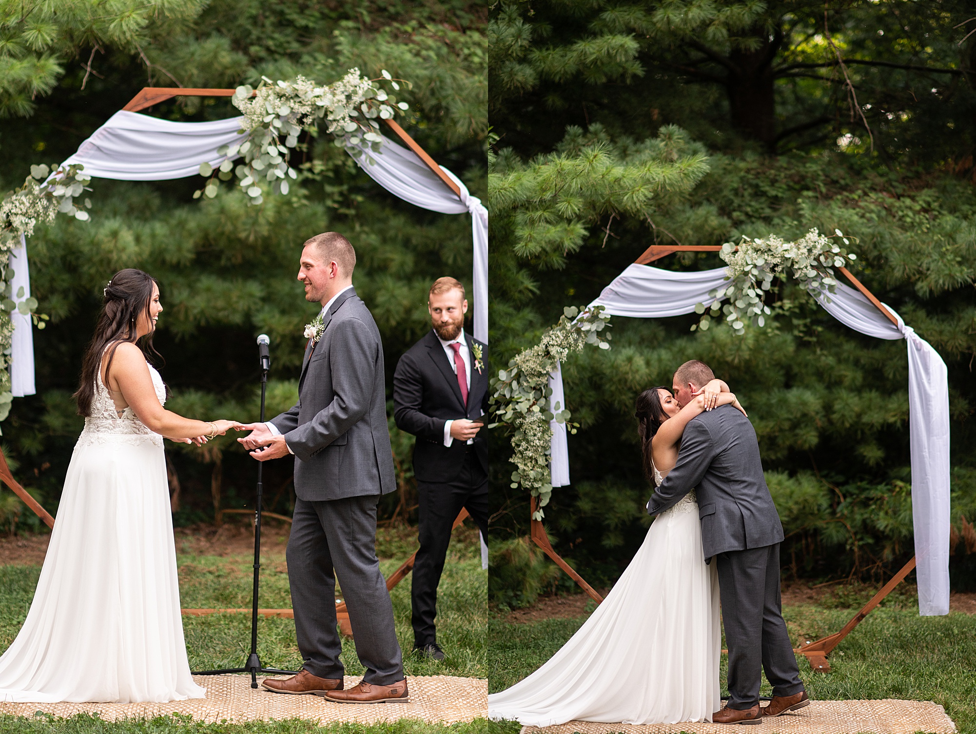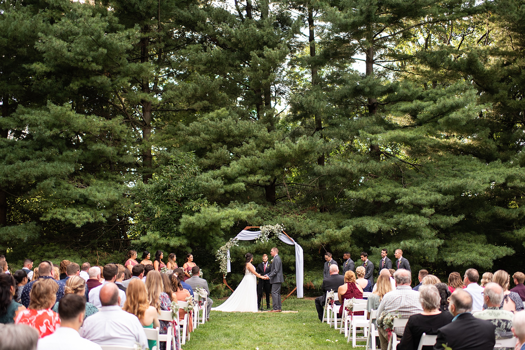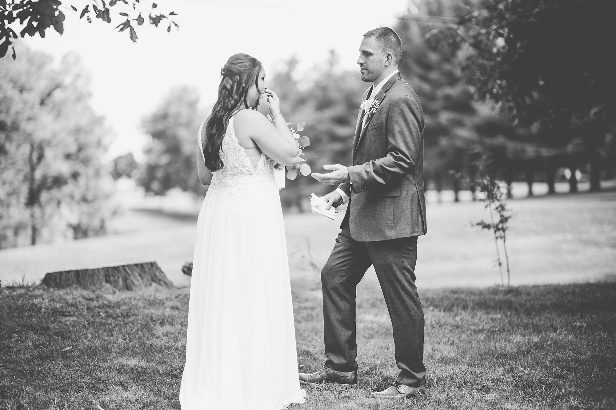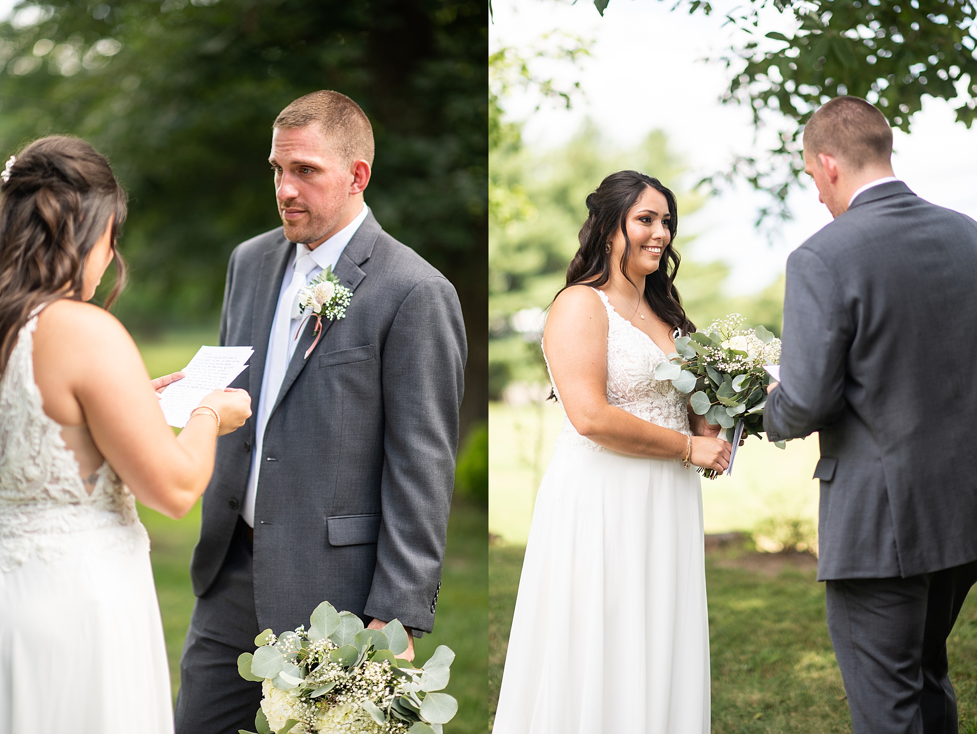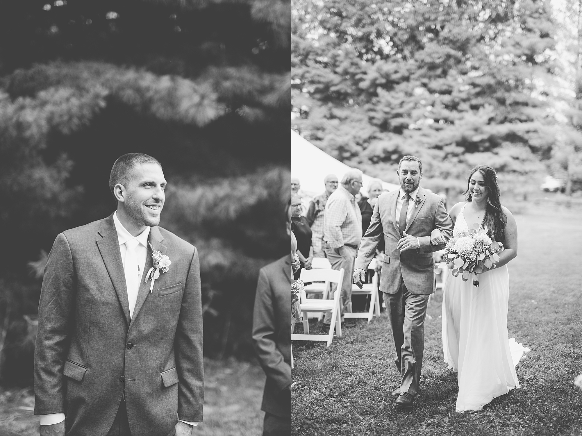 Fast forward to their wedding day, a warm and sunny summer day. Ashley and David decided to throw their celebration in such a special place to them, David’s parents’ pasture in front of their house! They had a gorgeous ceremony site set up among the trees and a beautiful tent to host their reception. After they both finished getting ready, they met in the front yard for an adorable and unexpectedly emotional first look. Ashley and David told us they weren’t exactly the emotional type, but a few happy tears were shed when they finally got to see each other and read their private vows.