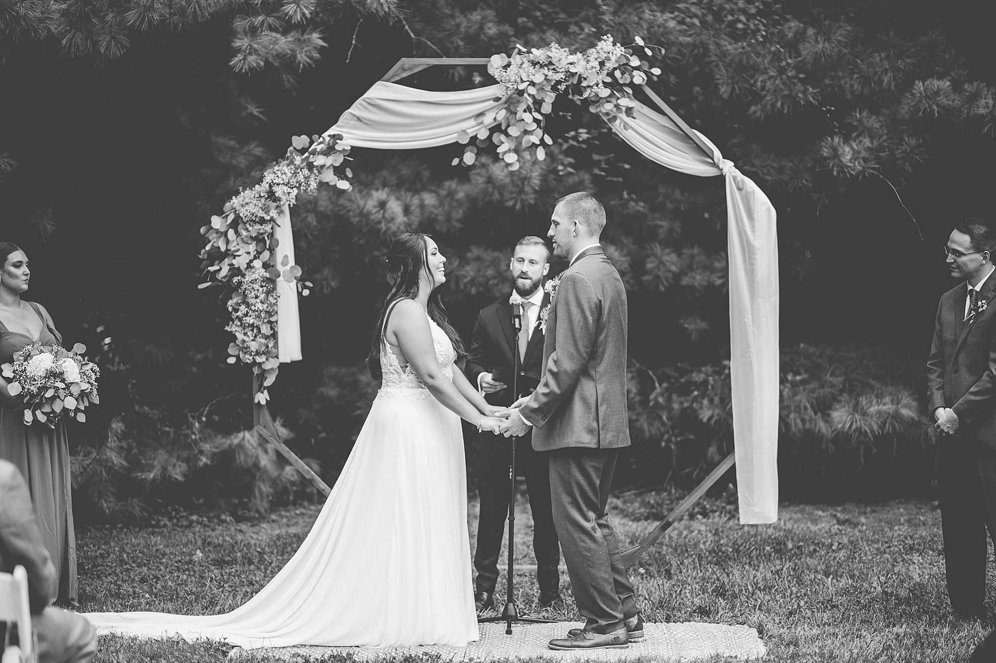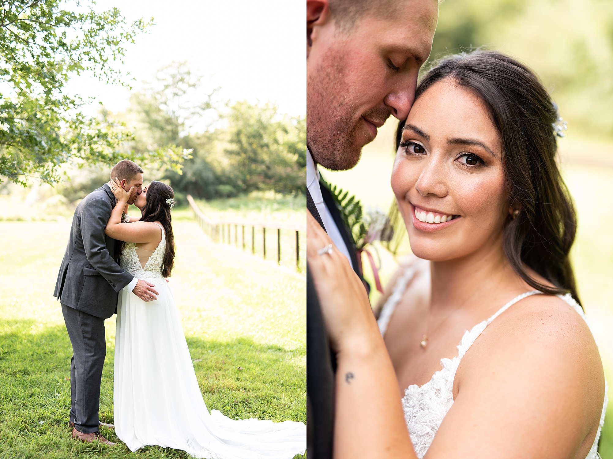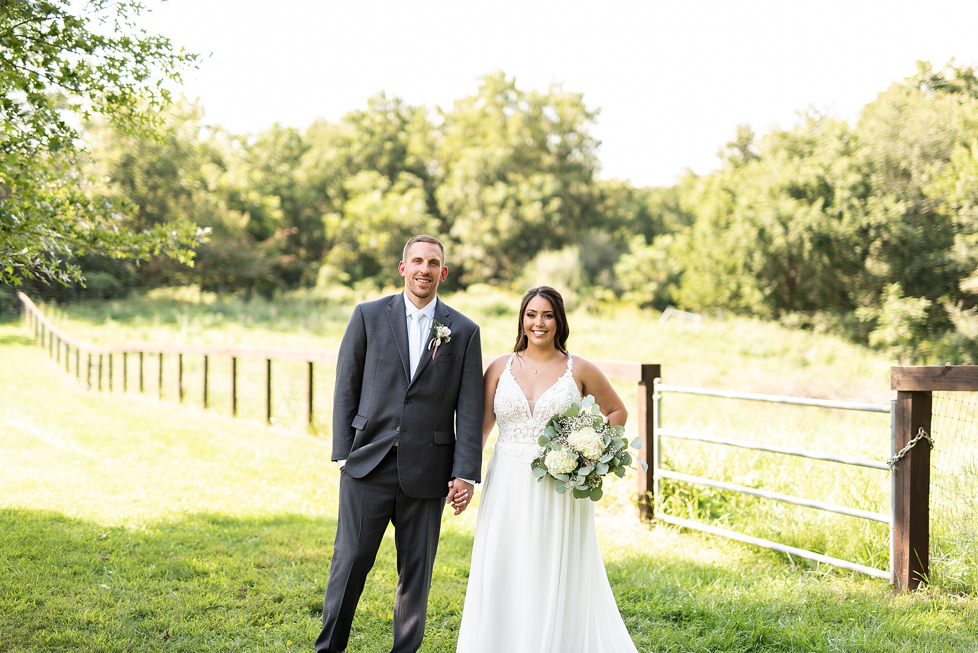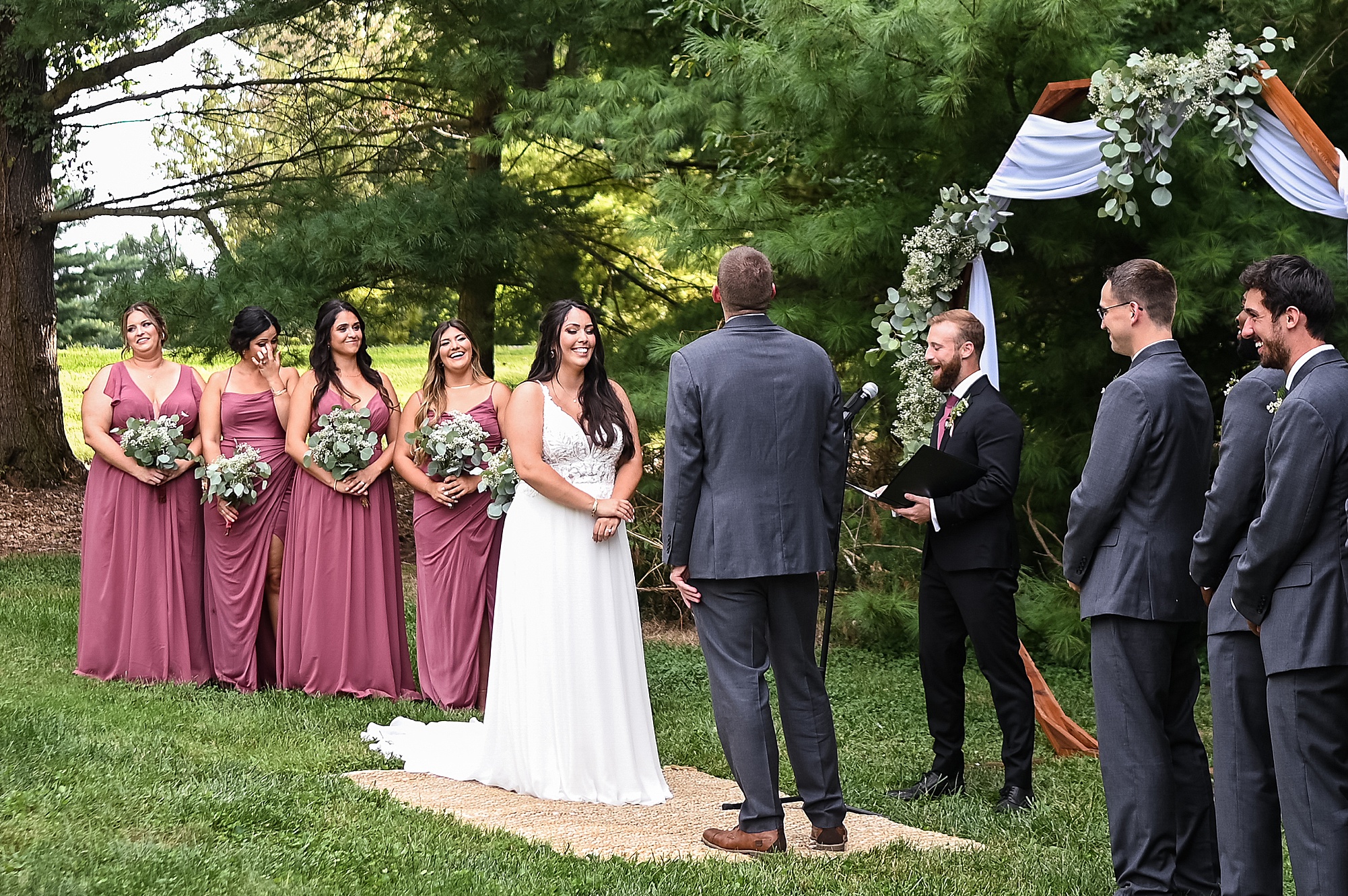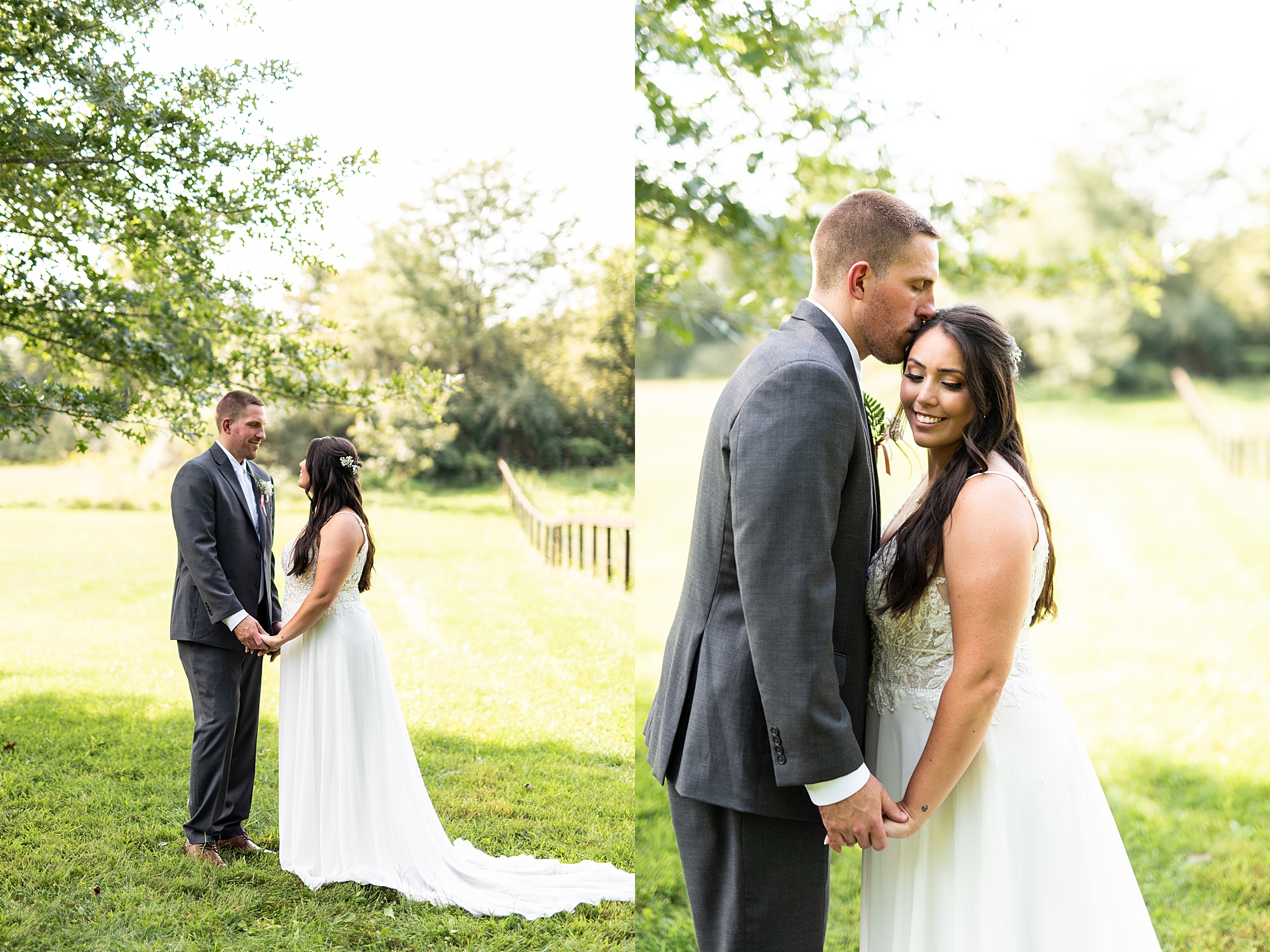 Fast forward to their wedding day, a warm and sunny summer day. Ashley and David decided to throw their celebration in such a special place to them, David’s parents’ pasture in front of their house! They had a gorgeous ceremony site set up among the trees and a beautiful tent to host their reception. After they both finished getting ready, they met in the front yard for an adorable and unexpectedly emotional first look. Ashley and David told us they weren’t exactly the emotional type, but a few happy tears were shed when they finally got to see each other and read their private vows.
