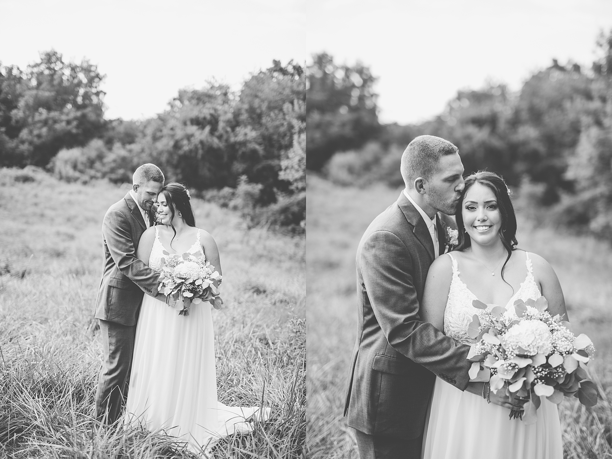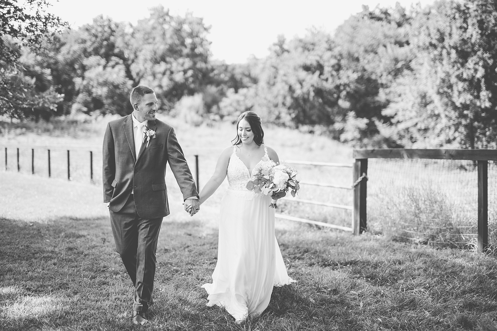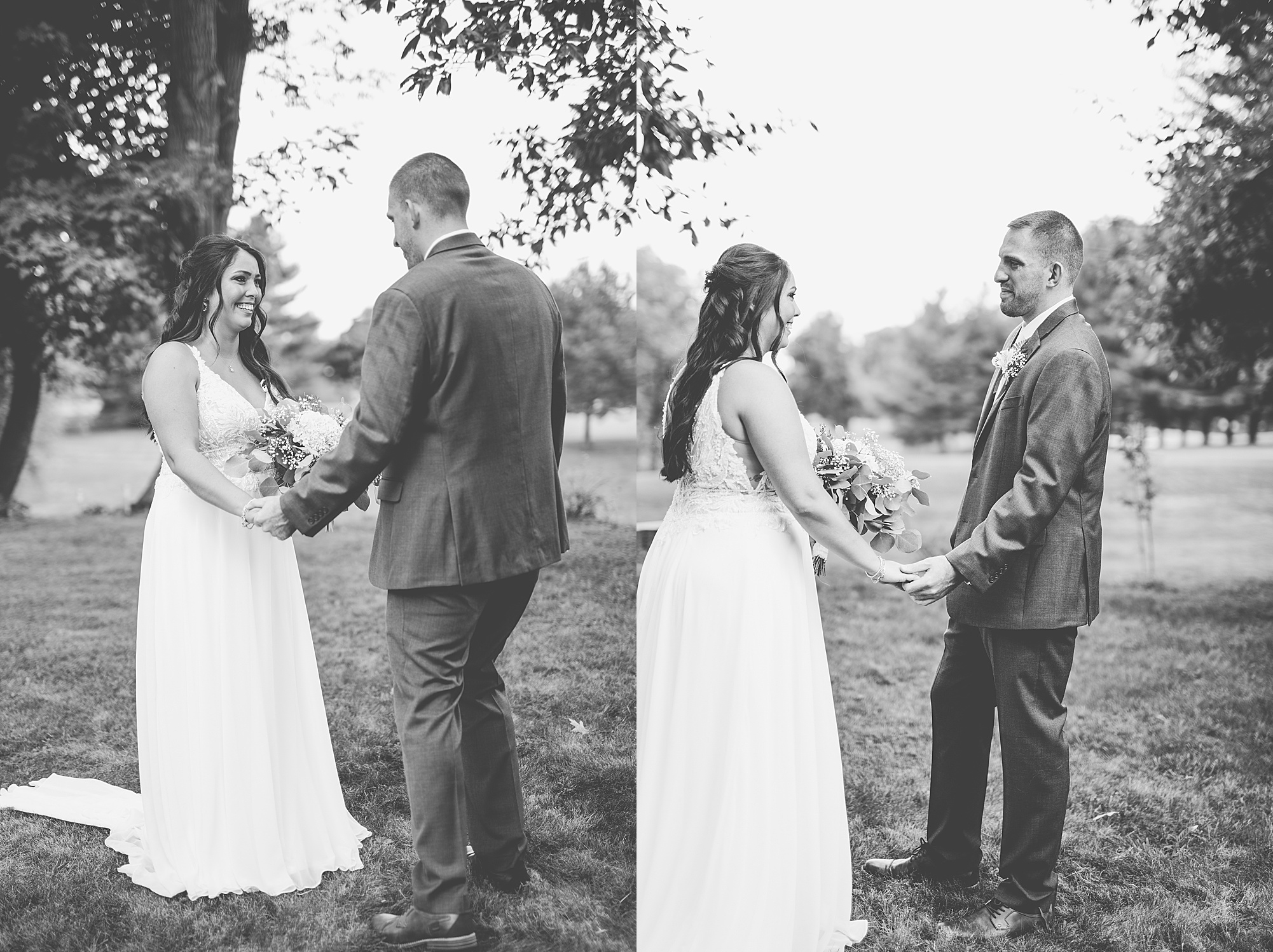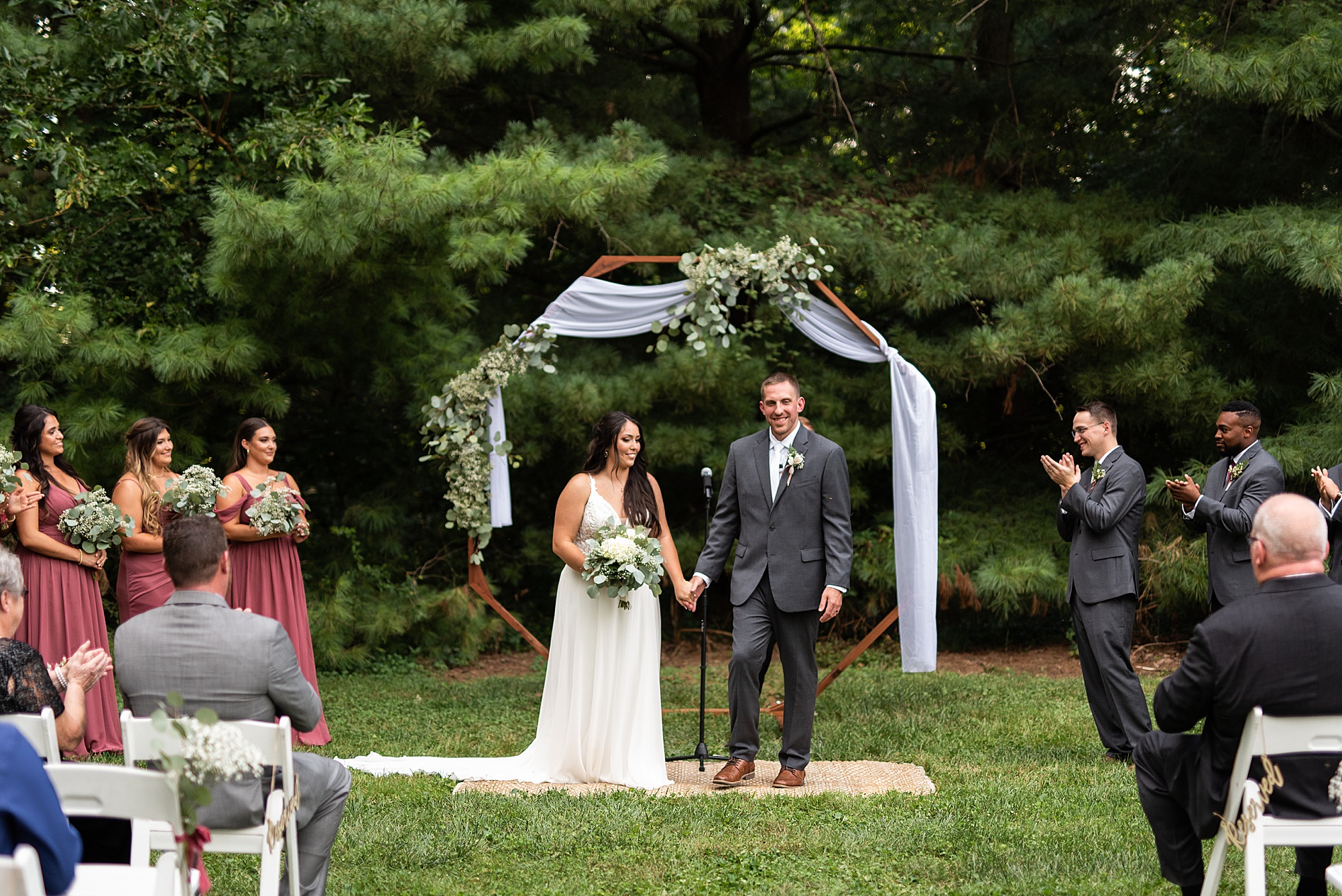 Fast forward to their wedding day, a warm and sunny summer day. Ashley and David decided to throw their celebration in such a special place to them, David’s parents’ pasture in front of their house! They had a gorgeous ceremony site set up among the trees and a beautiful tent to host their reception. After they both finished getting ready, they met in the front yard for an adorable and unexpectedly emotional first look. Ashley and David told us they weren’t exactly the emotional type, but a few happy tears were shed when they finally got to see each other and read their private vows.