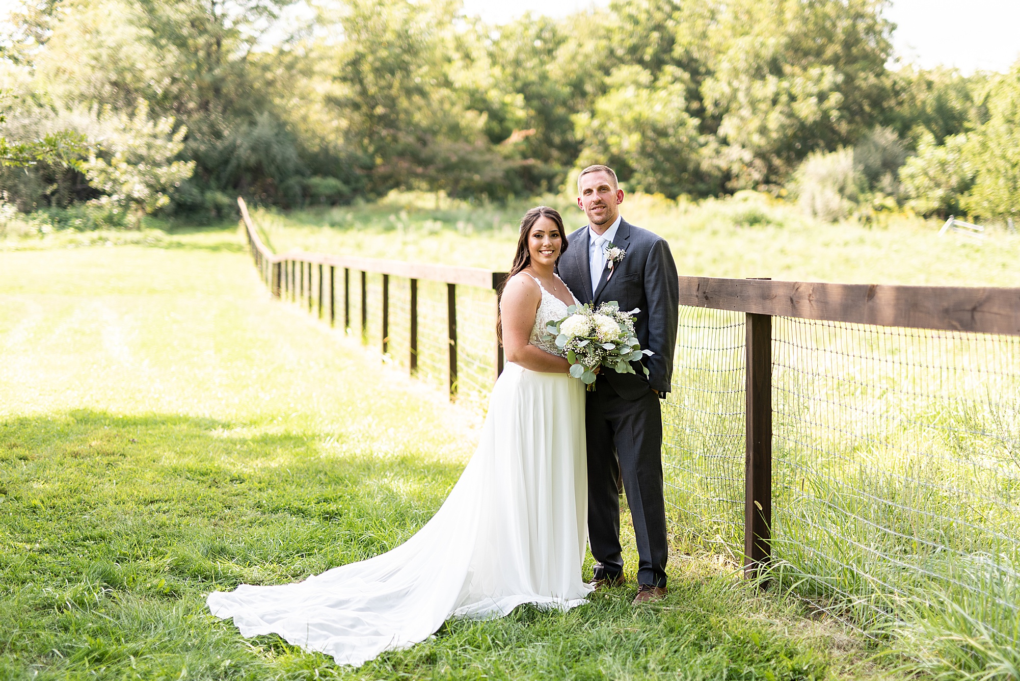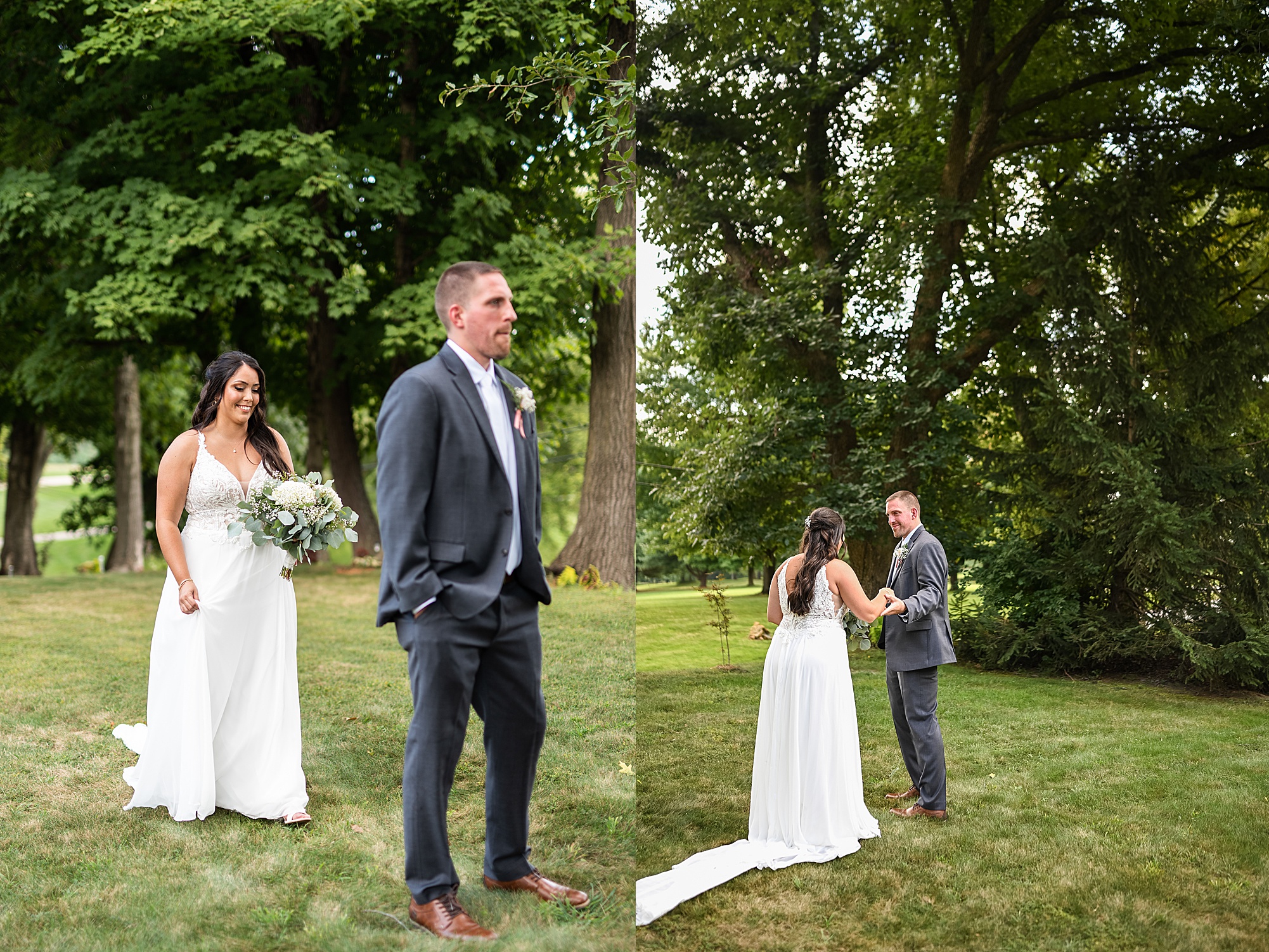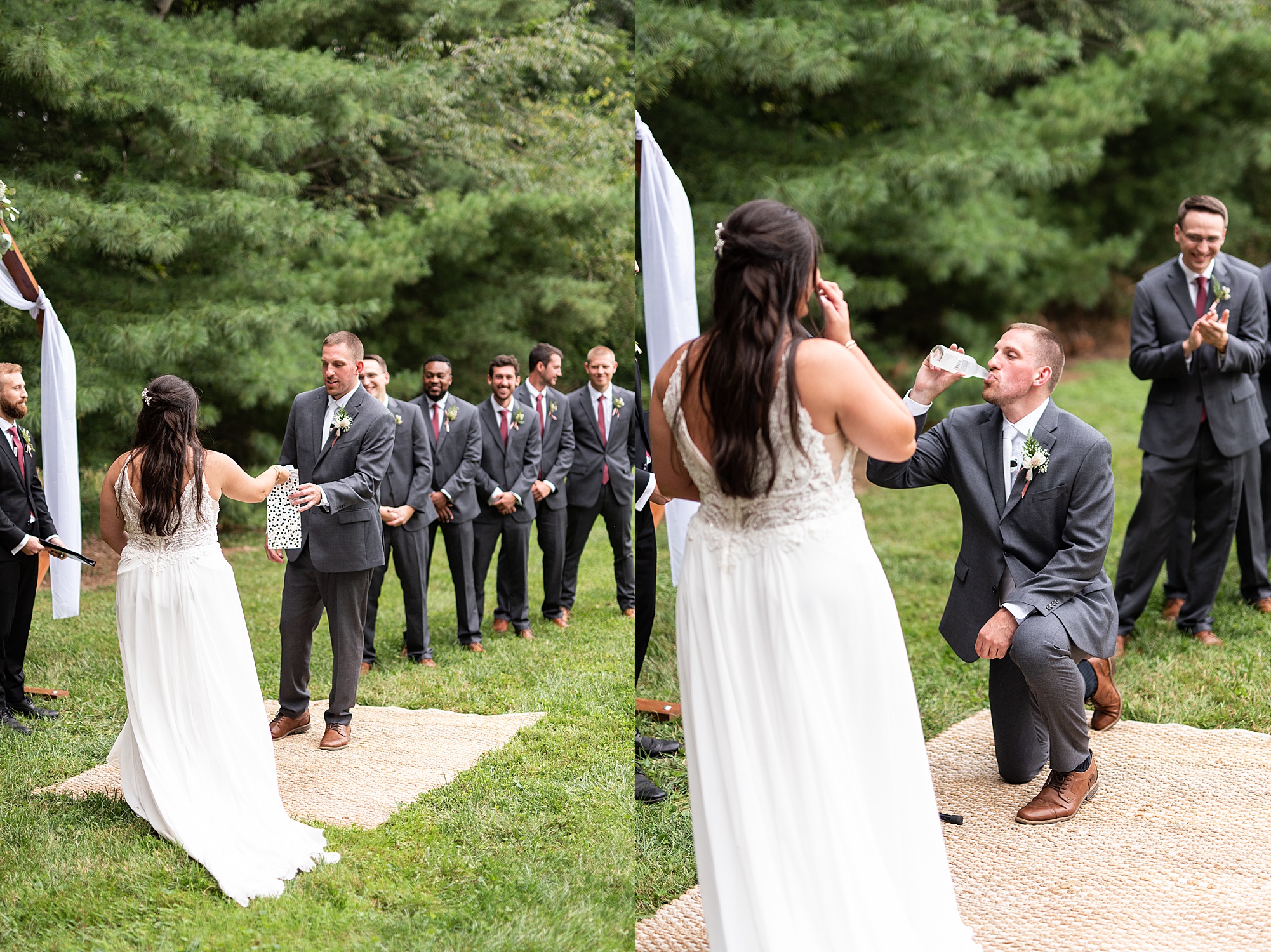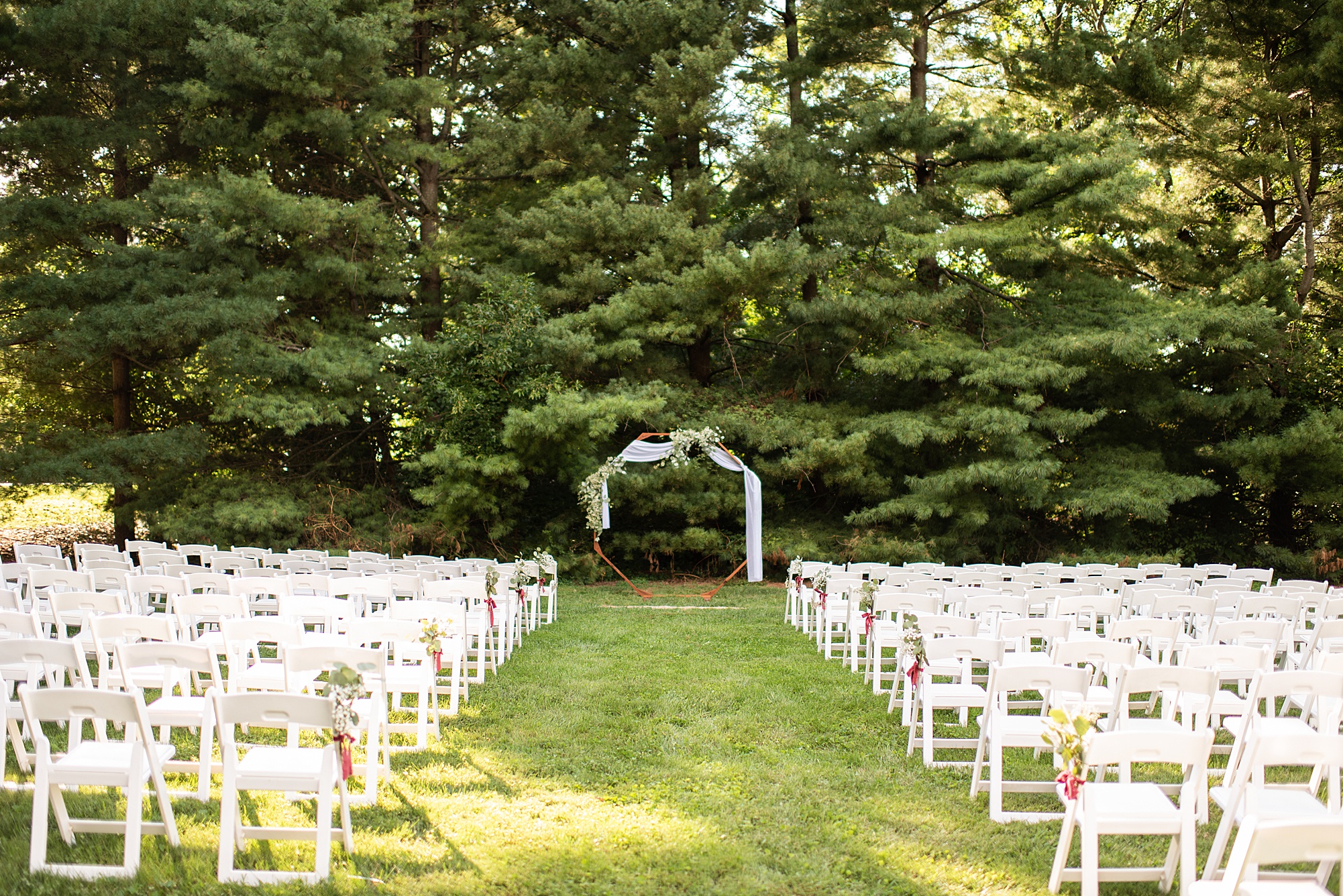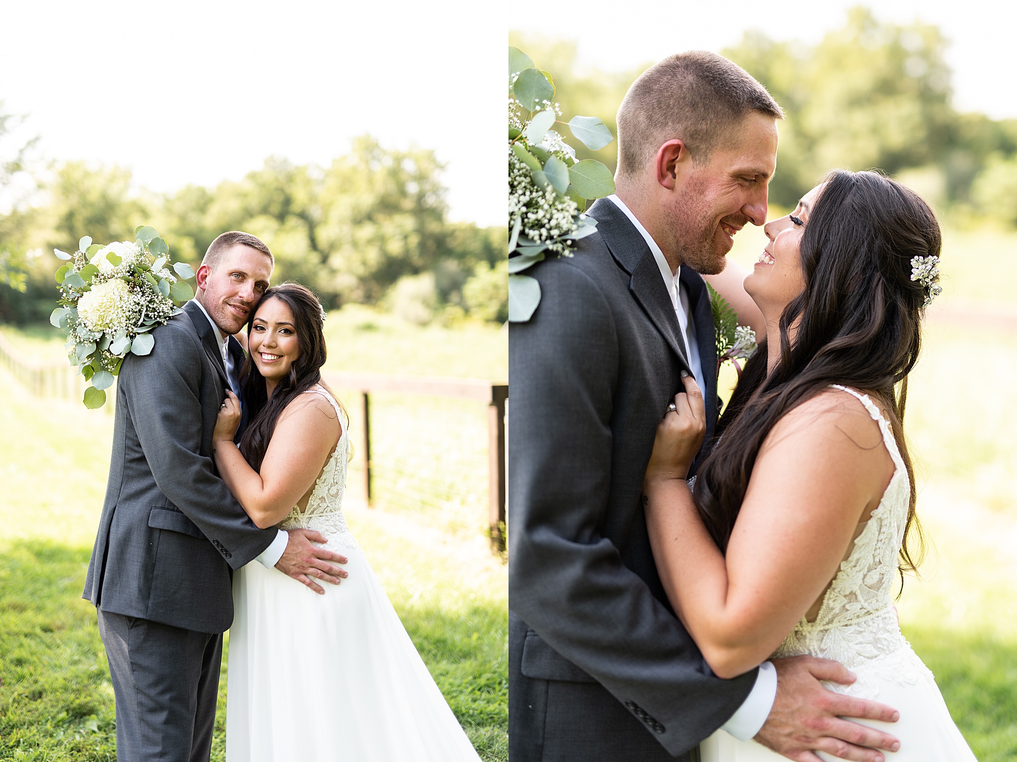 Fast forward to their wedding day, a warm and sunny summer day. Ashley and David decided to throw their celebration in such a special place to them, David’s parents’ pasture in front of their house! They had a gorgeous ceremony site set up among the trees and a beautiful tent to host their reception. After they both finished getting ready, they met in the front yard for an adorable and unexpectedly emotional first look. Ashley and David told us they weren’t exactly the emotional type, but a few happy tears were shed when they finally got to see each other and read their private vows.