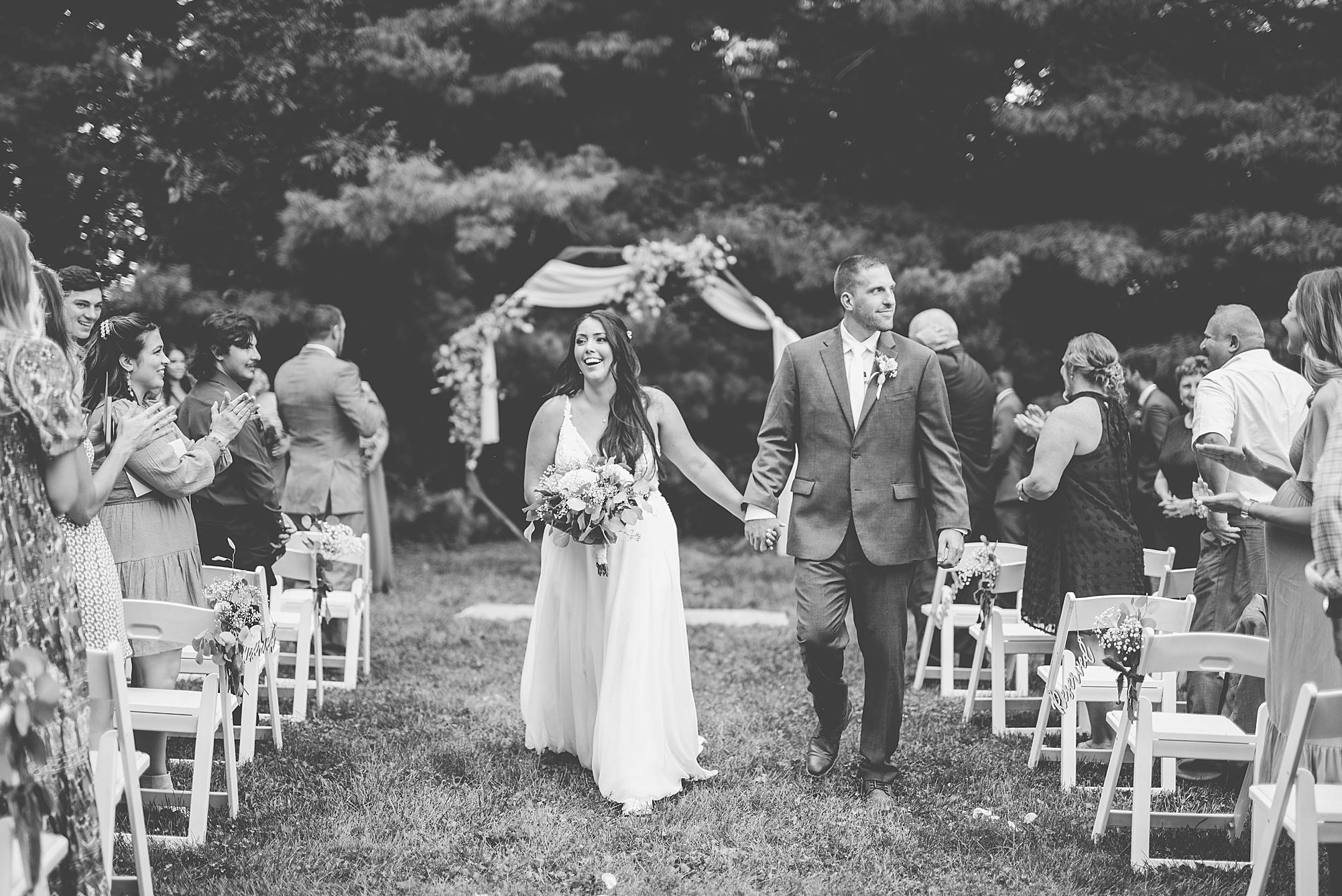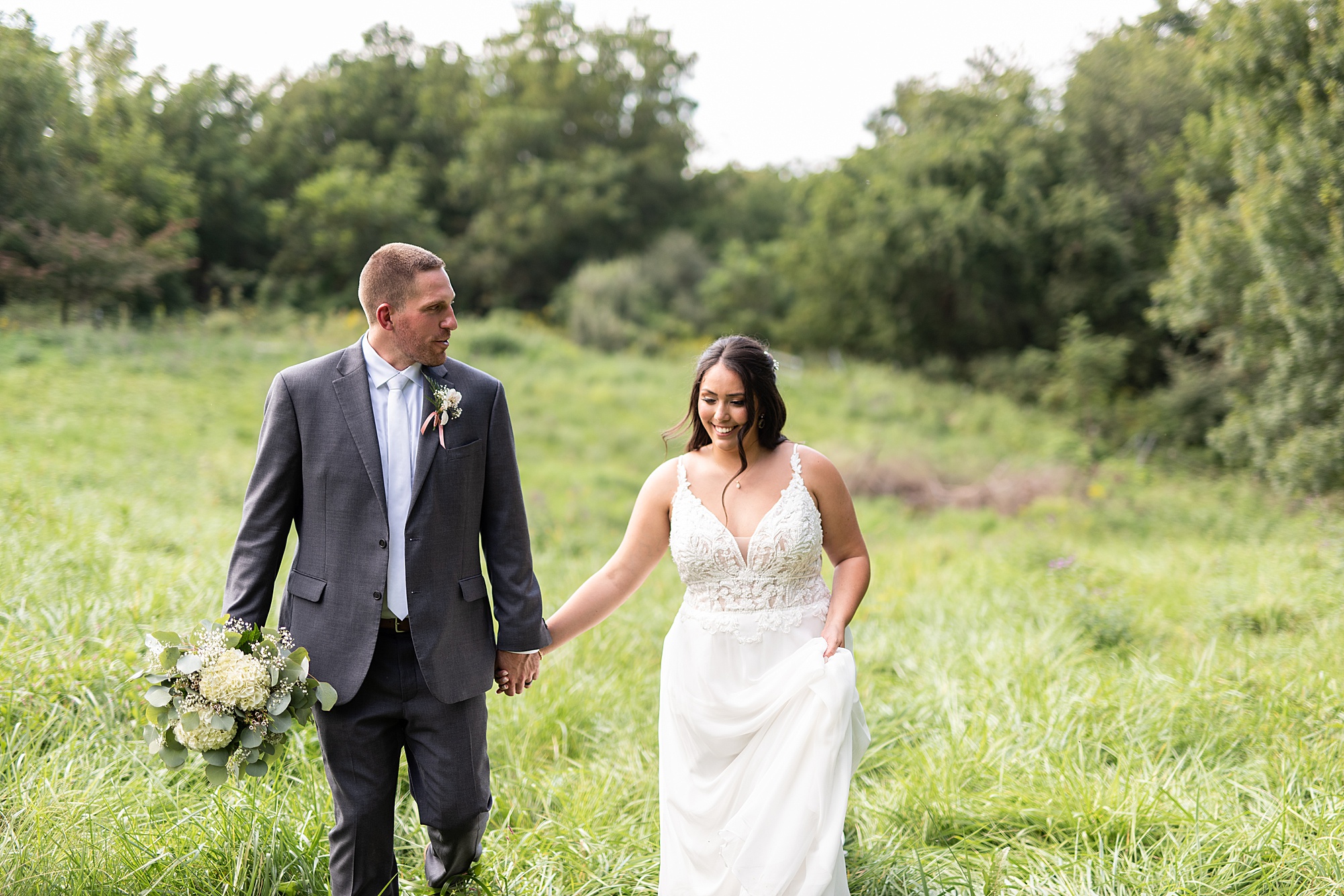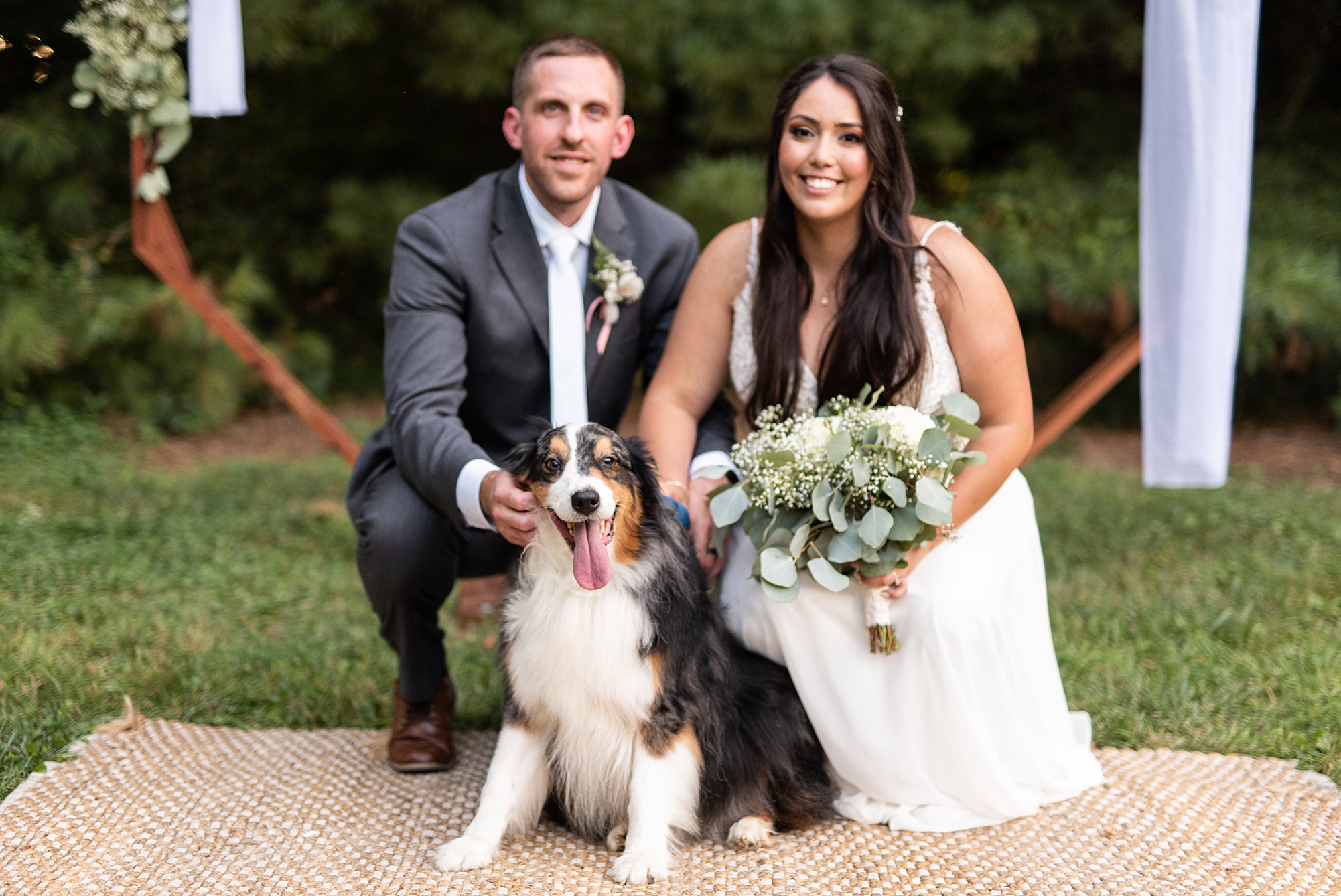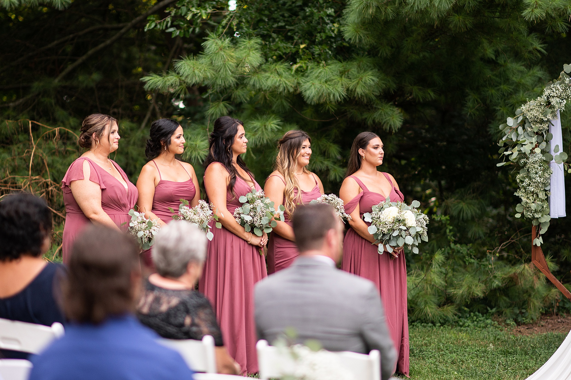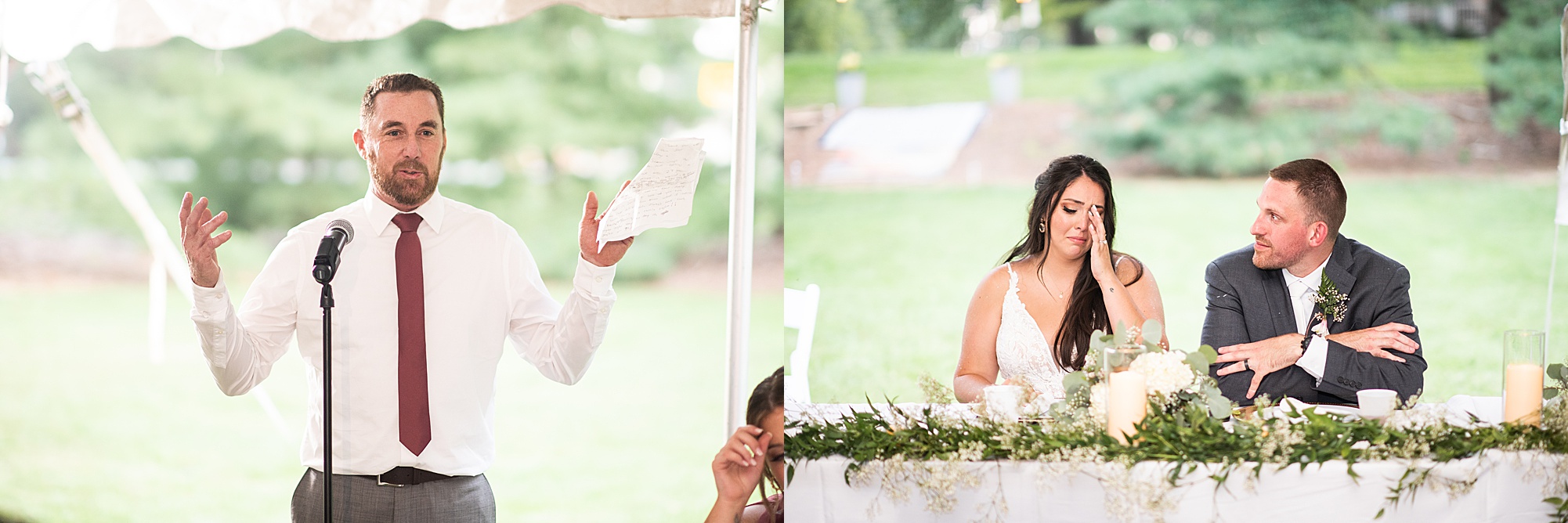 Fast forward to their wedding day, a warm and sunny summer day. Ashley and David decided to throw their celebration in such a special place to them, David’s parents’ pasture in front of their house! They had a gorgeous ceremony site set up among the trees and a beautiful tent to host their reception. After they both finished getting ready, they met in the front yard for an adorable and unexpectedly emotional first look. Ashley and David told us they weren’t exactly the emotional type, but a few happy tears were shed when they finally got to see each other and read their private vows.