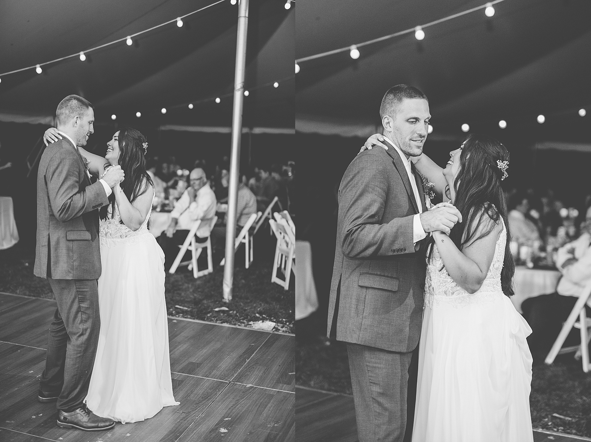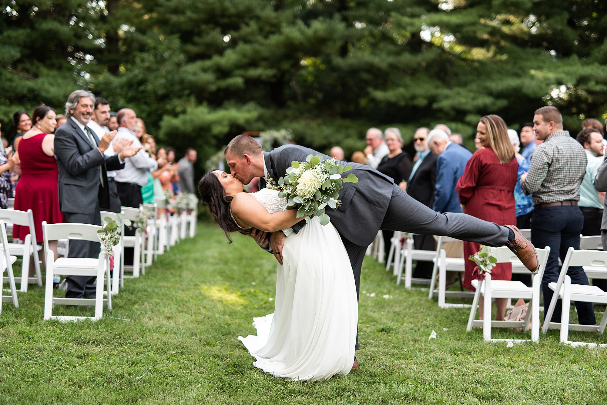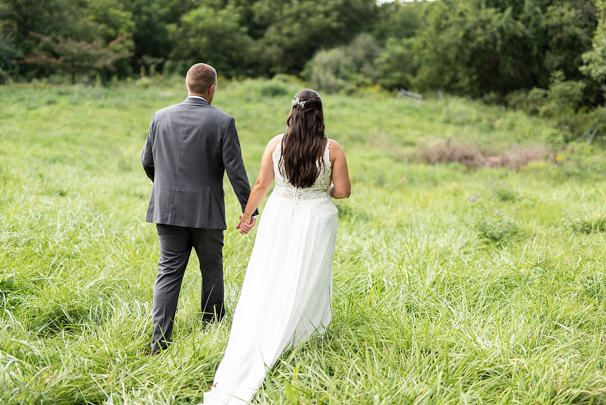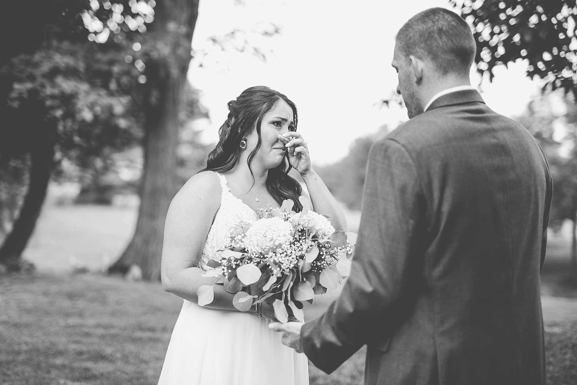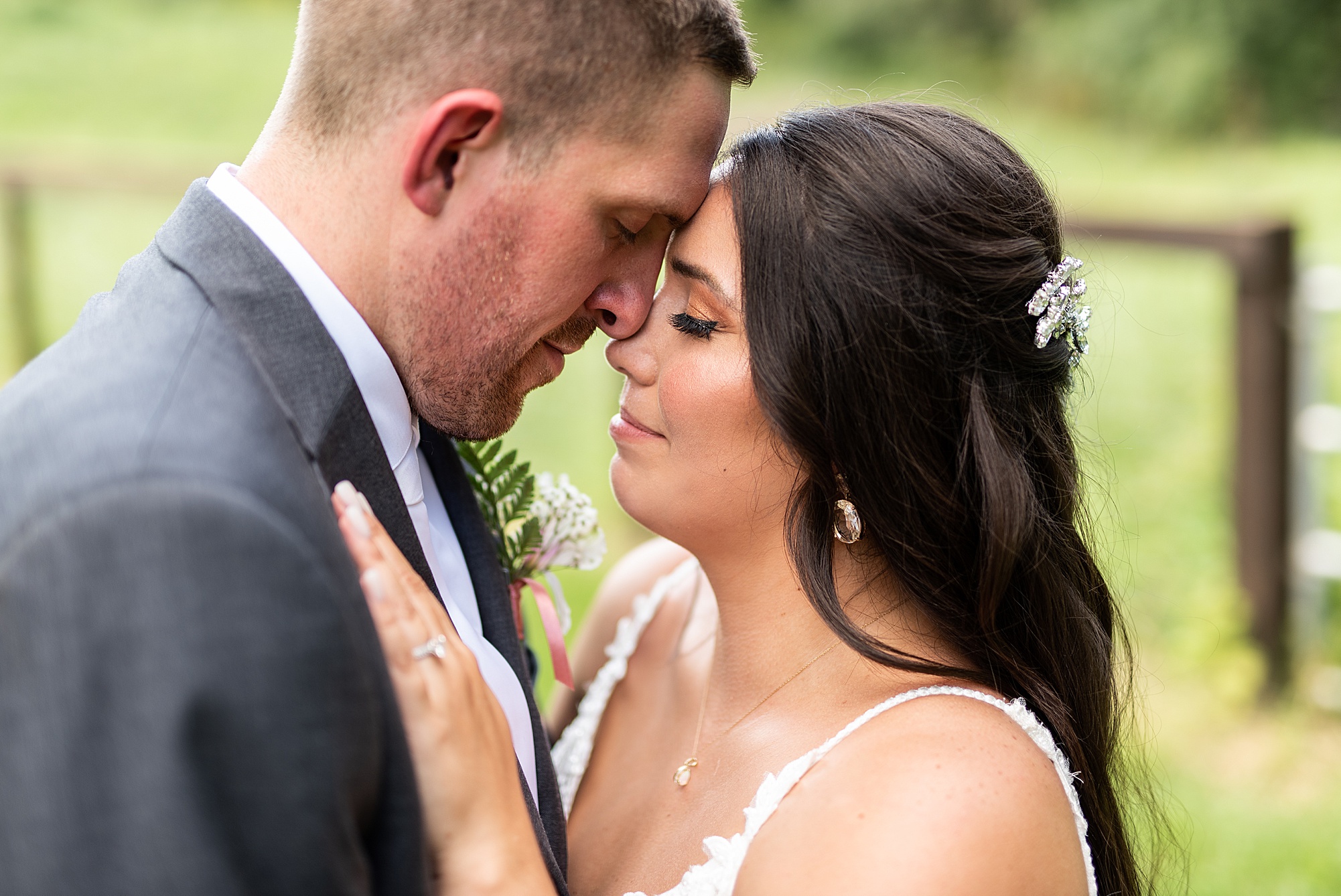 Fast forward to their wedding day, a warm and sunny summer day. Ashley and David decided to throw their celebration in such a special place to them, David’s parents’ pasture in front of their house! They had a gorgeous ceremony site set up among the trees and a beautiful tent to host their reception. After they both finished getting ready, they met in the front yard for an adorable and unexpectedly emotional first look. Ashley and David told us they weren’t exactly the emotional type, but a few happy tears were shed when they finally got to see each other and read their private vows.