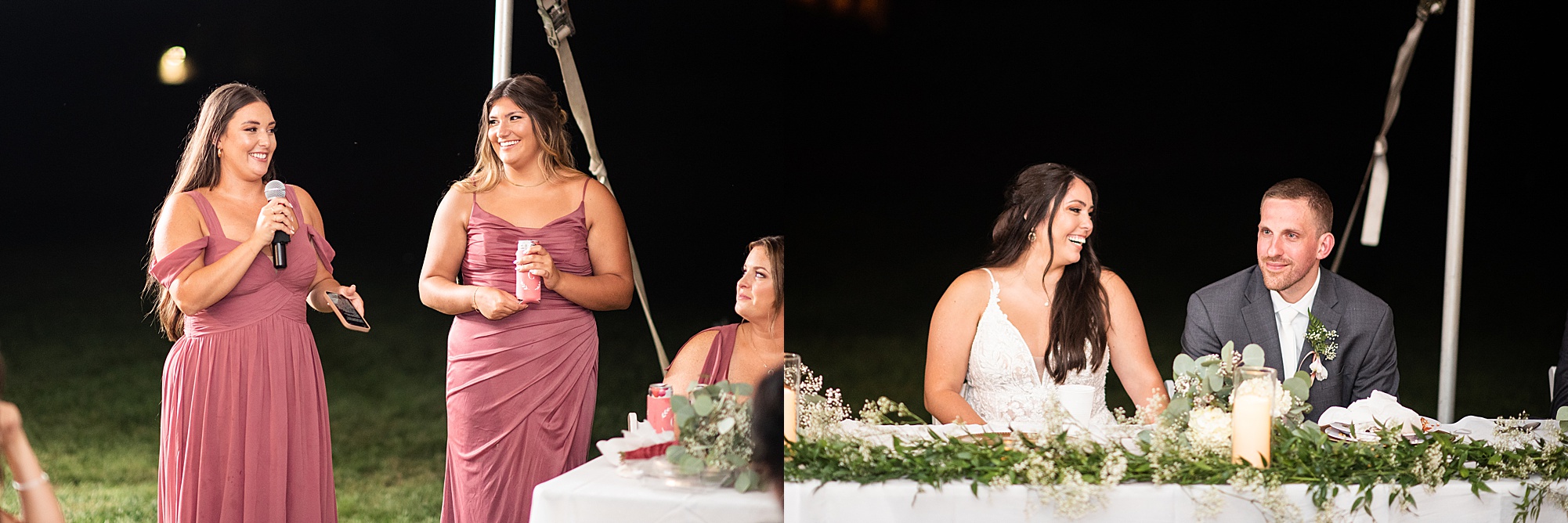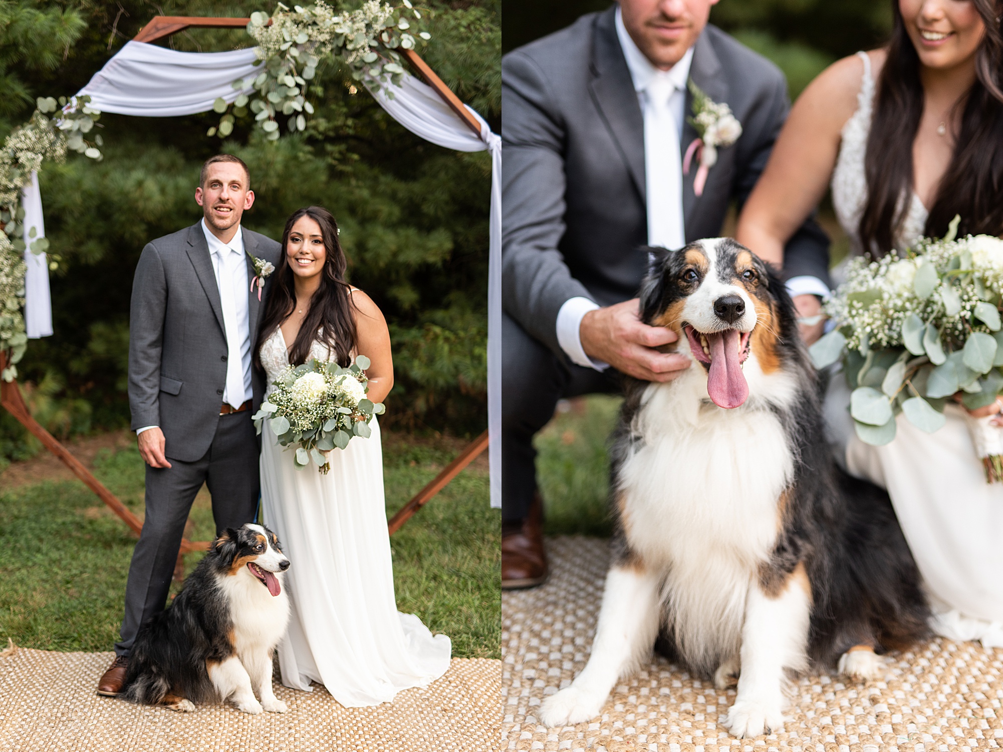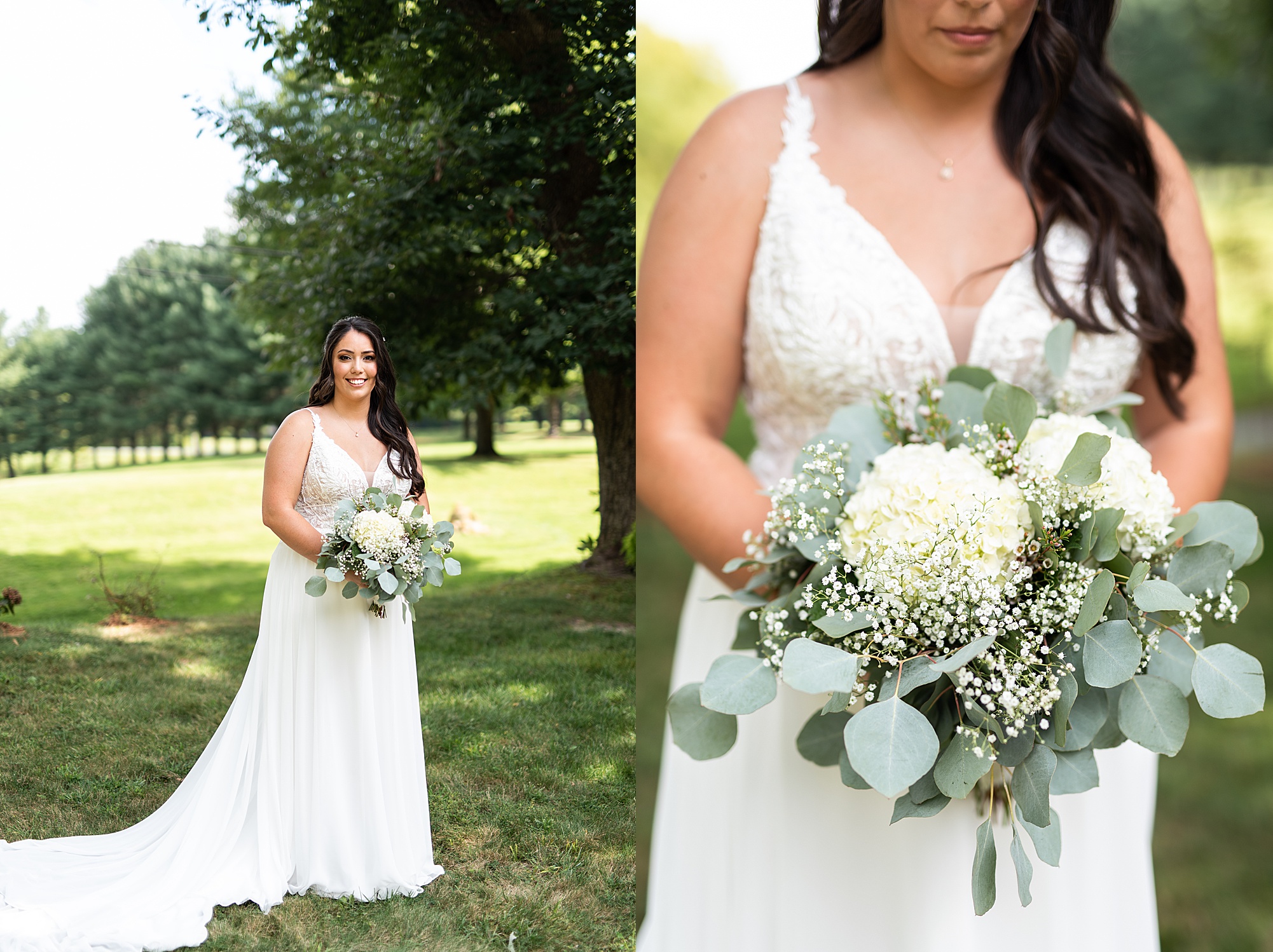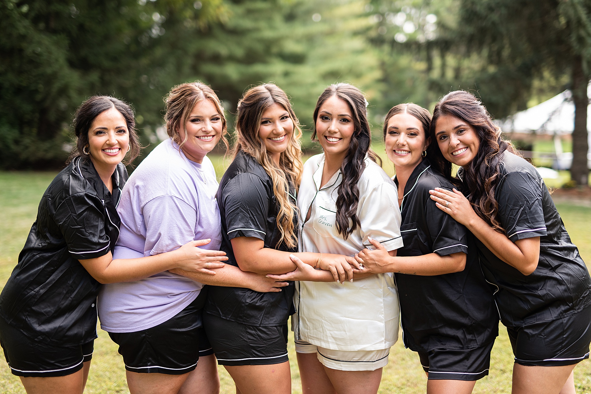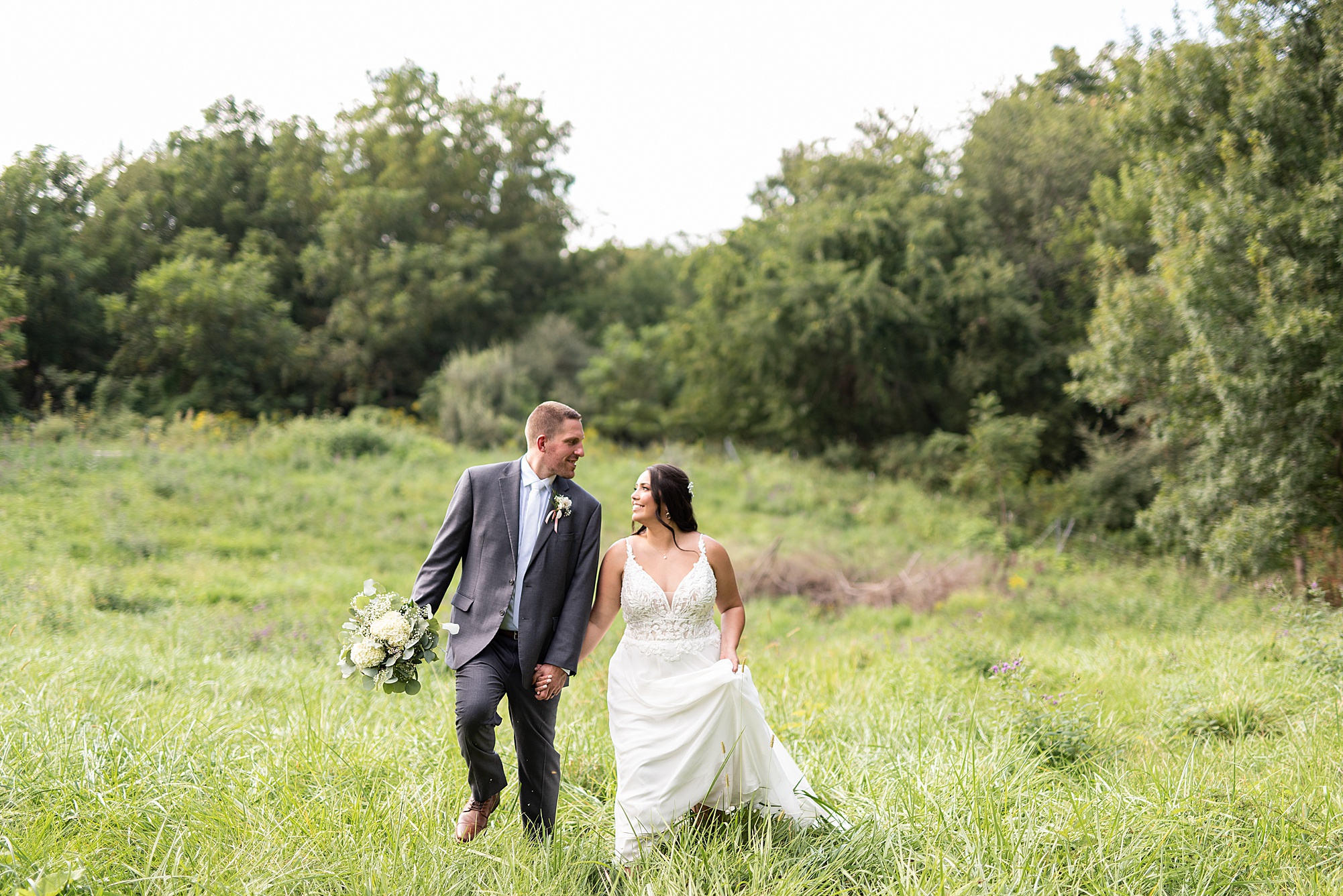 Fast forward to their wedding day, a warm and sunny summer day. Ashley and David decided to throw their celebration in such a special place to them, David’s parents’ pasture in front of their house! They had a gorgeous ceremony site set up among the trees and a beautiful tent to host their reception. After they both finished getting ready, they met in the front yard for an adorable and unexpectedly emotional first look. Ashley and David told us they weren’t exactly the emotional type, but a few happy tears were shed when they finally got to see each other and read their private vows.