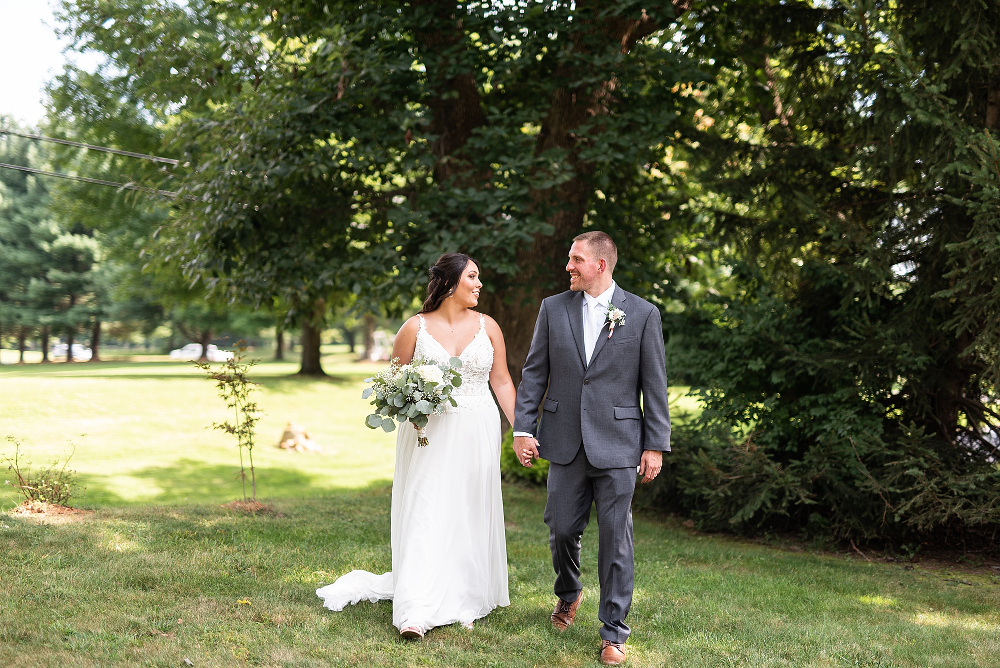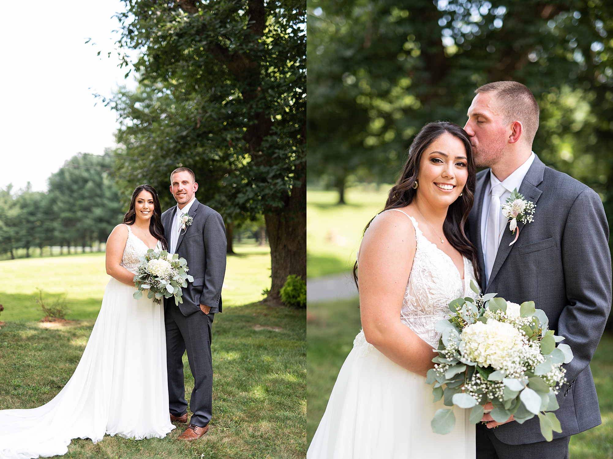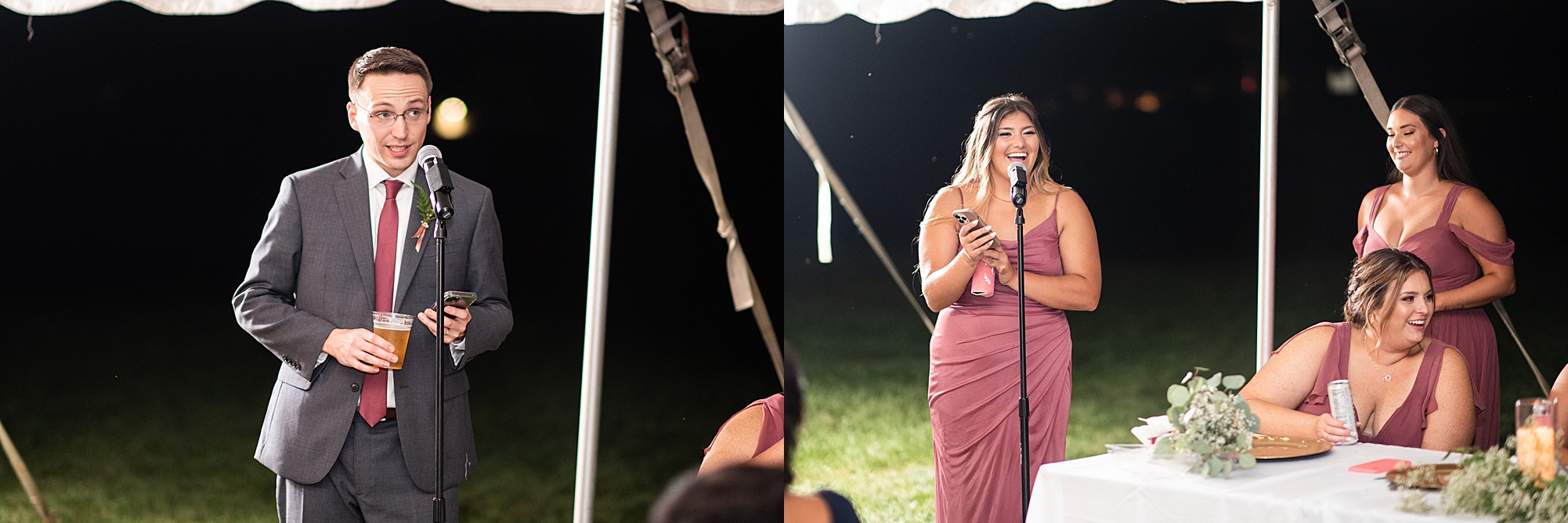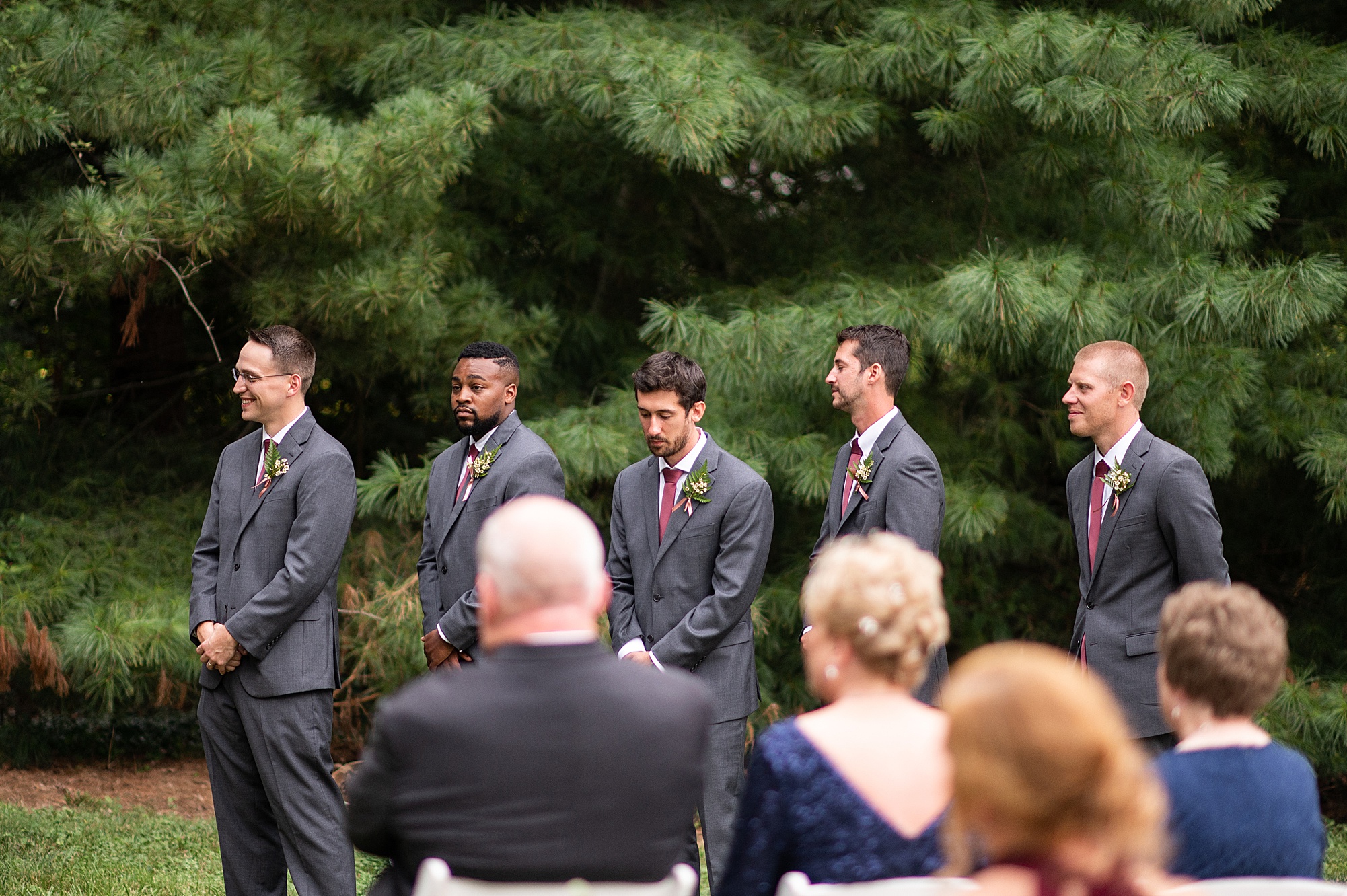 Fast forward to their wedding day, a warm and sunny summer day. Ashley and David decided to throw their celebration in such a special place to them, David’s parents’ pasture in front of their house! They had a gorgeous ceremony site set up among the trees and a beautiful tent to host their reception. After they both finished getting ready, they met in the front yard for an adorable and unexpectedly emotional first look. Ashley and David told us they weren’t exactly the emotional type, but a few happy tears were shed when they finally got to see each other and read their private vows.