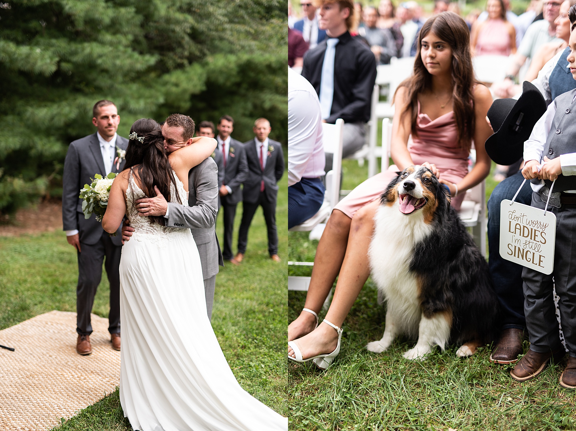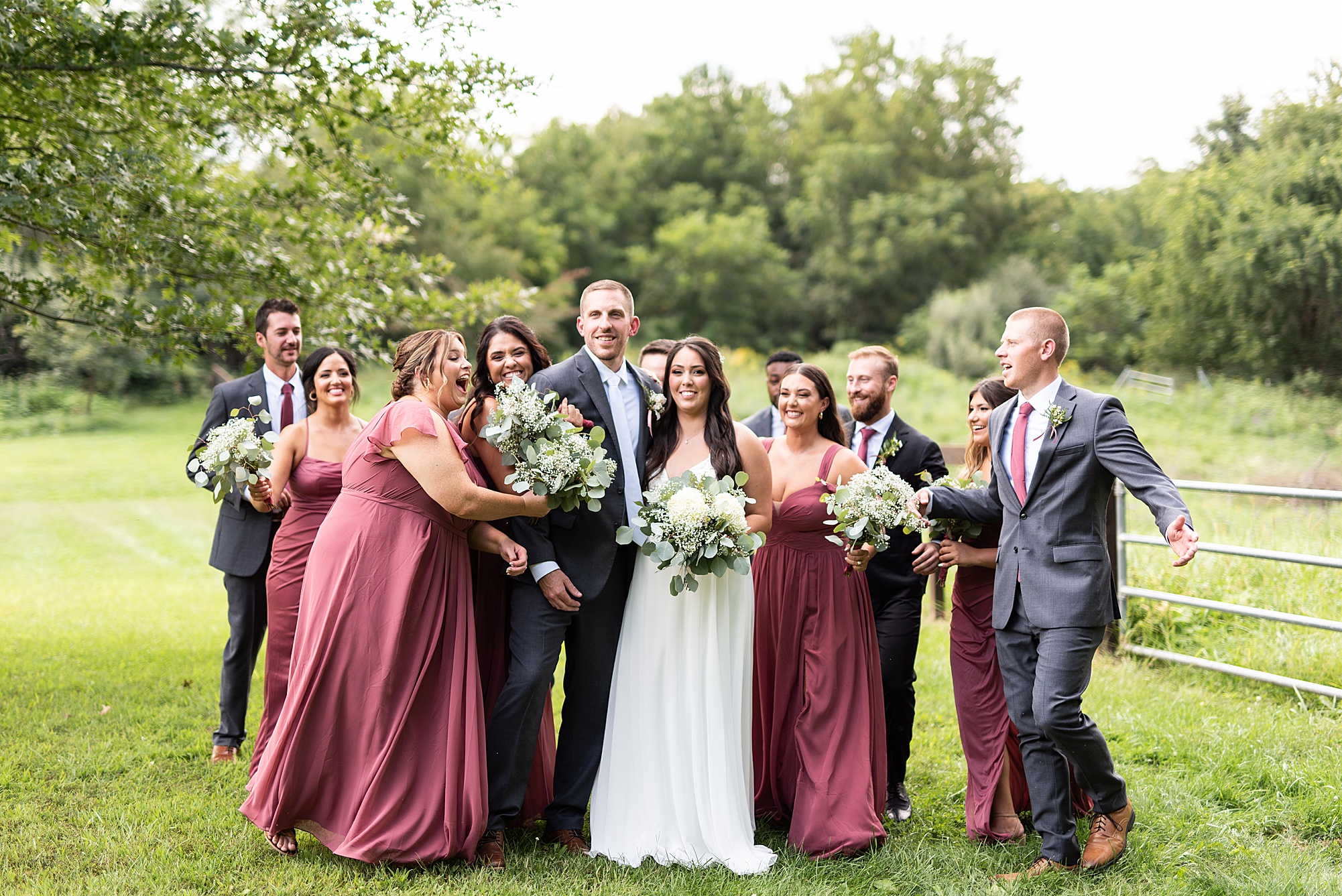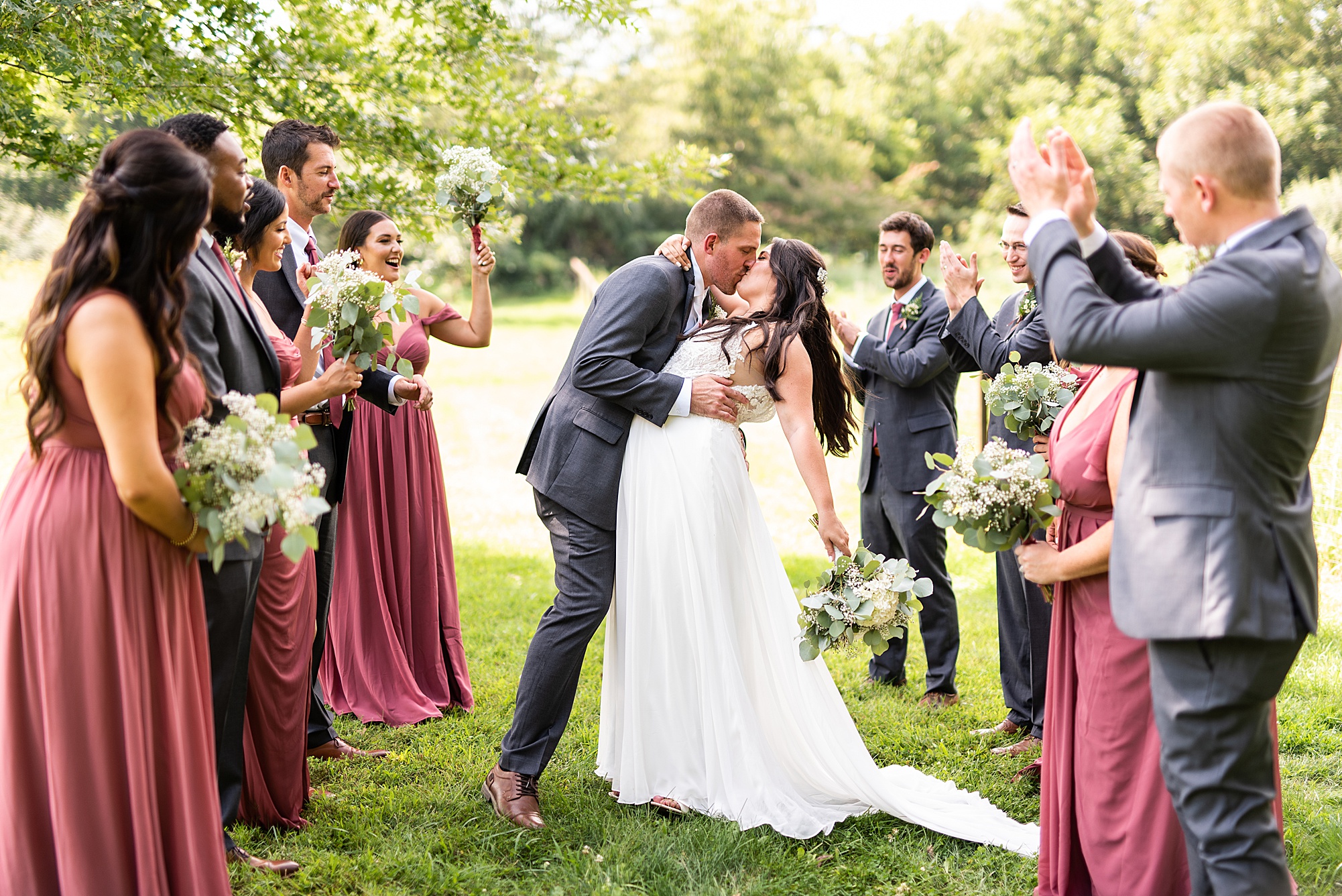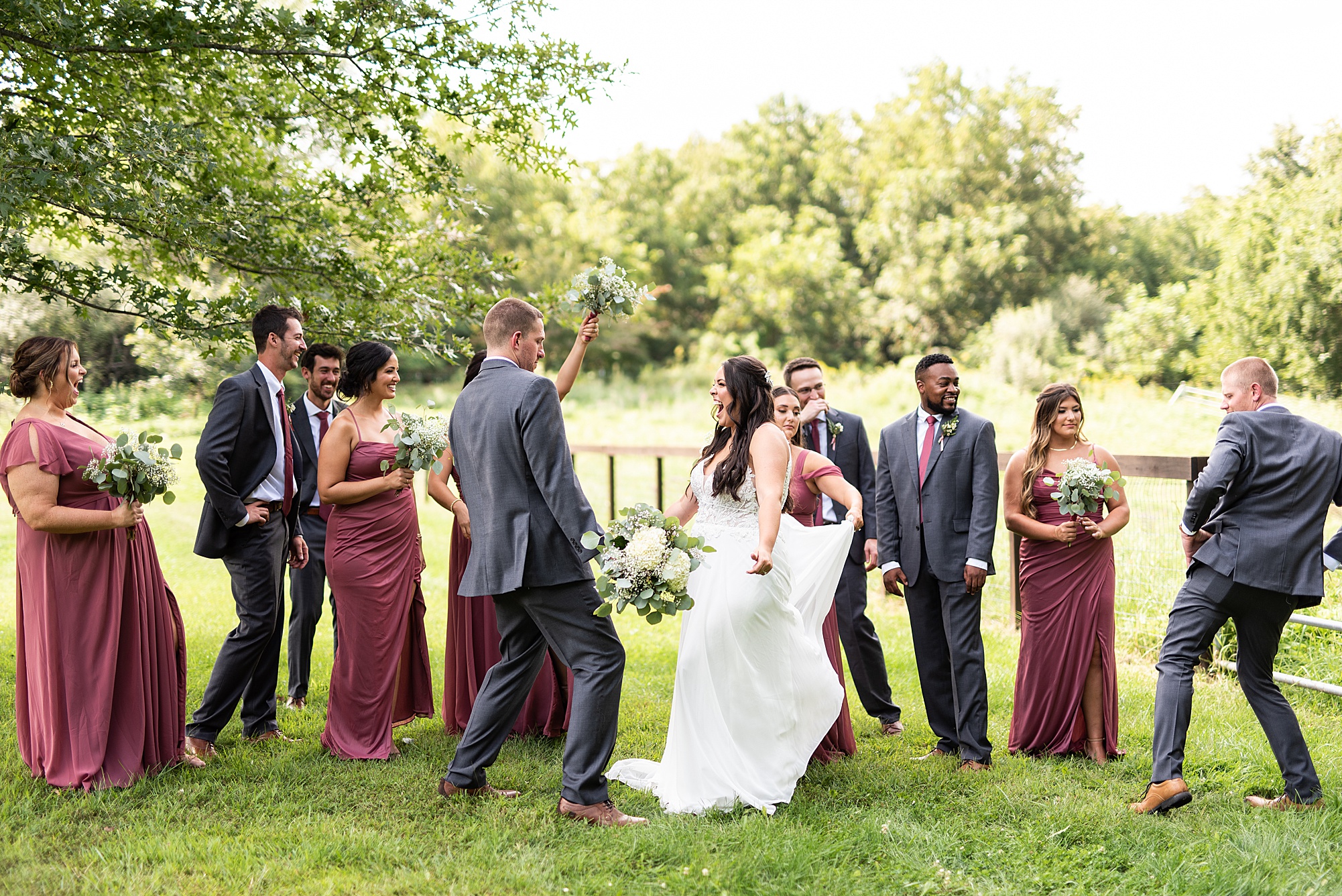 Next we traveled a little to a nearby pasture for some fun bridal party photos and photos with Ashley and David. Their bridal party did a great job as their hype crew and really kept Ashley and David laughing and having fun! After portrait time, we headed back to get them officially married! Ashley’s dad walked her down the aisle to David and proudly gave his oldest daughter away. Ashley had a little surprise for David as she “iced” him the second she got down the aisle to help him loosen up! Their close friend officially married them under the trees, they shared their first kiss and walked back down the aisle with the biggest smiles on their faces!