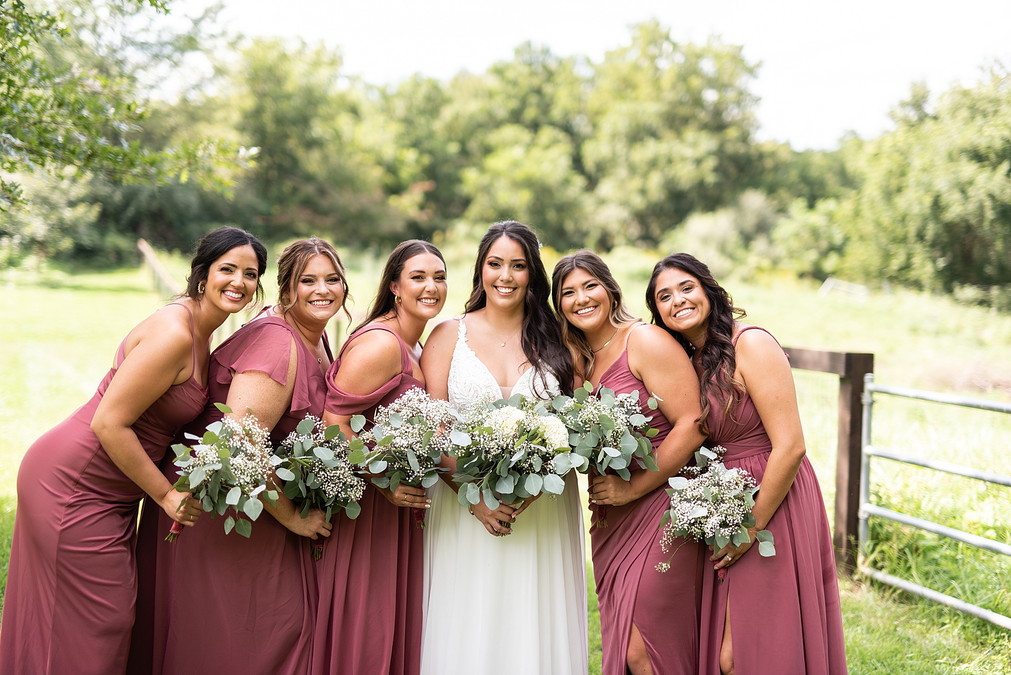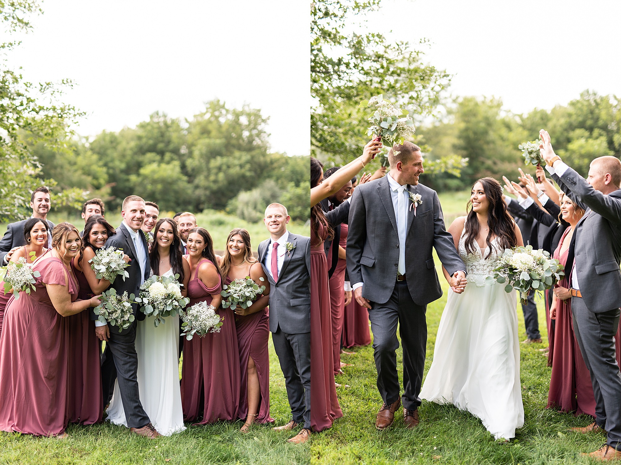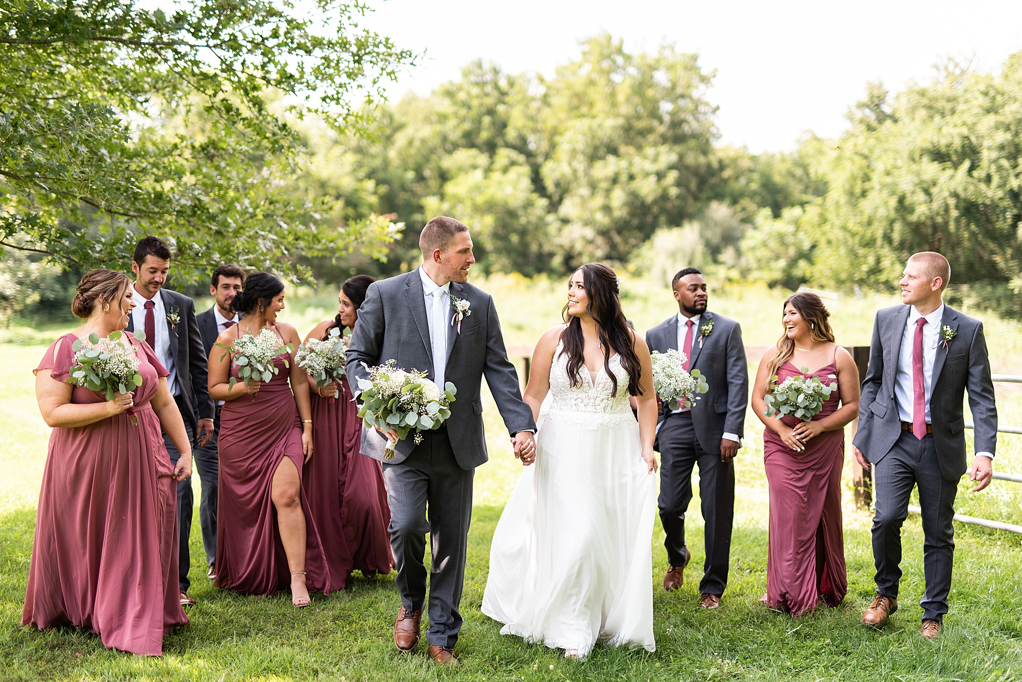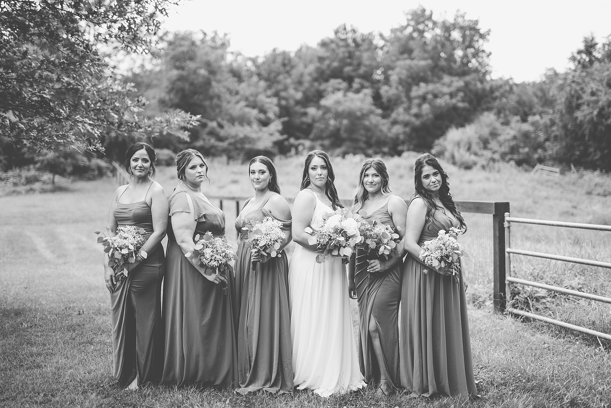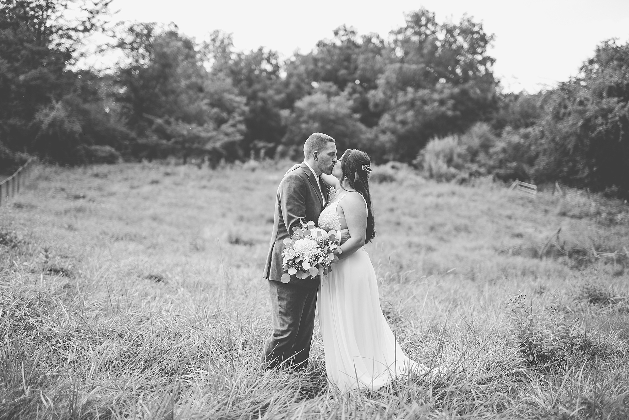 Next we traveled a little to a nearby pasture for some fun bridal party photos and photos with Ashley and David. Their bridal party did a great job as their hype crew and really kept Ashley and David laughing and having fun! After portrait time, we headed back to get them officially married! Ashley’s dad walked her down the aisle to David and proudly gave his oldest daughter away. Ashley had a little surprise for David as she “iced” him the second she got down the aisle to help him loosen up! Their close friend officially married them under the trees, they shared their first kiss and walked back down the aisle with the biggest smiles on their faces!