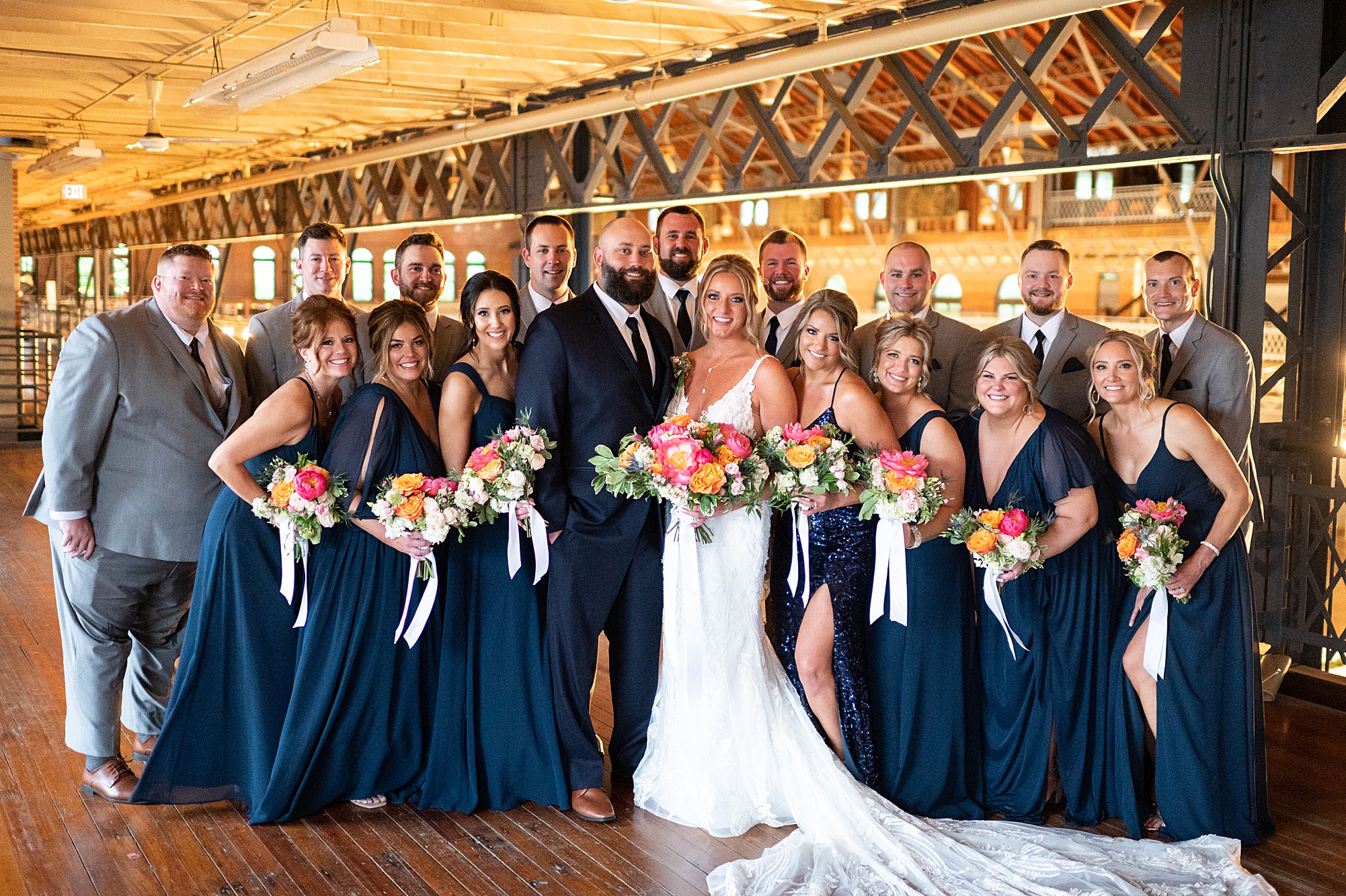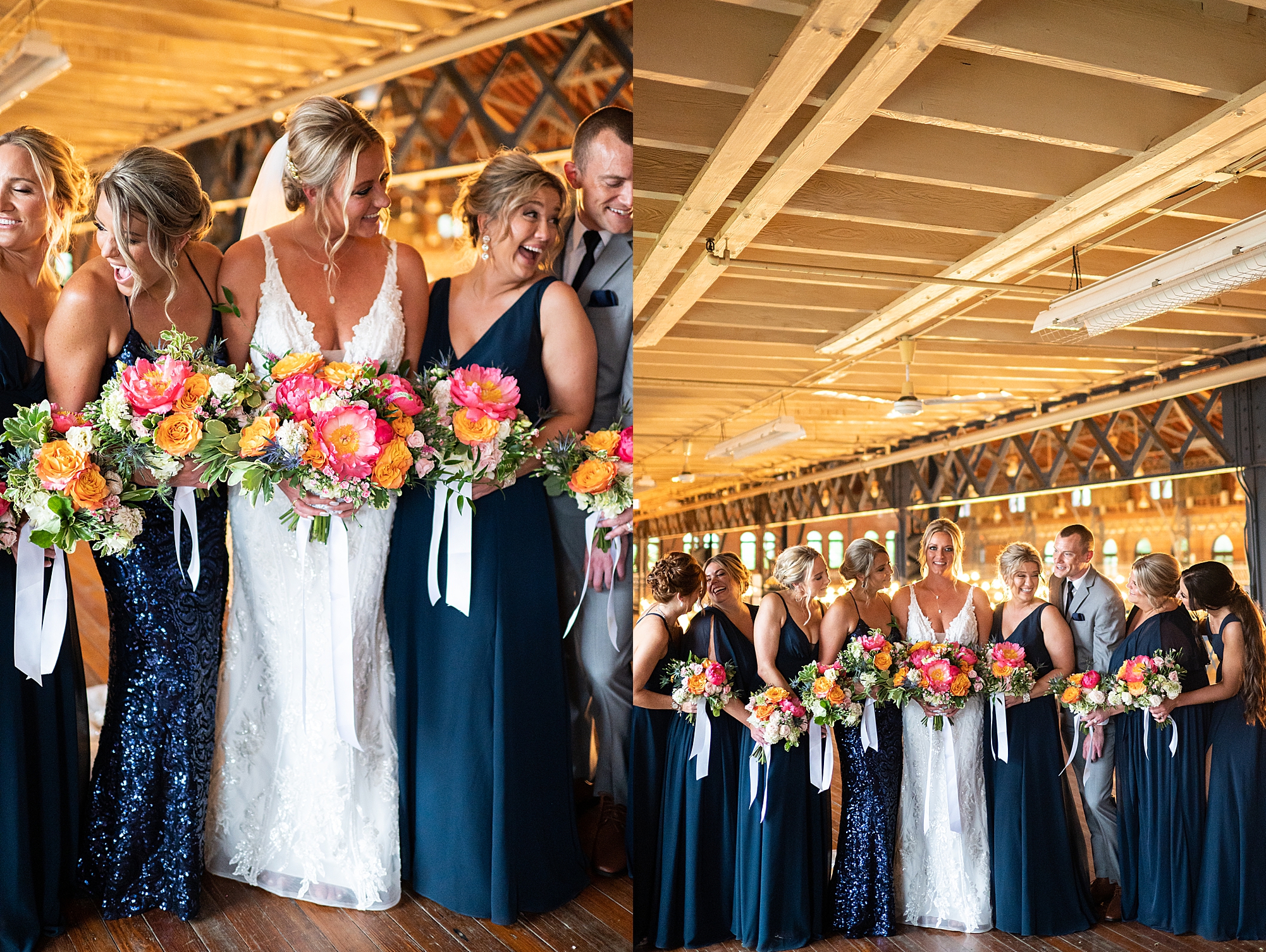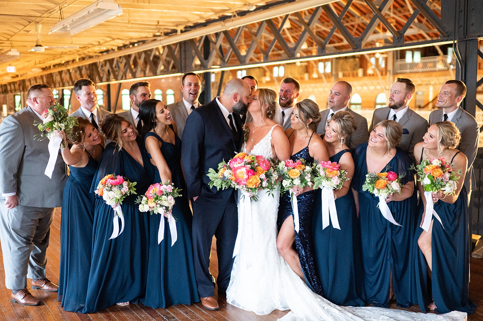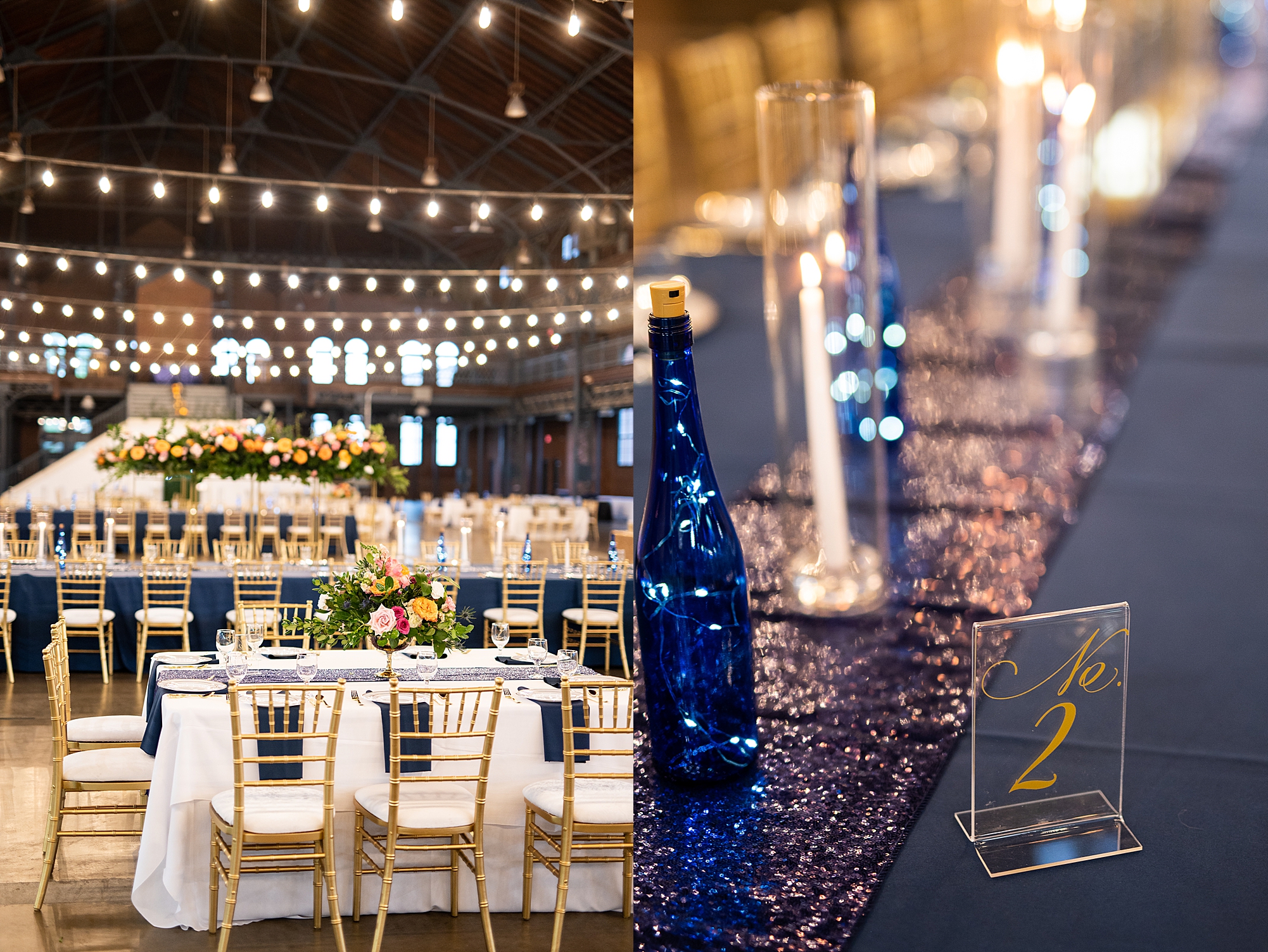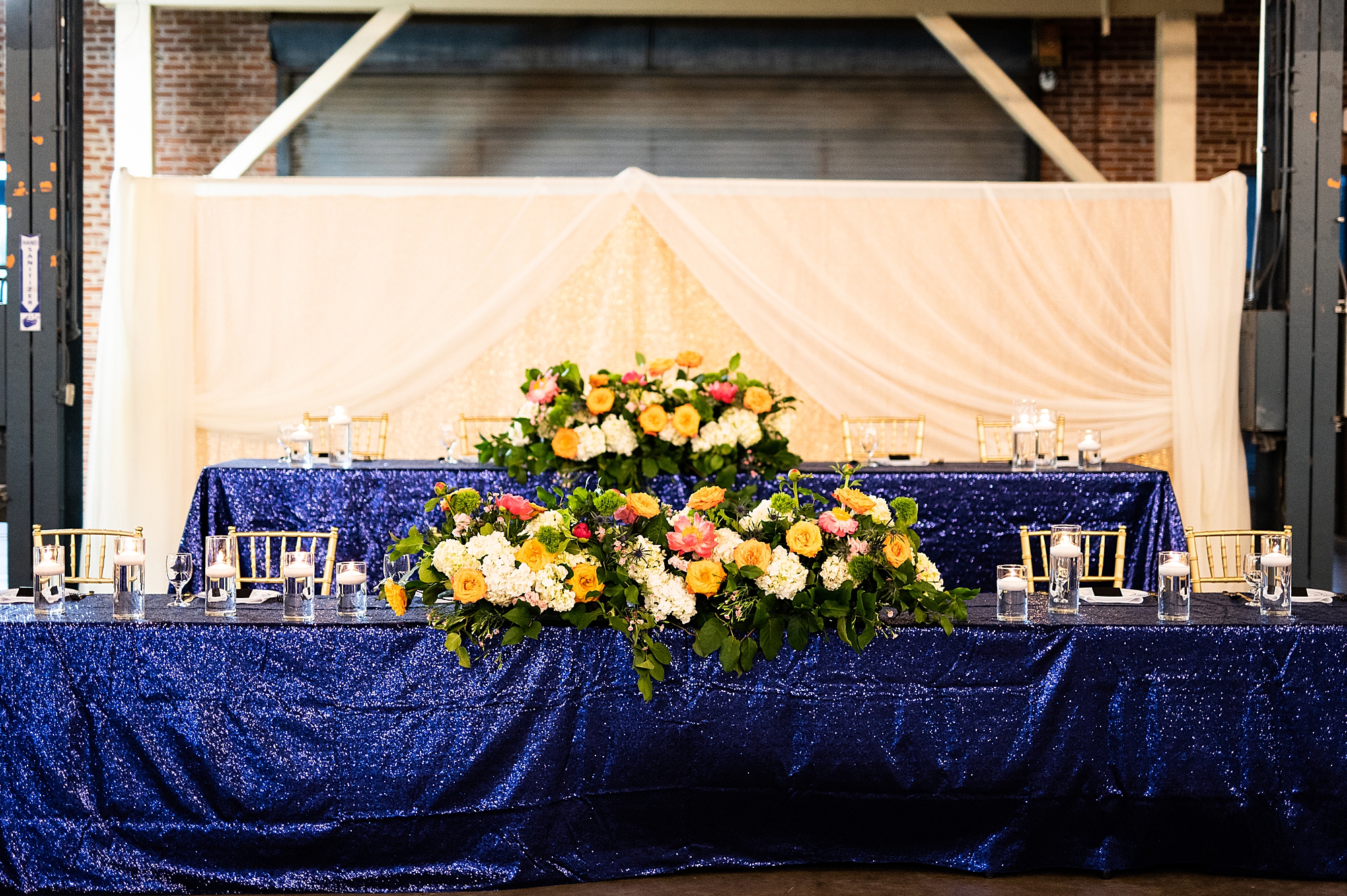 After the ceremony, their guests headed to a gorgeous cocktail hour while we were finally able to take the bridal party outside for some quick portrait time! Travis is not one for a ton of photos, but he did a great job making Ashton laugh and I really enjoyed capturing some “just married” photos of them! Afterwards, we headed back to their reception full of gorgeous navy sparkle, candlelight and colorful florals. It was a beautiful celebration of love for Ashton and Travis who met on Tinder, dated long distance and fell hard for each other. I loved capturing the entire day for them and could not be happier for Mr. and Mrs. Combs!