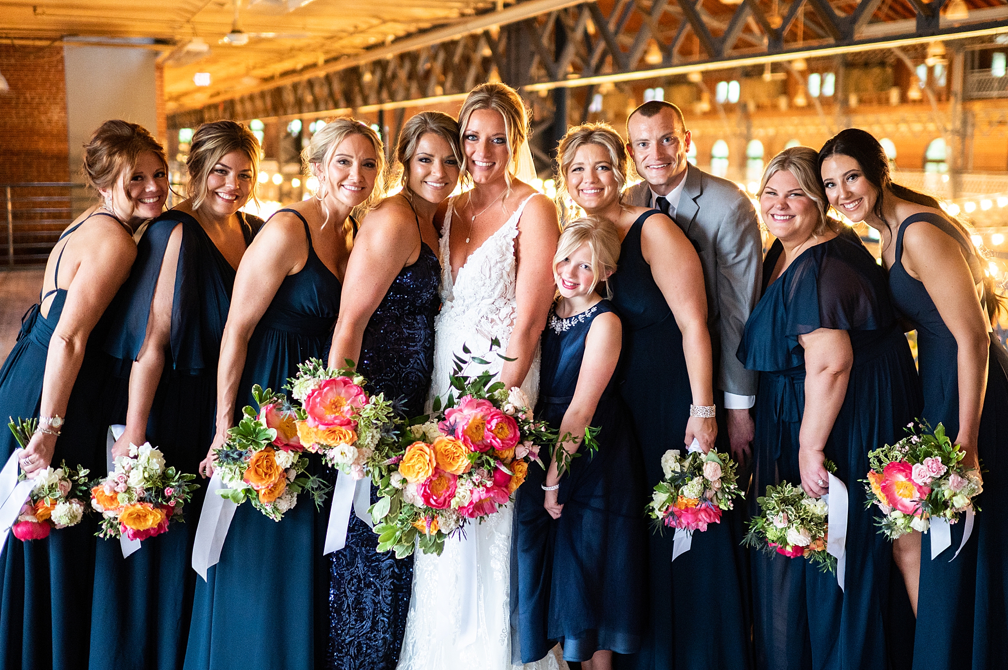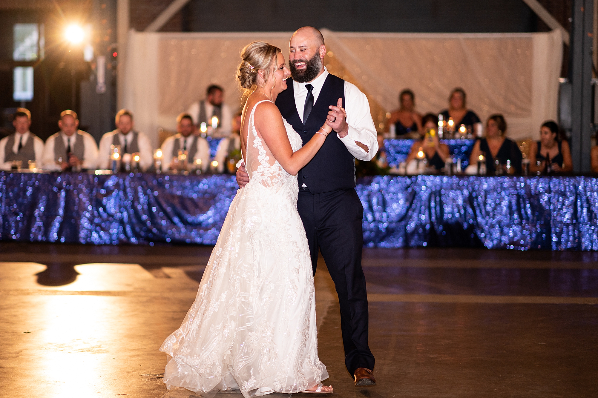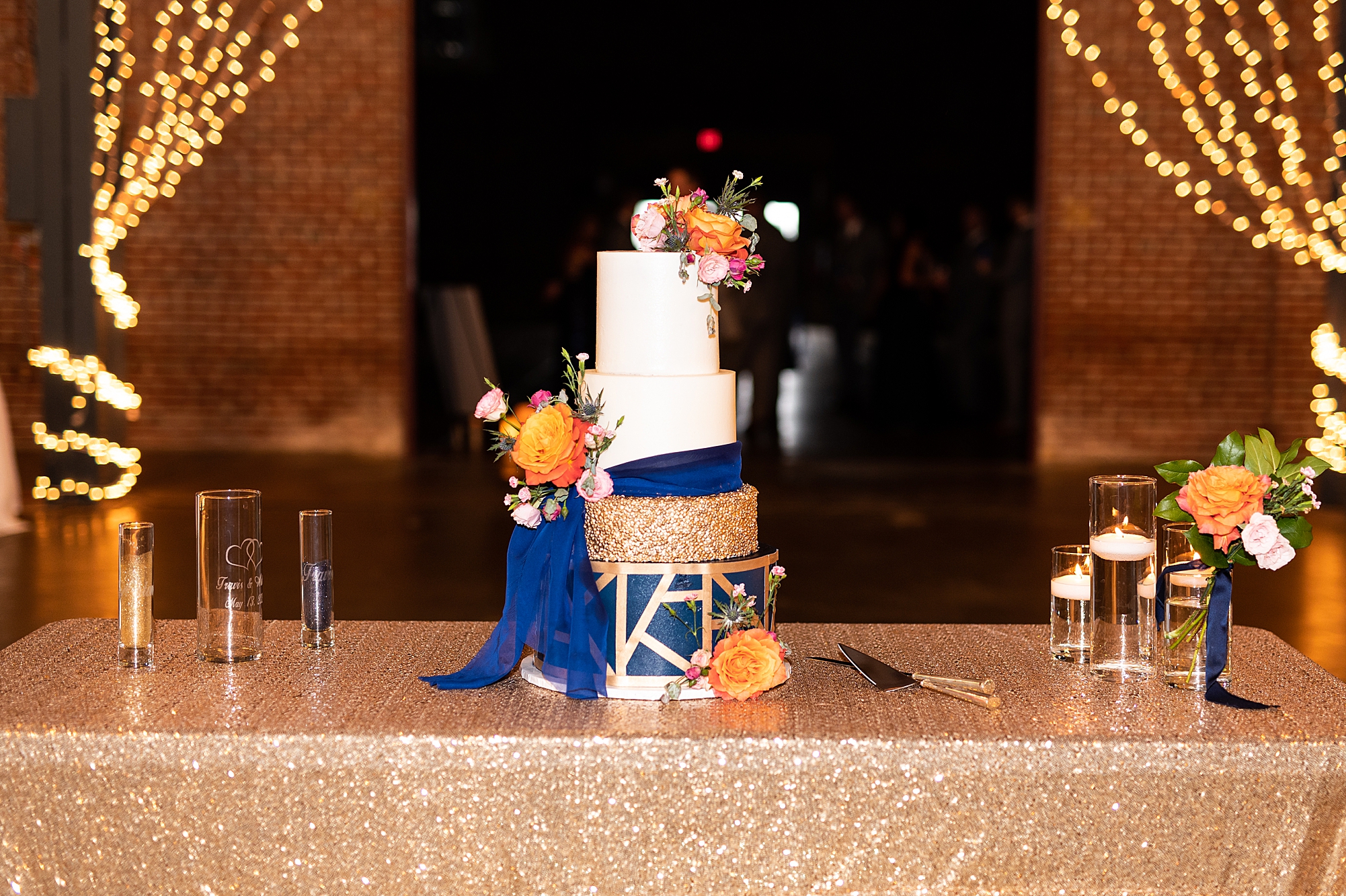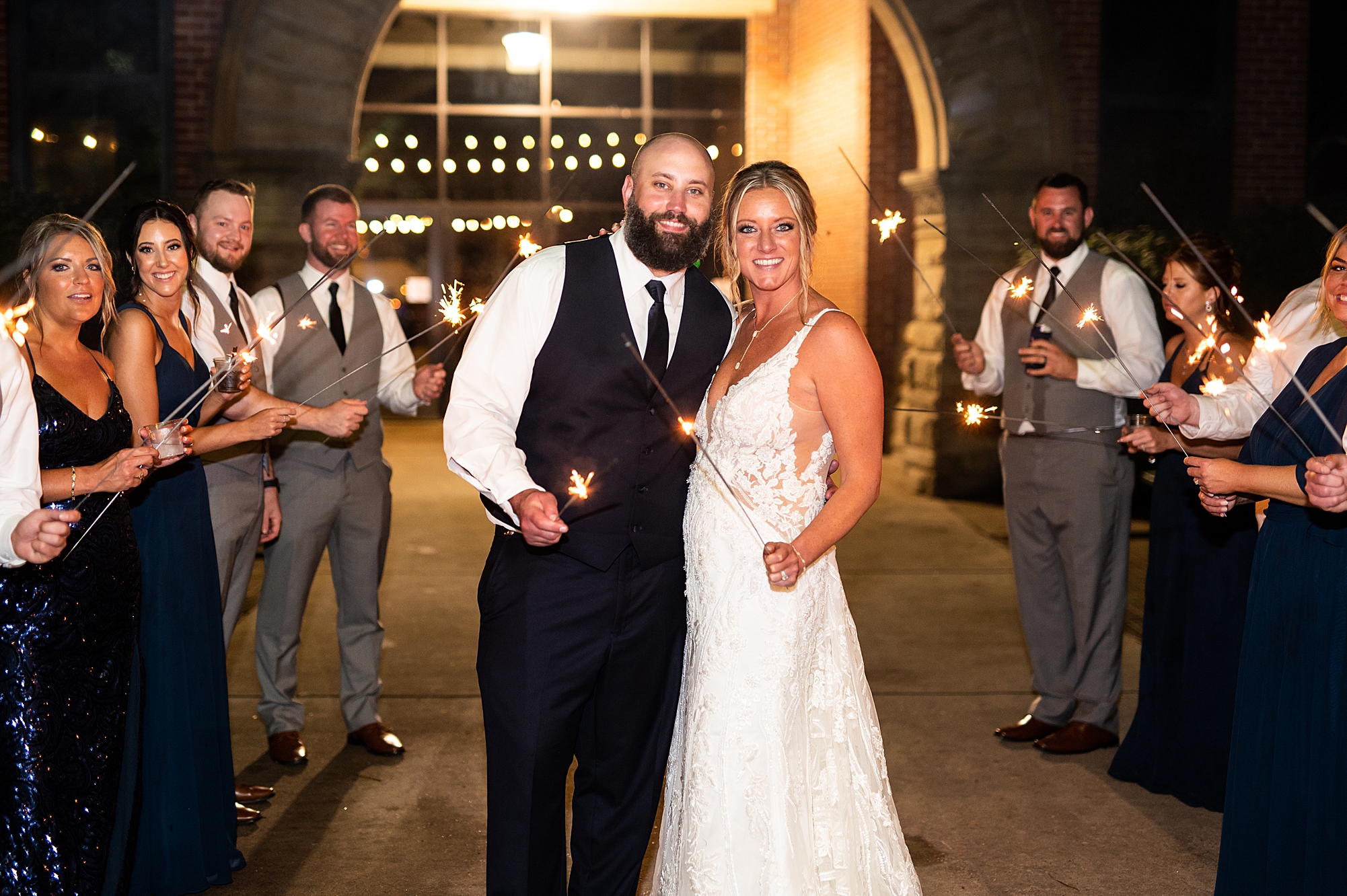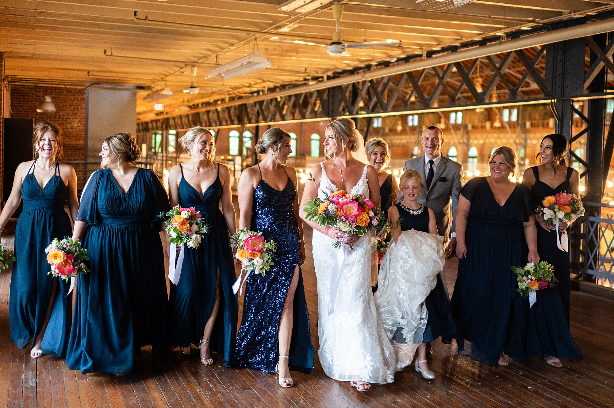 After the ceremony, their guests headed to a gorgeous cocktail hour while we were finally able to take the bridal party outside for some quick portrait time! Travis is not one for a ton of photos, but he did a great job making Ashton laugh and I really enjoyed capturing some “just married” photos of them! Afterwards, we headed back to their reception full of gorgeous navy sparkle, candlelight and colorful florals. It was a beautiful celebration of love for Ashton and Travis who met on Tinder, dated long distance and fell hard for each other. I loved capturing the entire day for them and could not be happier for Mr. and Mrs. Combs!