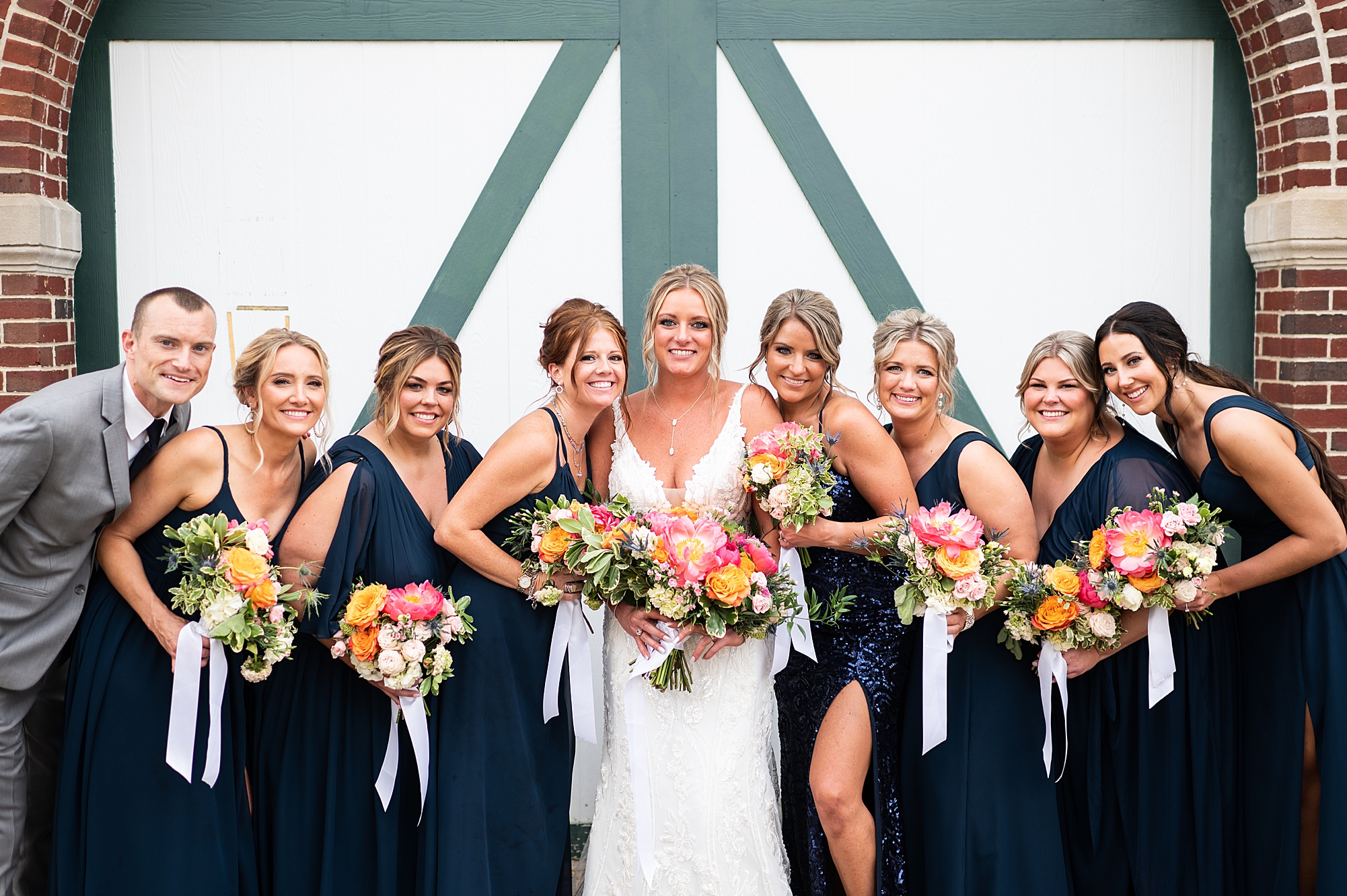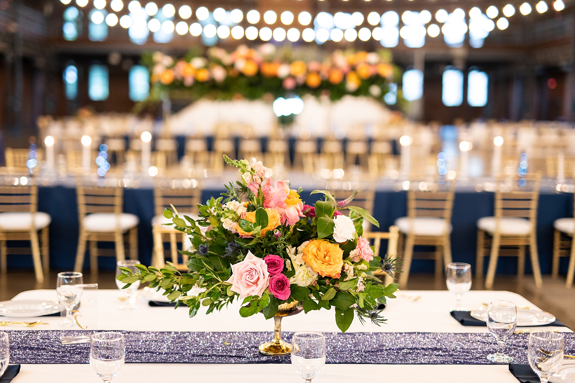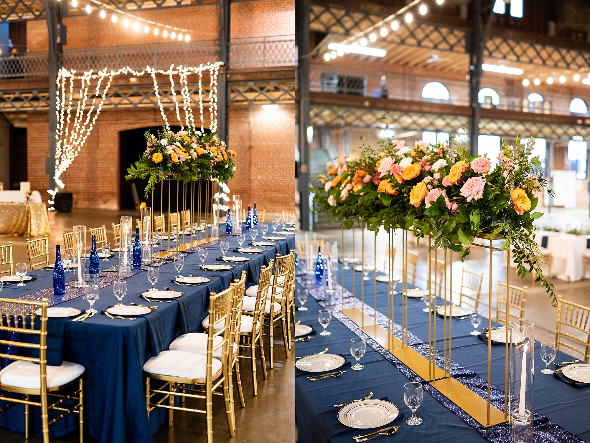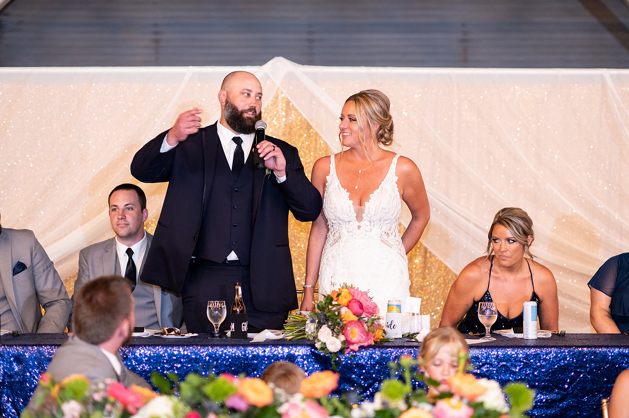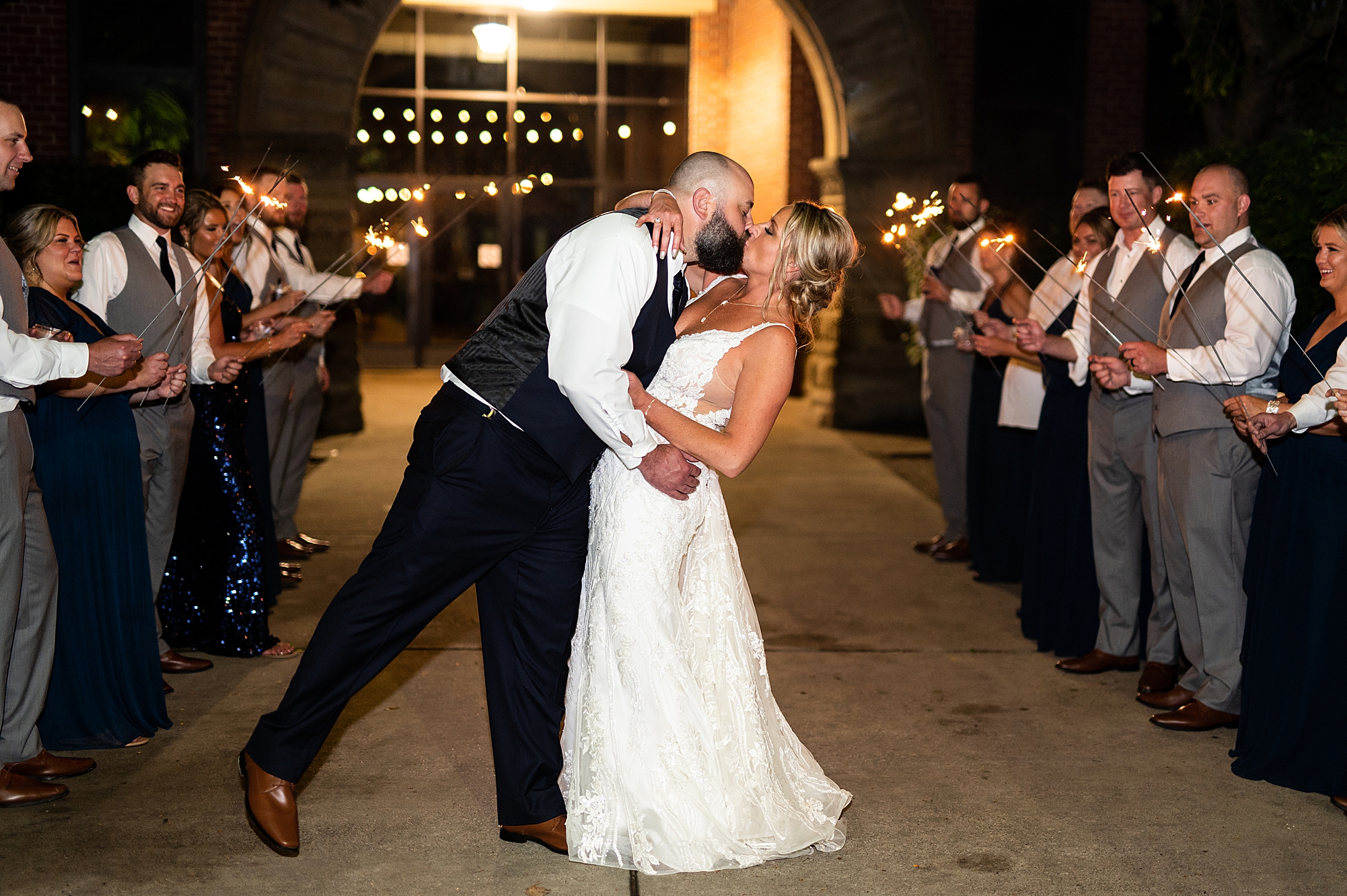 After the ceremony, their guests headed to a gorgeous cocktail hour while we were finally able to take the bridal party outside for some quick portrait time! Travis is not one for a ton of photos, but he did a great job making Ashton laugh and I really enjoyed capturing some “just married” photos of them! Afterwards, we headed back to their reception full of gorgeous navy sparkle, candlelight and colorful florals. It was a beautiful celebration of love for Ashton and Travis who met on Tinder, dated long distance and fell hard for each other. I loved capturing the entire day for them and could not be happier for Mr. and Mrs. Combs!