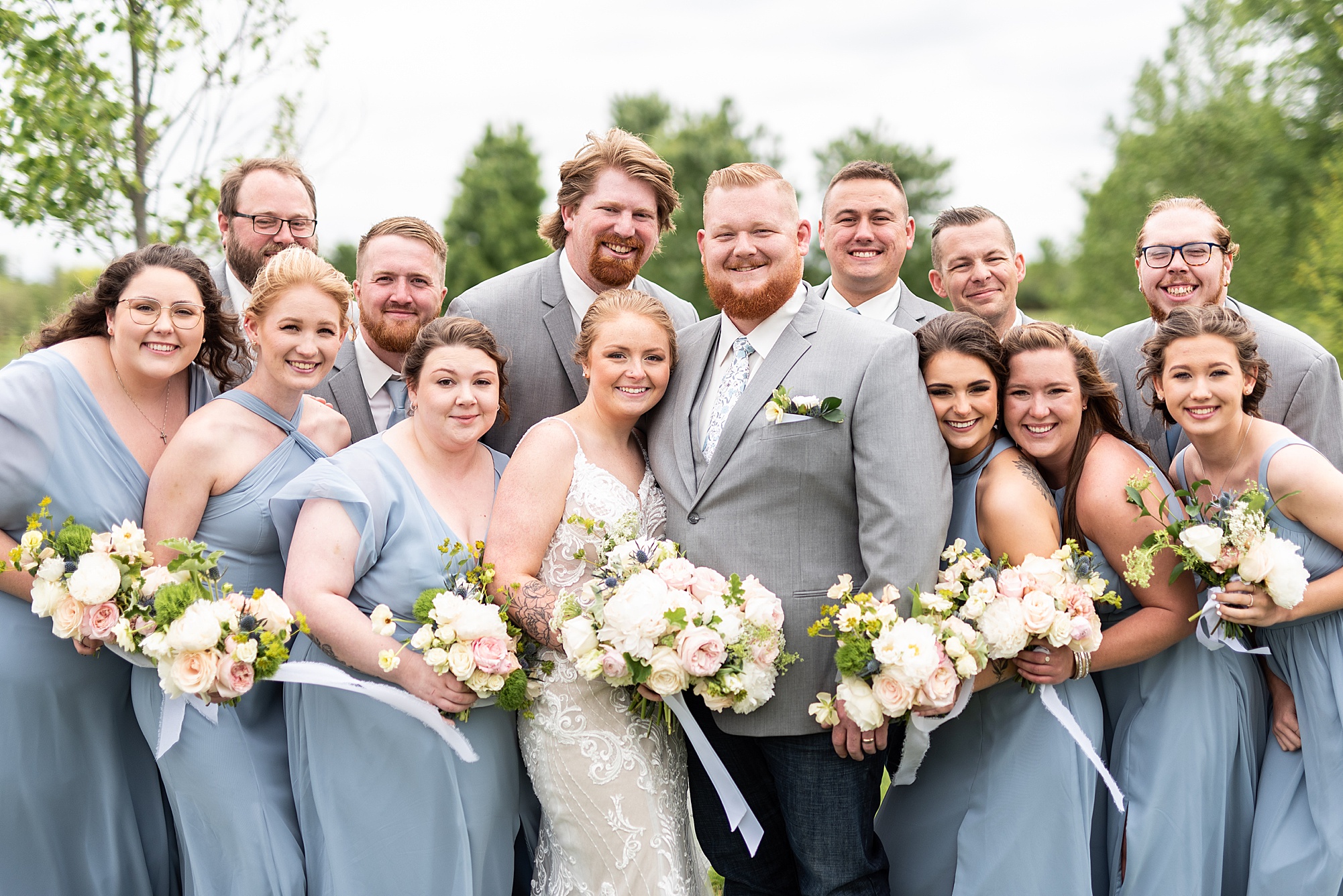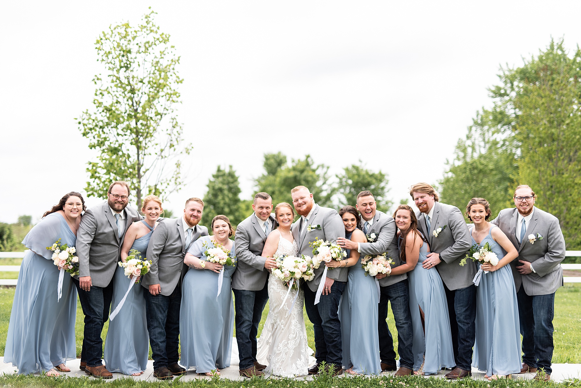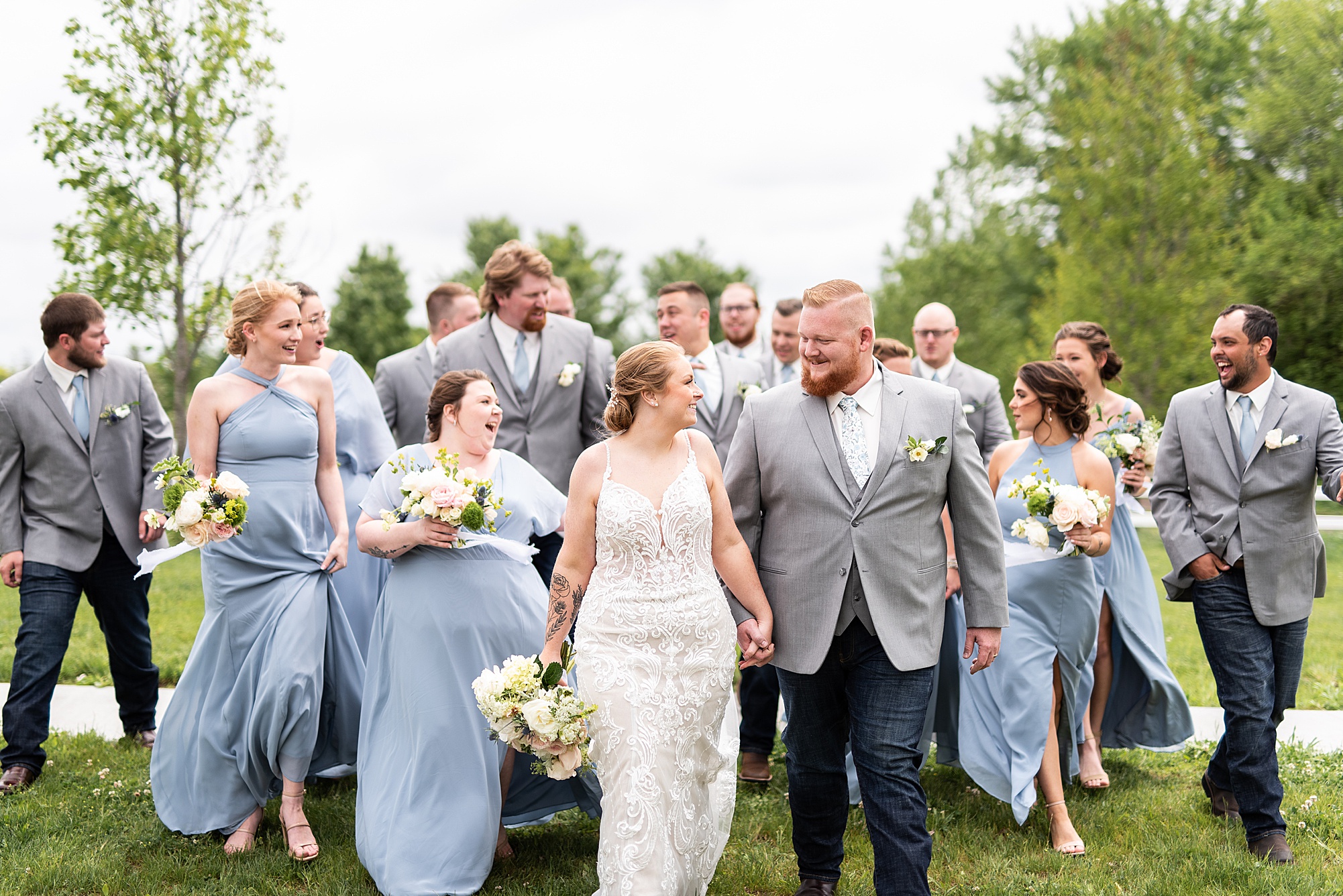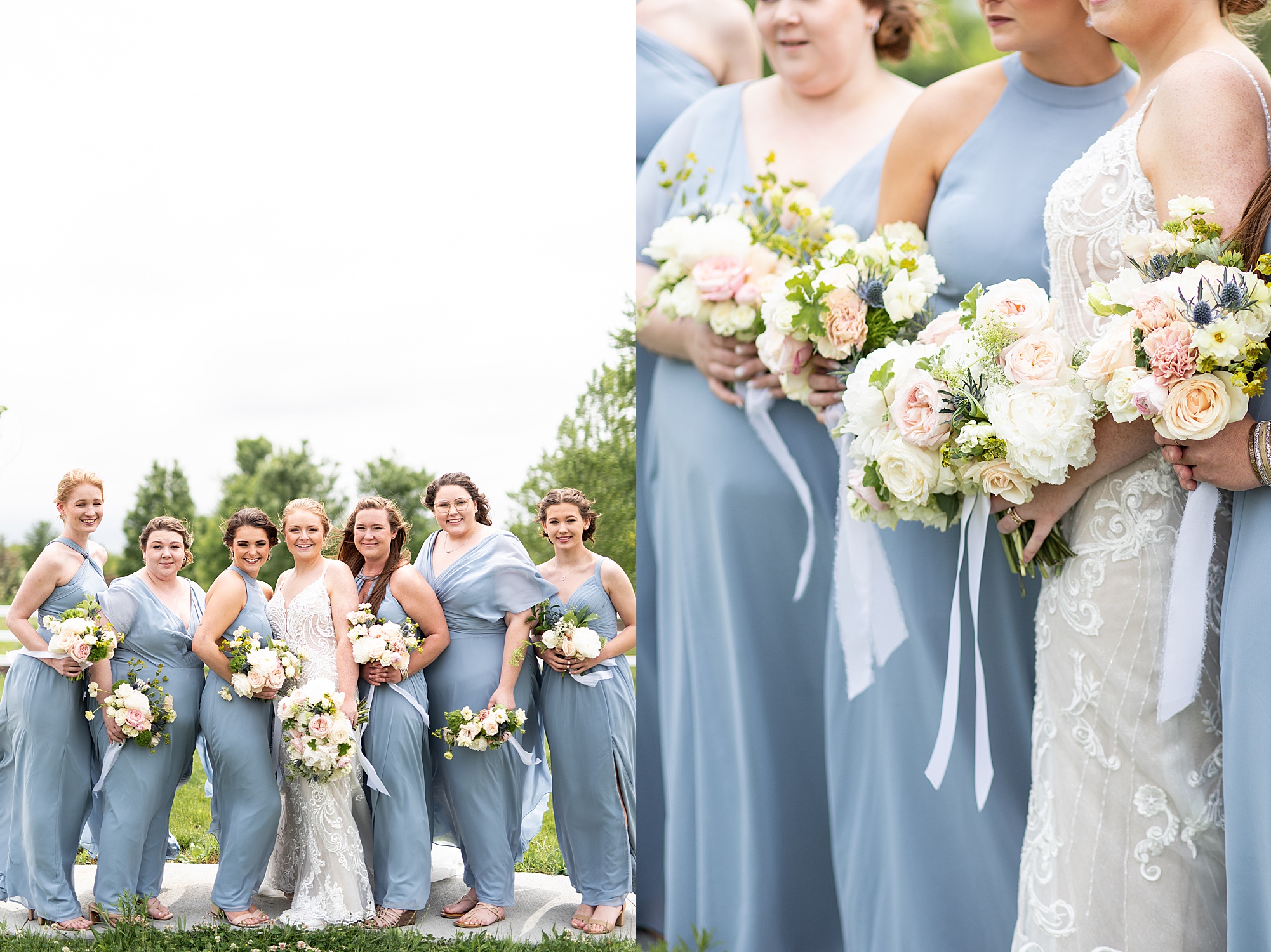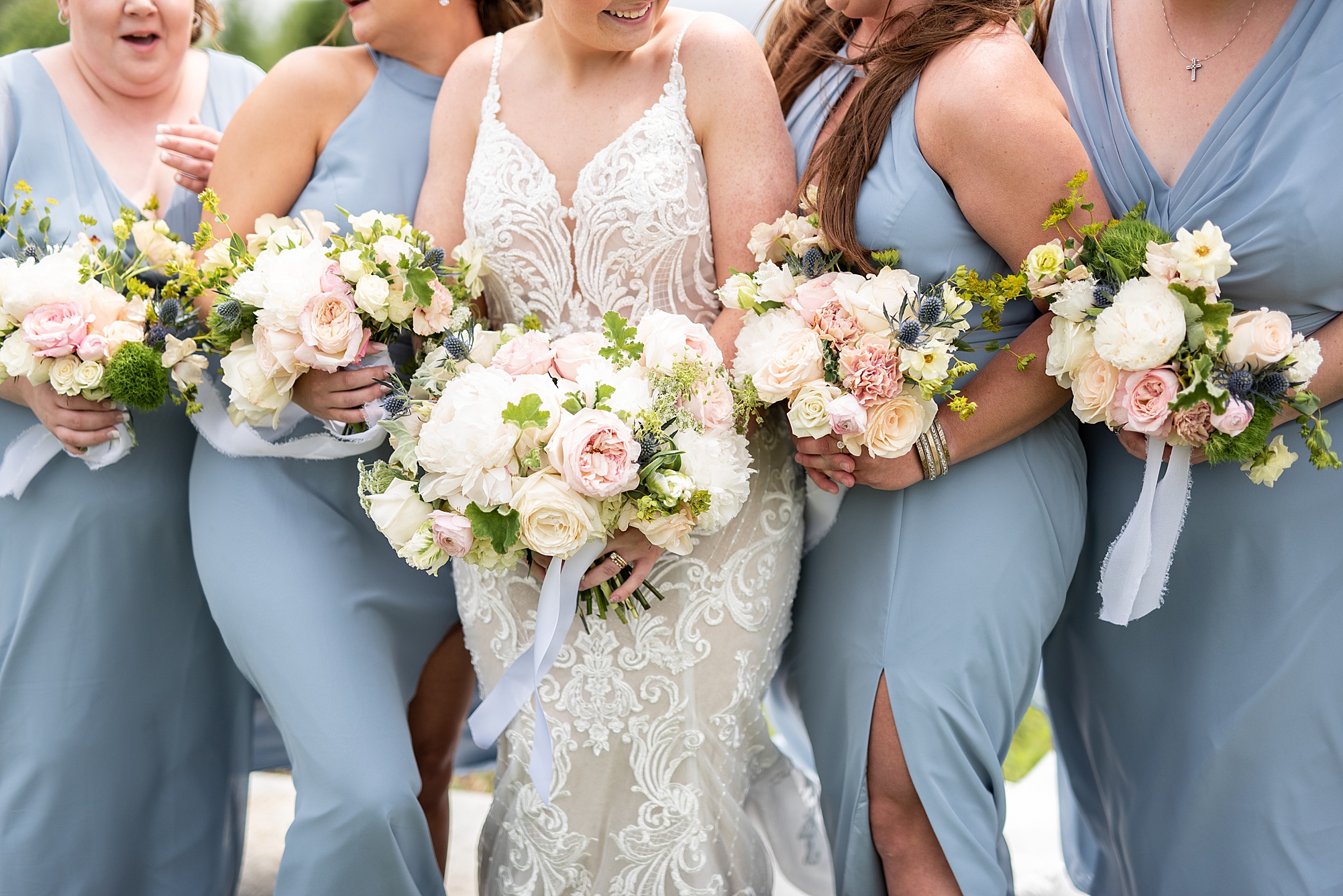 Luckily, as Emma was stepping into her dress and putting on all of her final details, the rain just magically let up and the sun even popped out a bit here and there. She got to share a first look with Forrest outdoors and they exchanged some beautiful, private vows before portrait time. Their bridal party truly brought the party and we had so much fun capturing them all together! Hannah with The Floral Plan really knocked Emma’s vision out of the park with beautiful blues and gorgeous florals to compliment everyone. I love the elegant yet laid back feel to perfectly match Emma and Forrest’s personalities.