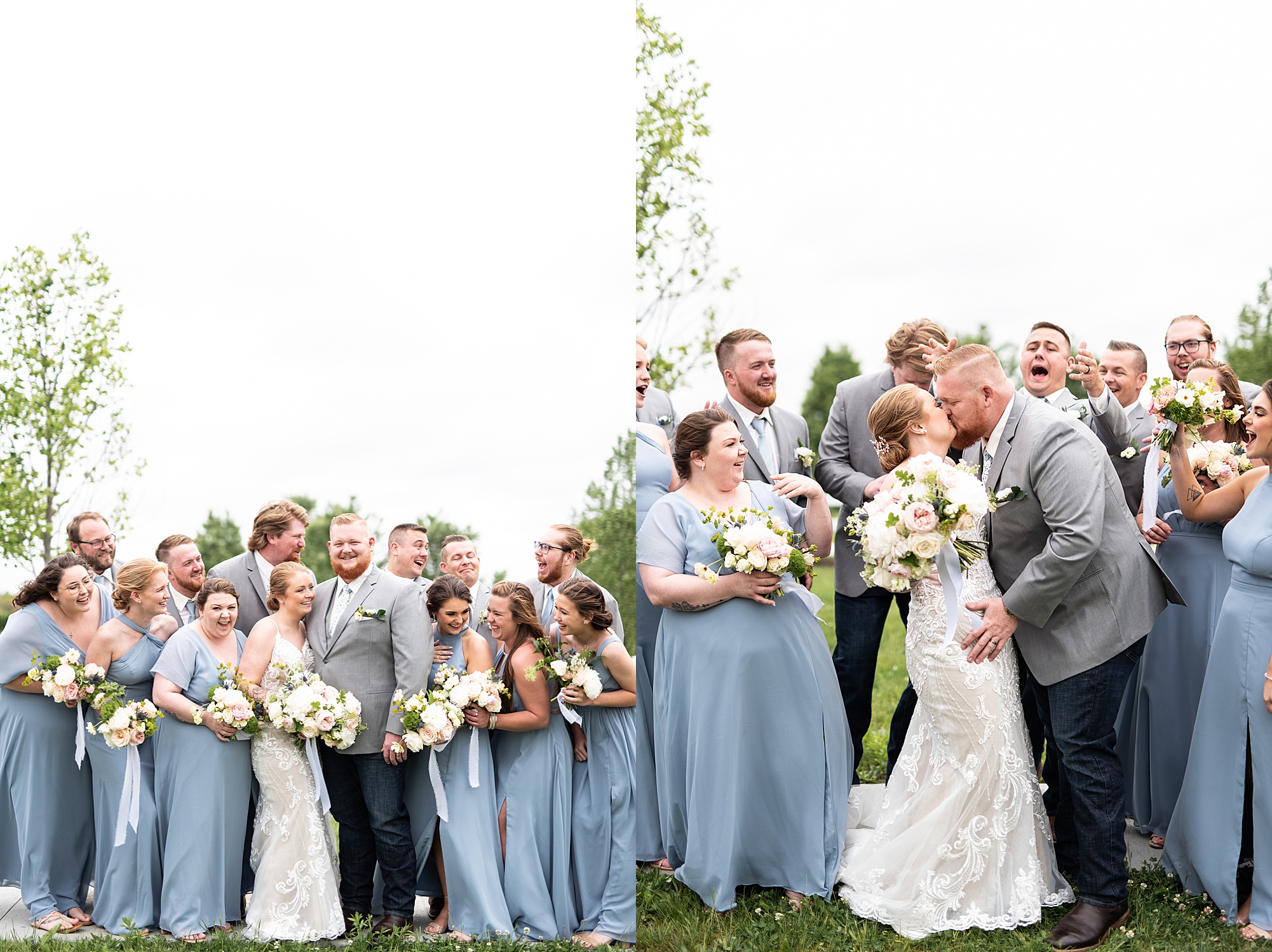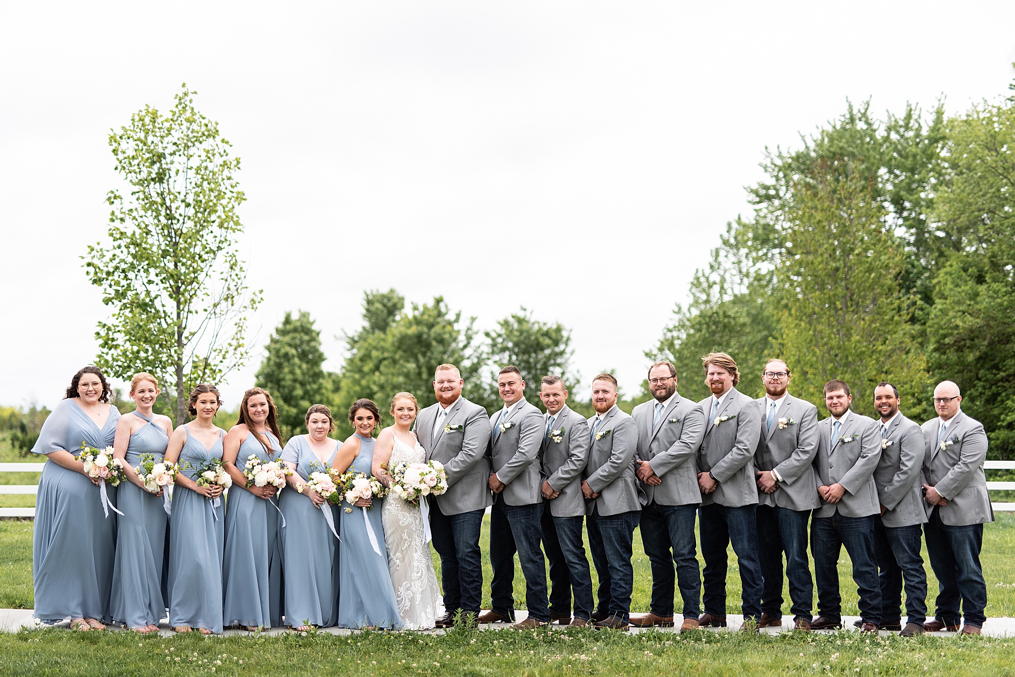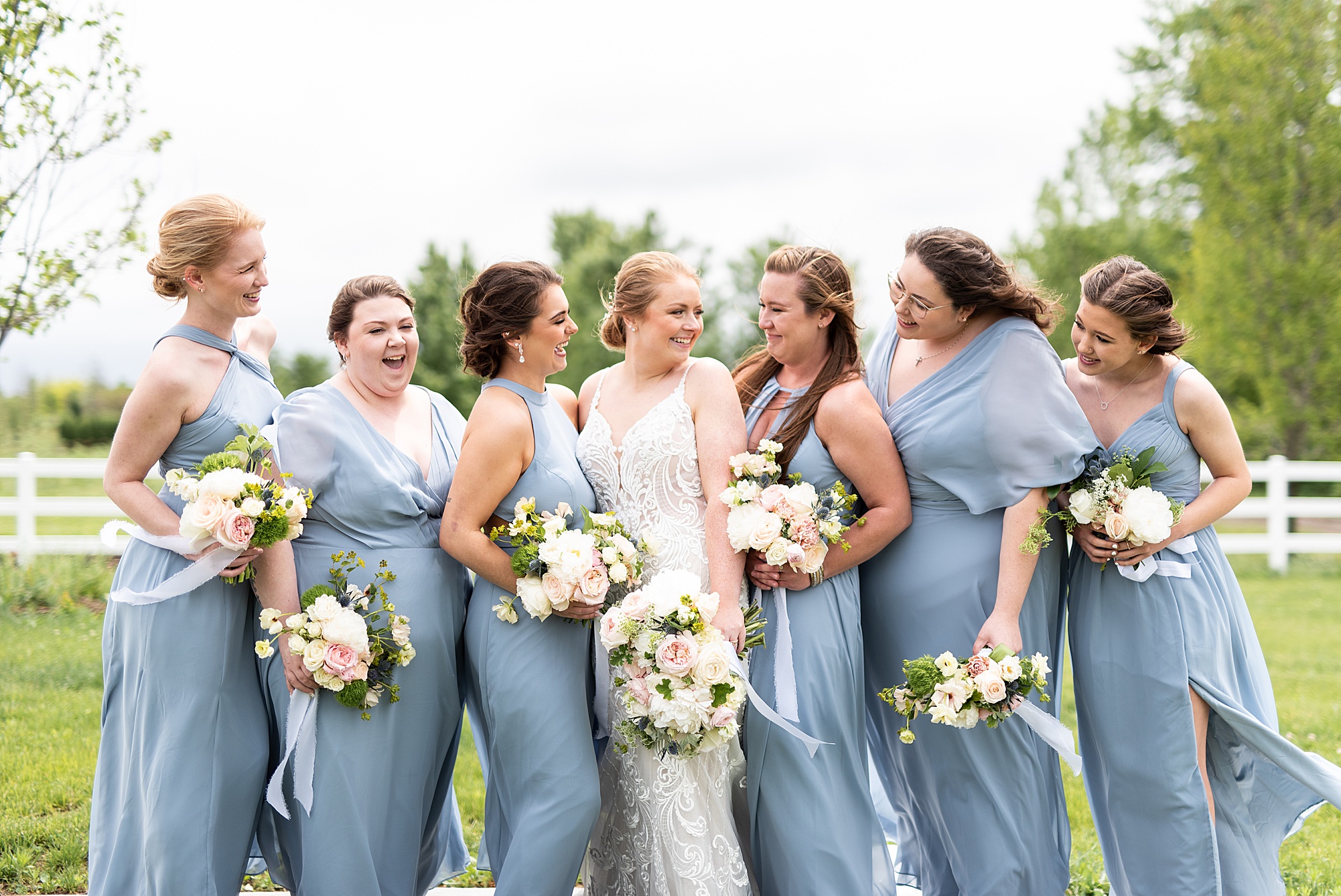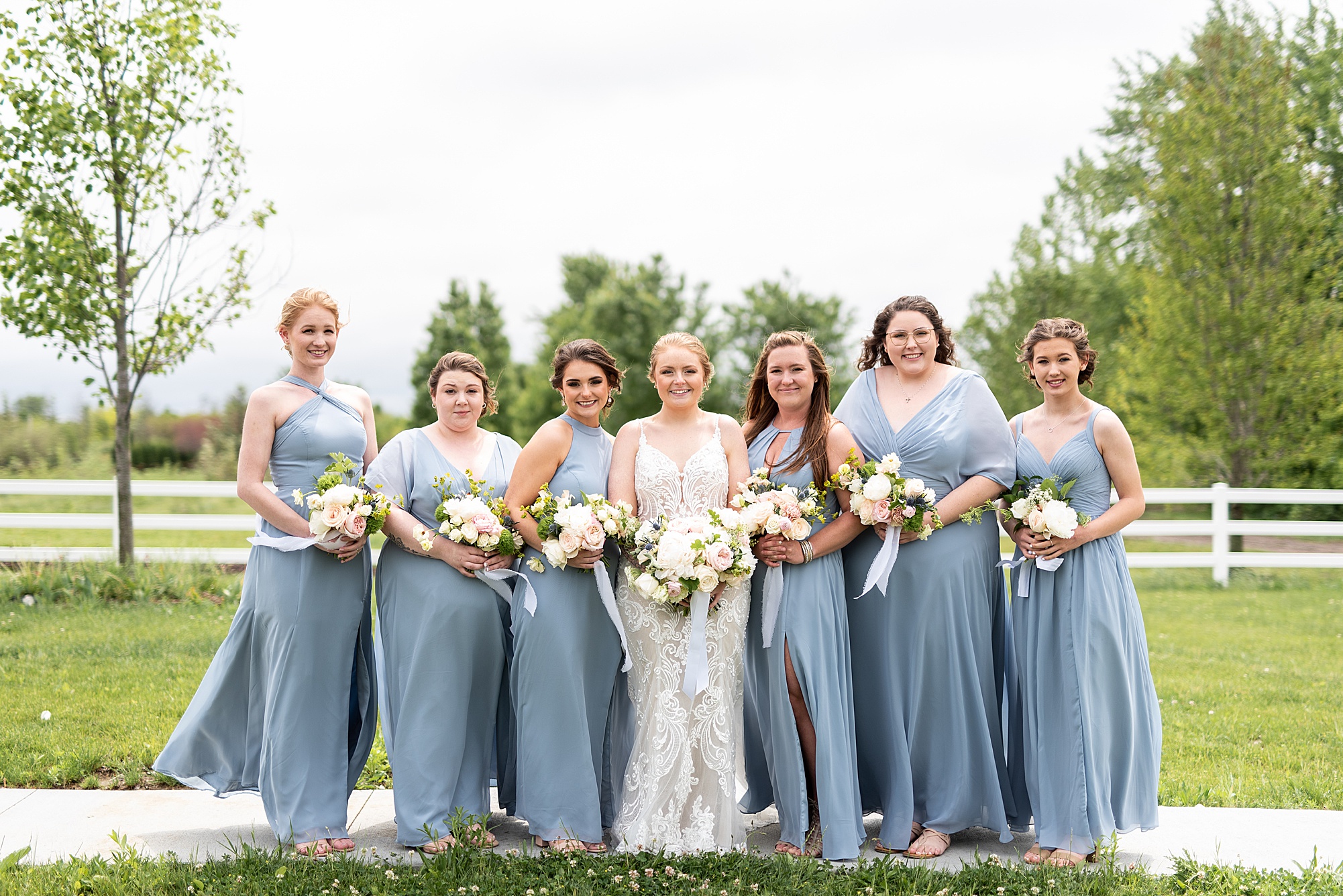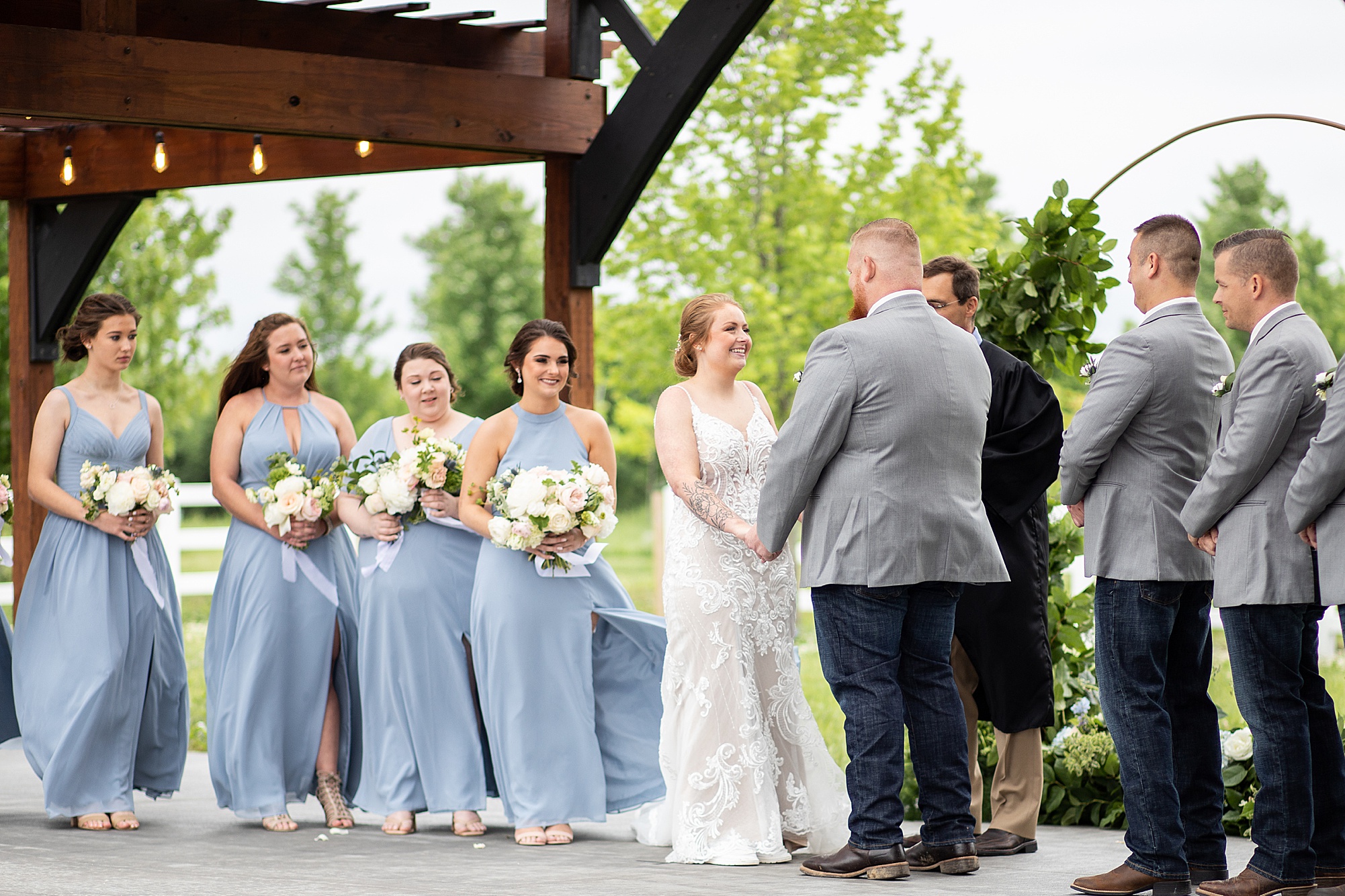 Luckily, as Emma was stepping into her dress and putting on all of her final details, the rain just magically let up and the sun even popped out a bit here and there. She got to share a first look with Forrest outdoors and they exchanged some beautiful, private vows before portrait time. Their bridal party truly brought the party and we had so much fun capturing them all together! Hannah with The Floral Plan really knocked Emma’s vision out of the park with beautiful blues and gorgeous florals to compliment everyone. I love the elegant yet laid back feel to perfectly match Emma and Forrest’s personalities.