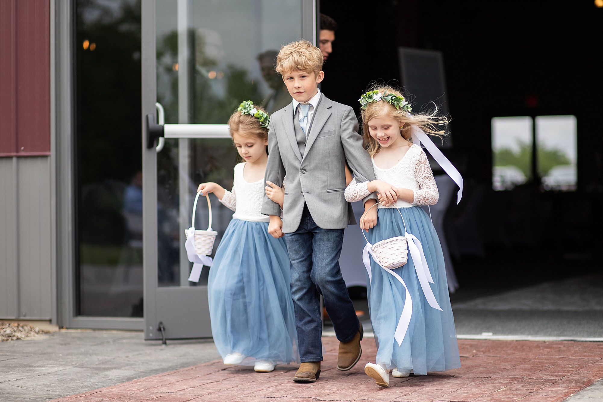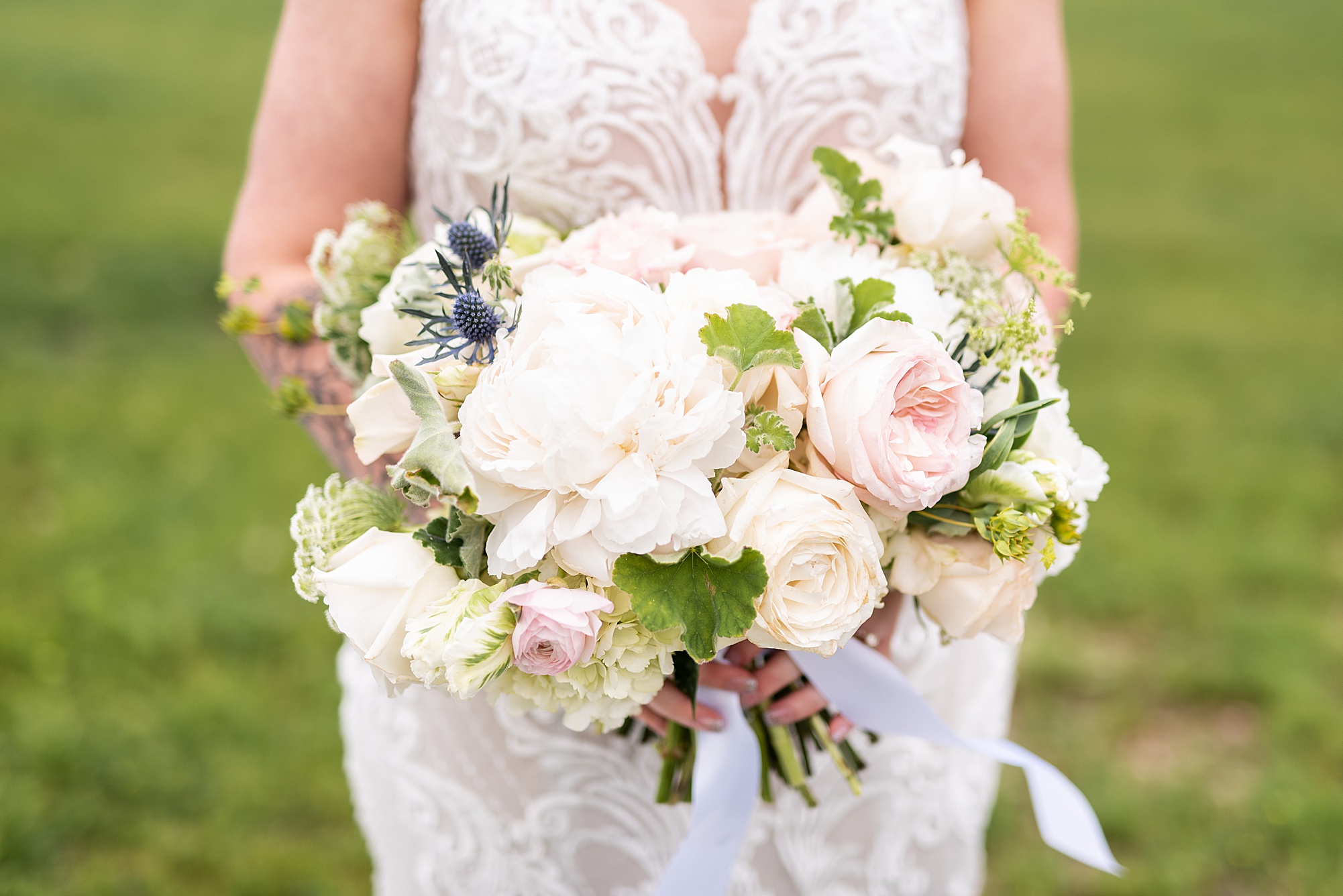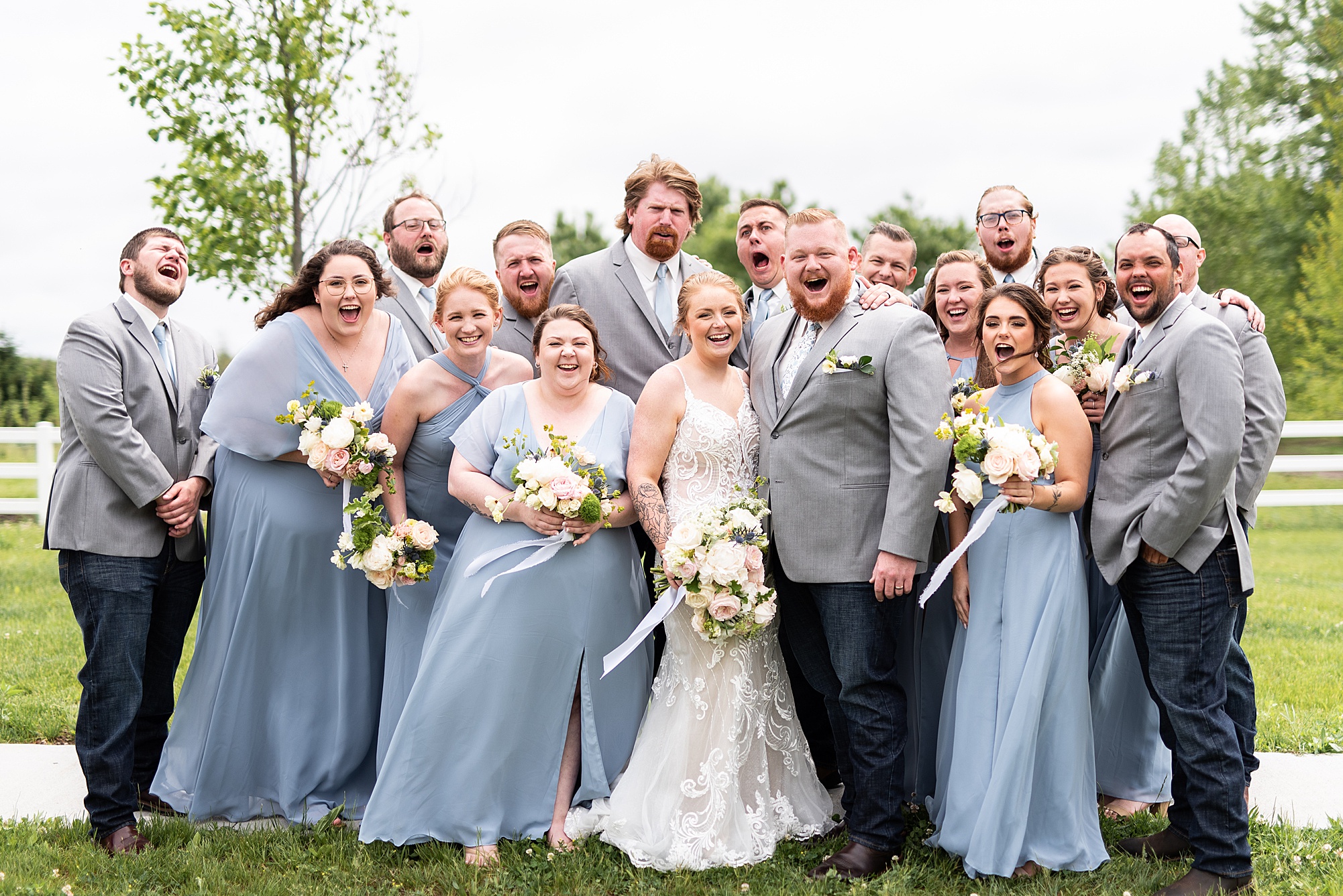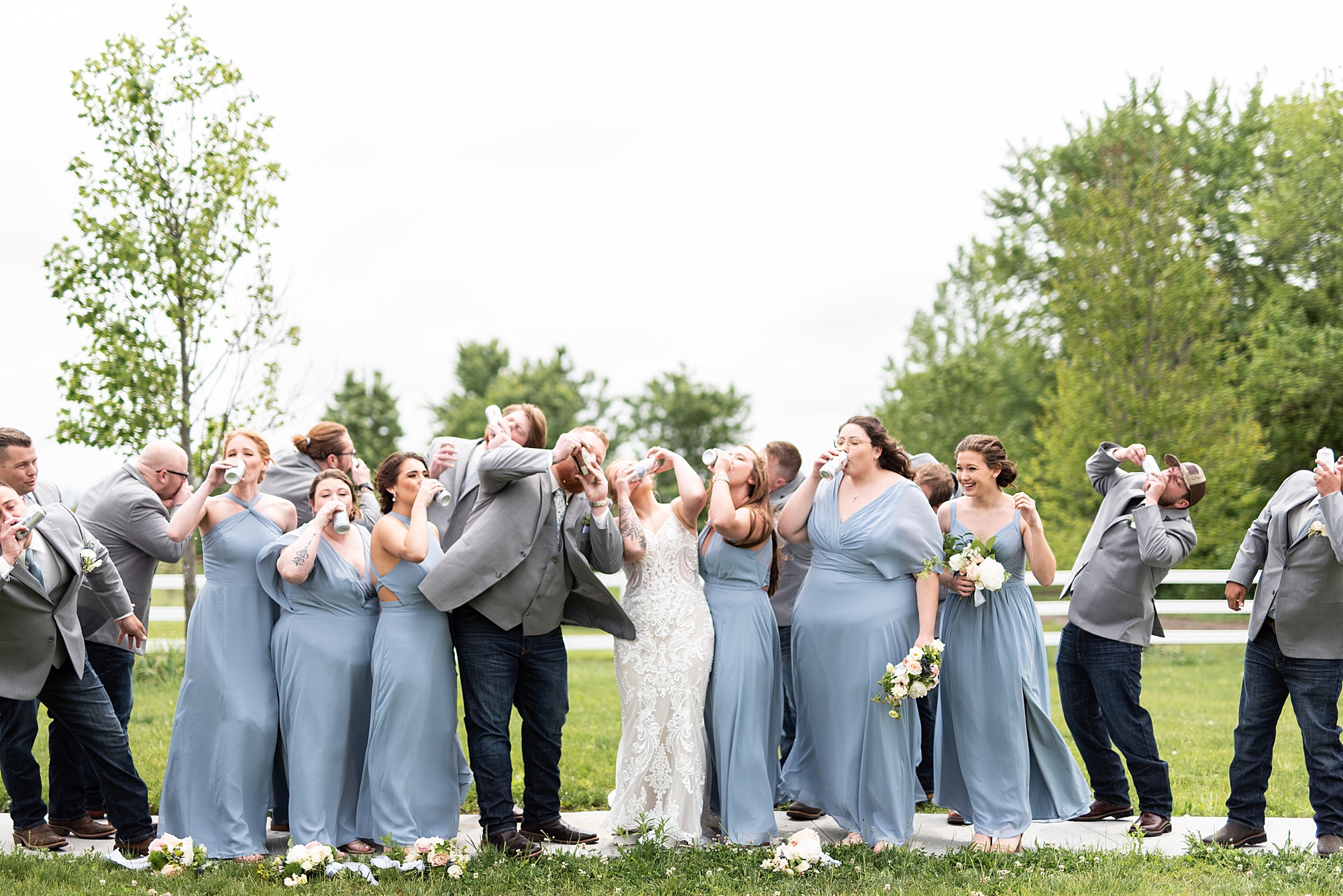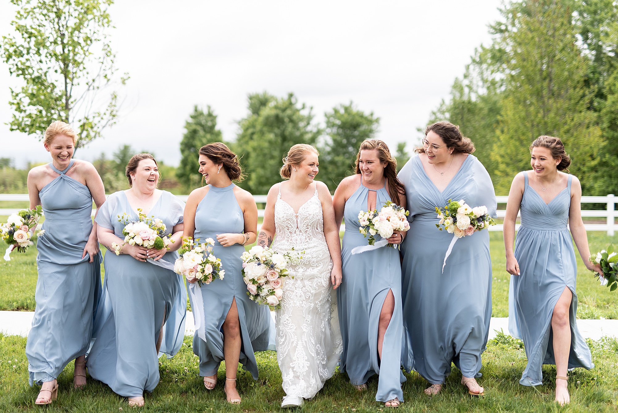Luckily, as Emma was stepping into her dress and putting on all of her final details, the rain just magically let up and the sun even popped out a bit here and there. She got to share a first look with Forrest outdoors and they exchanged some beautiful, private vows before portrait time. Their bridal party truly brought the party and we had so much fun capturing them all together! Hannah with The Floral Plan really knocked Emma’s vision out of the park with beautiful blues and gorgeous florals to compliment everyone. I love the elegant yet laid back feel to perfectly match Emma and Forrest’s personalities.