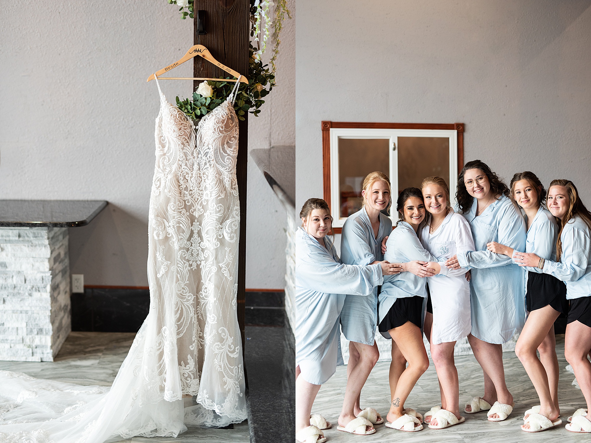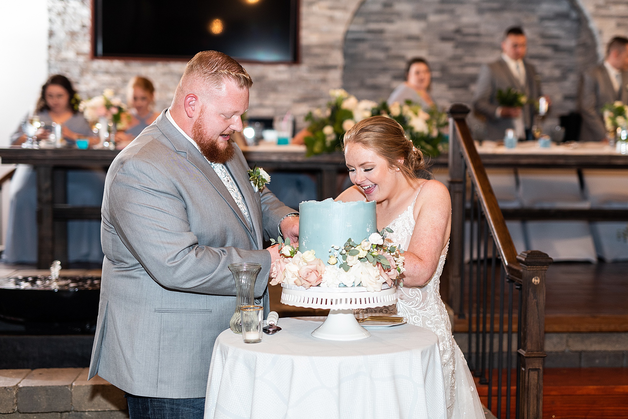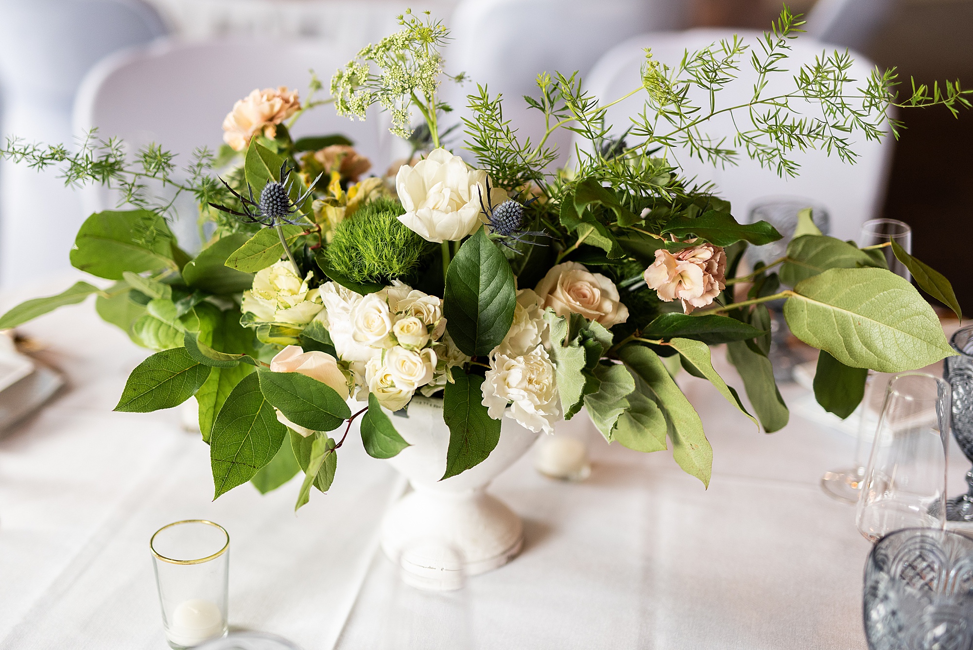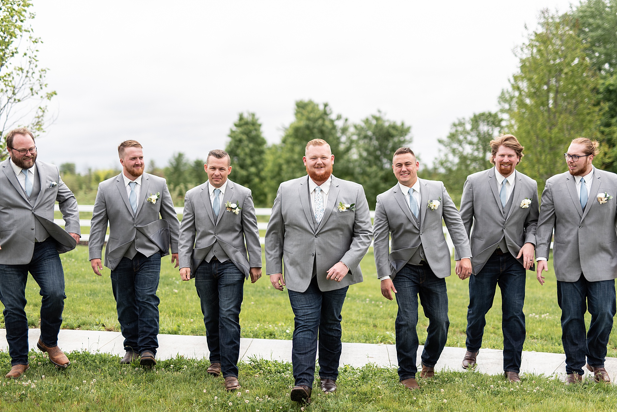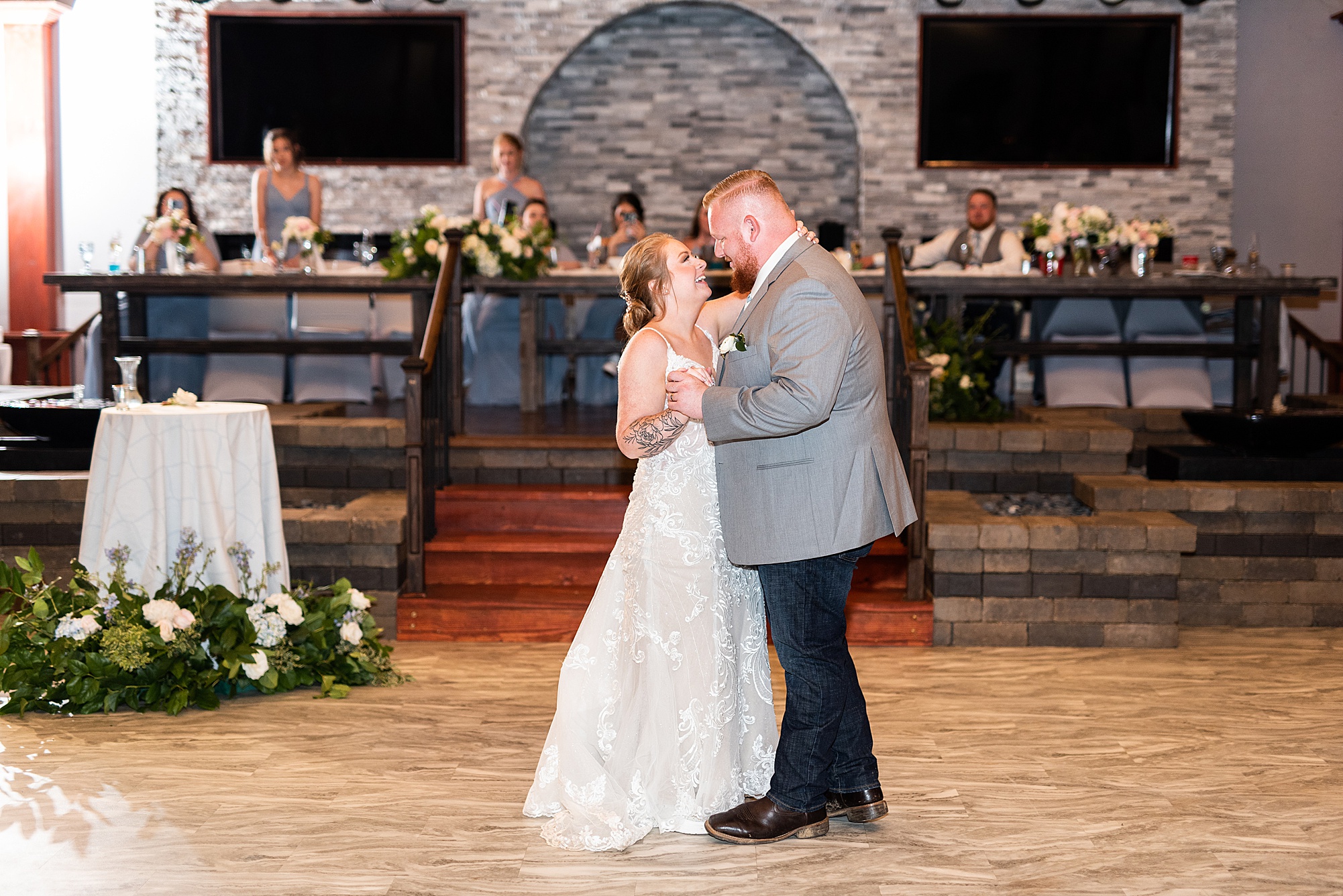 Luckily, as Emma was stepping into her dress and putting on all of her final details, the rain just magically let up and the sun even popped out a bit here and there. She got to share a first look with Forrest outdoors and they exchanged some beautiful, private vows before portrait time. Their bridal party truly brought the party and we had so much fun capturing them all together! Hannah with The Floral Plan really knocked Emma’s vision out of the park with beautiful blues and gorgeous florals to compliment everyone. I love the elegant yet laid back feel to perfectly match Emma and Forrest’s personalities.