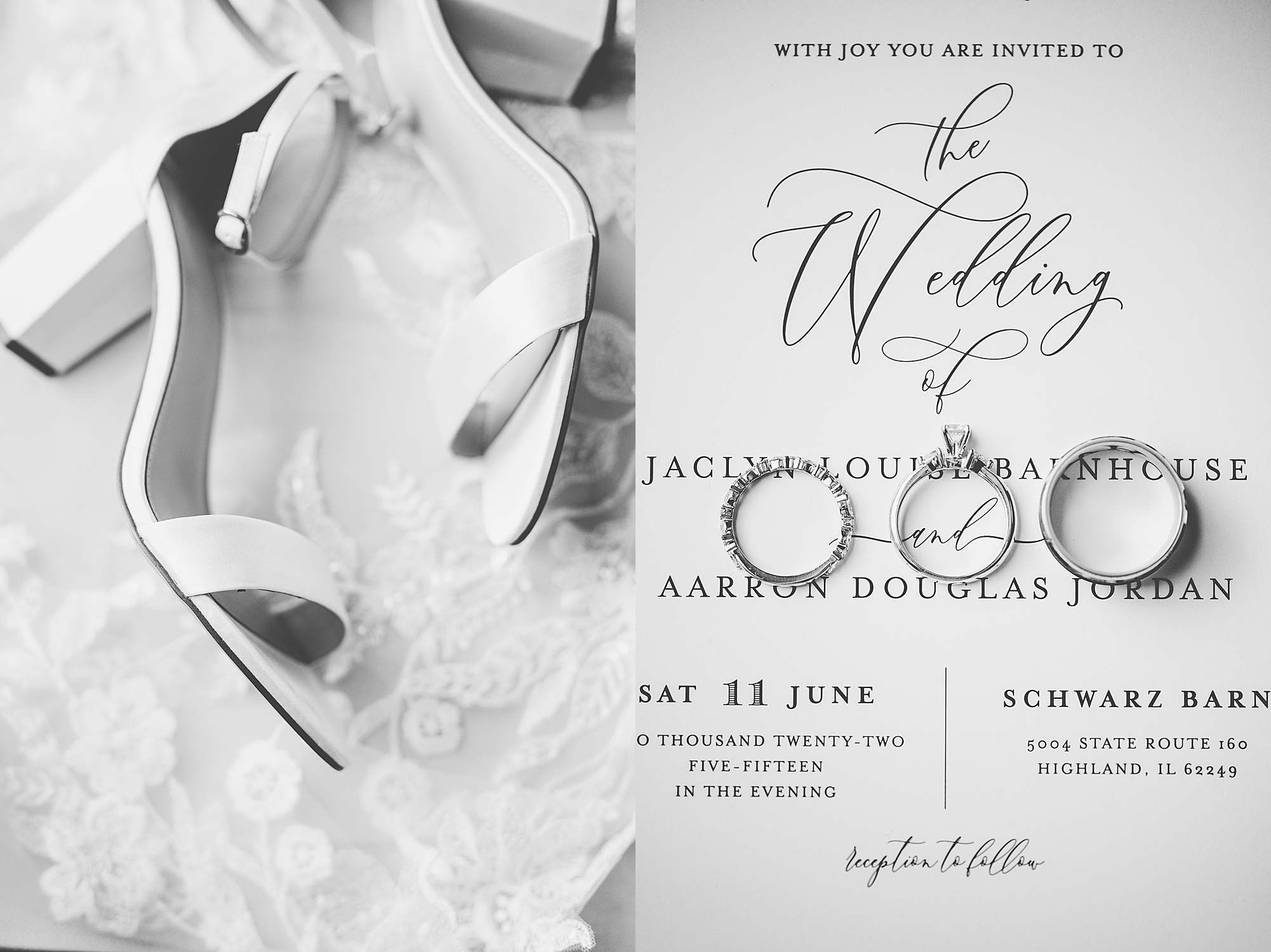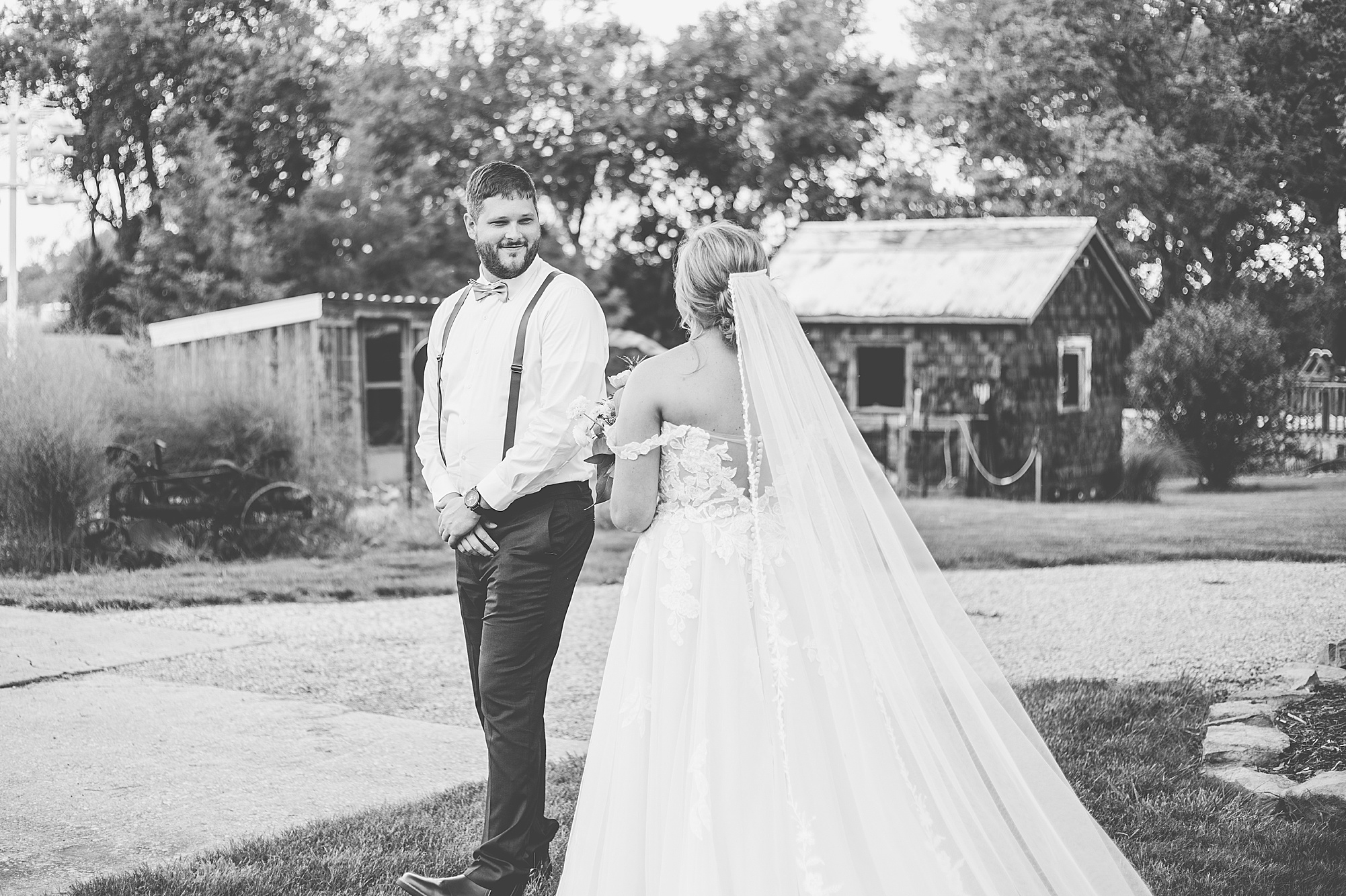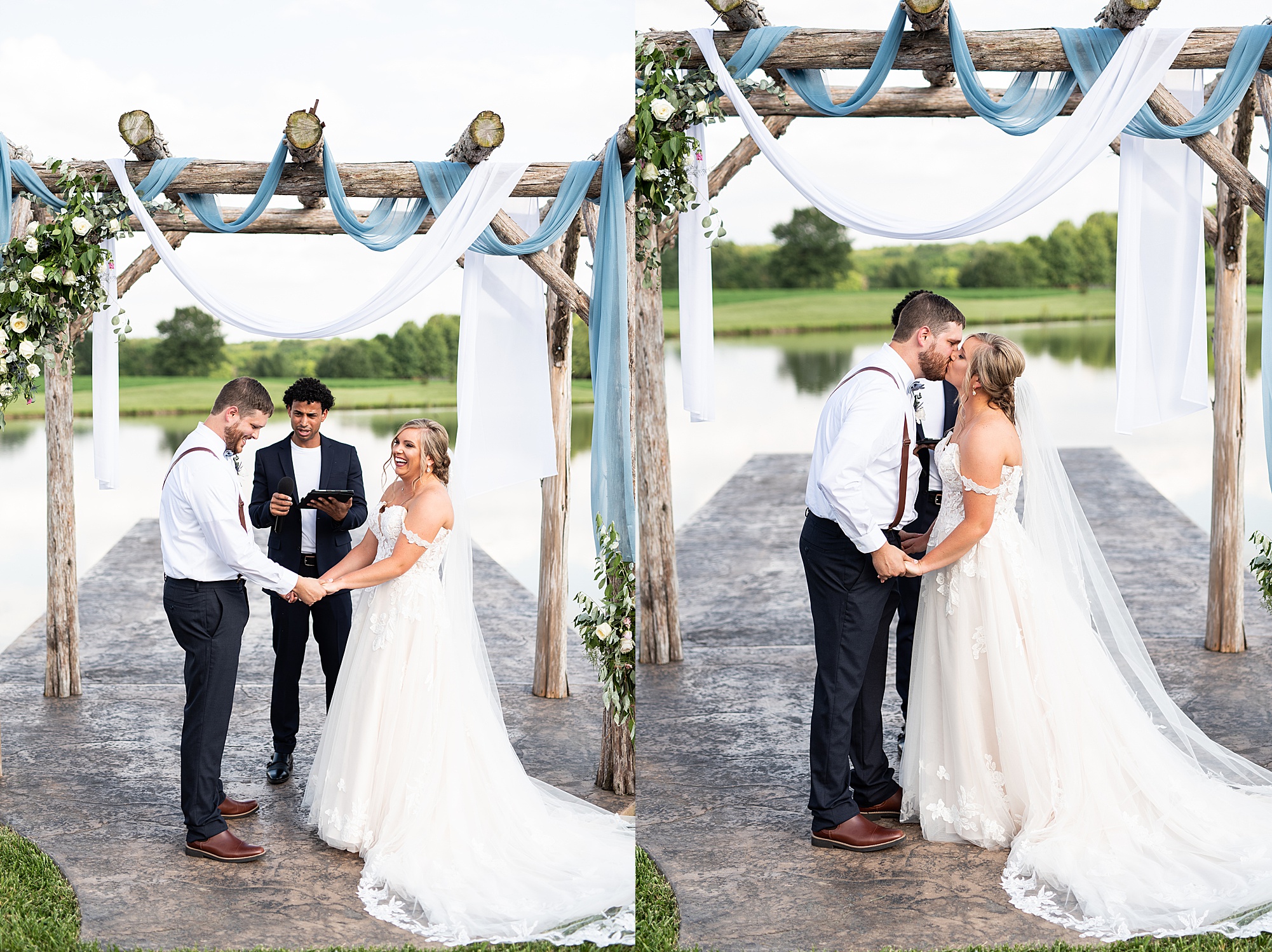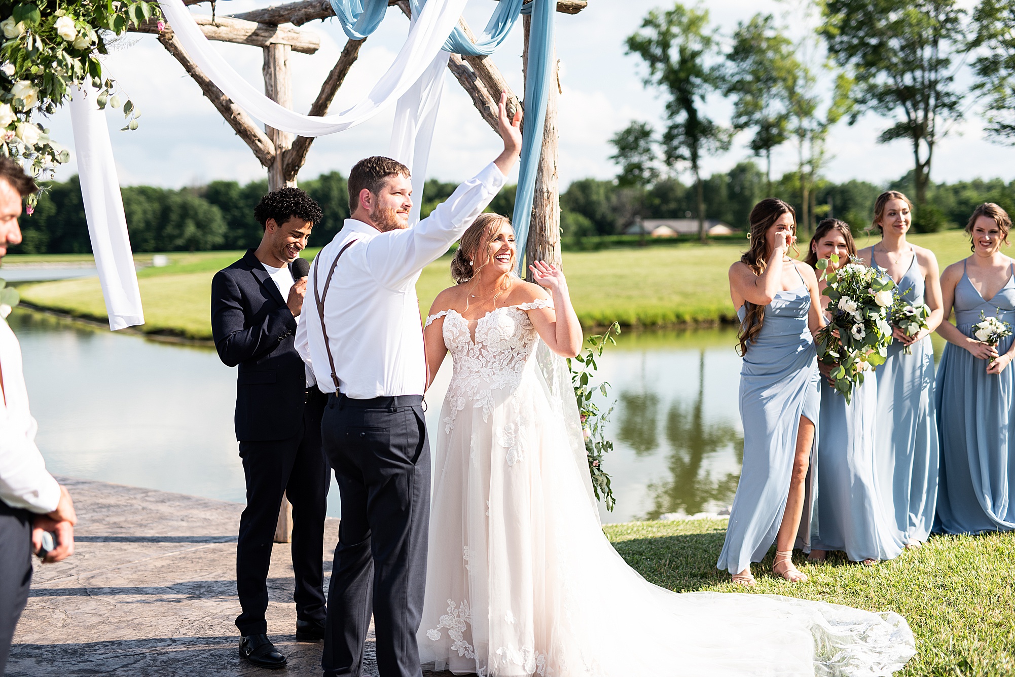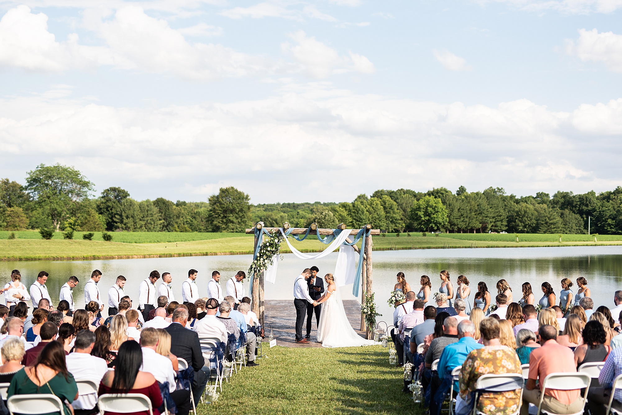 Their wedding venue, Shwarz Barn in Highland, IL, is an absolutely gorgeous property with a barn converted into a stunning space for weddings. Jaclyn and Aarron fell in love with it immediately and I can tell why because it was so perfect for them and their laid back style. Jaclyn shared a sweet first look with her dad before he walked his only child down the aisle to a grinning Aarron. A very close friend officially married them overlooking the pond in such a beautiful and fun ceremony! Jaclyn and Aarron shared their first kiss as husband and wife before dancing back down the aisle, ready to celebrate!
