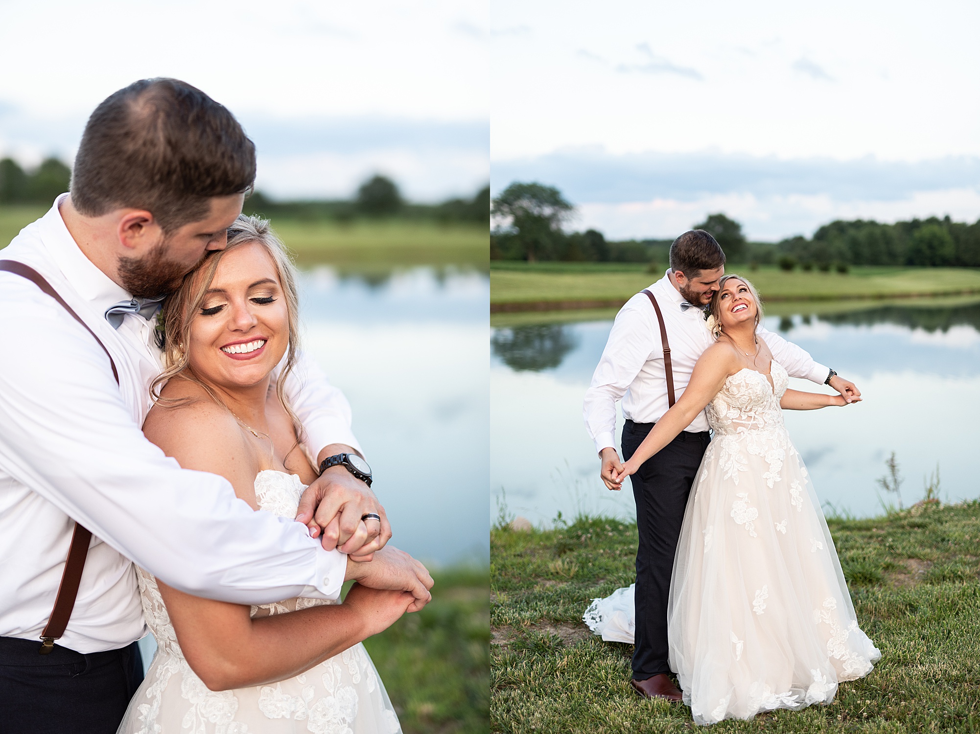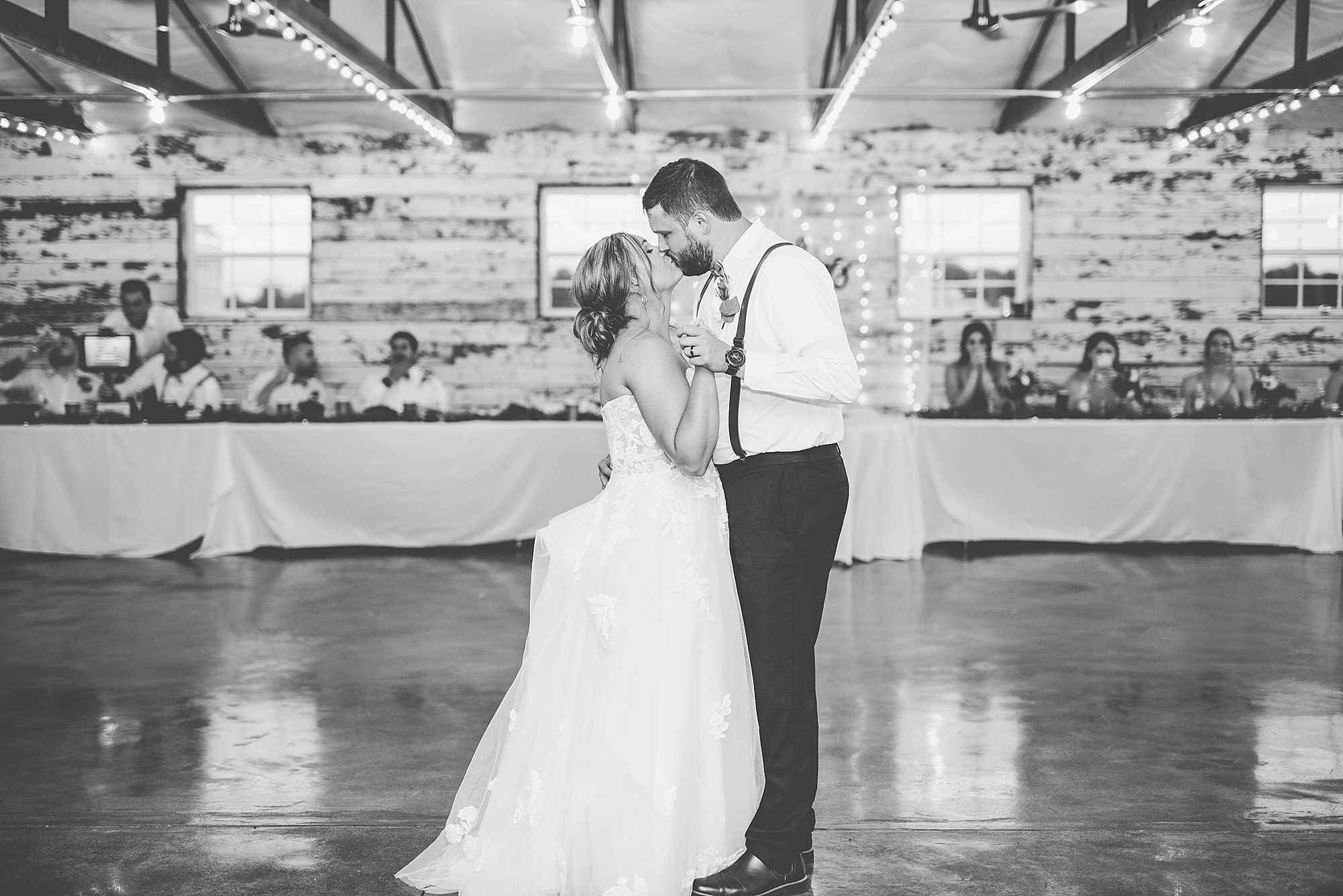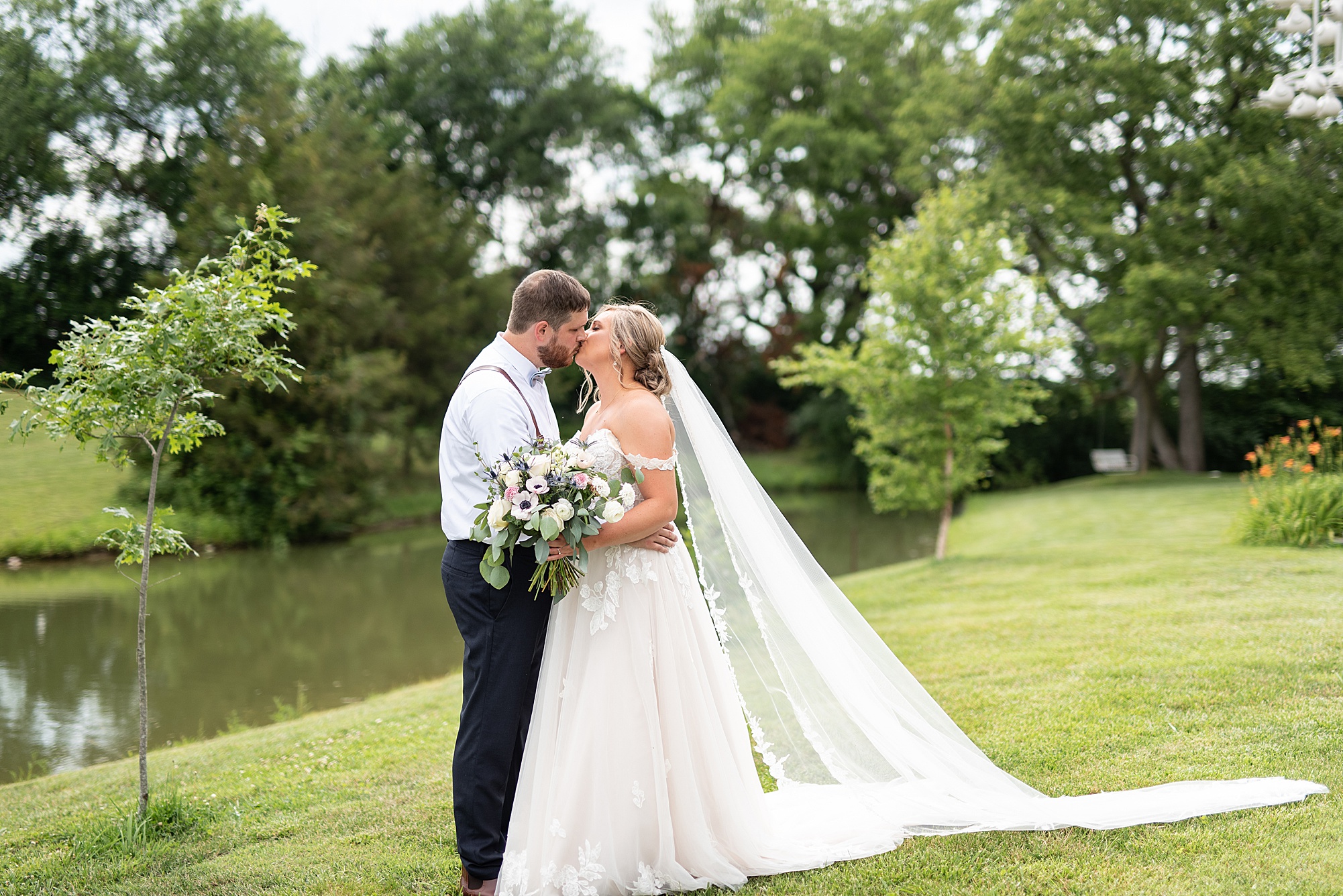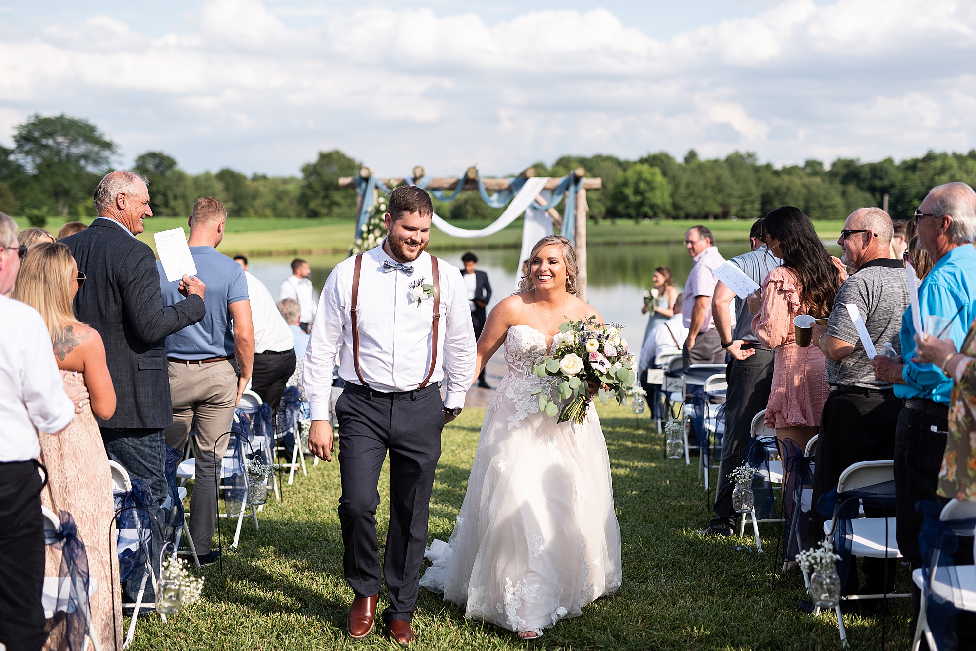 Their wedding venue, Shwarz Barn in Highland, IL, is an absolutely gorgeous property with a barn converted into a stunning space for weddings. Jaclyn and Aarron fell in love with it immediately and I can tell why because it was so perfect for them and their laid back style. Jaclyn shared a sweet first look with her dad before he walked his only child down the aisle to a grinning Aarron. A very close friend officially married them overlooking the pond in such a beautiful and fun ceremony! Jaclyn and Aarron shared their first kiss as husband and wife before dancing back down the aisle, ready to celebrate!