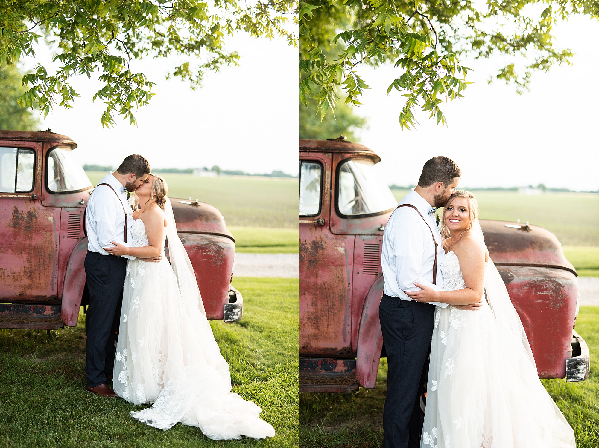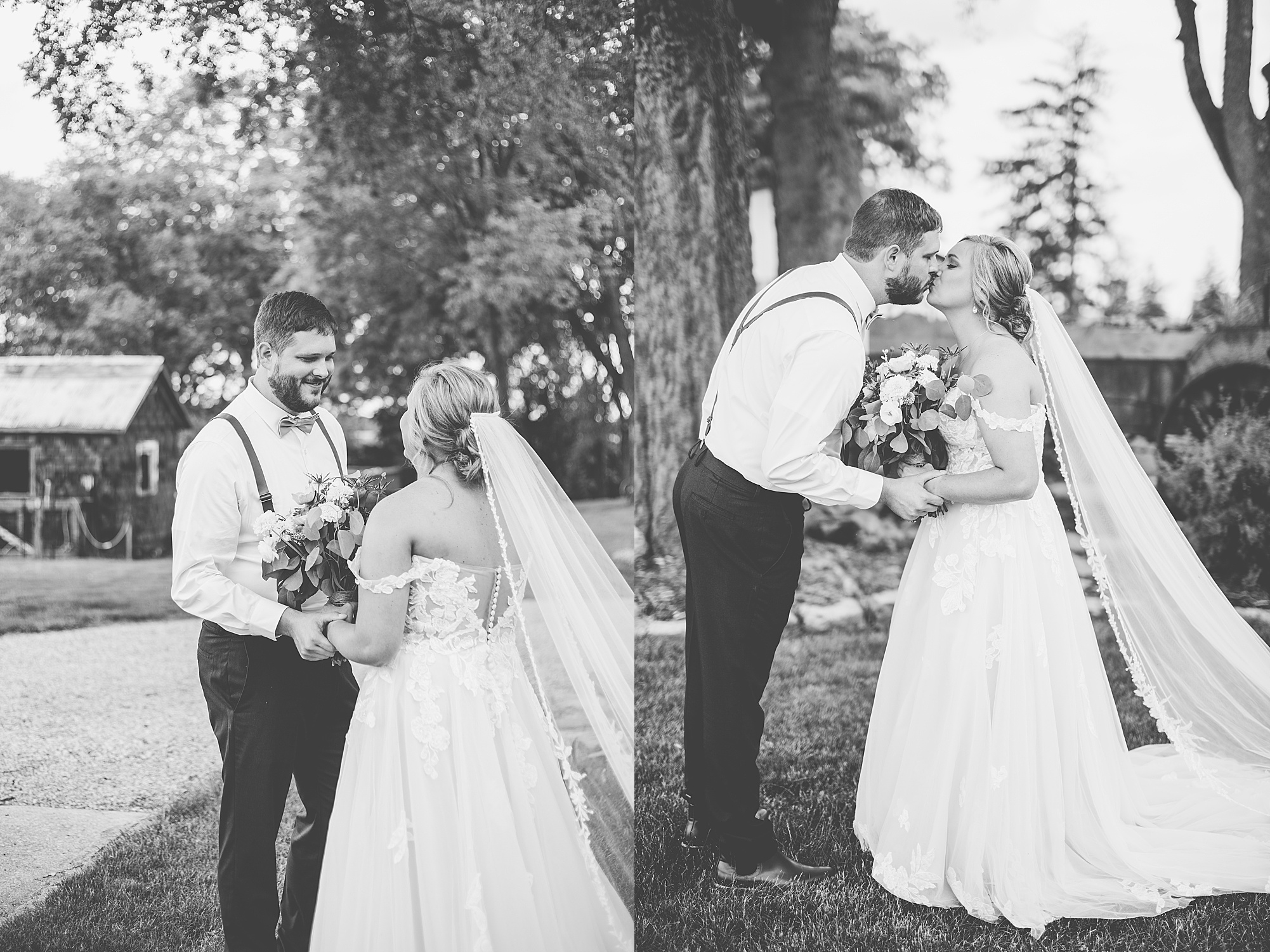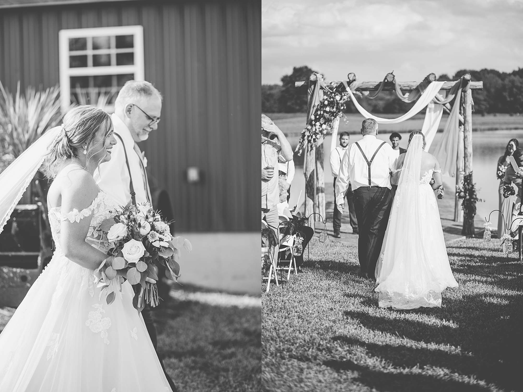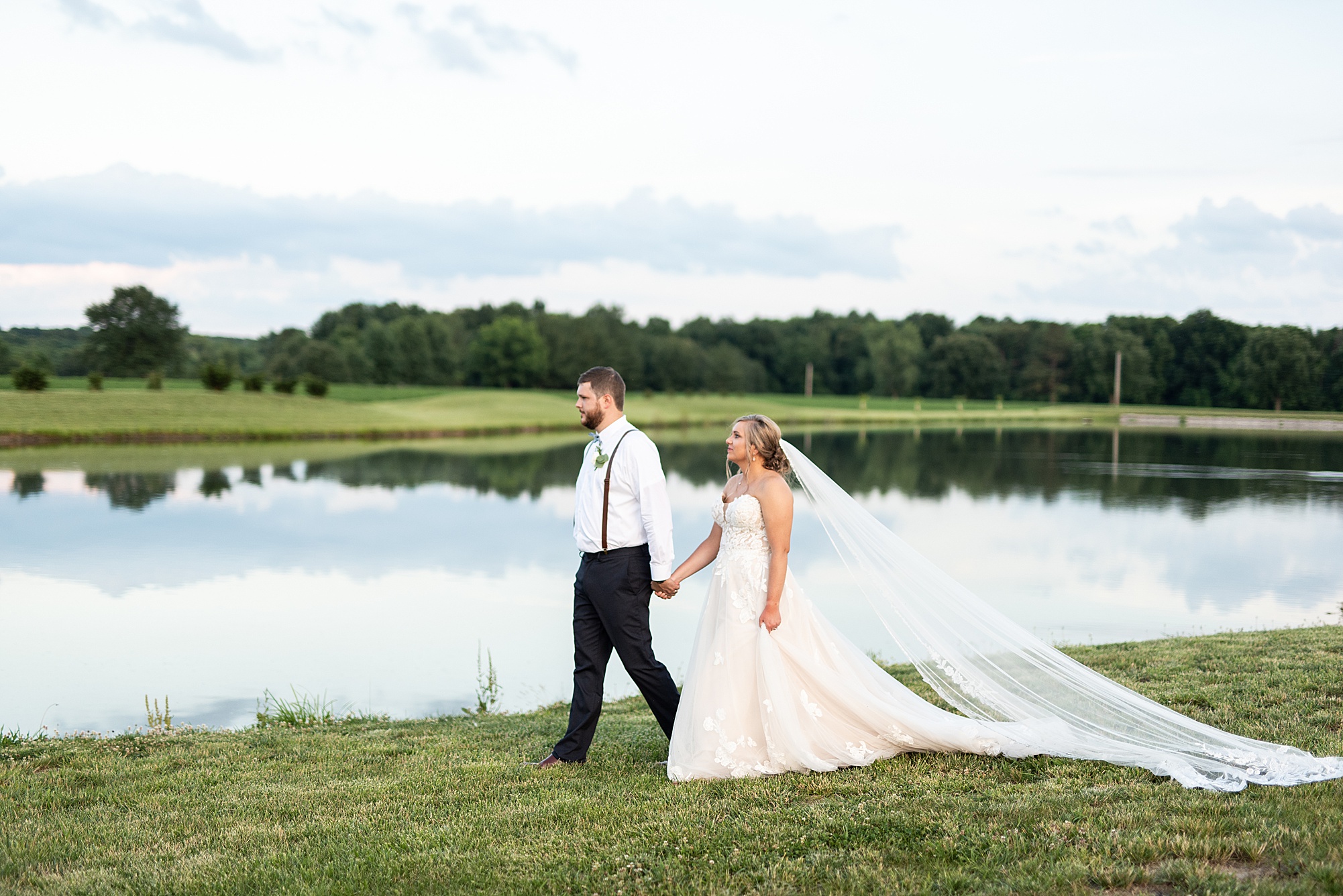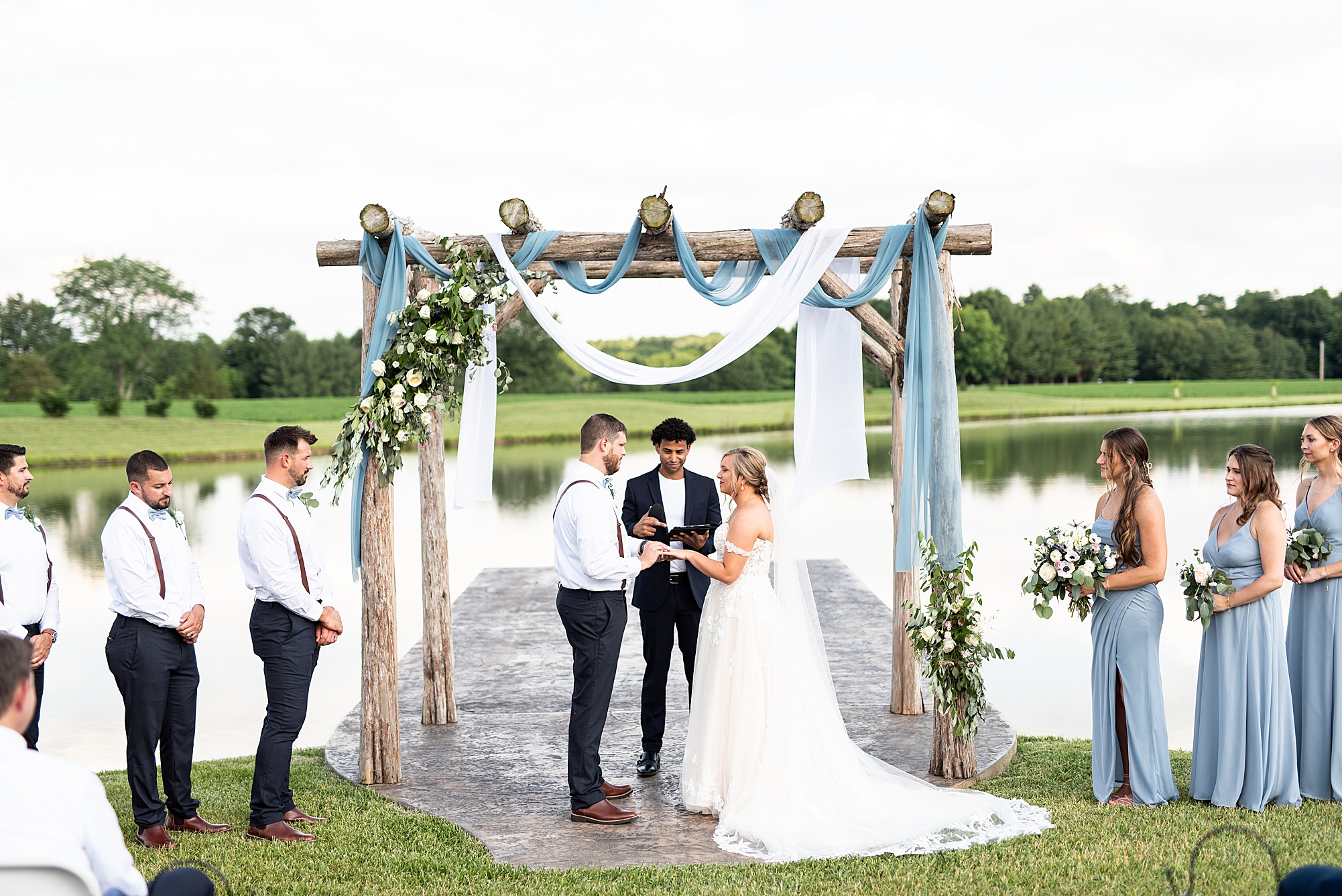 Their wedding venue, Shwarz Barn in Highland, IL, is an absolutely gorgeous property with a barn converted into a stunning space for weddings. Jaclyn and Aarron fell in love with it immediately and I can tell why because it was so perfect for them and their laid back style. Jaclyn shared a sweet first look with her dad before he walked his only child down the aisle to a grinning Aarron. A very close friend officially married them overlooking the pond in such a beautiful and fun ceremony! Jaclyn and Aarron shared their first kiss as husband and wife before dancing back down the aisle, ready to celebrate!
