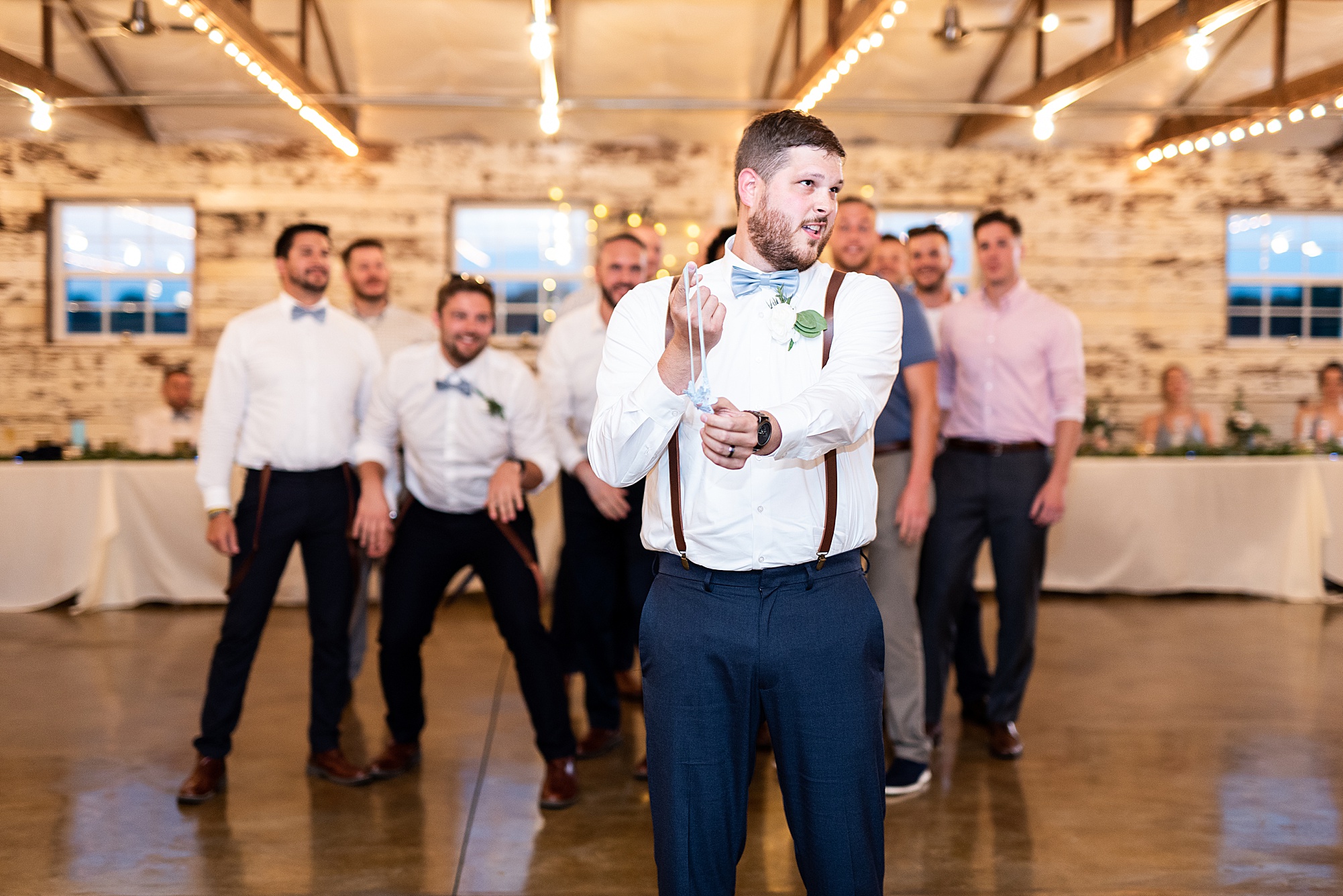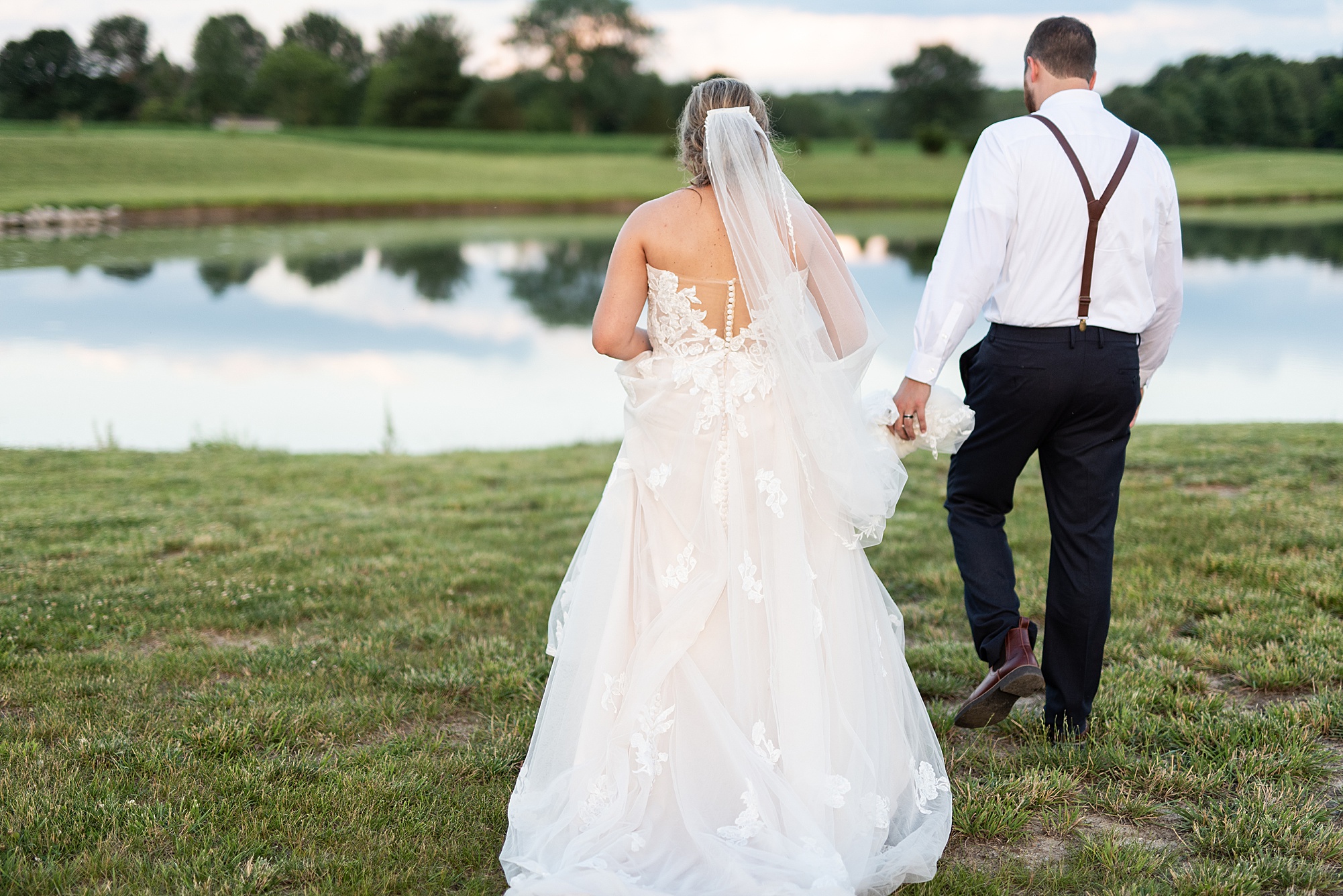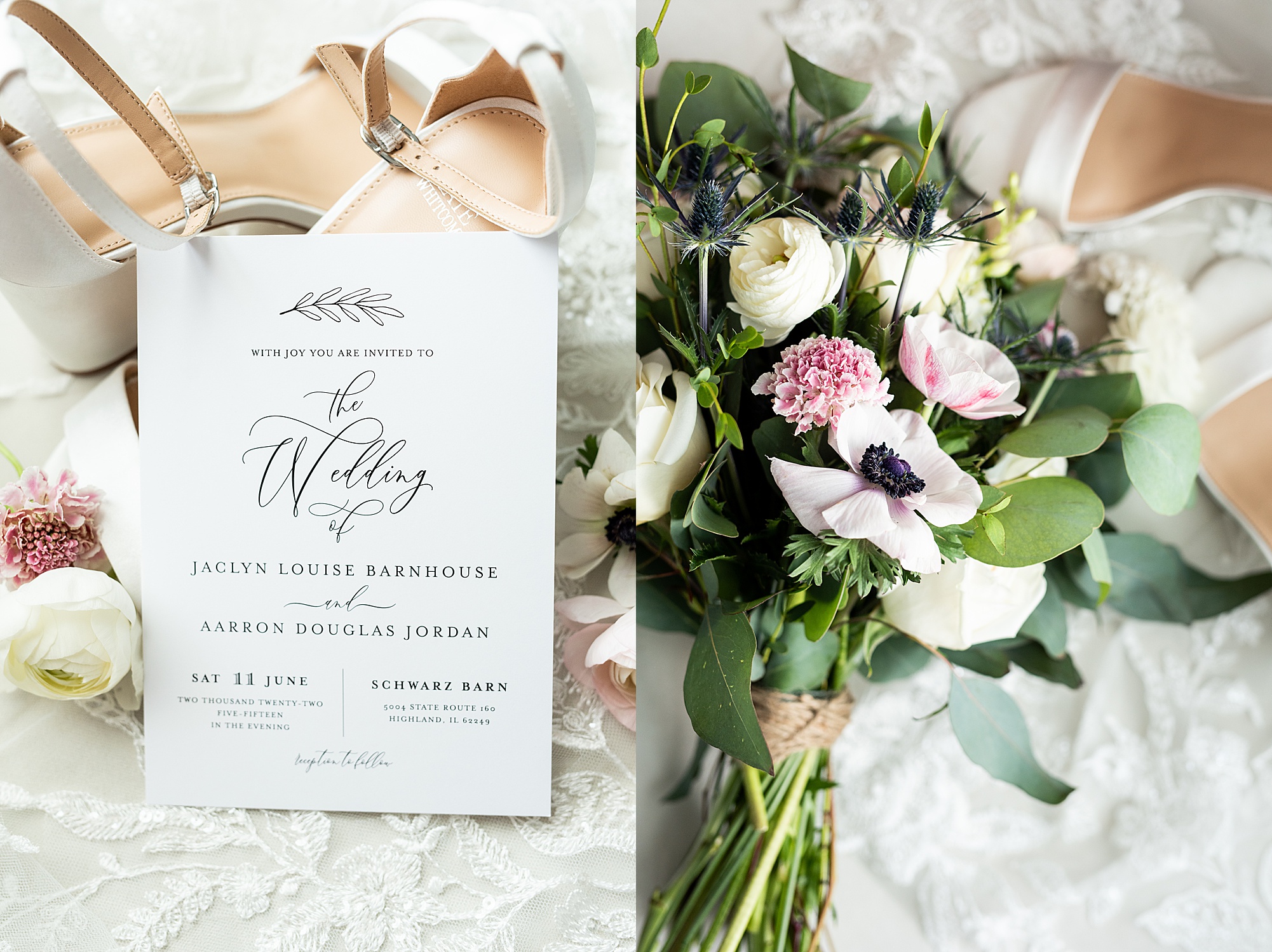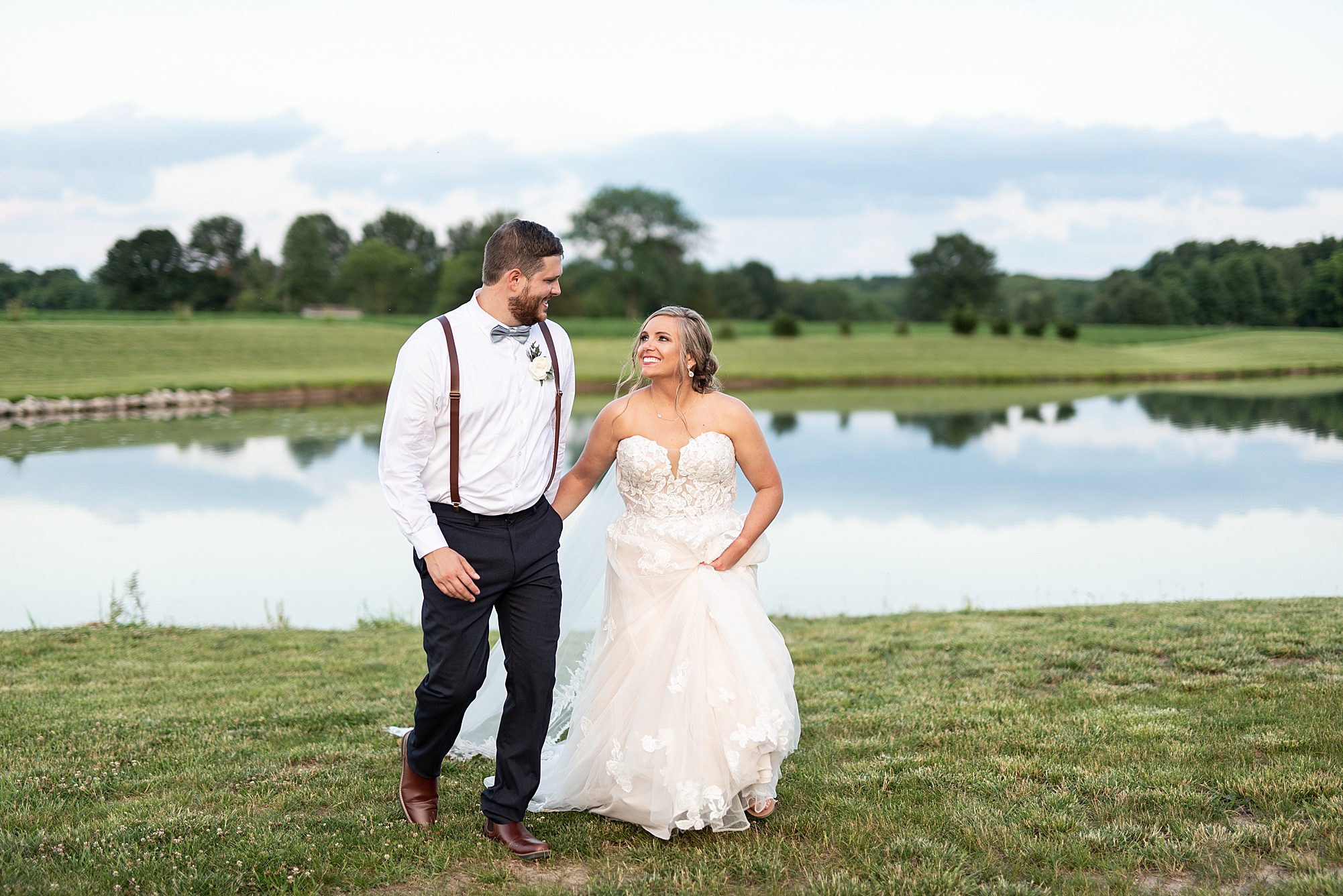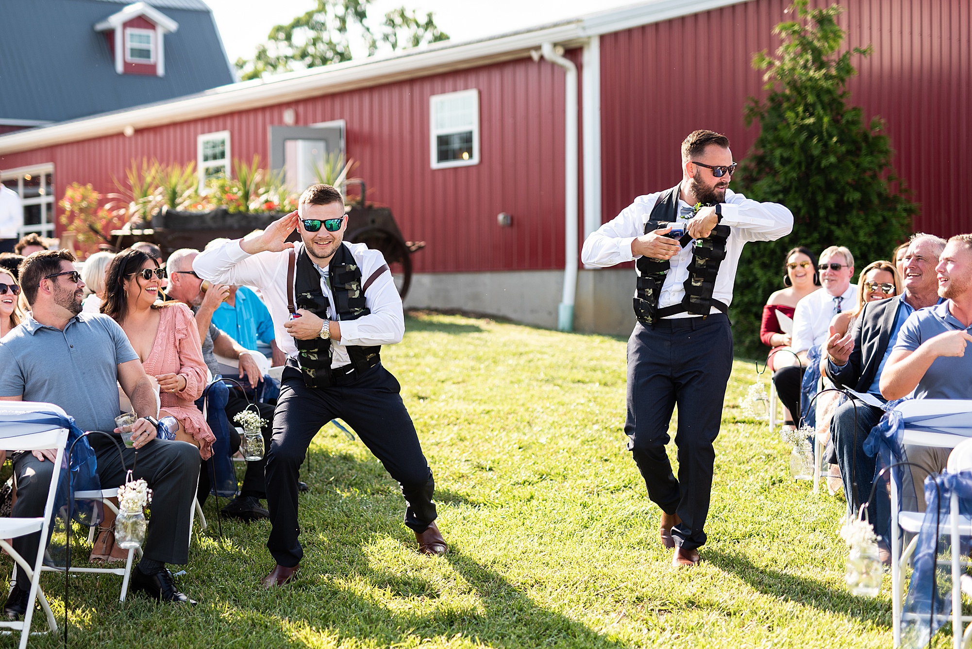 Their wedding venue, Shwarz Barn in Highland, IL, is an absolutely gorgeous property with a barn converted into a stunning space for weddings. Jaclyn and Aarron fell in love with it immediately and I can tell why because it was so perfect for them and their laid back style. Jaclyn shared a sweet first look with her dad before he walked his only child down the aisle to a grinning Aarron. A very close friend officially married them overlooking the pond in such a beautiful and fun ceremony! Jaclyn and Aarron shared their first kiss as husband and wife before dancing back down the aisle, ready to celebrate!
