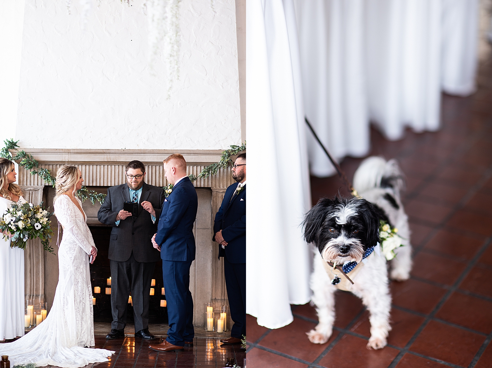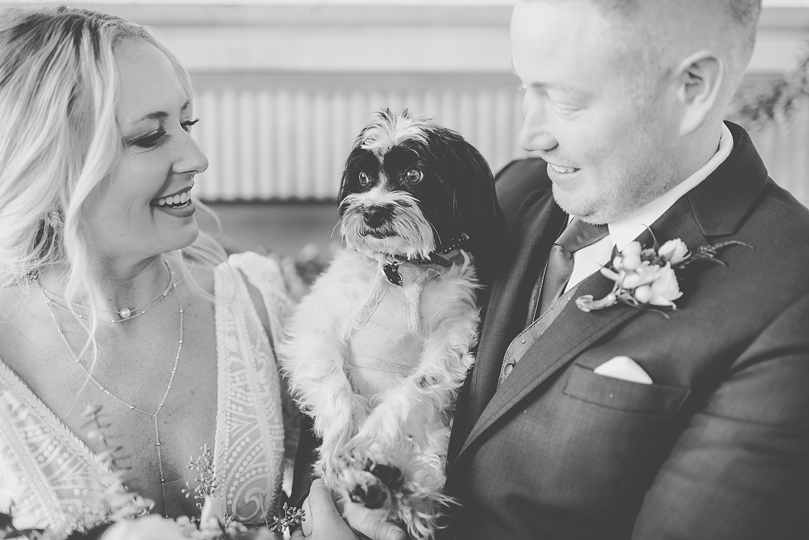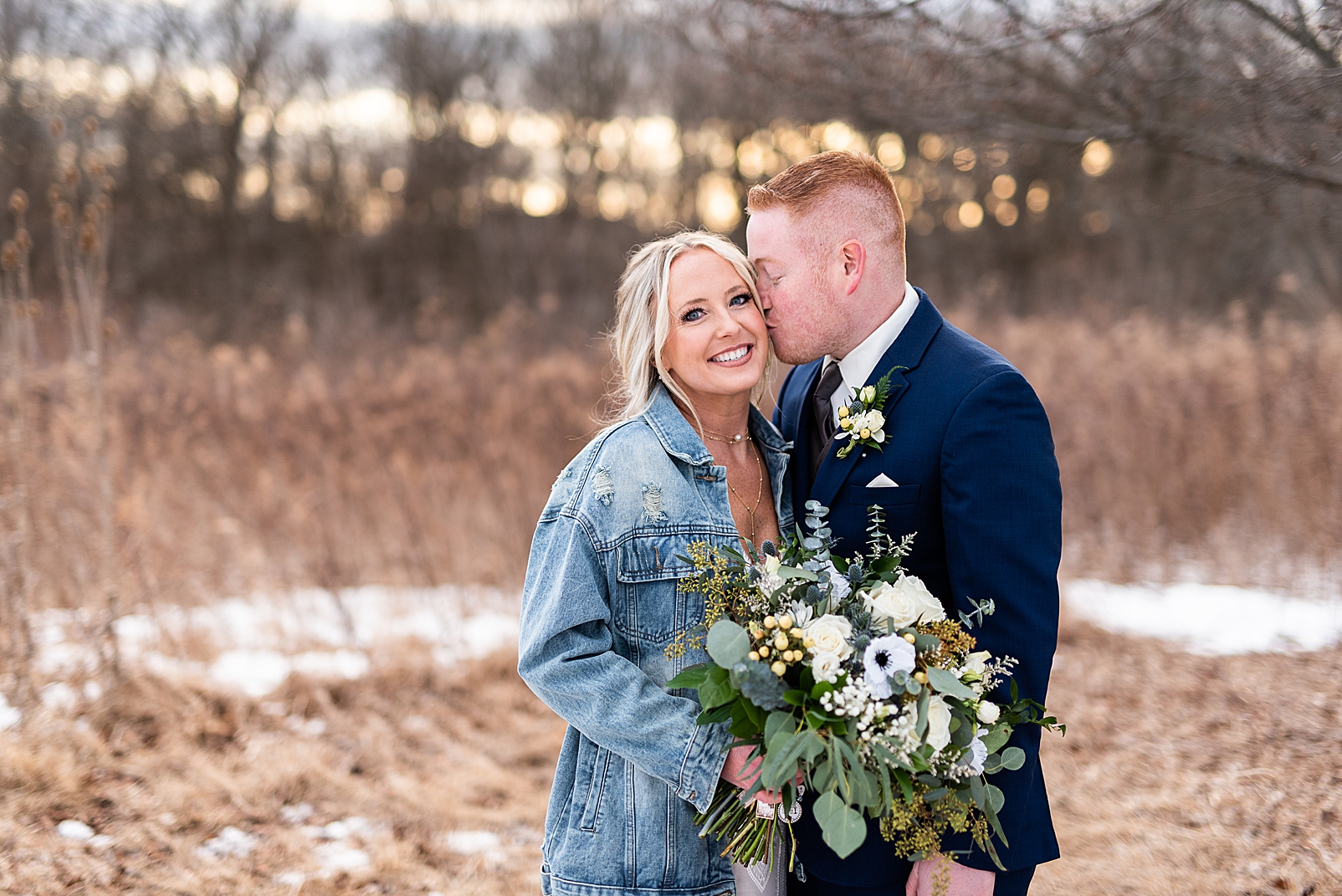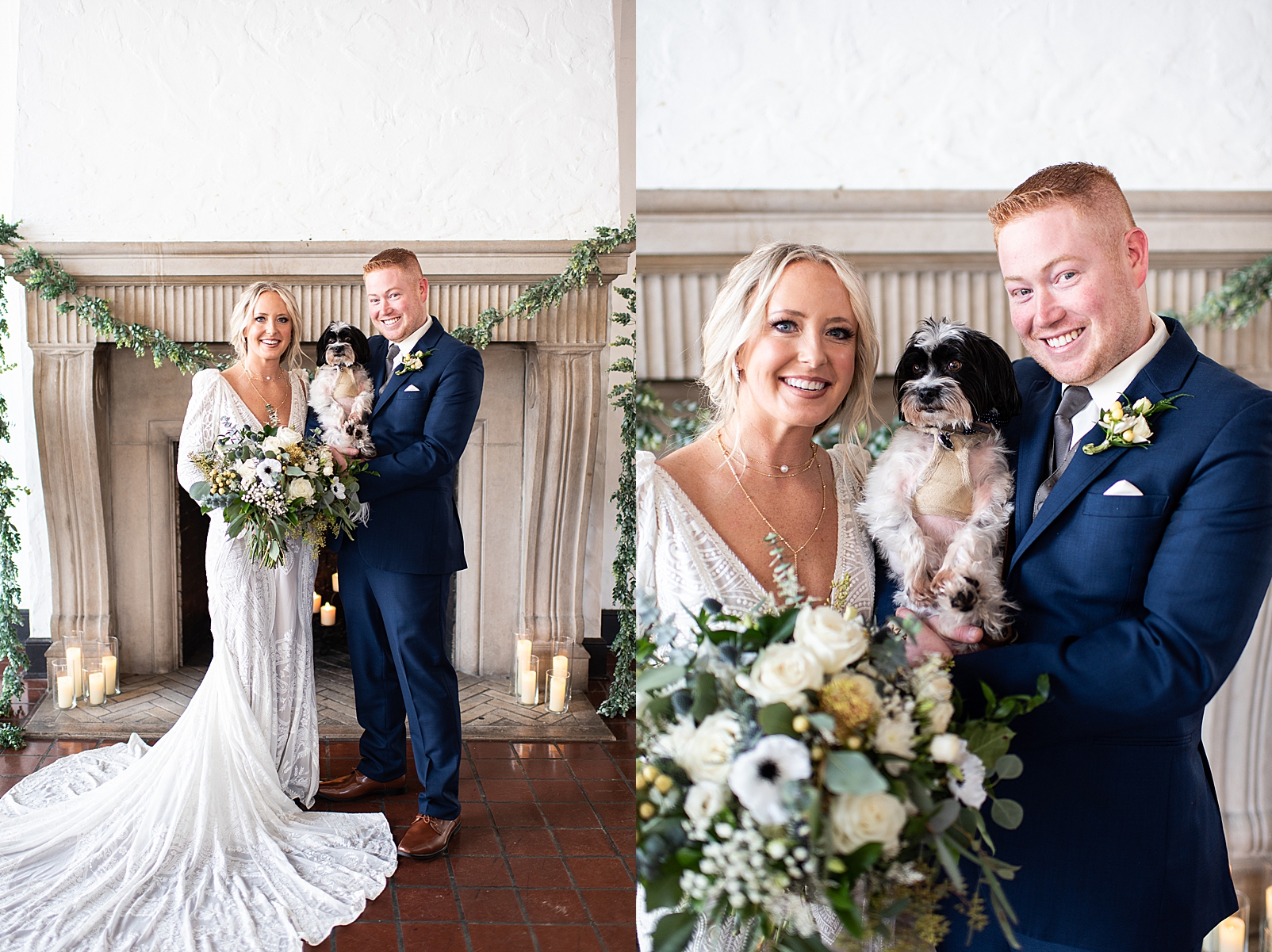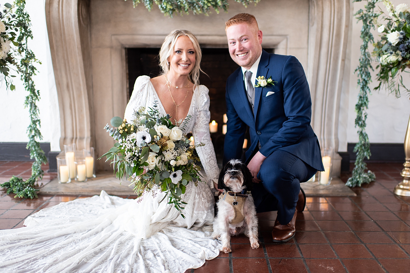 Kelsey and JT’s winter wedding was absolutely beautiful! Both of their birthdays are in February (one day apart) so when they got engaged, they immediately knew what month they wanted to get married. Kelsey was absolutely stunning in her custom wedding dress which had removable sleeves (such a gorgeous feature!). They were married in an intimate ceremony at Venue 1929 with just their closest family and friends in attendance. The temps were in the single digits most of the day, so the warm, inviting space was absolutely perfect. Kelsey and JT prepared beautiful, handwritten vows and read them to each other before exchanging rings and finally sharing their first kiss as husband and wife. Lydia (my amazing videography partner) had so much fun capturing the newlyweds after the ceremony. Their sweet pup, Wrigley even joined for some photos along with their bridal party.