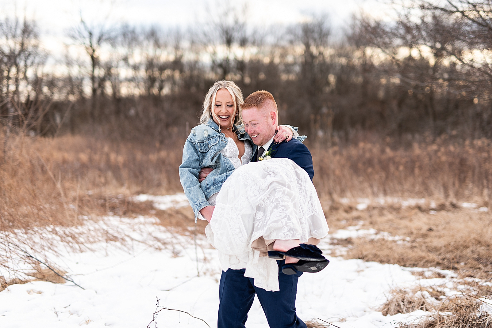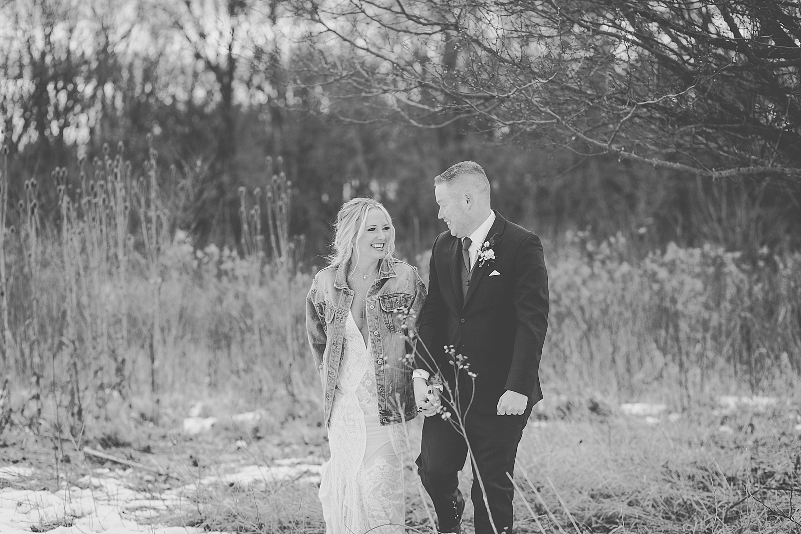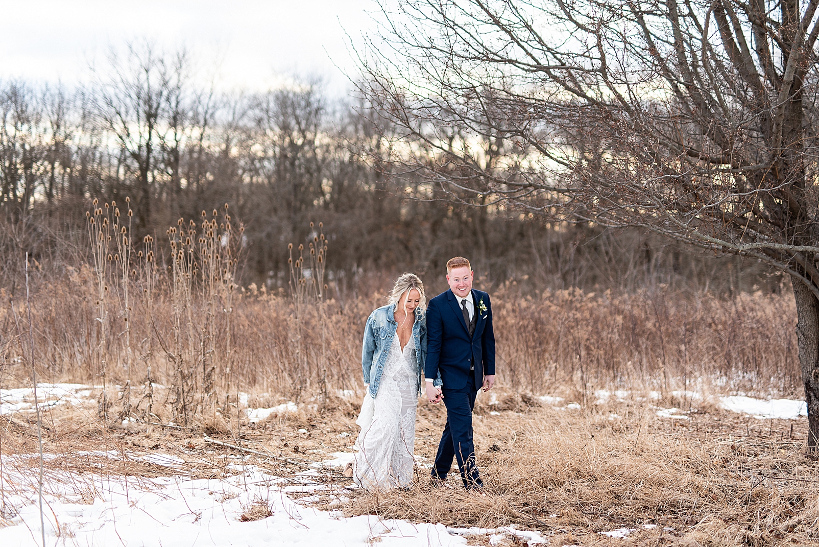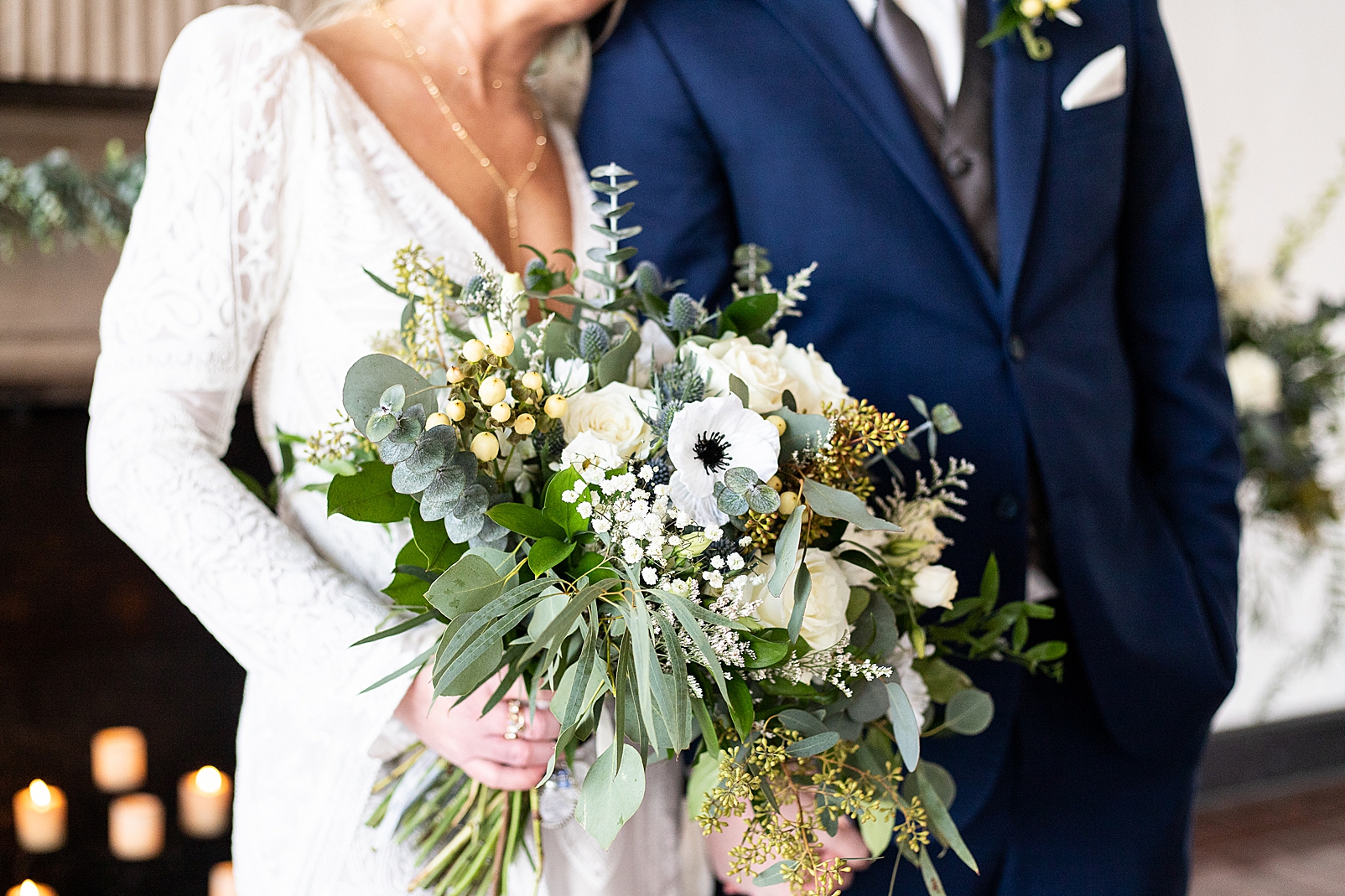 Kelsey and JT’s winter wedding was absolutely beautiful! Both of their birthdays are in February (one day apart) so when they got engaged, they immediately knew what month they wanted to get married. Kelsey was absolutely stunning in her custom wedding dress which had removable sleeves (such a gorgeous feature!). They were married in an intimate ceremony at Venue 1929 with just their closest family and friends in attendance. The temps were in the single digits most of the day, so the warm, inviting space was absolutely perfect. Kelsey and JT prepared beautiful, handwritten vows and read them to each other before exchanging rings and finally sharing their first kiss as husband and wife. Lydia (my amazing videography partner) had so much fun capturing the newlyweds after the ceremony. Their sweet pup, Wrigley even joined for some photos along with their bridal party.