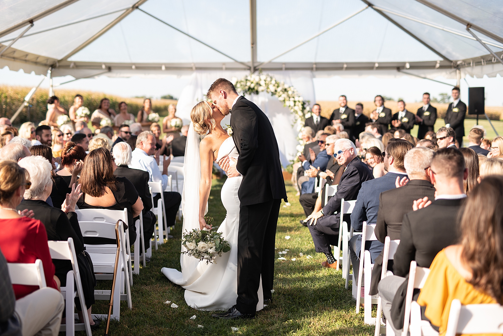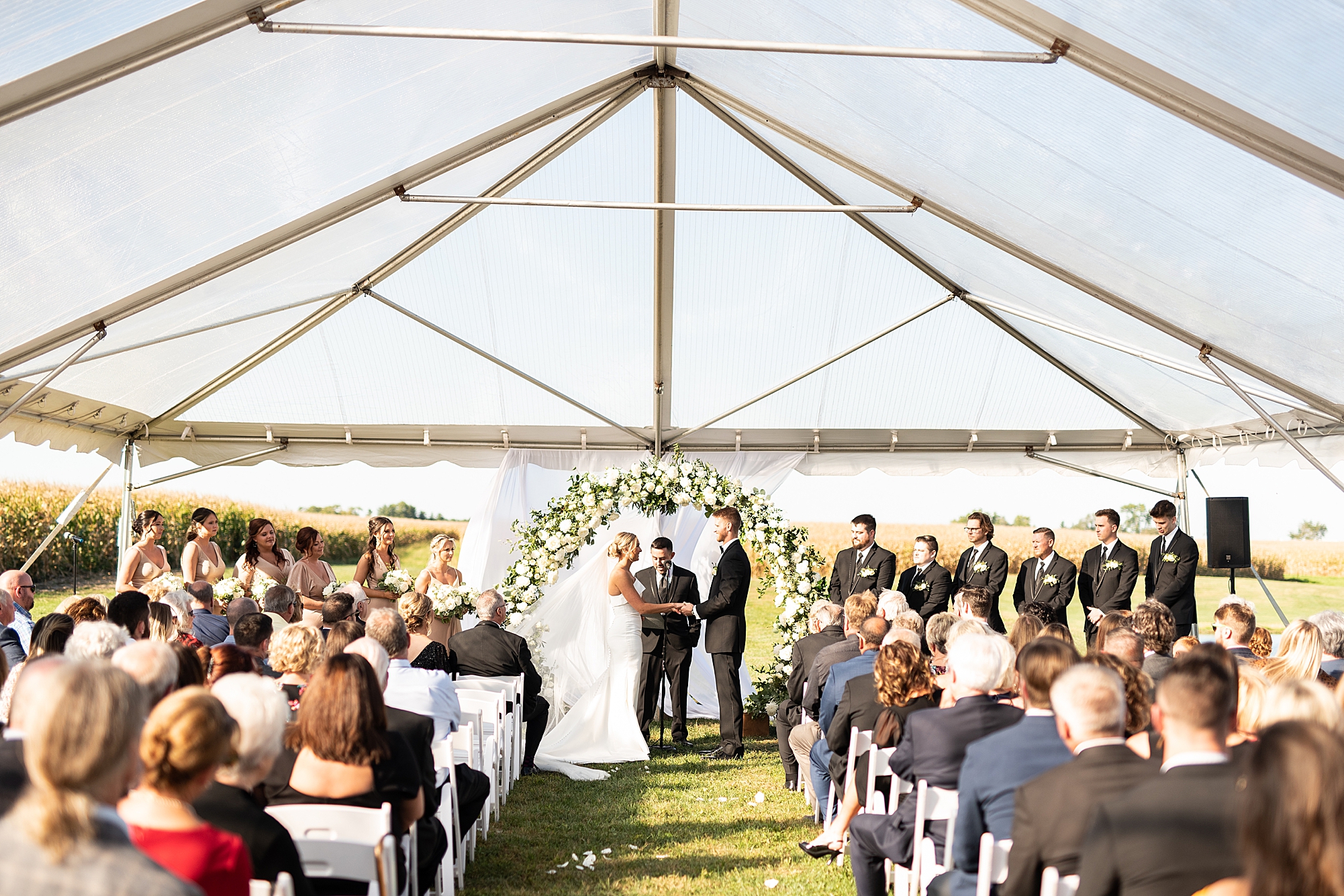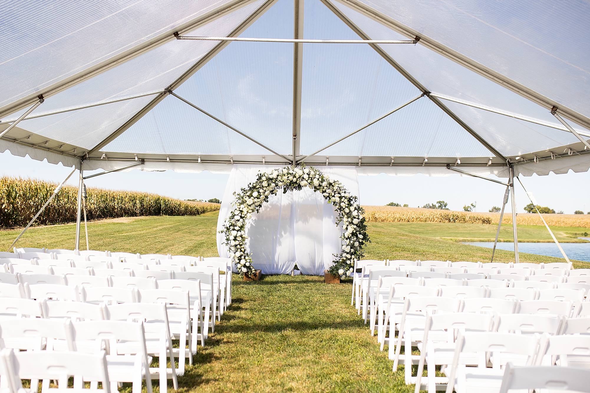 Kerby and Tyler’s wedding day was an absolute dream! They were surrounded all by so many friends and family who love them. Kerby and her mom did an amazing job planning all of the beautiful details of their day at Poe’s on the Hill. The ceremony was set up behind their venue in a gorgeous clear tent filled with white chairs and a lush floral arbor. Kerby and Tyler wanted simple, elegant and traditional and it was exactly that!