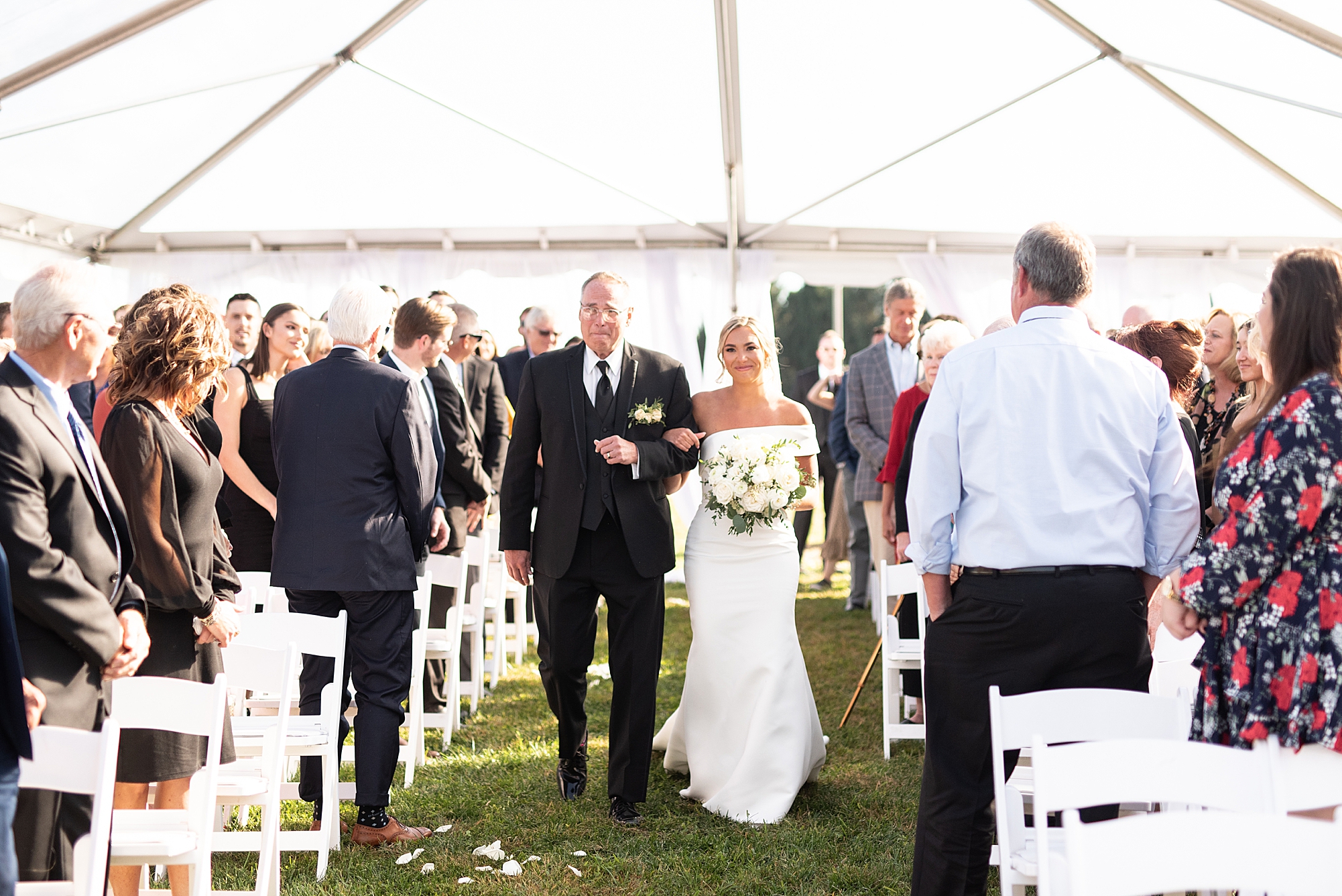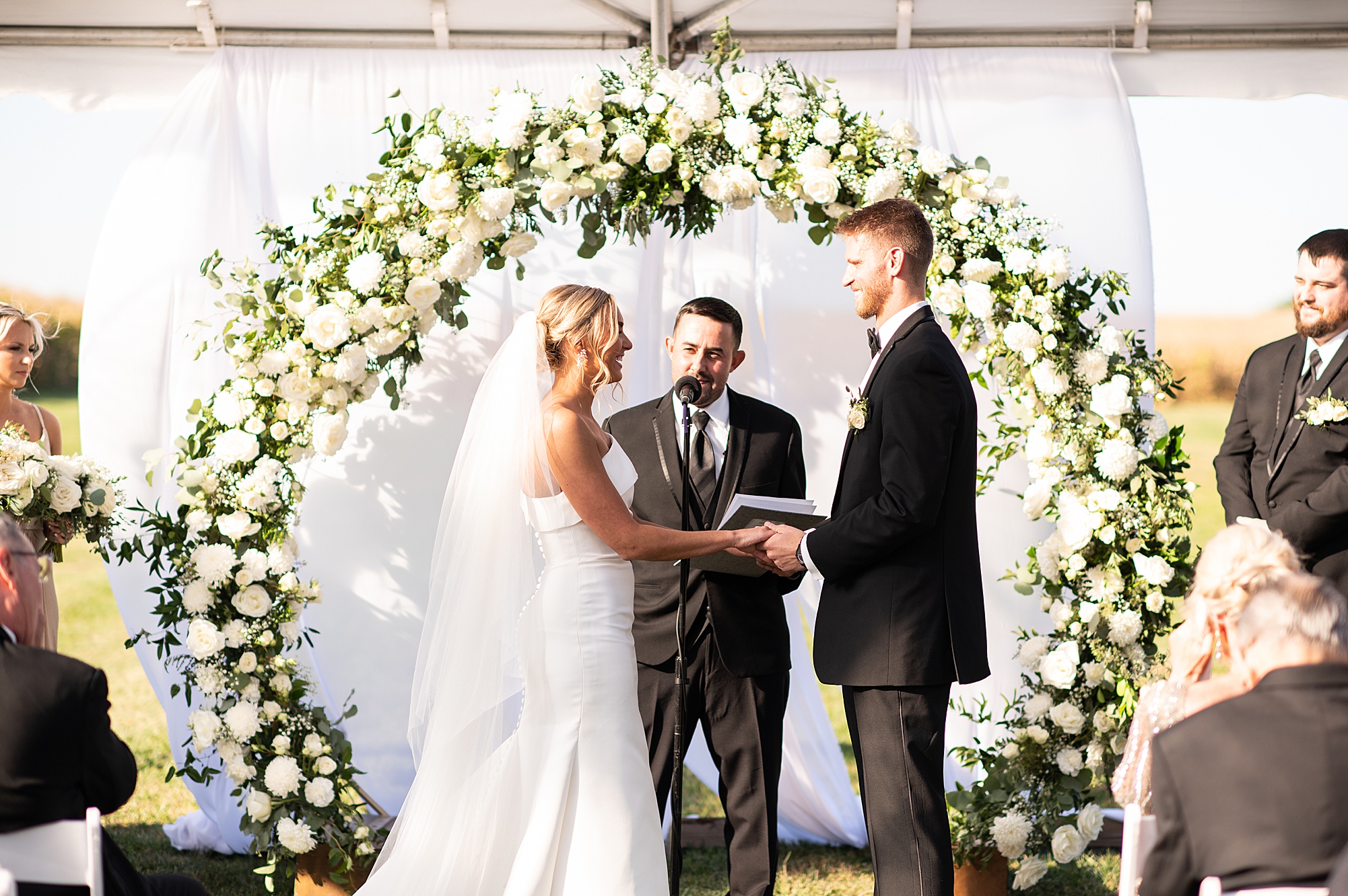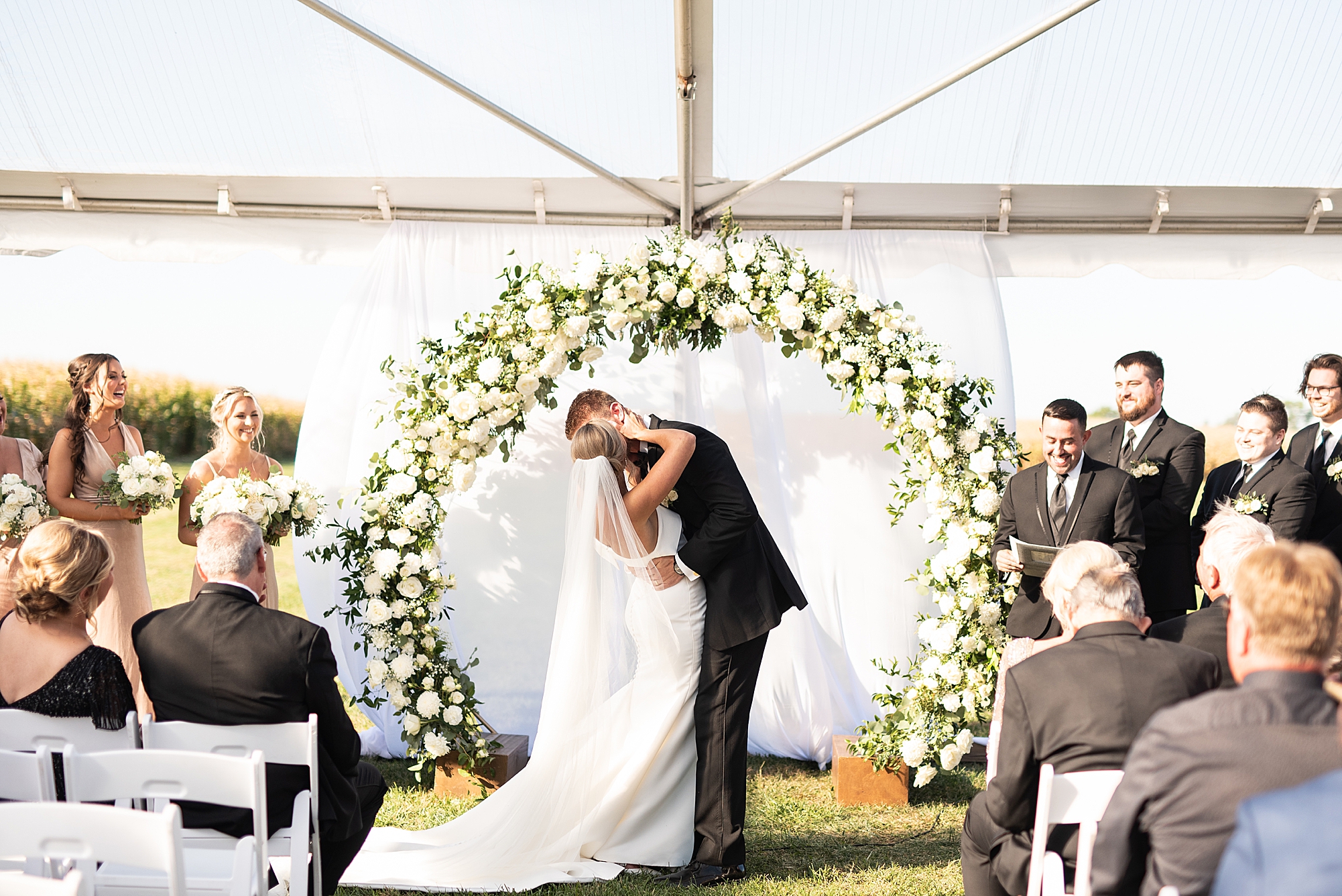 Kerby and Tyler’s wedding day was an absolute dream! They were surrounded all by so many friends and family who love them. Kerby and her mom did an amazing job planning all of the beautiful details of their day at Poe’s on the Hill. The ceremony was set up behind their venue in a gorgeous clear tent filled with white chairs and a lush floral arbor. Kerby and Tyler wanted simple, elegant and traditional and it was exactly that!