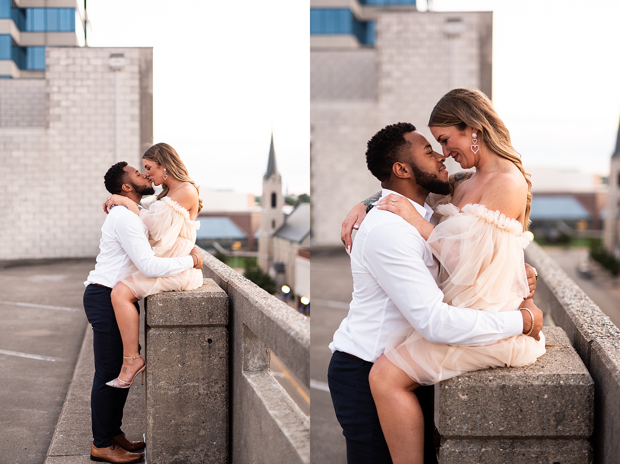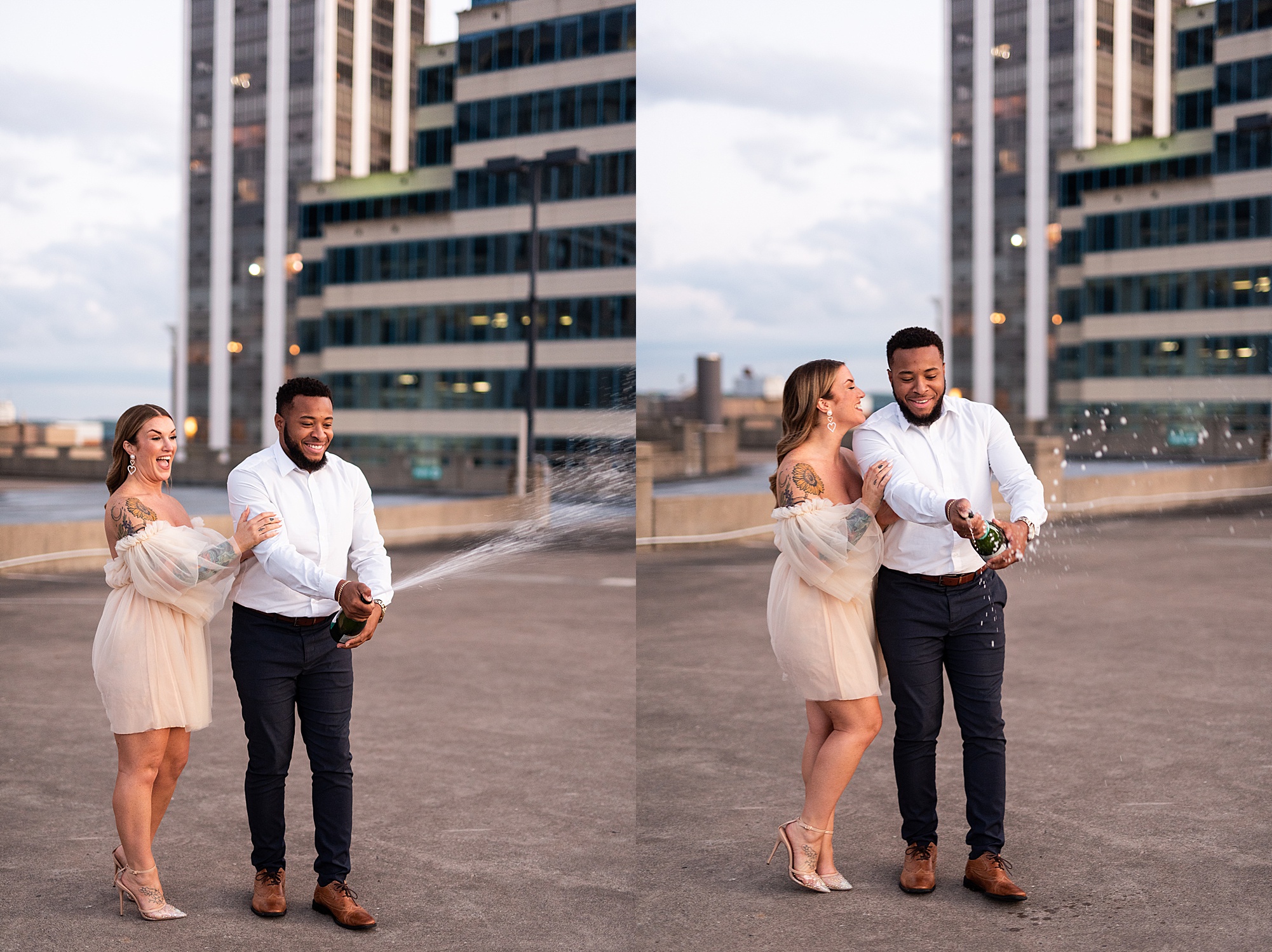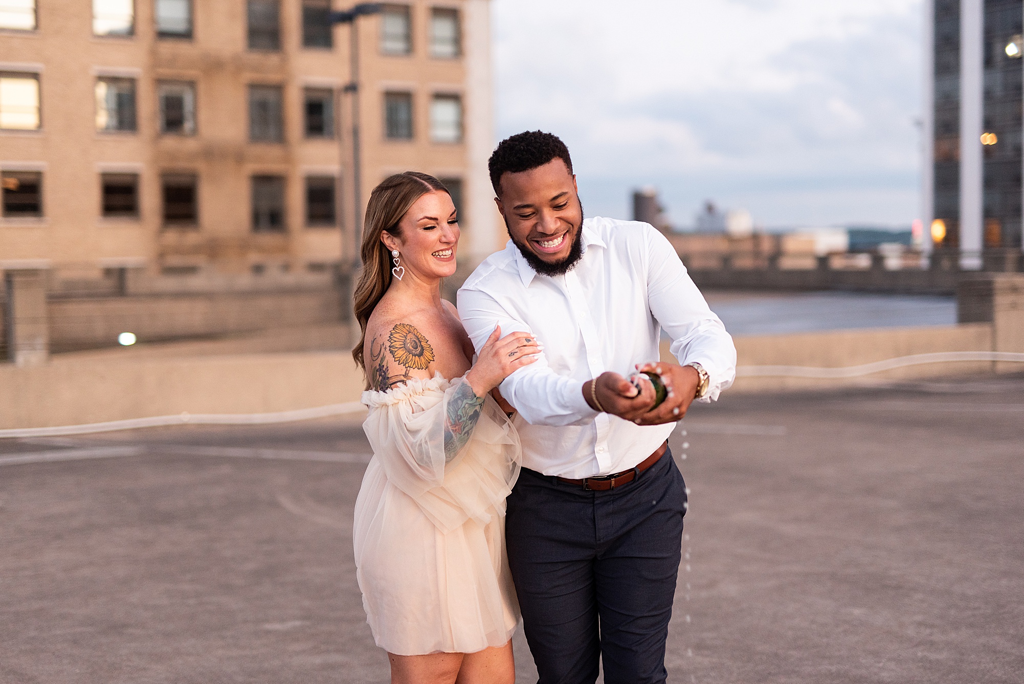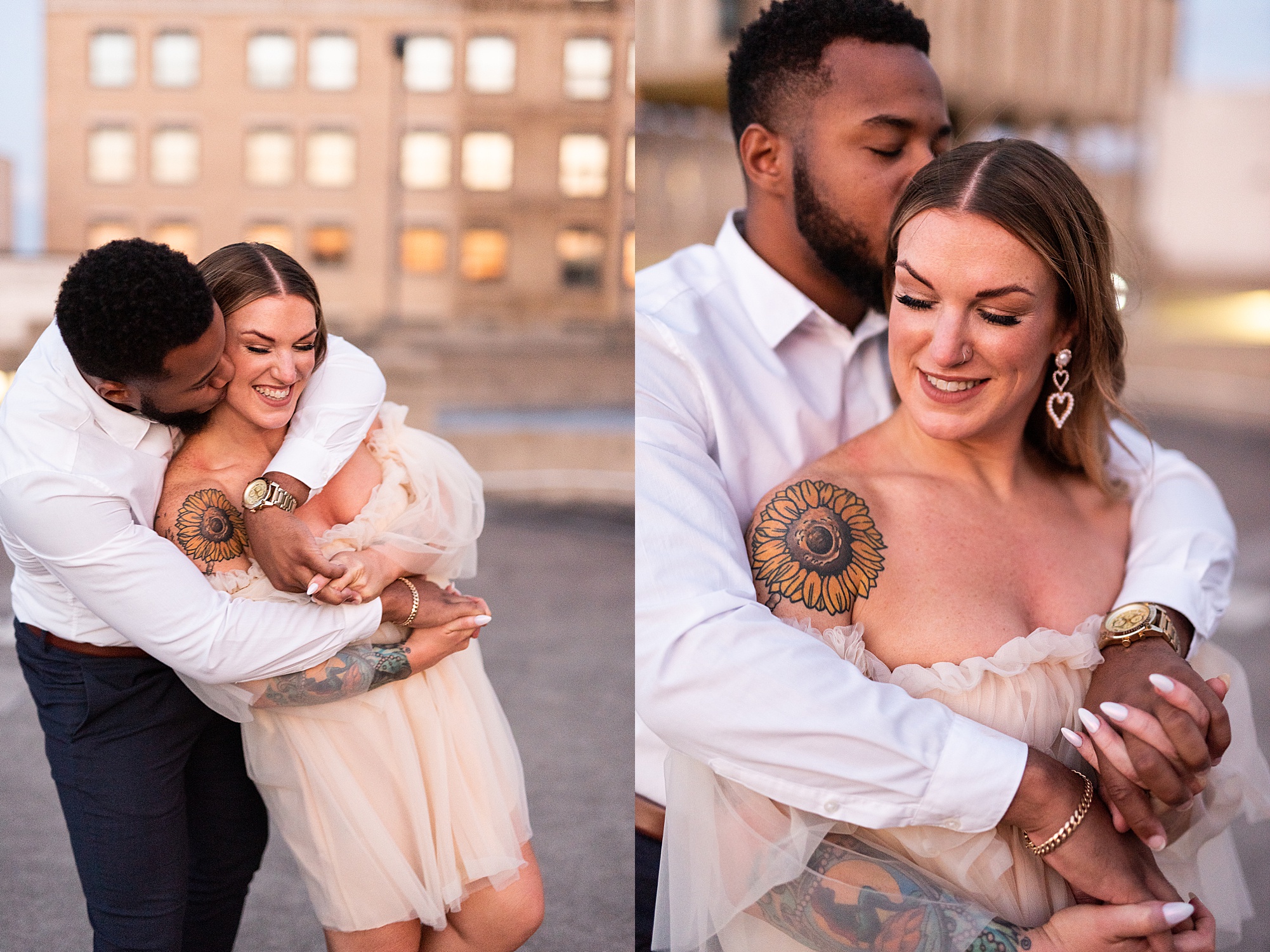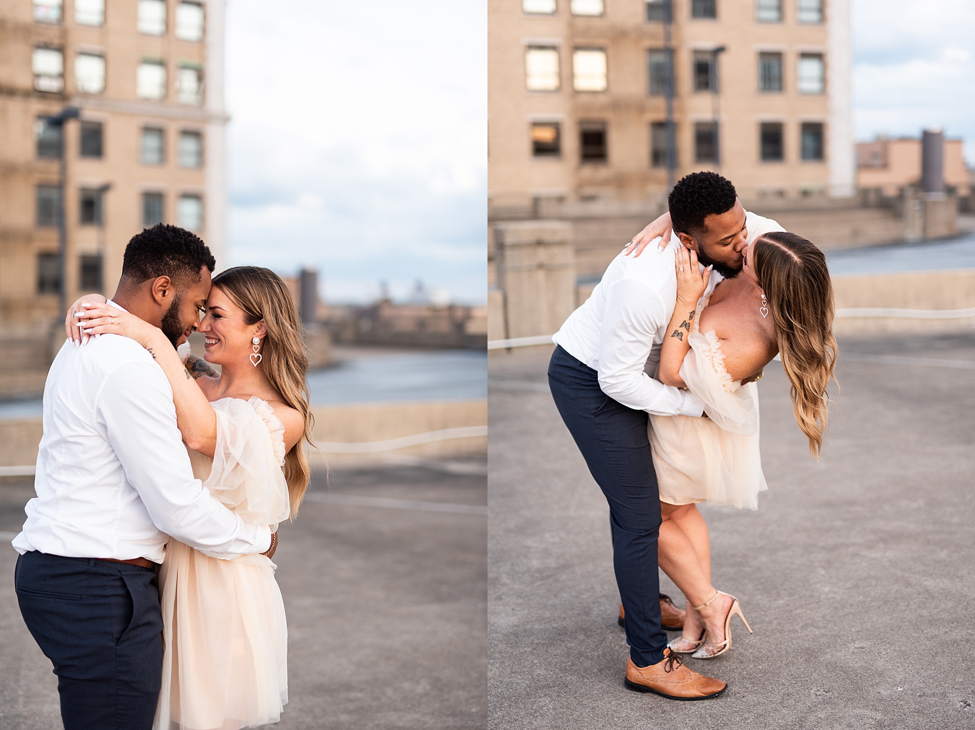 Kinzie told me her dream for an engagement session was in the city, getting glammed up with Aaron and capturing them having fun! So the two of them got all dressed up and we headed up to Peoria to explore. We started in the Warehouse District before heading close to downtown for some rooftop photos. Kinzie and Aaron did a great job making each other laugh, dancing in the streets, cuddling with each other and popping champagne to celebrate their engagement! I loved capturing these two because they are crazy photogenic and so so sweet together! I am so excited to share more of our fun evening and cannot wait to be a part of their wedding day next summer!