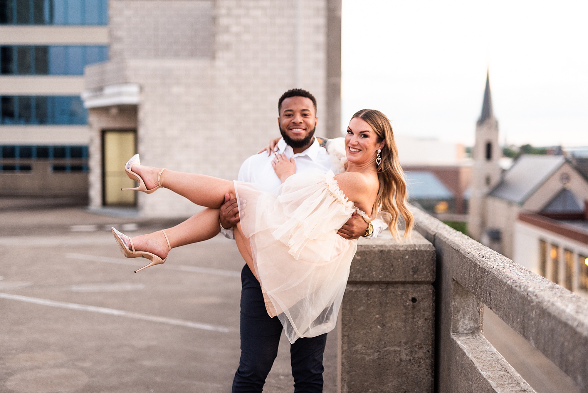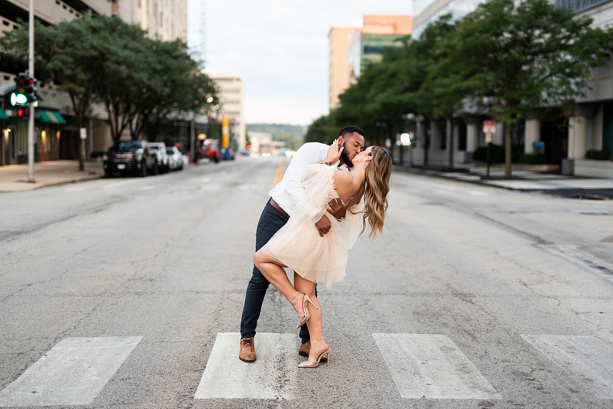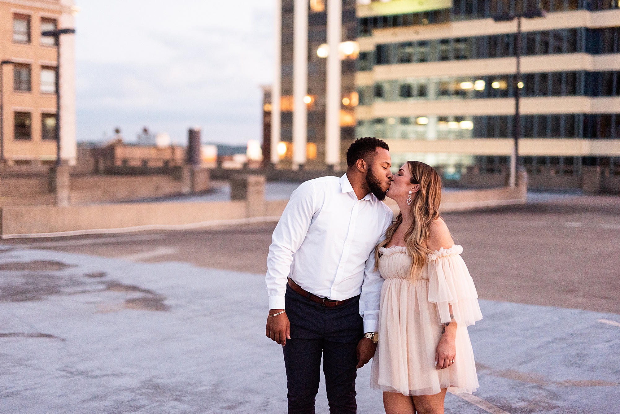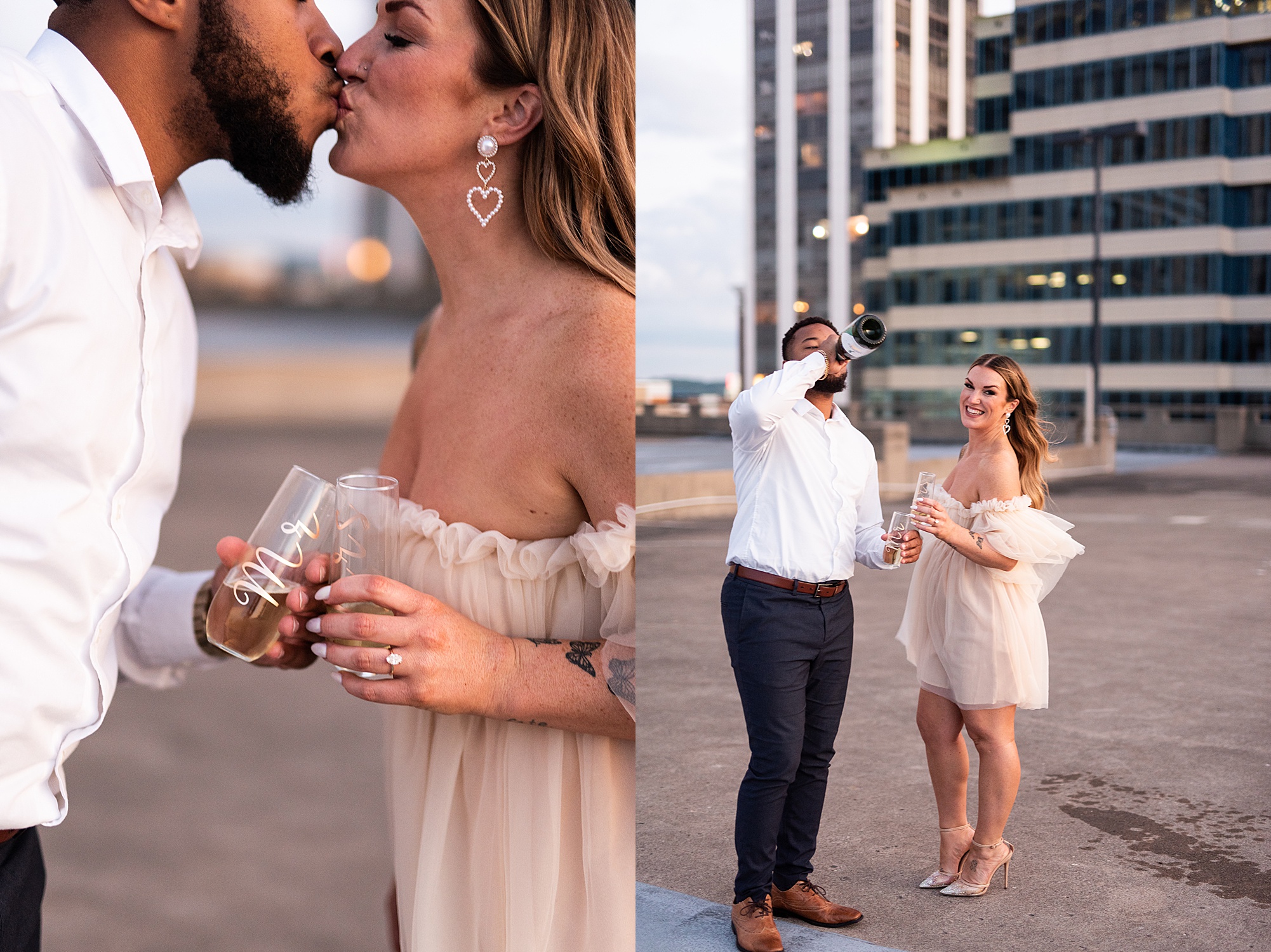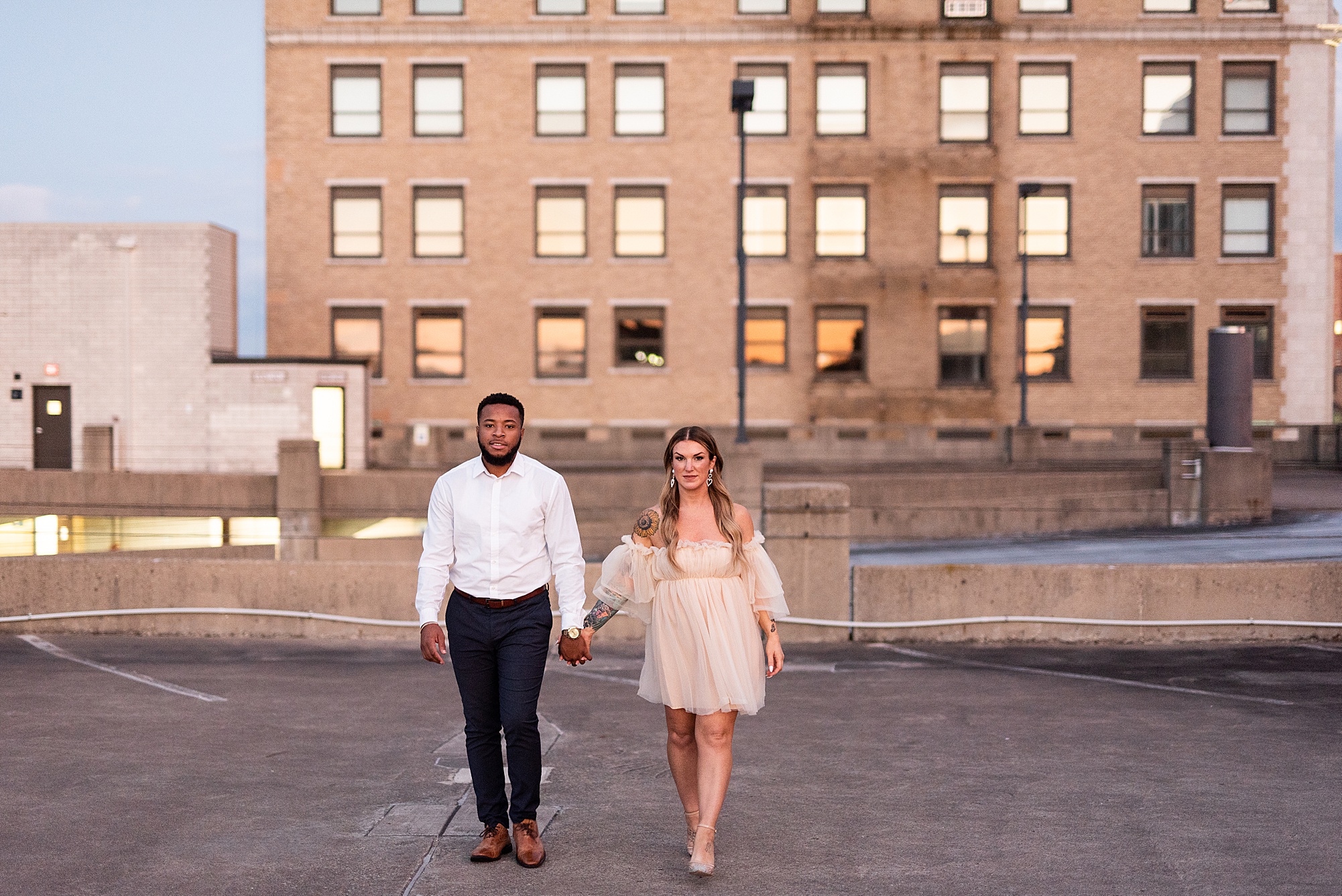 Kinzie told me her dream for an engagement session was in the city, getting glammed up with Aaron and capturing them having fun! So the two of them got all dressed up and we headed up to Peoria to explore. We started in the Warehouse District before heading close to downtown for some rooftop photos. Kinzie and Aaron did a great job making each other laugh, dancing in the streets, cuddling with each other and popping champagne to celebrate their engagement! I loved capturing these two because they are crazy photogenic and so so sweet together! I am so excited to share more of our fun evening and cannot wait to be a part of their wedding day next summer!