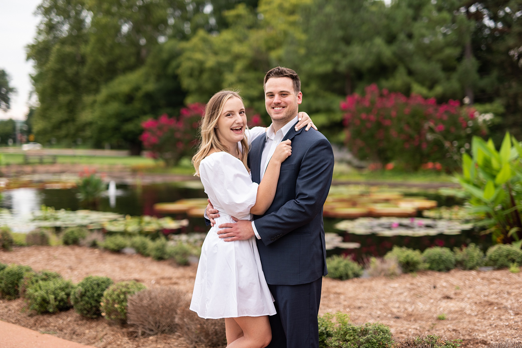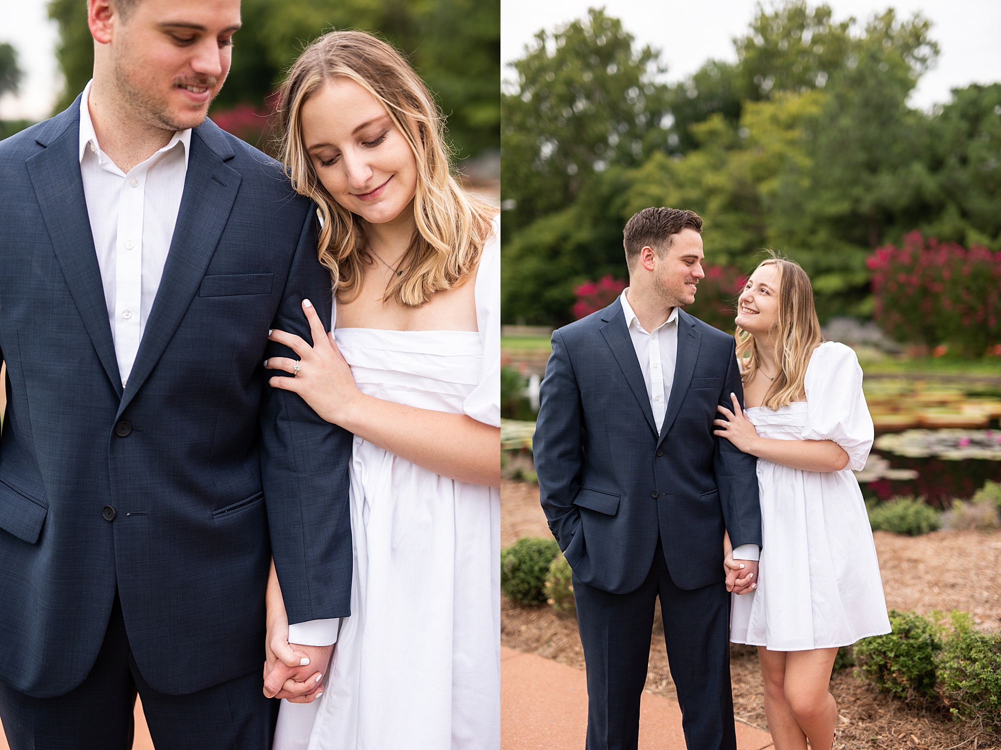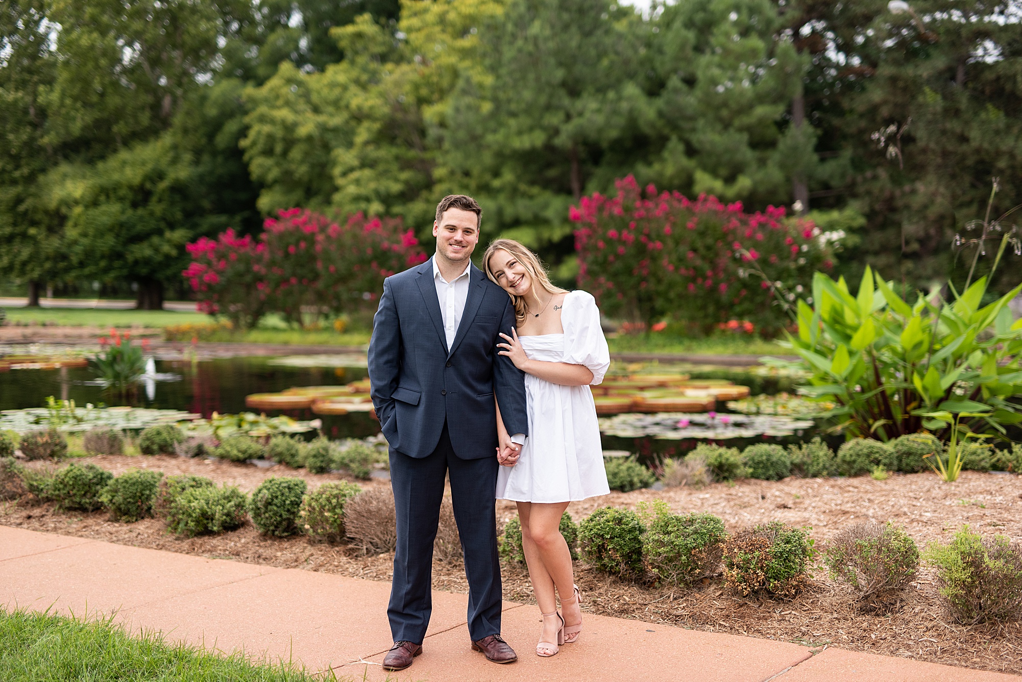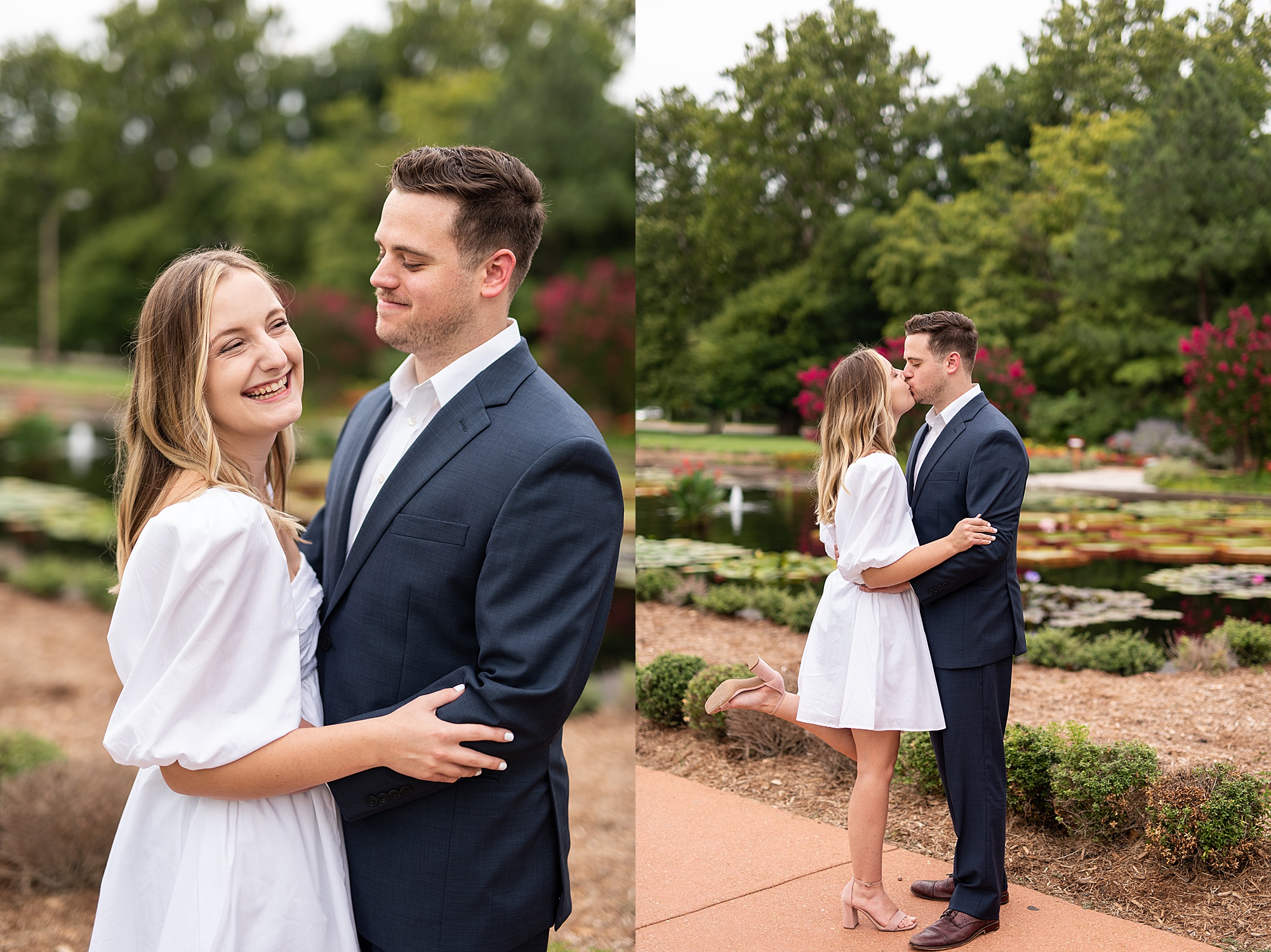 Kristen and Cam met in St. Louis back in 2020 when Kristen’s roommate invited some friends over. One of those friends brought their roommate along, who happened to be Cam! Kristen and Cam hit it off immediately and have been inseparable ever since their first date. They now live together in St. Louis, so it was important for them to capture their engagement photos in the city they love! We chose Forest Park because both Kristen and Cam loved nature and spending a lot of their free time outdoors. Kristen really wanted to incorporate a lot of flowers into her photos so luckily Forest Park had plenty of them! We found some perfect spots throughout the park on a beautiful evening and Cam did such an amazing job making Kristen laugh, they both were so photogenic and made my job super easy! Kristen picked out the cutest outfits for them both and we had gorgeous temperatures for August to top it all off! I loved capturing Kristen and Cam’s engagement session and I am so excited to see them again when they tie the knot next spring!