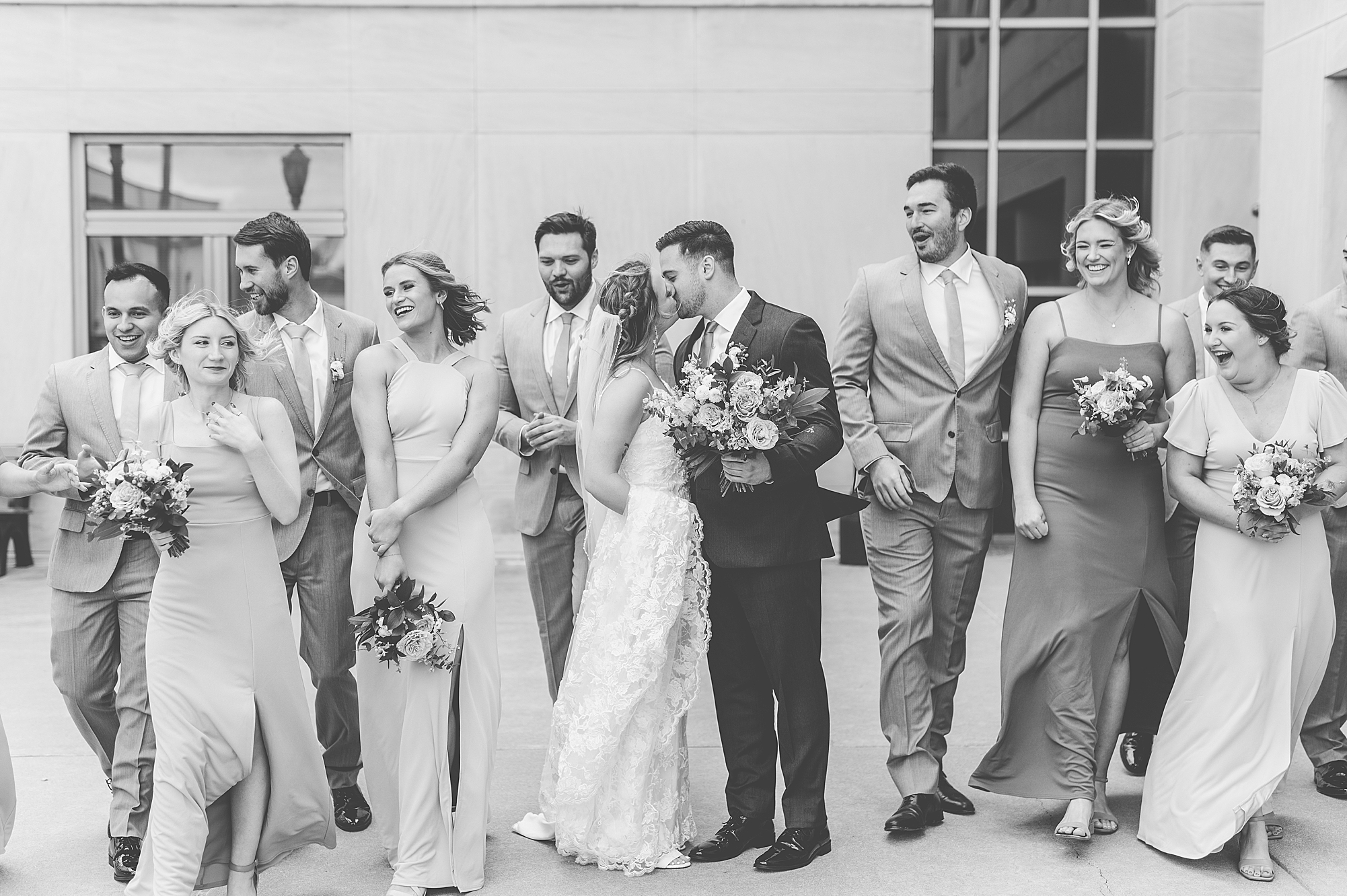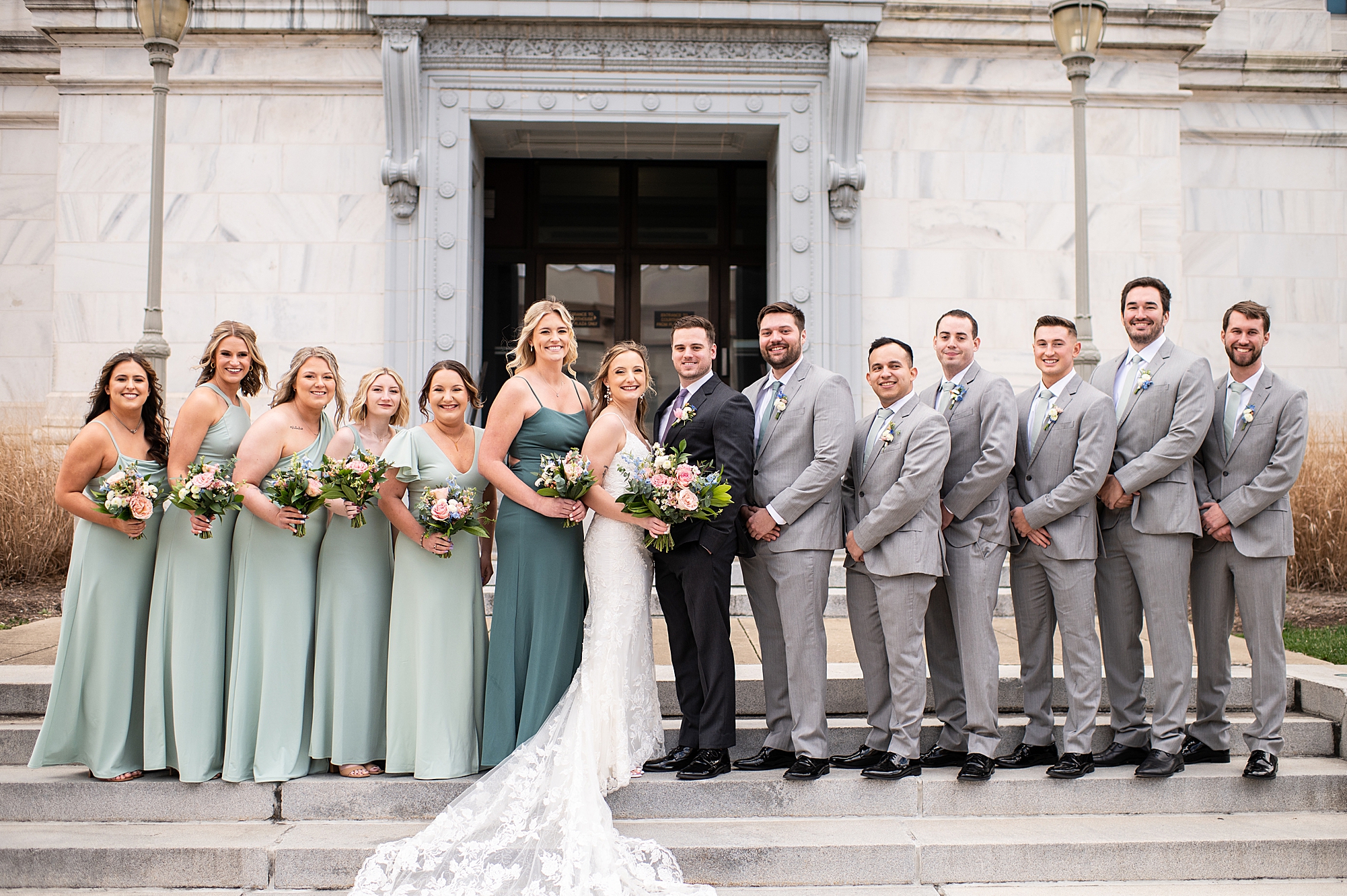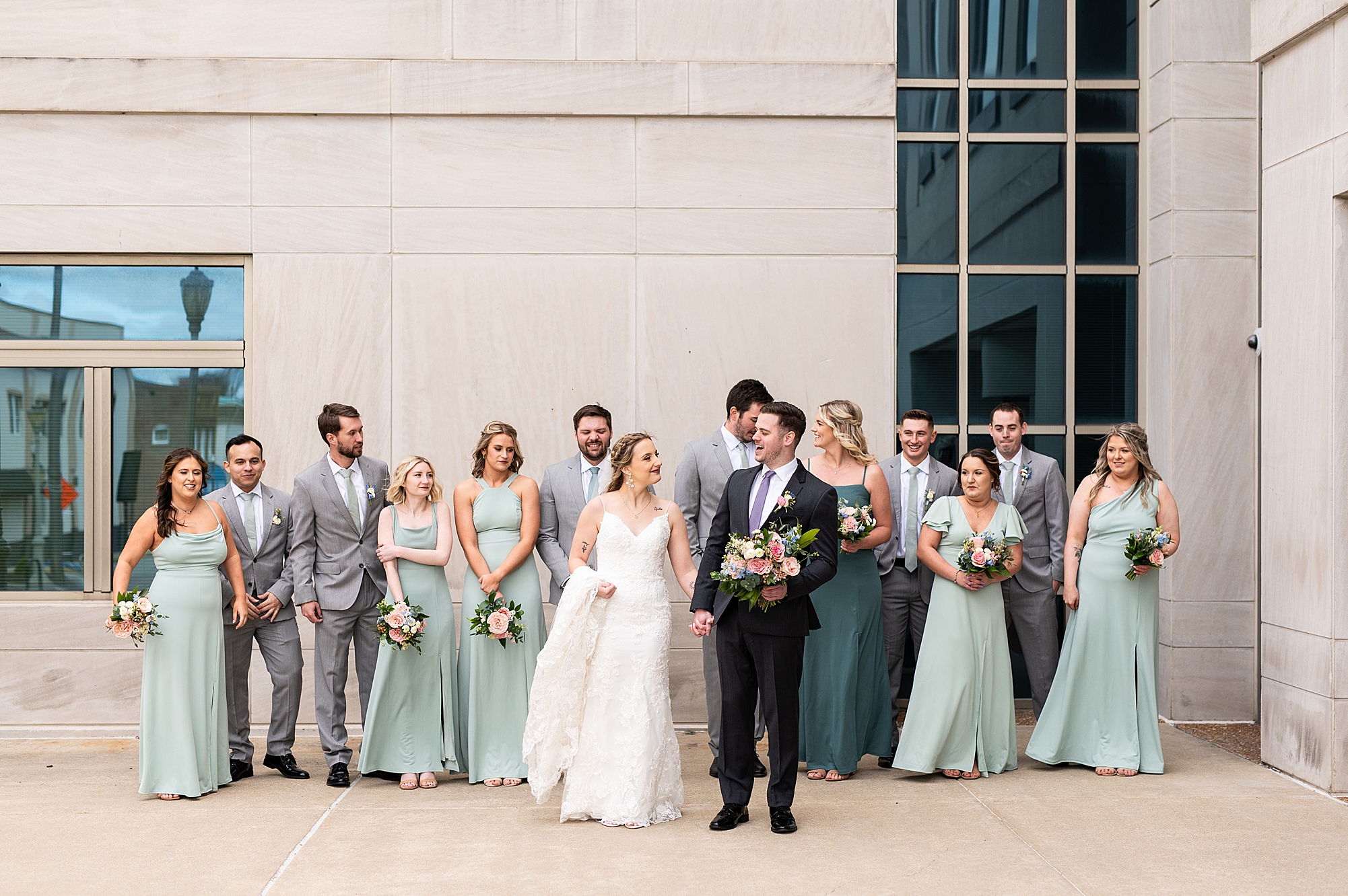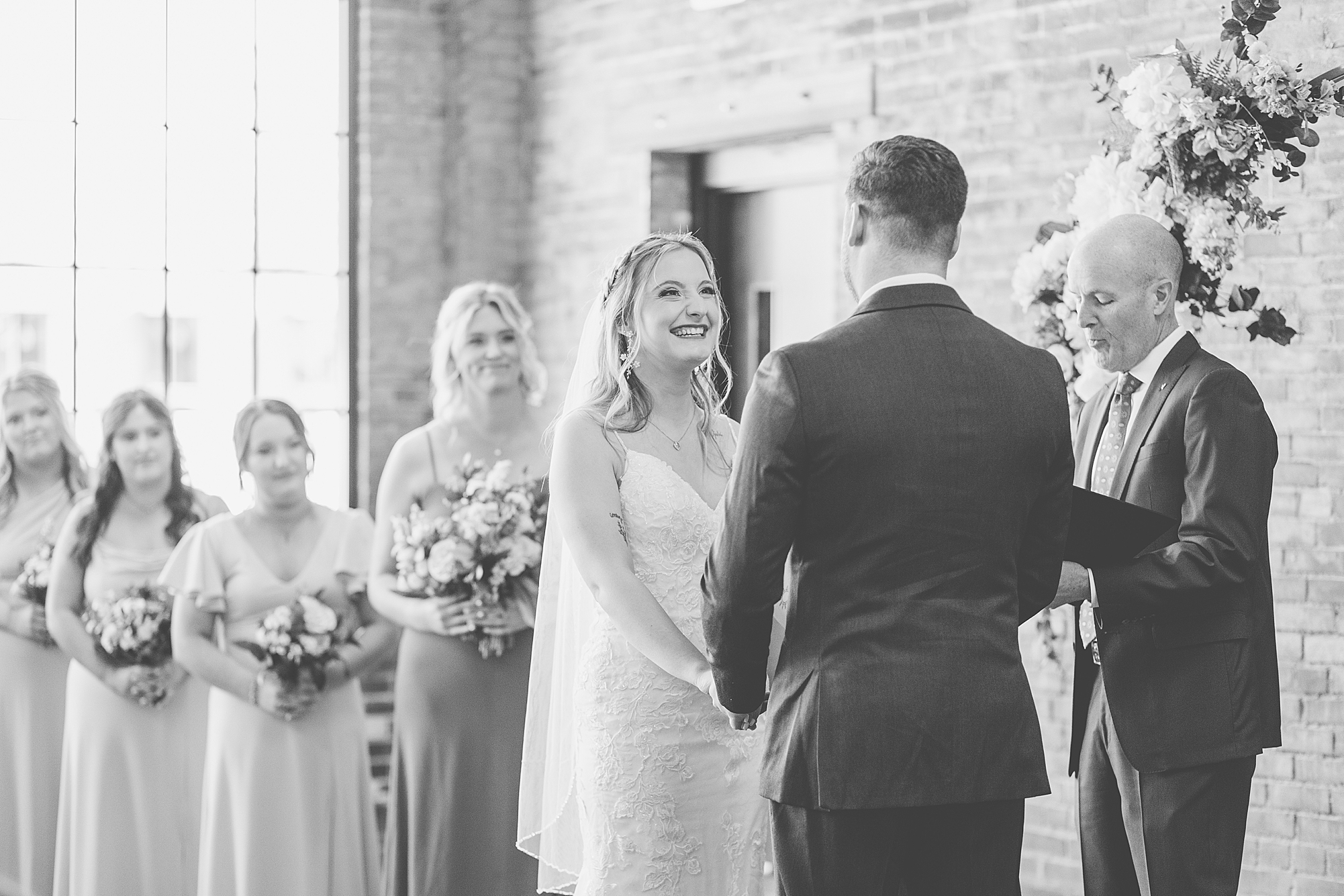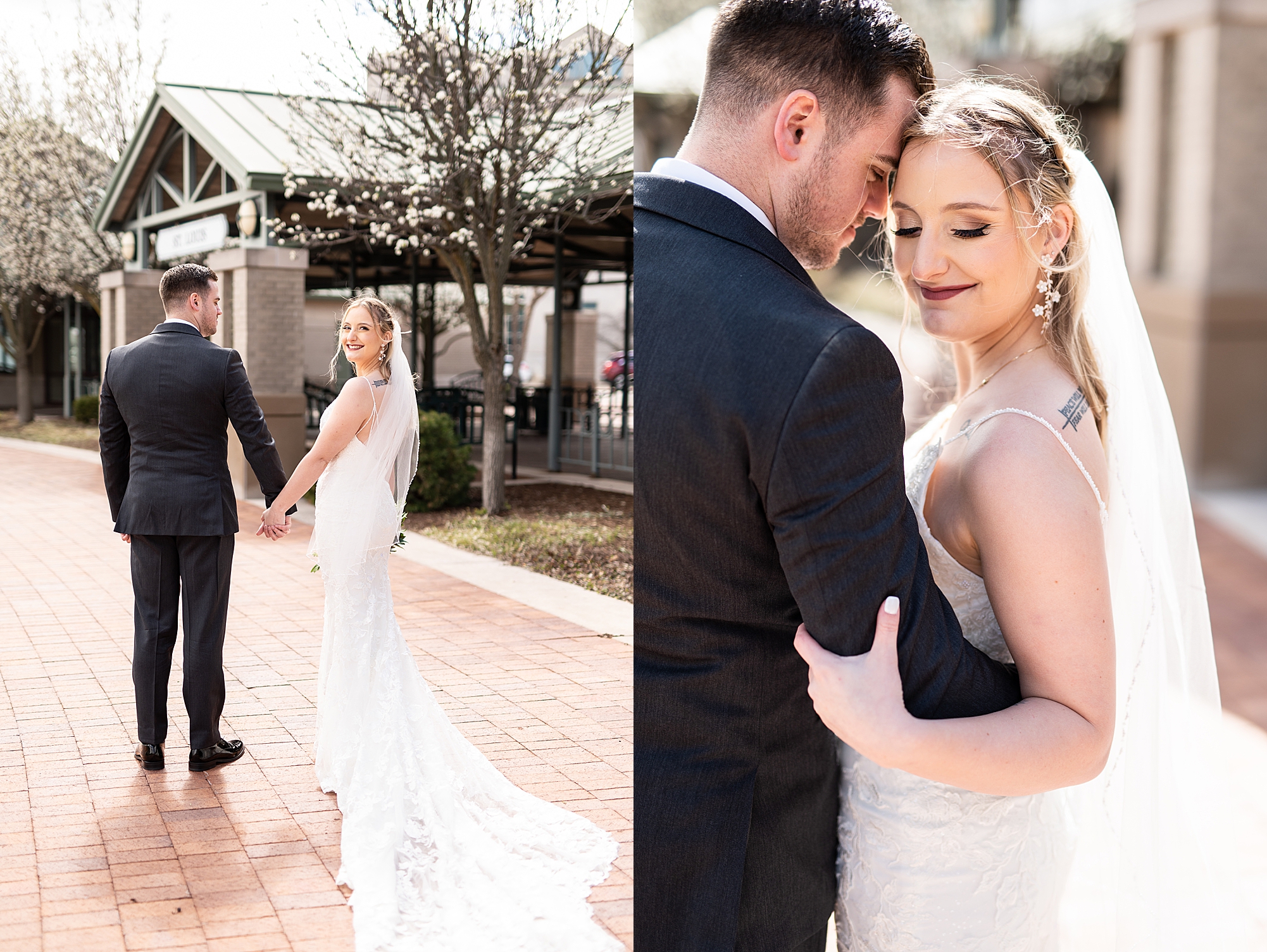 They chose the Ink House in Edwardsville for their venue which was absolutely beautiful and a perfect space for them to welcome all of their close family and friends. The prediction was for clouds and wind throughout the day, but the sun decided to make an appearance giving way to a great spring day. After Kristen spent the morning getting ready with her best friends and mom, we traveled to Edwardsville so she could share a first look with Cameron. They were so sweet seeing each other for the first time, smiles never left their faces. They read private vows to each other and then it was time for portraits! Downtown Edwardsville had some great backdrops and their bridal party came along for some really fun shots!