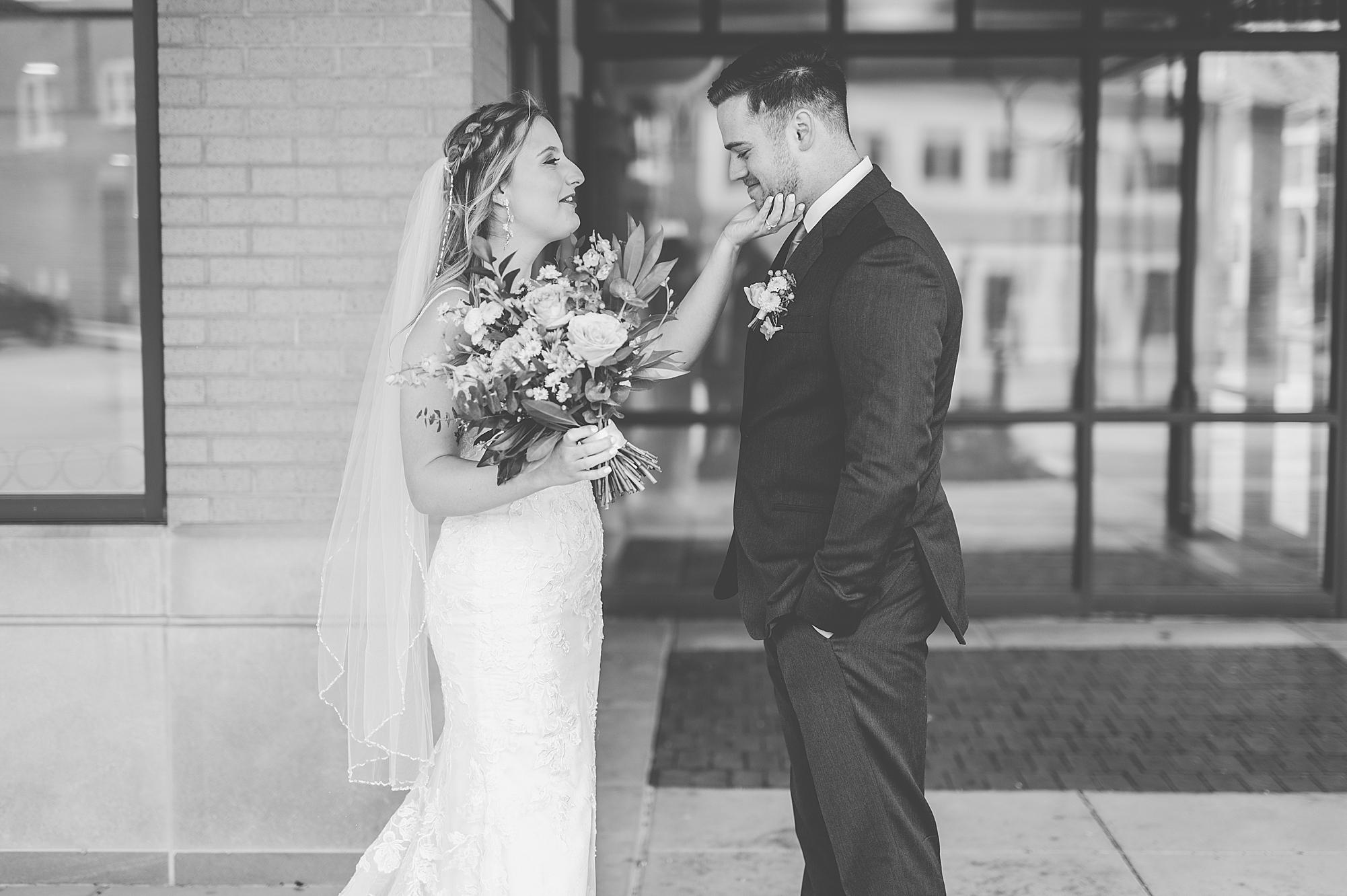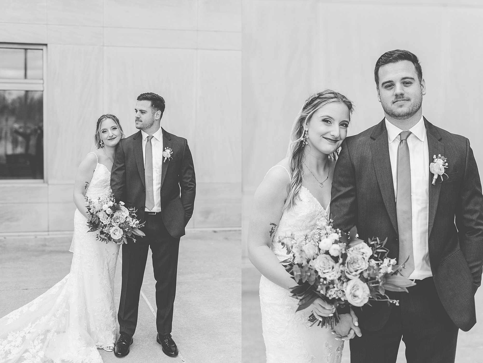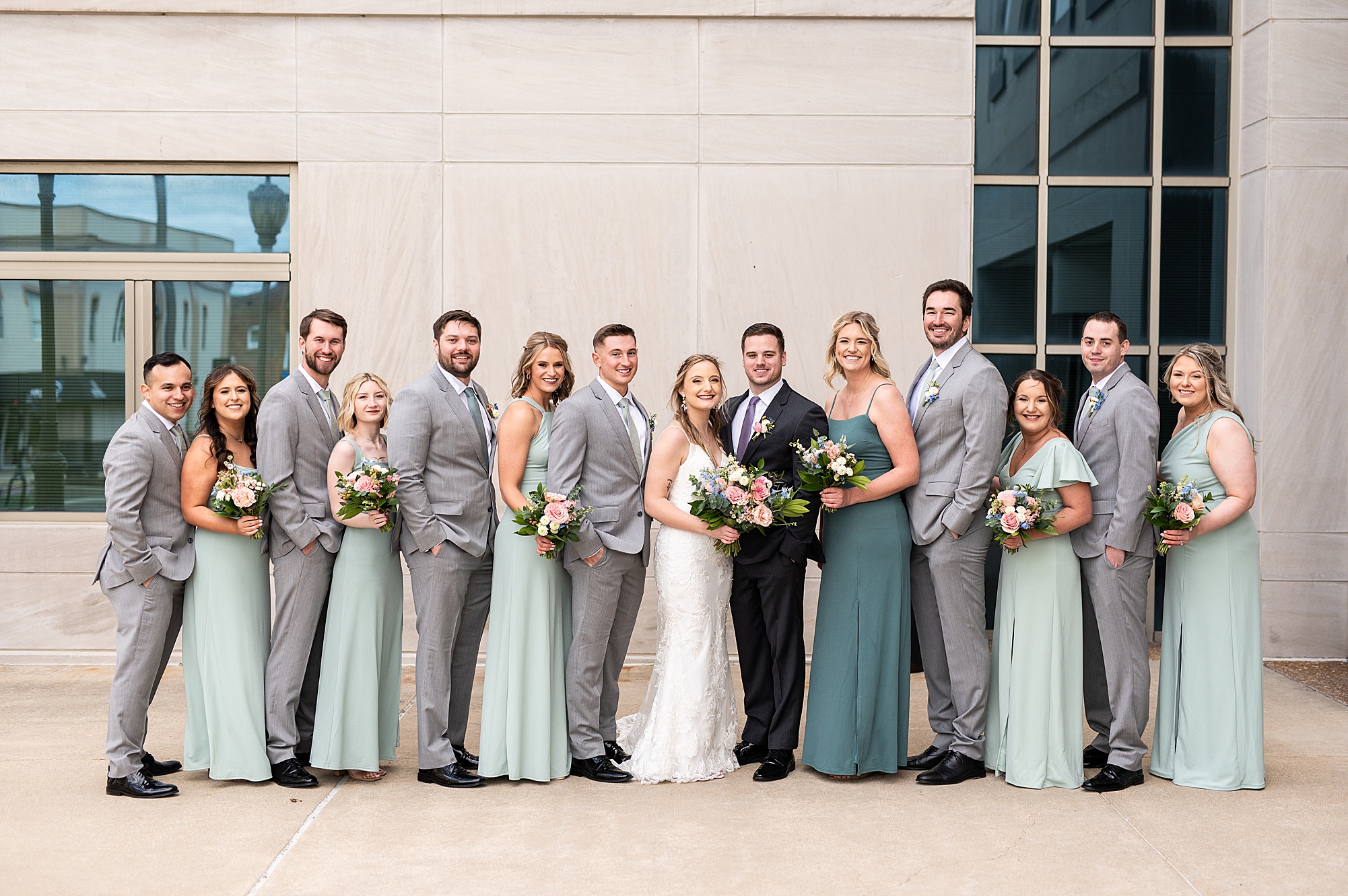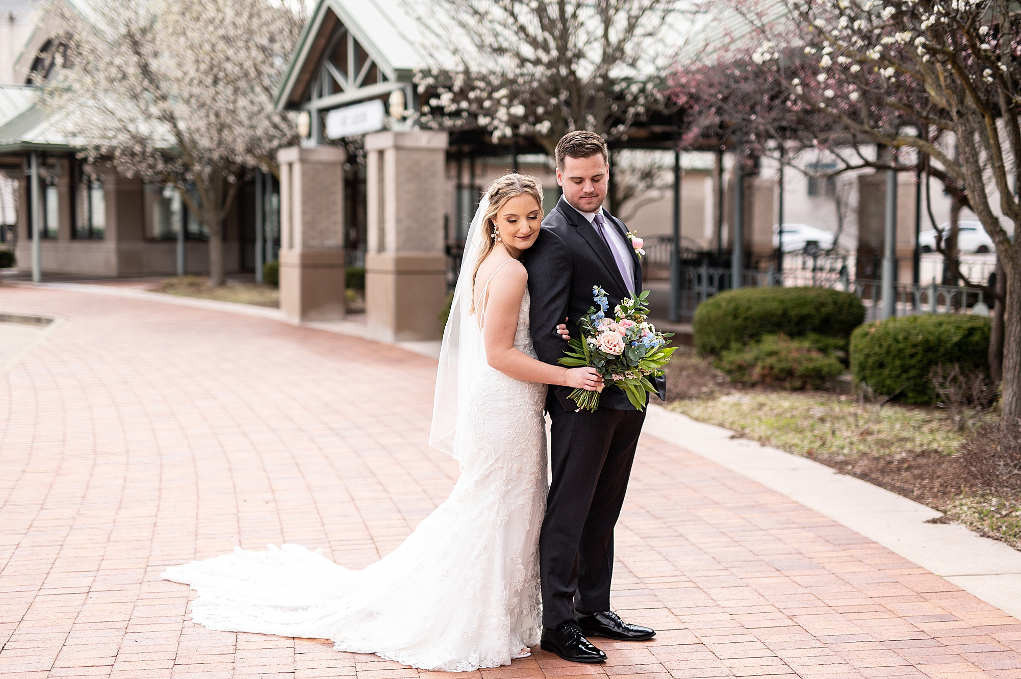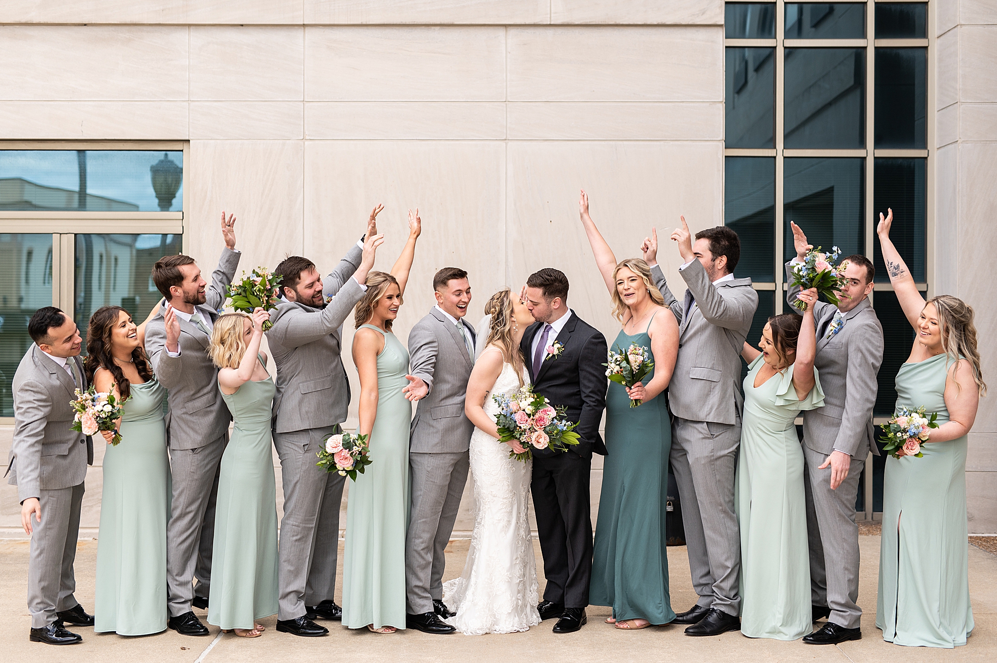 They chose the Ink House in Edwardsville for their venue which was absolutely beautiful and a perfect space for them to welcome all of their close family and friends. The prediction was for clouds and wind throughout the day, but the sun decided to make an appearance giving way to a great spring day. After Kristen spent the morning getting ready with her best friends and mom, we traveled to Edwardsville so she could share a first look with Cameron. They were so sweet seeing each other for the first time, smiles never left their faces. They read private vows to each other and then it was time for portraits! Downtown Edwardsville had some great backdrops and their bridal party came along for some really fun shots!