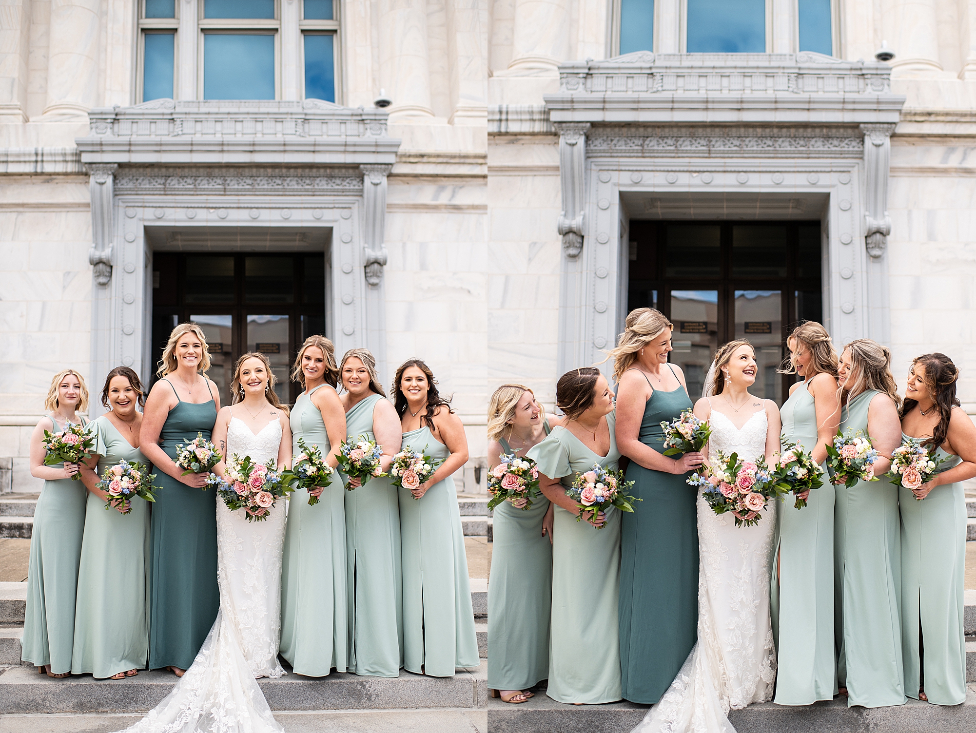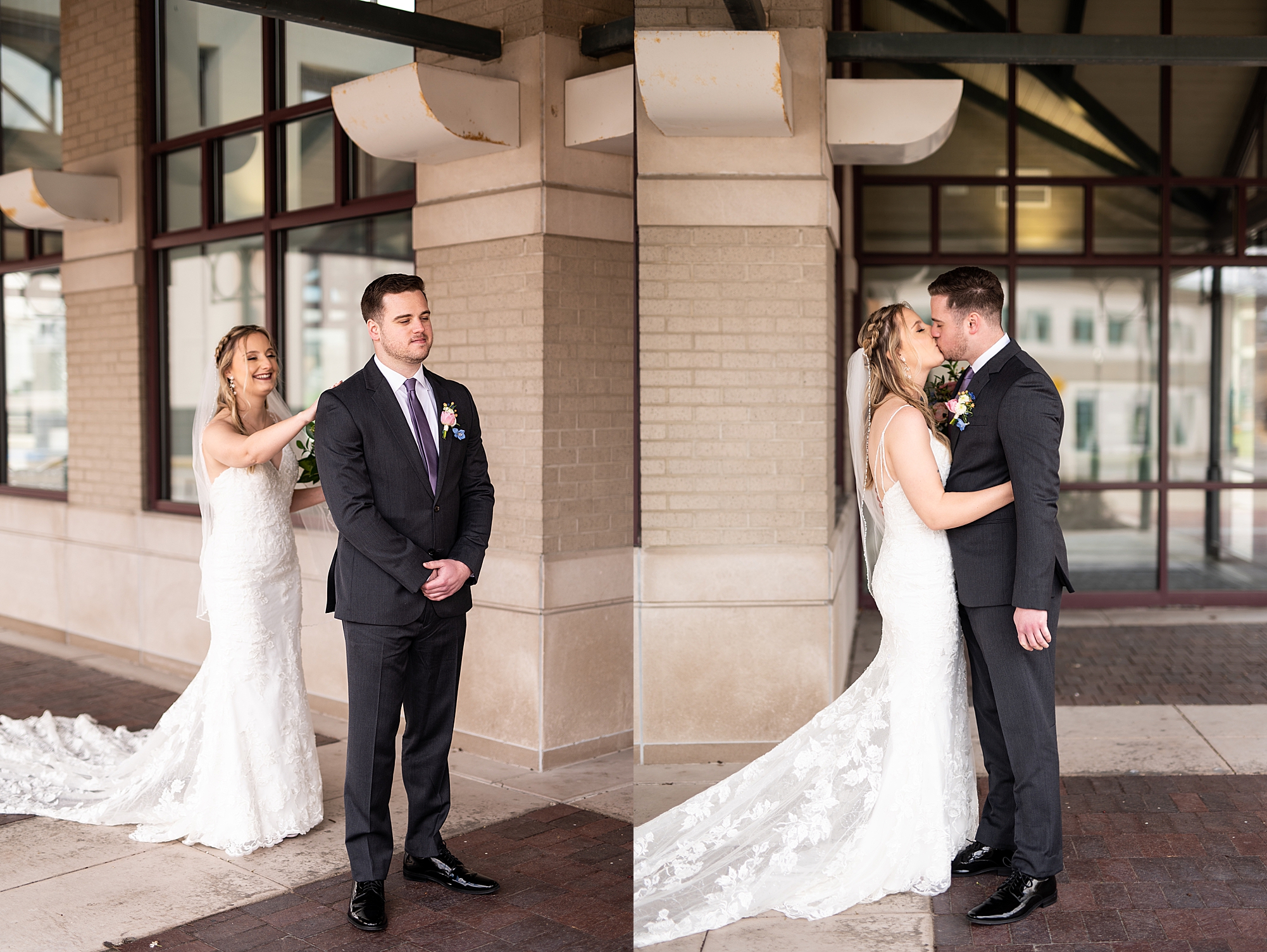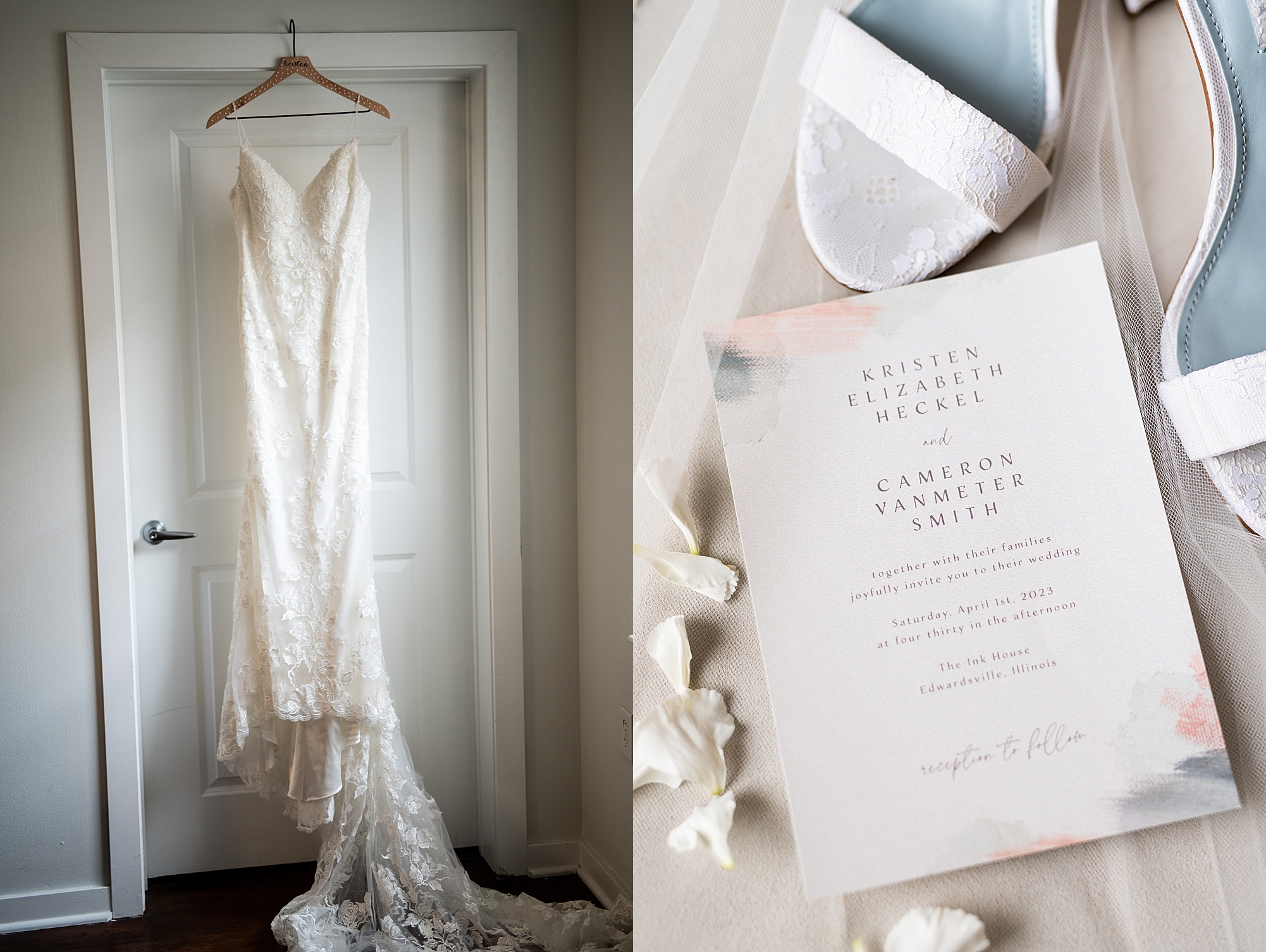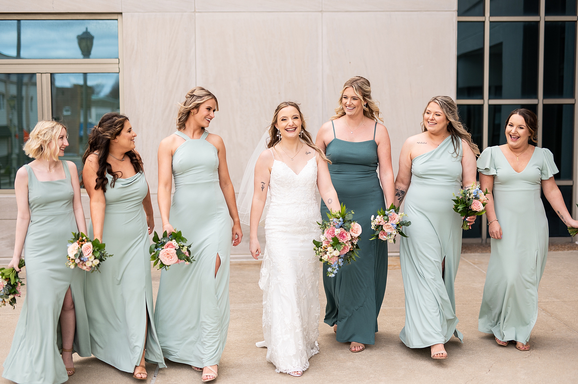 They chose the Ink House in Edwardsville for their venue which was absolutely beautiful and a perfect space for them to welcome all of their close family and friends. The prediction was for clouds and wind throughout the day, but the sun decided to make an appearance giving way to a great spring day. After Kristen spent the morning getting ready with her best friends and mom, we traveled to Edwardsville so she could share a first look with Cameron. They were so sweet seeing each other for the first time, smiles never left their faces. They read private vows to each other and then it was time for portraits! Downtown Edwardsville had some great backdrops and their bridal party came along for some really fun shots!