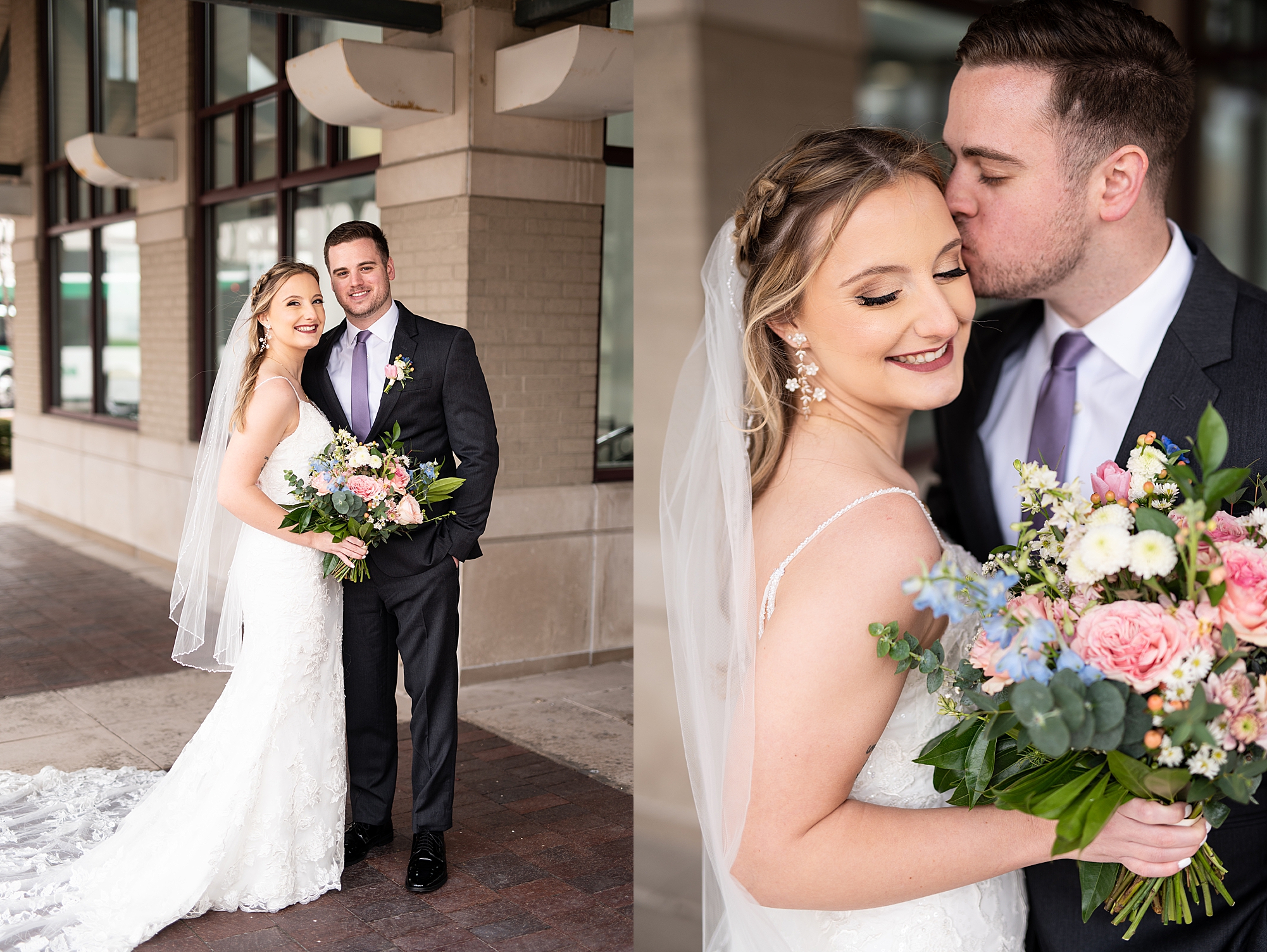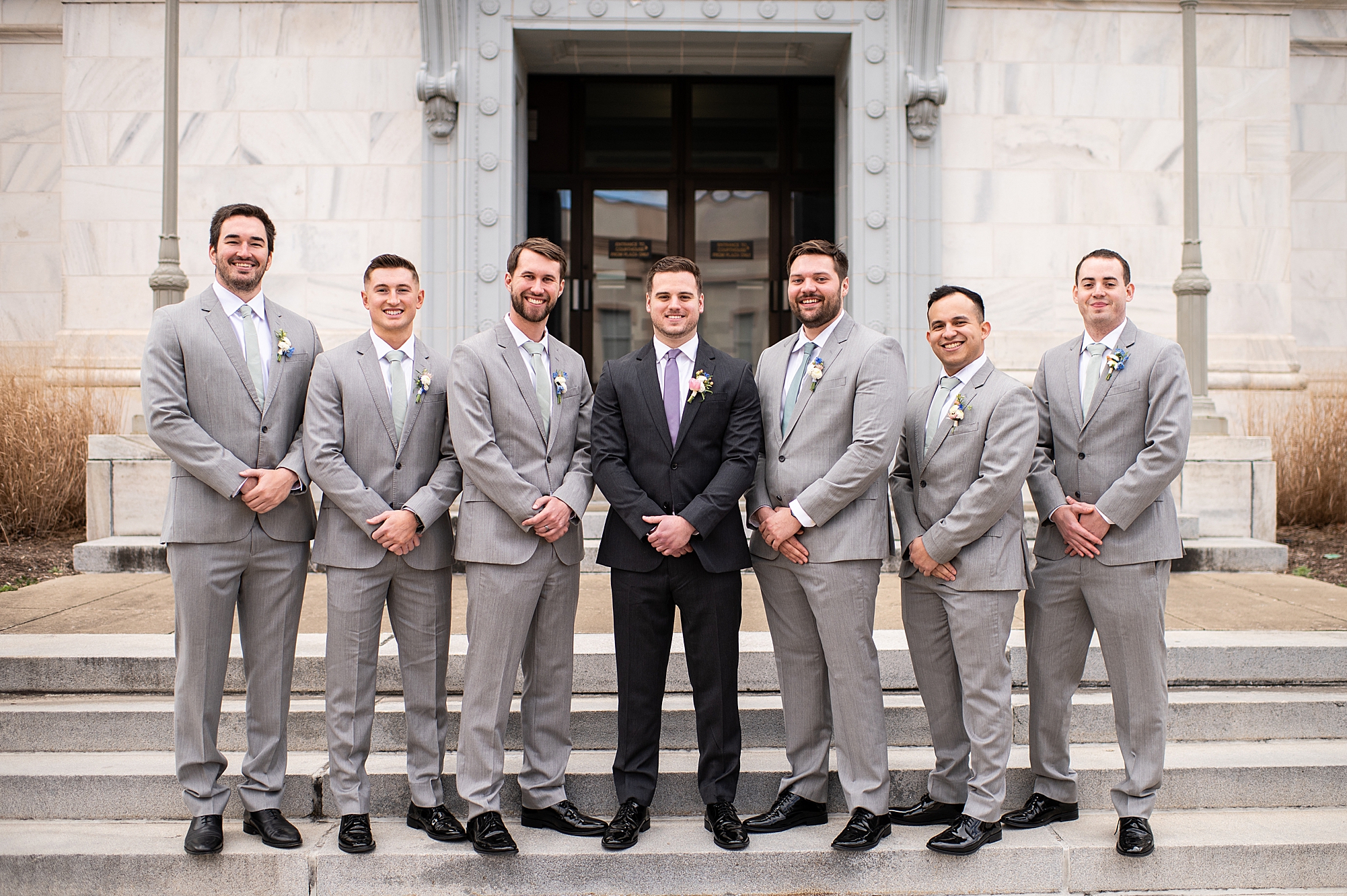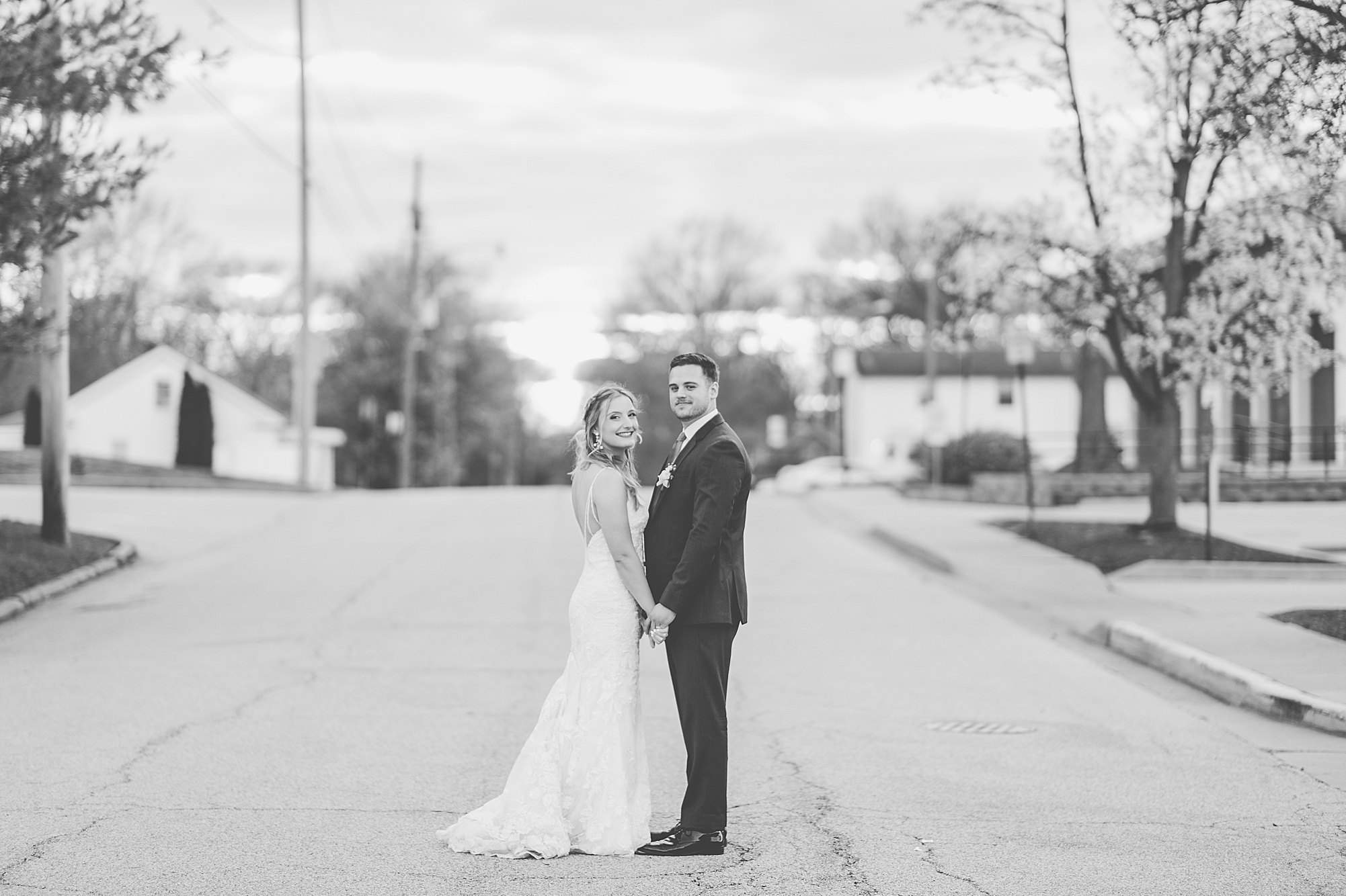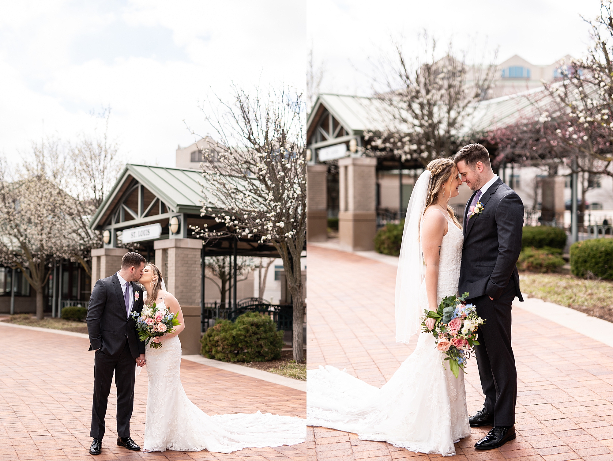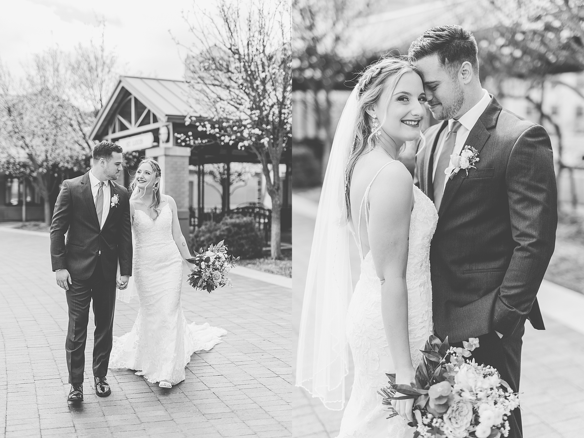 They chose the Ink House in Edwardsville for their venue which was absolutely beautiful and a perfect space for them to welcome all of their close family and friends. The prediction was for clouds and wind throughout the day, but the sun decided to make an appearance giving way to a great spring day. After Kristen spent the morning getting ready with her best friends and mom, we traveled to Edwardsville so she could share a first look with Cameron. They were so sweet seeing each other for the first time, smiles never left their faces. They read private vows to each other and then it was time for portraits! Downtown Edwardsville had some great backdrops and their bridal party came along for some really fun shots!