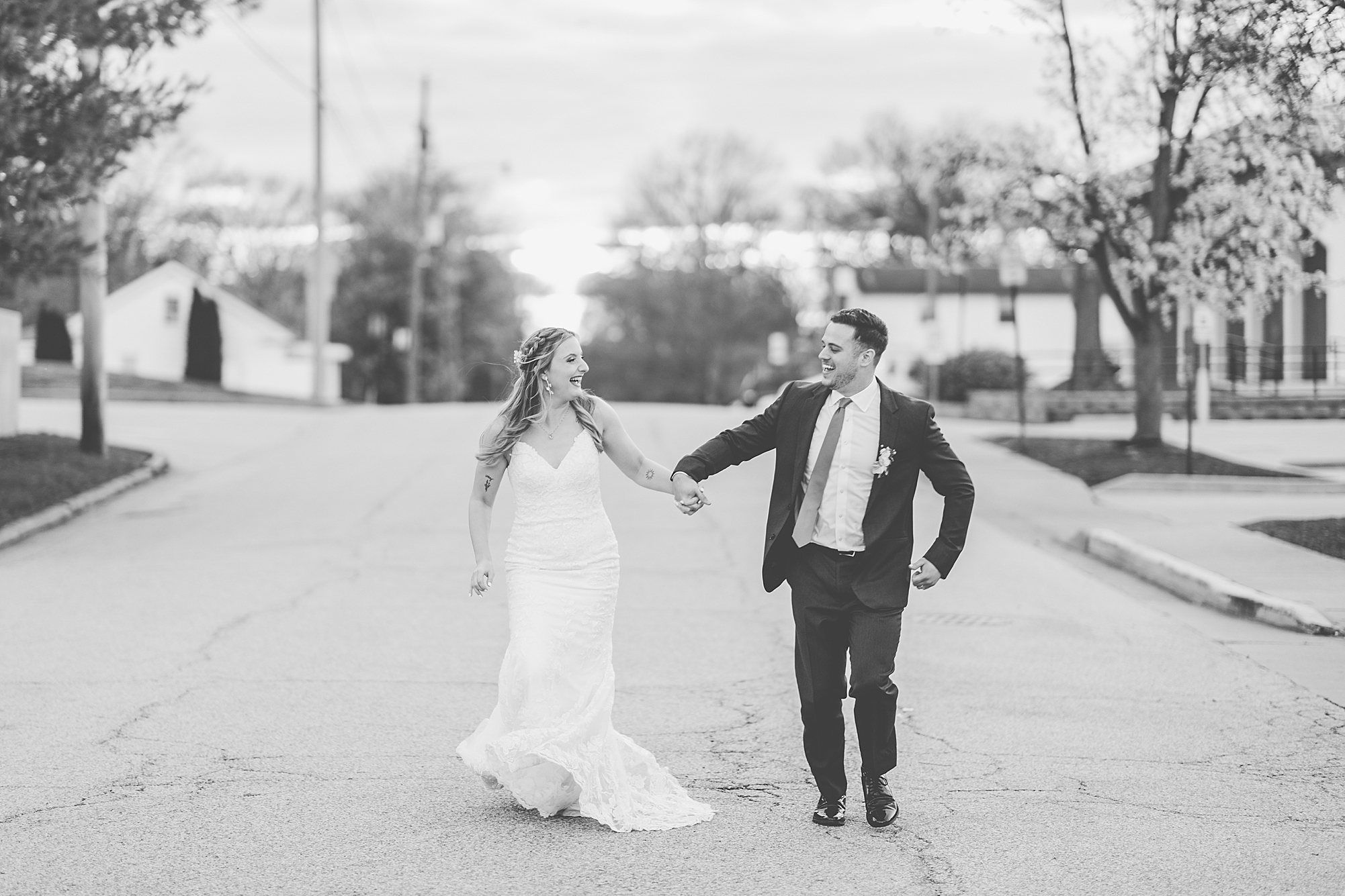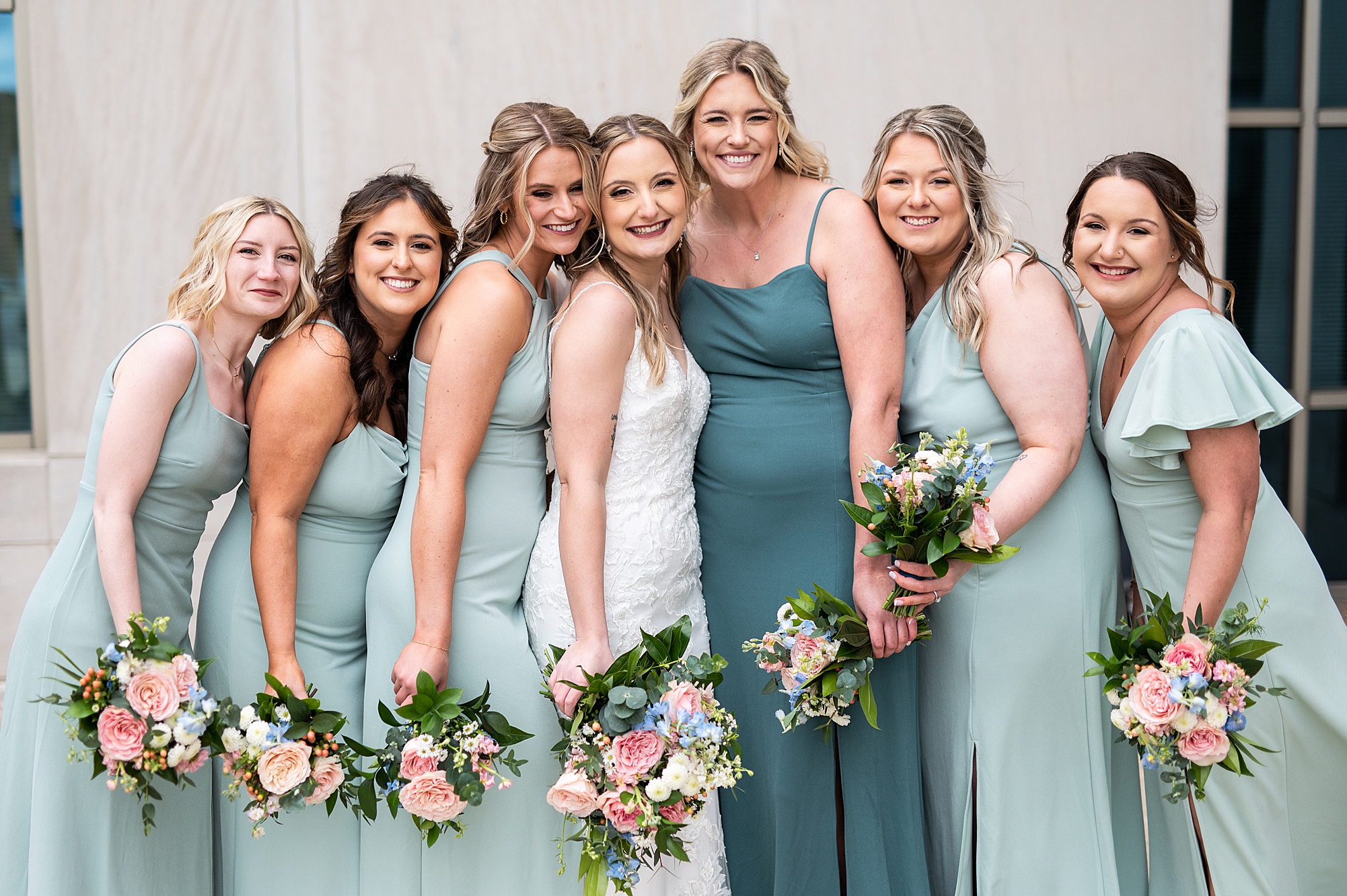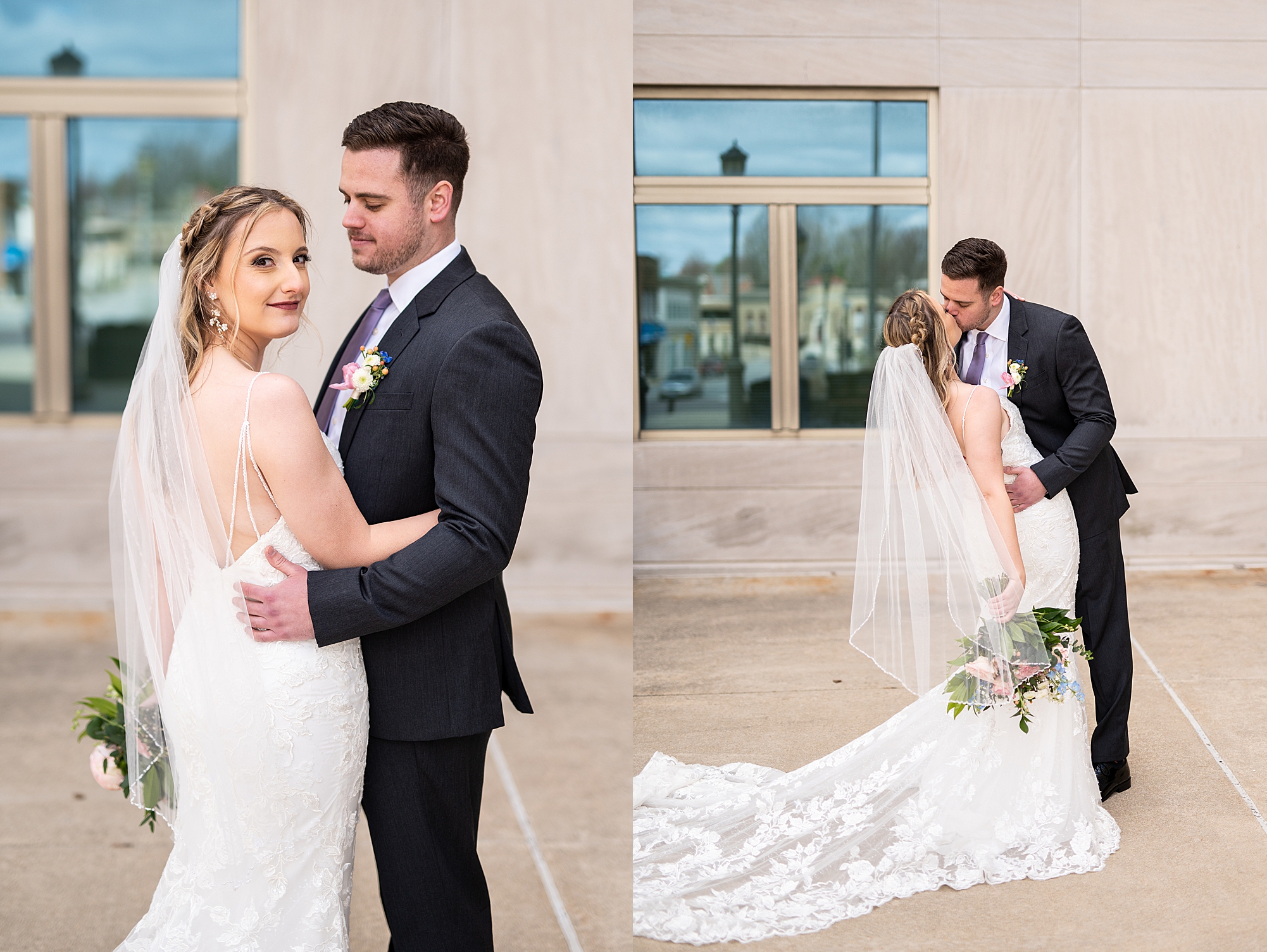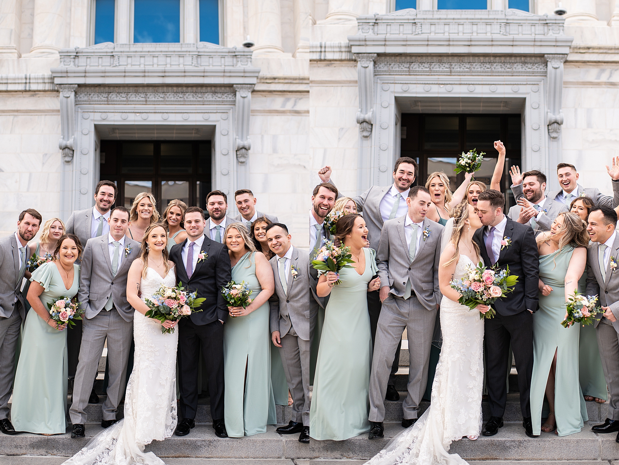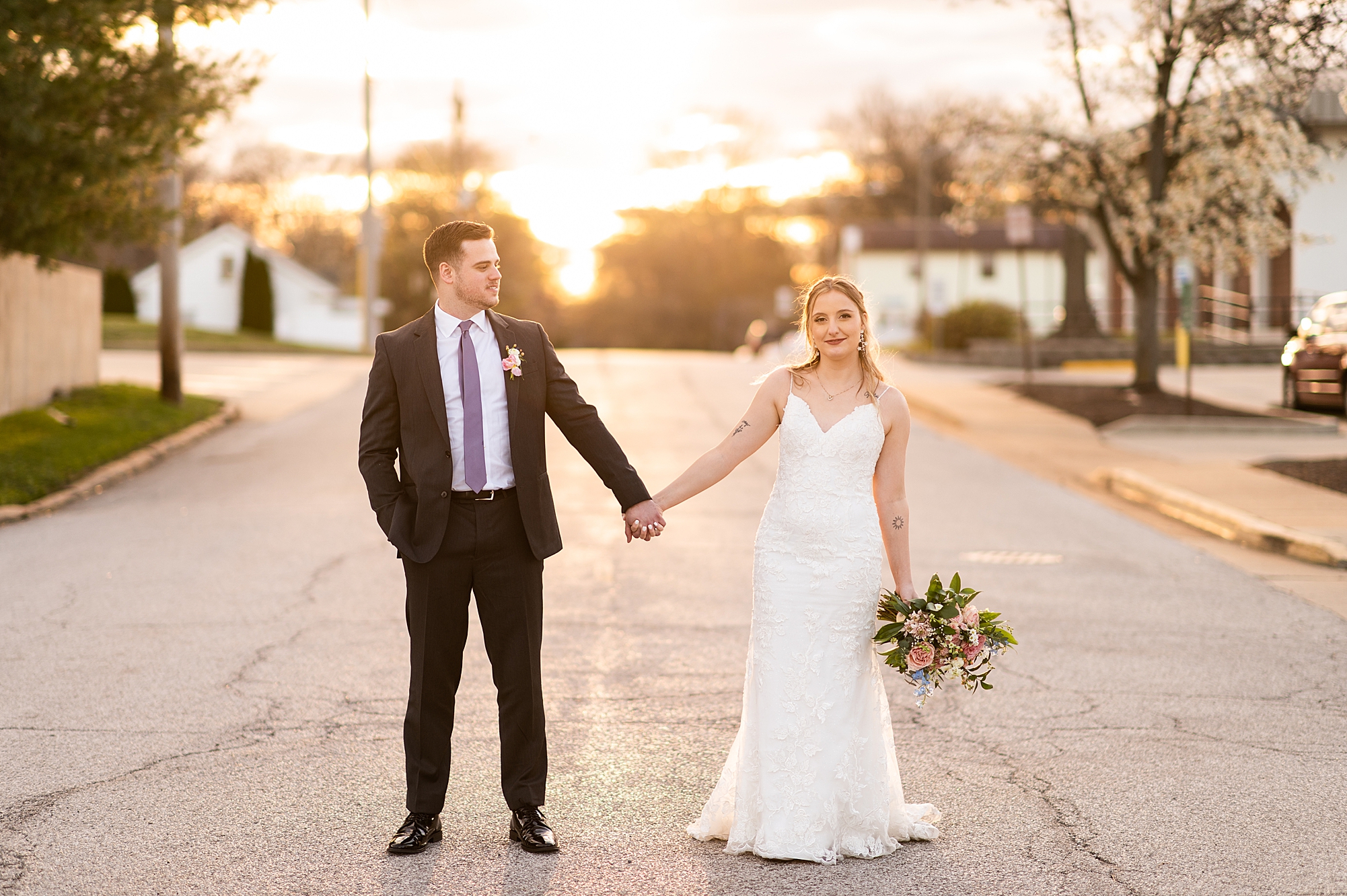 They chose the Ink House in Edwardsville for their venue which was absolutely beautiful and a perfect space for them to welcome all of their close family and friends. The prediction was for clouds and wind throughout the day, but the sun decided to make an appearance giving way to a great spring day. After Kristen spent the morning getting ready with her best friends and mom, we traveled to Edwardsville so she could share a first look with Cameron. They were so sweet seeing each other for the first time, smiles never left their faces. They read private vows to each other and then it was time for portraits! Downtown Edwardsville had some great backdrops and their bridal party came along for some really fun shots!