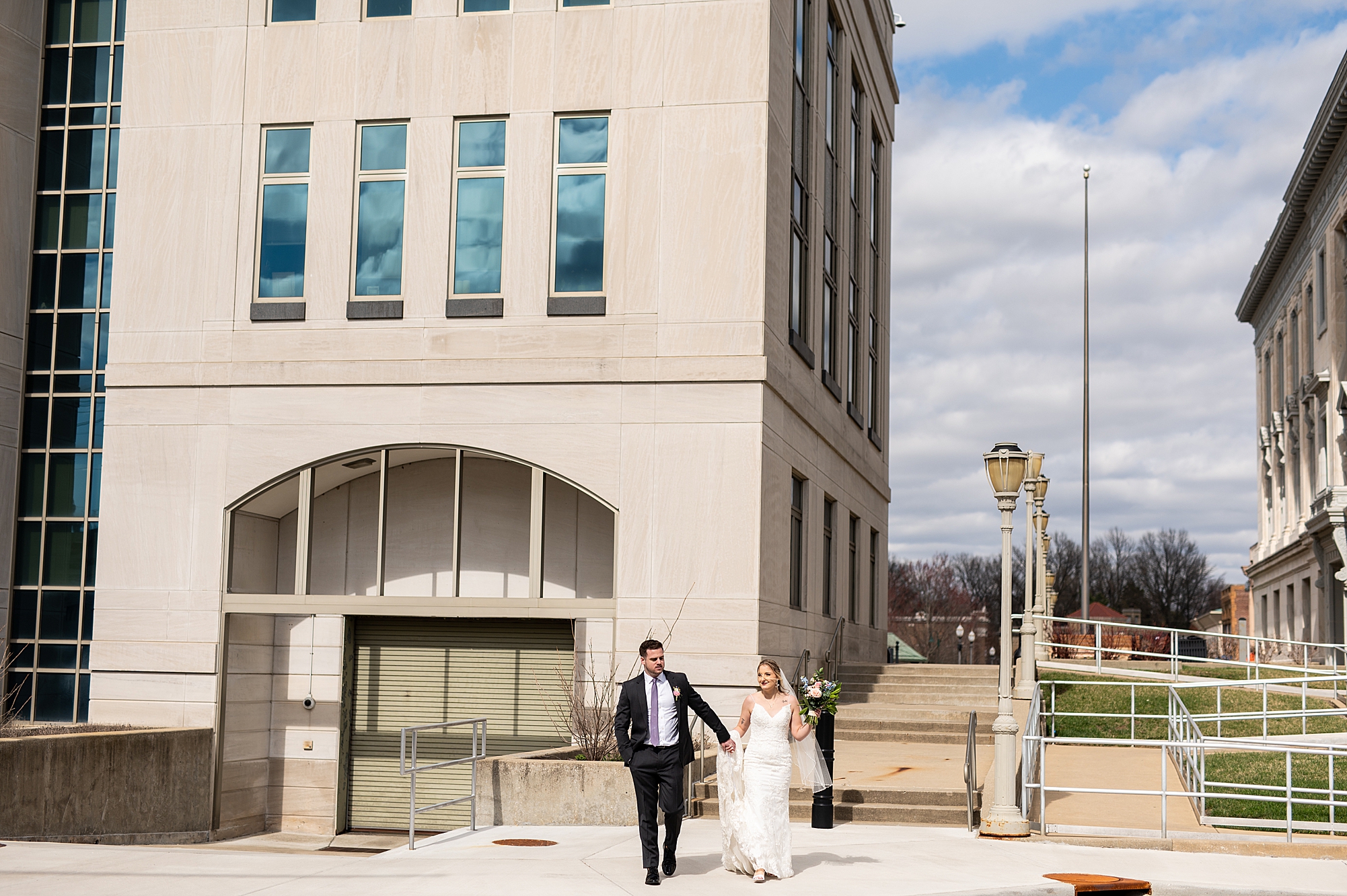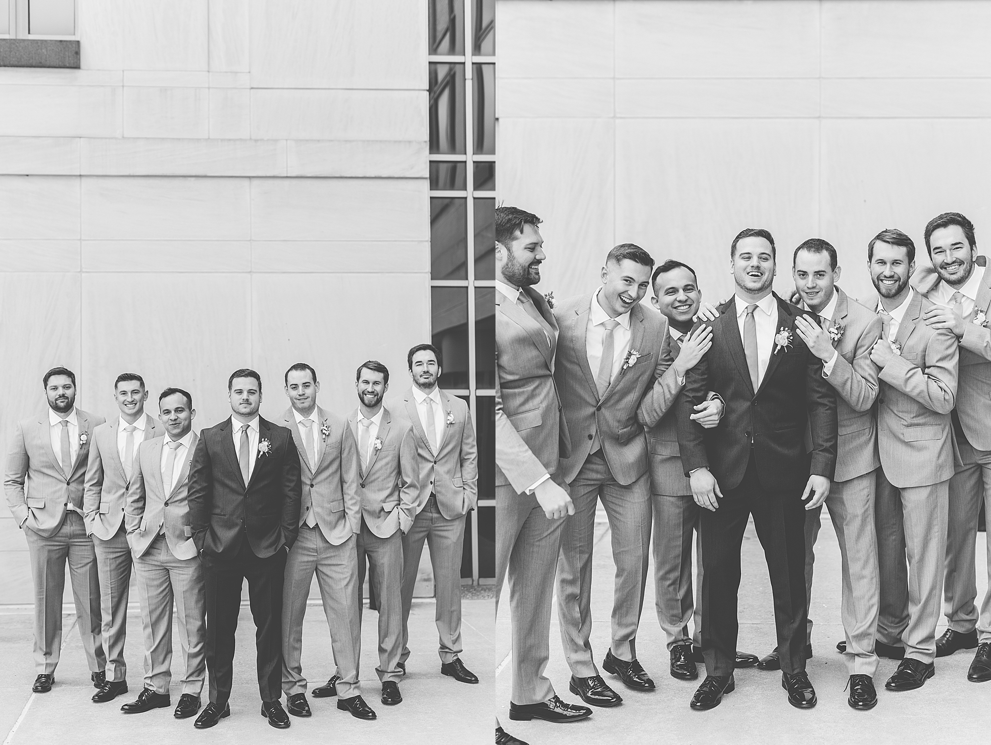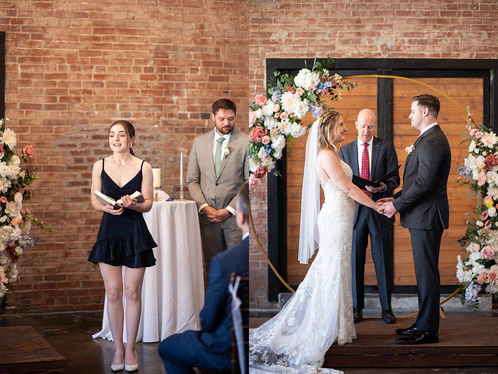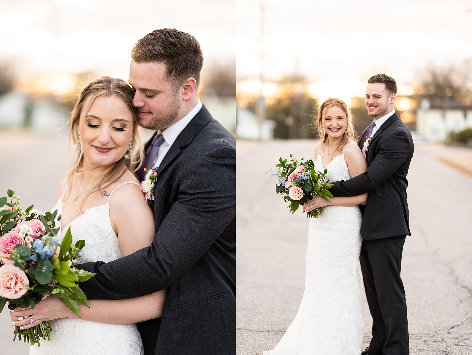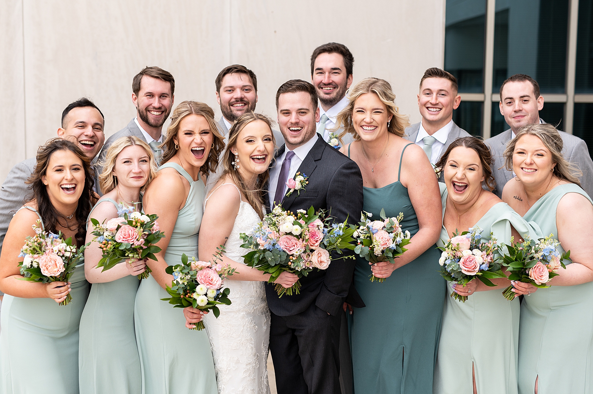They chose the Ink House in Edwardsville for their venue which was absolutely beautiful and a perfect space for them to welcome all of their close family and friends. The prediction was for clouds and wind throughout the day, but the sun decided to make an appearance giving way to a great spring day. After Kristen spent the morning getting ready with her best friends and mom, we traveled to Edwardsville so she could share a first look with Cameron. They were so sweet seeing each other for the first time, smiles never left their faces. They read private vows to each other and then it was time for portraits! Downtown Edwardsville had some great backdrops and their bridal party came along for some really fun shots!