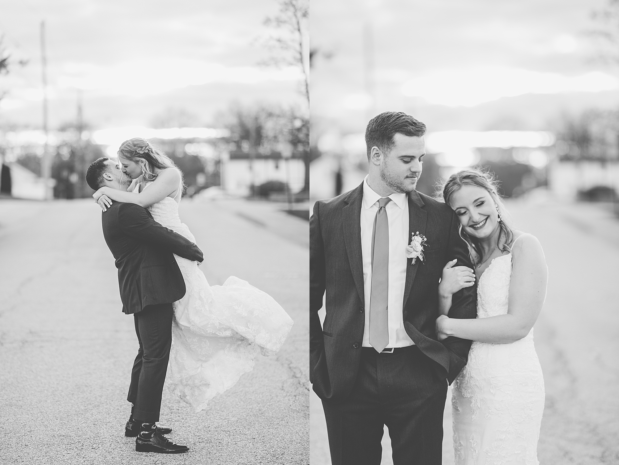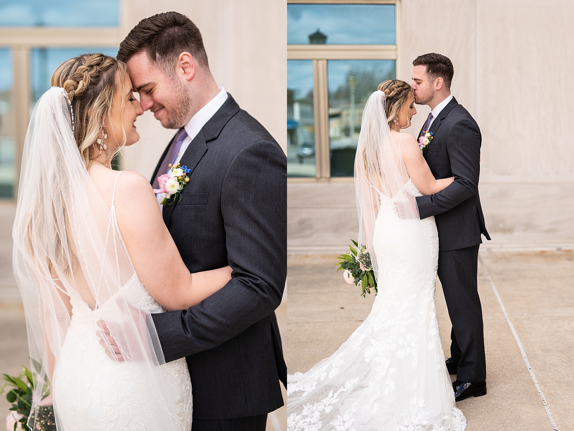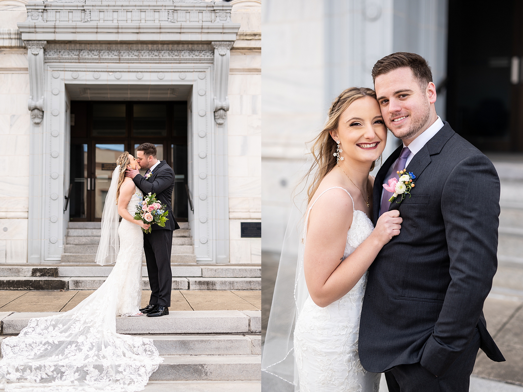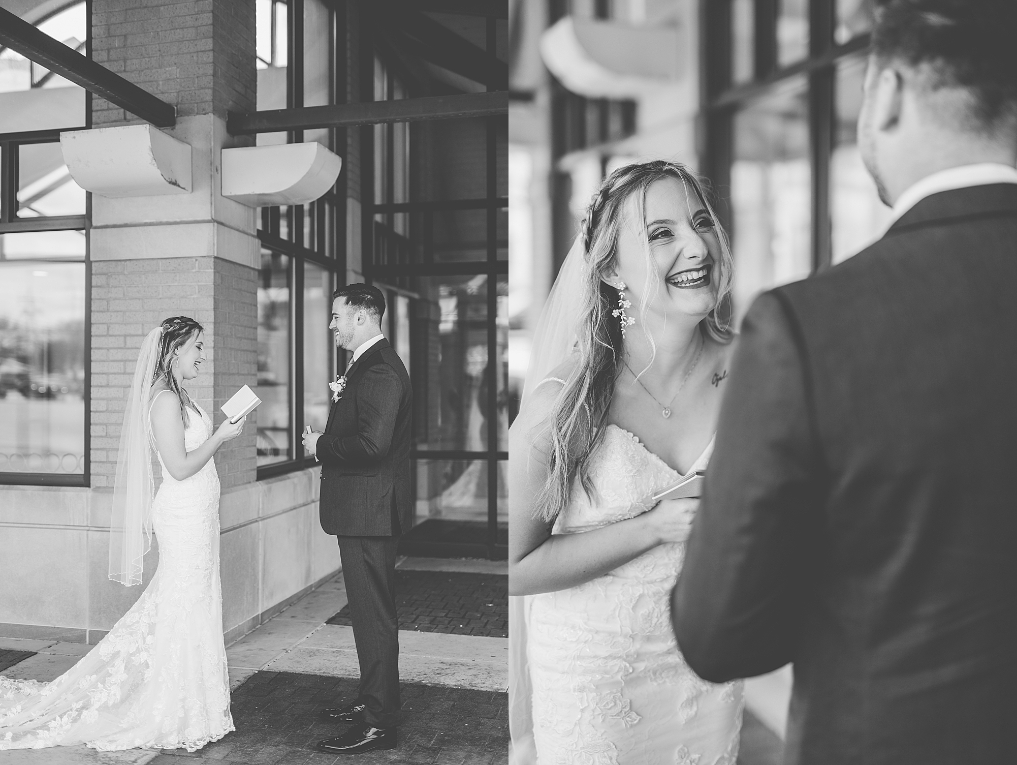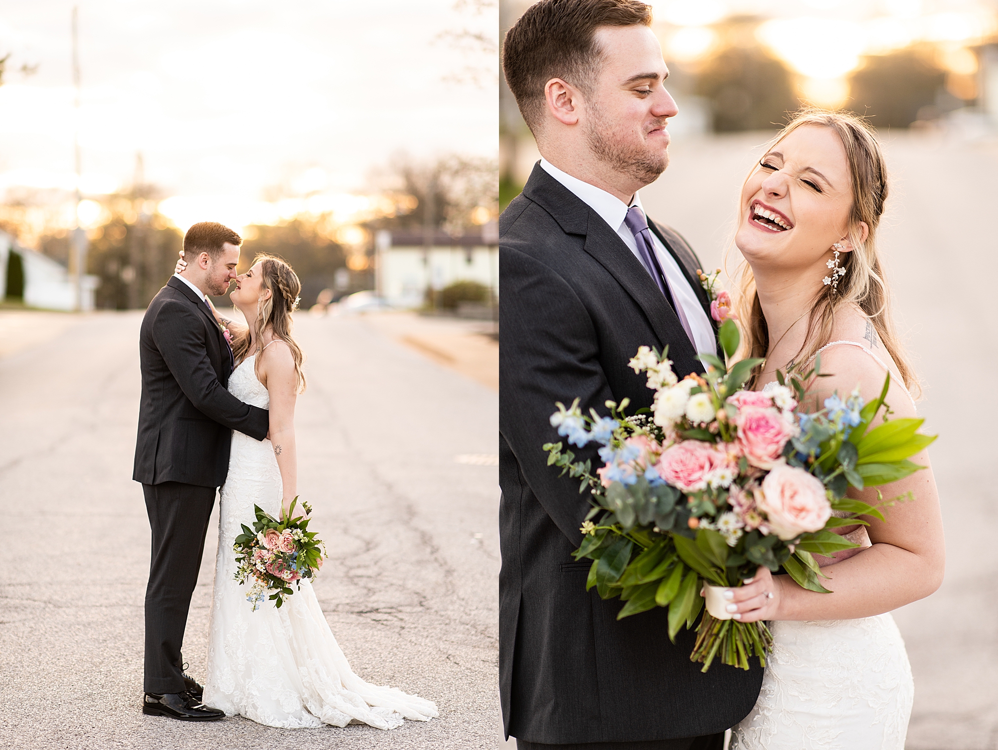 They chose the Ink House in Edwardsville for their venue which was absolutely beautiful and a perfect space for them to welcome all of their close family and friends. The prediction was for clouds and wind throughout the day, but the sun decided to make an appearance giving way to a great spring day. After Kristen spent the morning getting ready with her best friends and mom, we traveled to Edwardsville so she could share a first look with Cameron. They were so sweet seeing each other for the first time, smiles never left their faces. They read private vows to each other and then it was time for portraits! Downtown Edwardsville had some great backdrops and their bridal party came along for some really fun shots!
