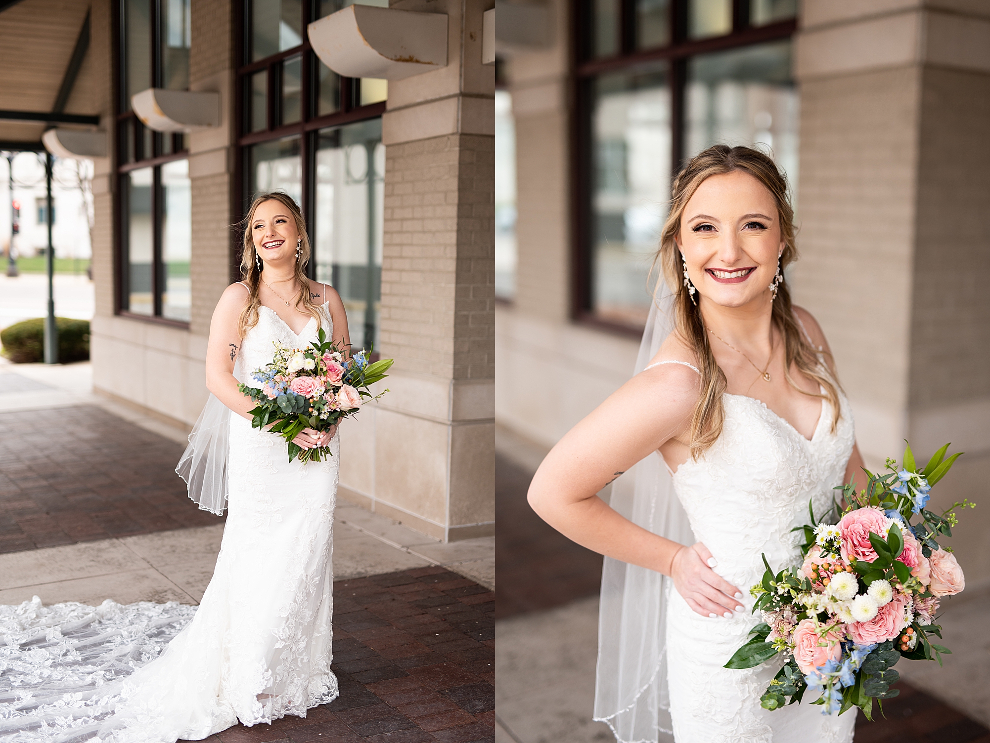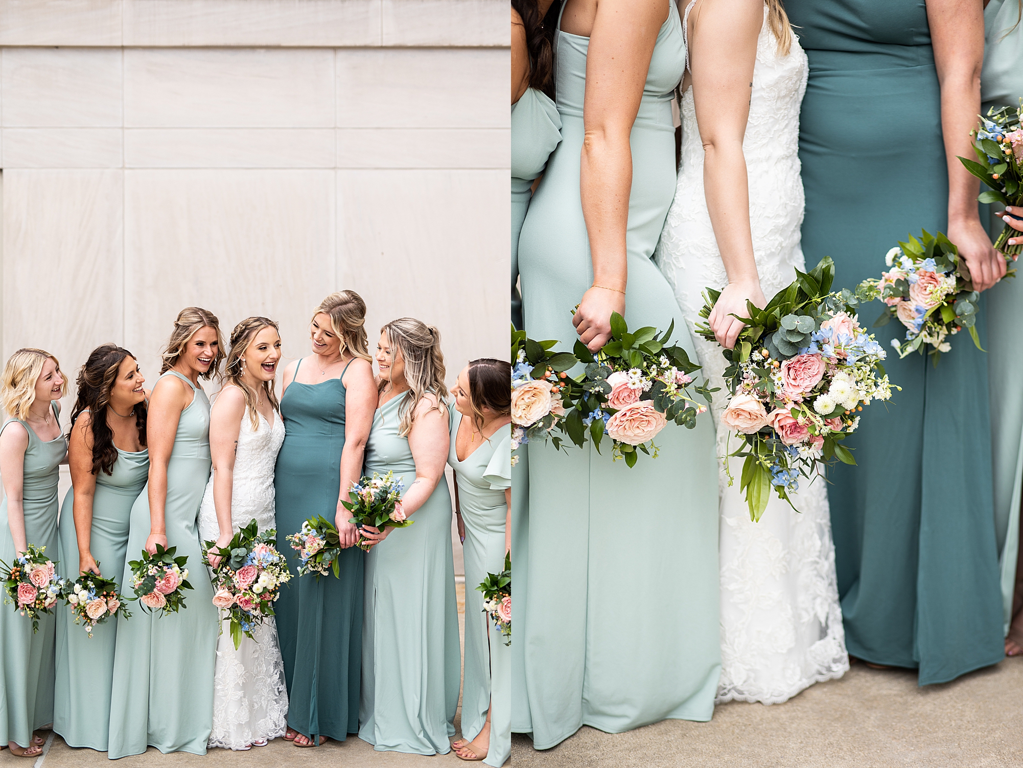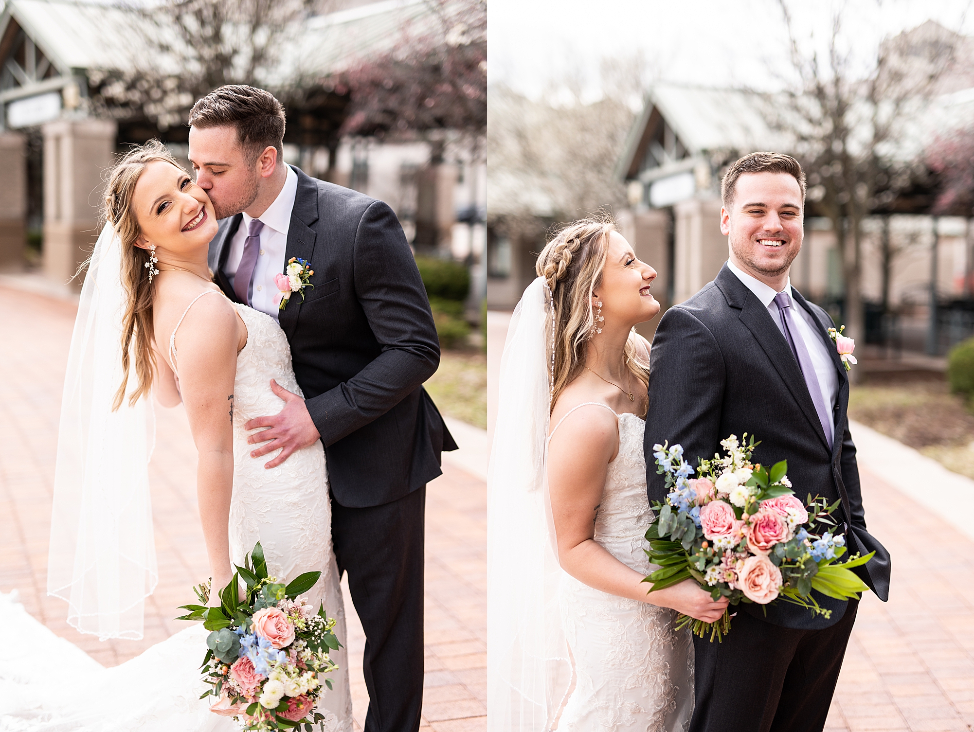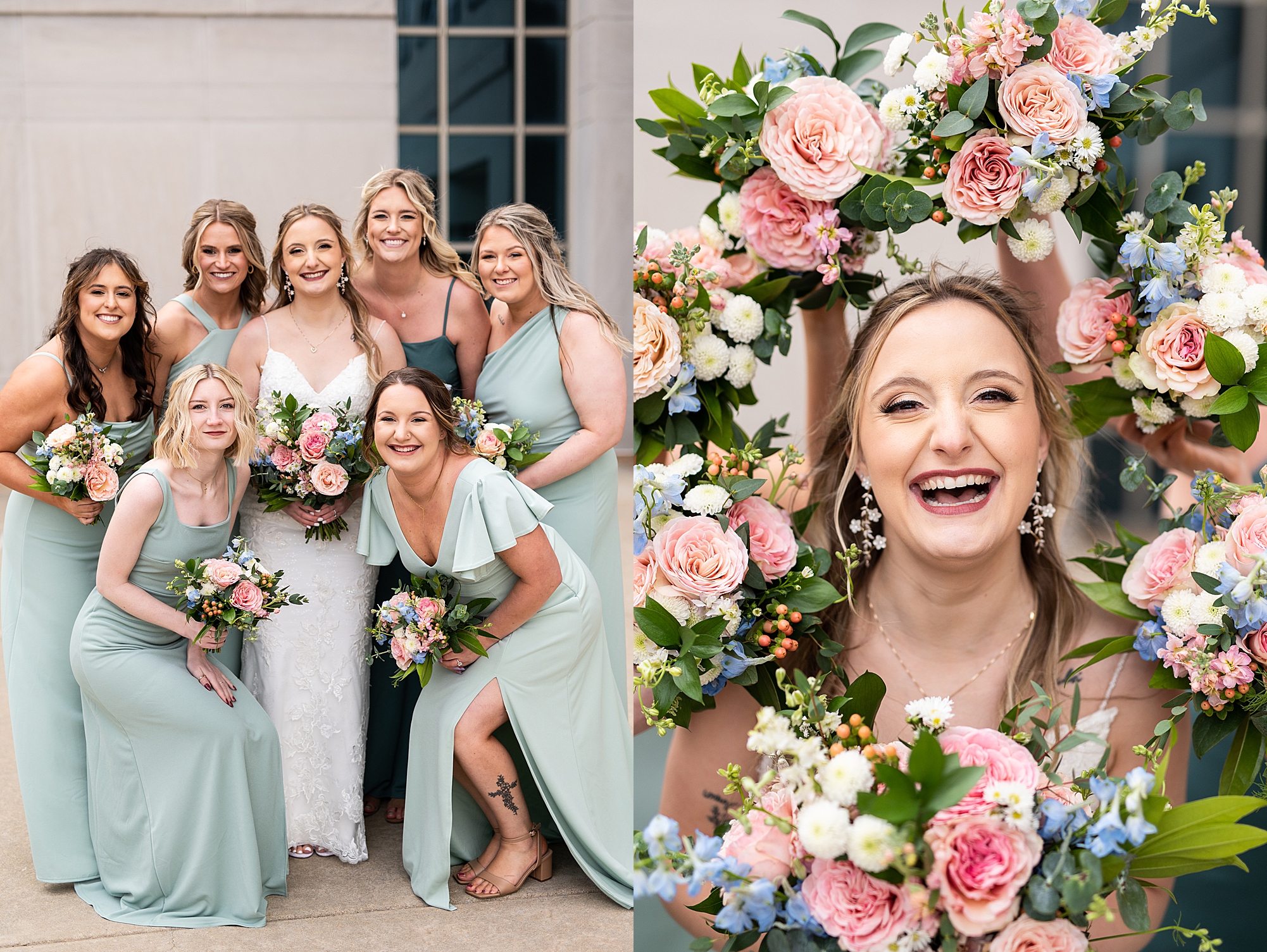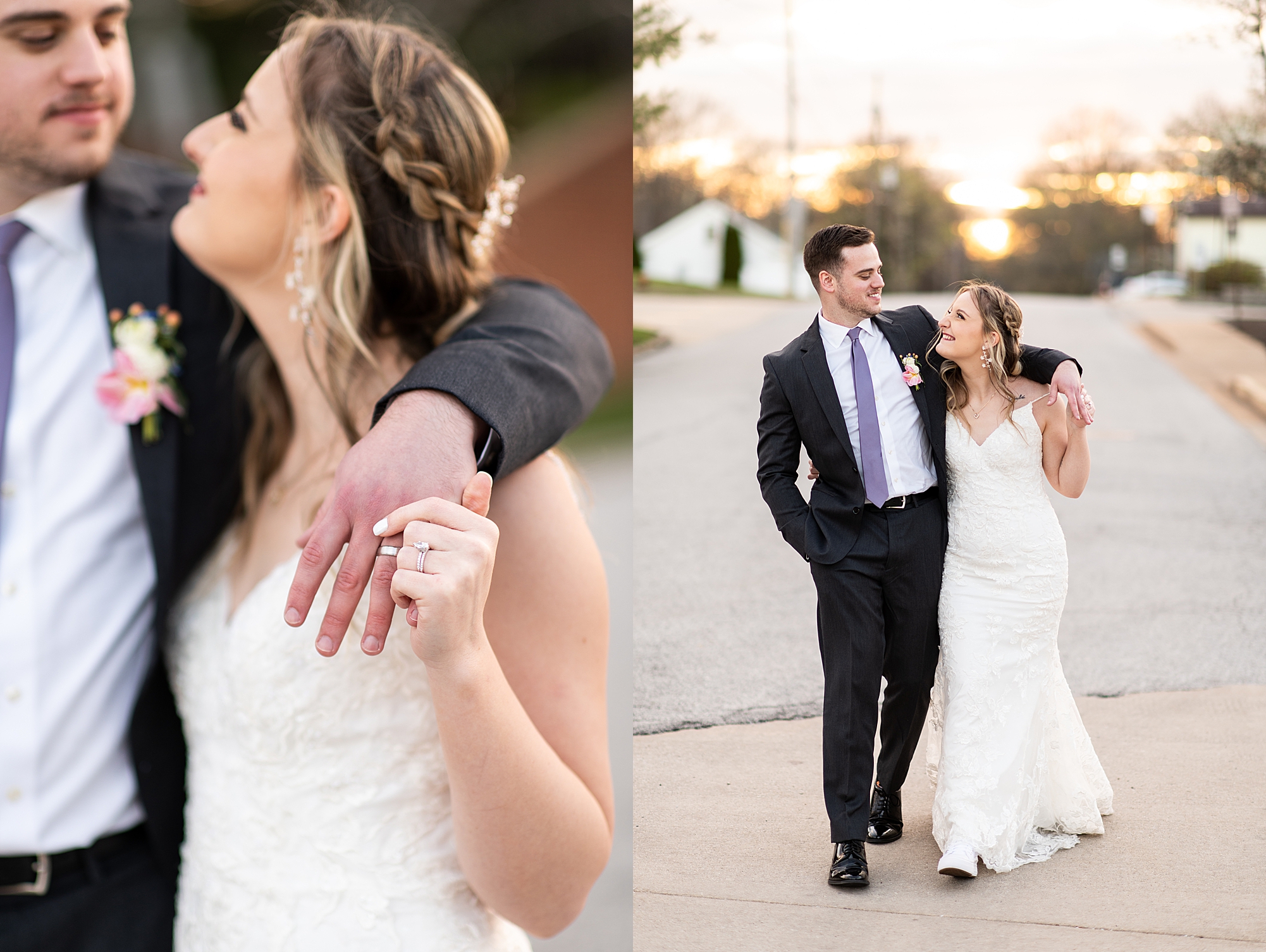 They chose the Ink House in Edwardsville for their venue which was absolutely beautiful and a perfect space for them to welcome all of their close family and friends. The prediction was for clouds and wind throughout the day, but the sun decided to make an appearance giving way to a great spring day. After Kristen spent the morning getting ready with her best friends and mom, we traveled to Edwardsville so she could share a first look with Cameron. They were so sweet seeing each other for the first time, smiles never left their faces. They read private vows to each other and then it was time for portraits! Downtown Edwardsville had some great backdrops and their bridal party came along for some really fun shots!
