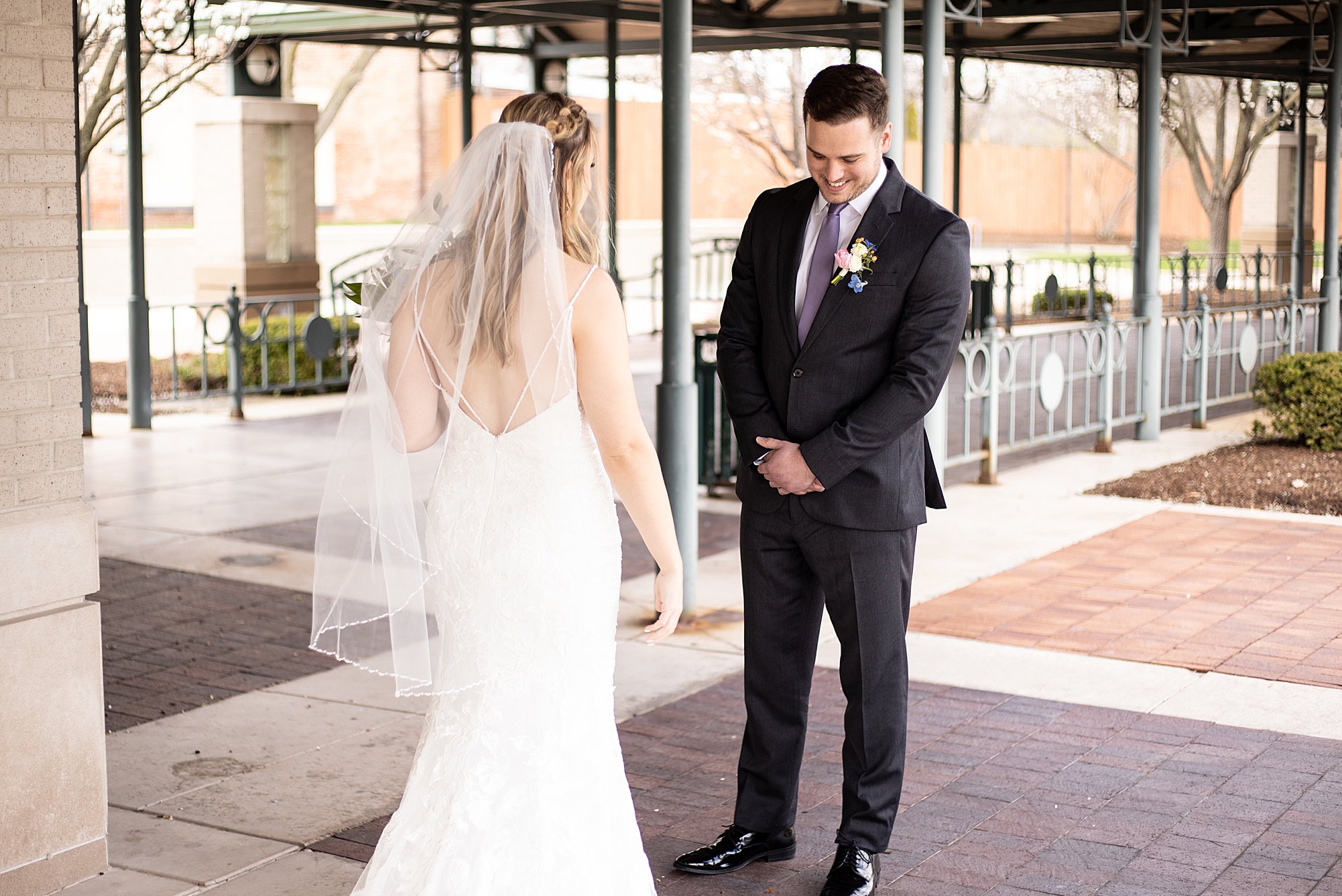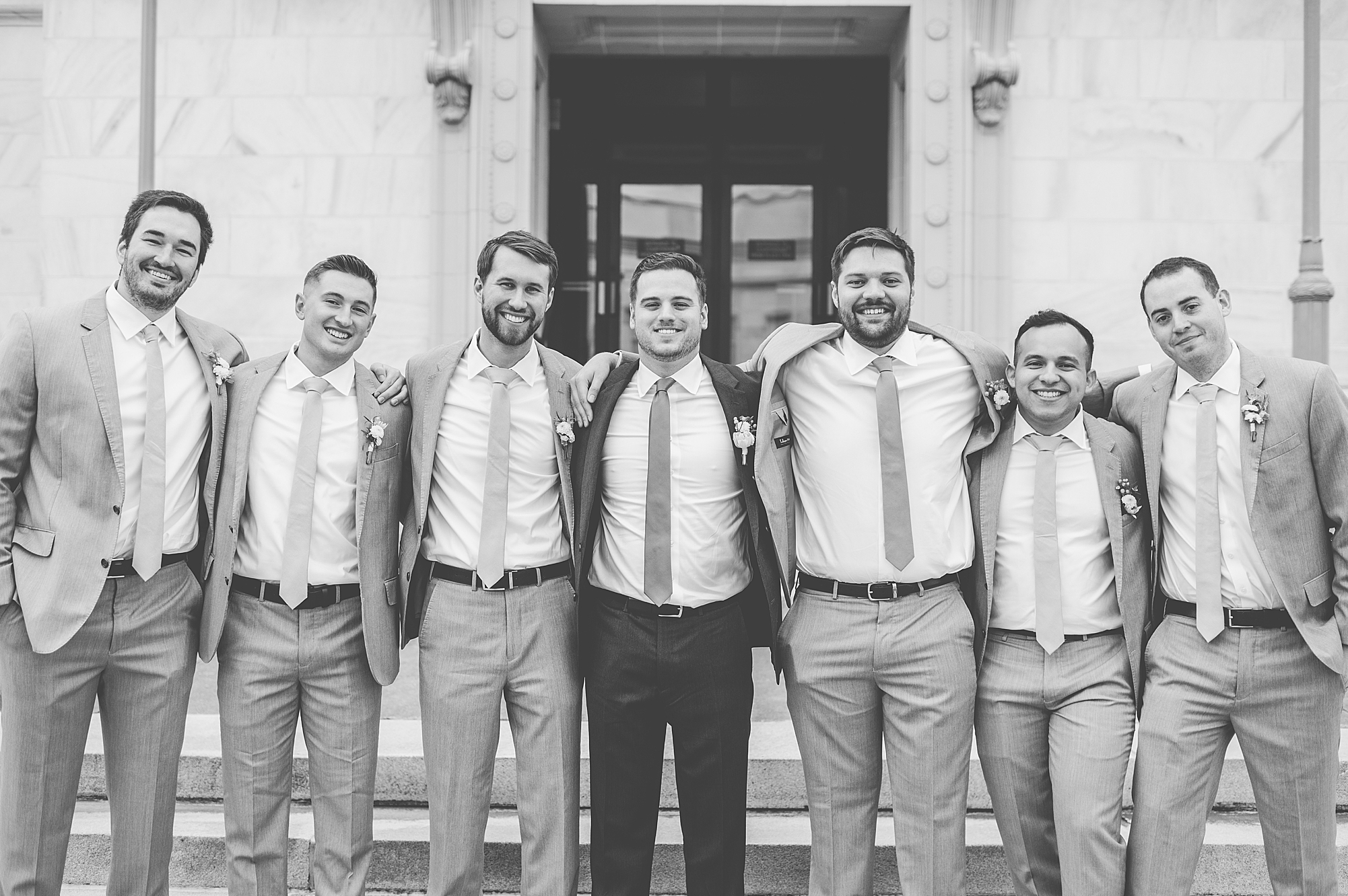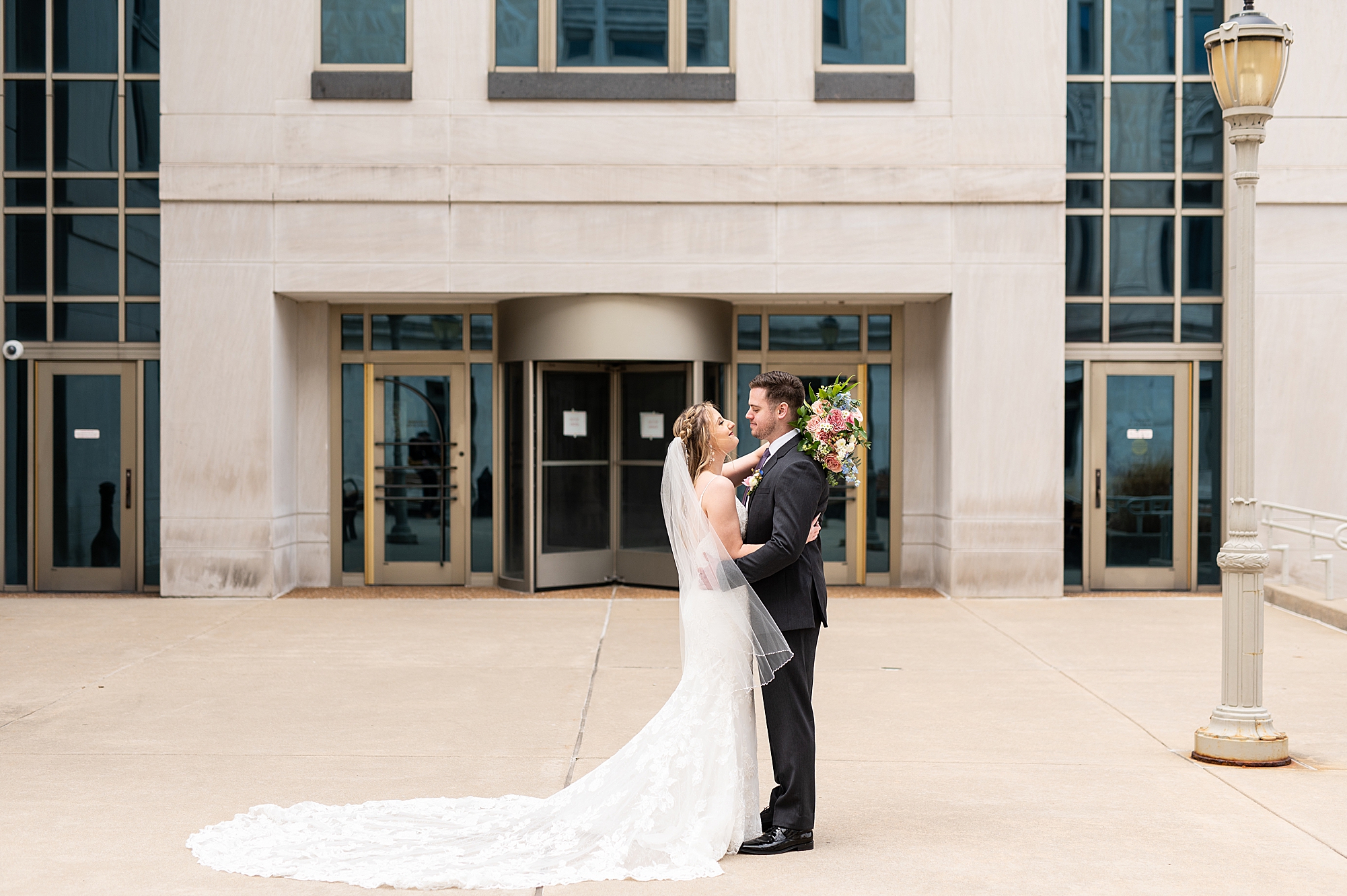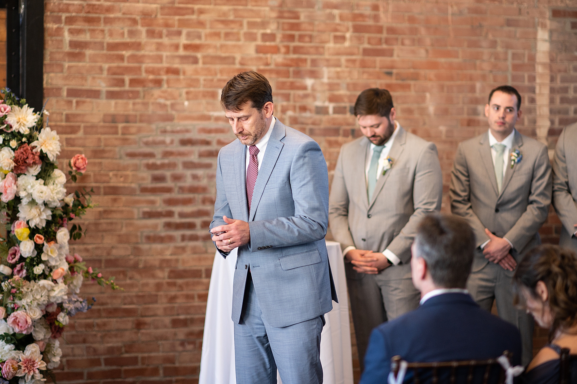 They chose the Ink House in Edwardsville for their venue which was absolutely beautiful and a perfect space for them to welcome all of their close family and friends. The prediction was for clouds and wind throughout the day, but the sun decided to make an appearance giving way to a great spring day. After Kristen spent the morning getting ready with her best friends and mom, we traveled to Edwardsville so she could share a first look with Cameron. They were so sweet seeing each other for the first time, smiles never left their faces. They read private vows to each other and then it was time for portraits! Downtown Edwardsville had some great backdrops and their bridal party came along for some really fun shots!