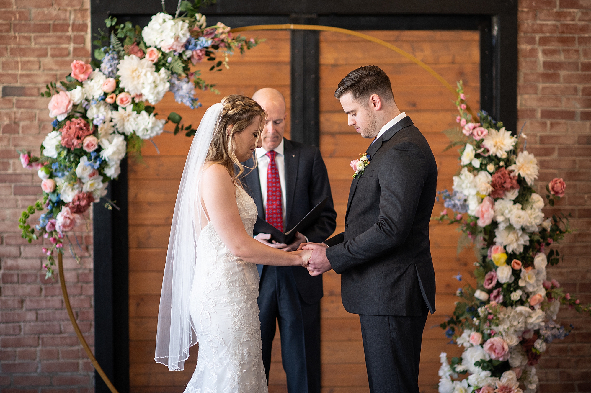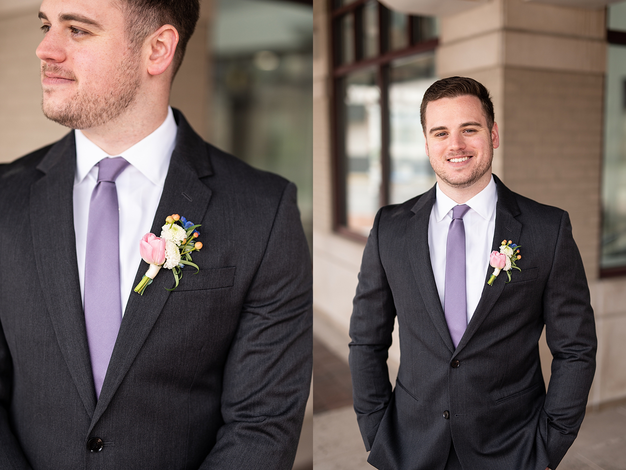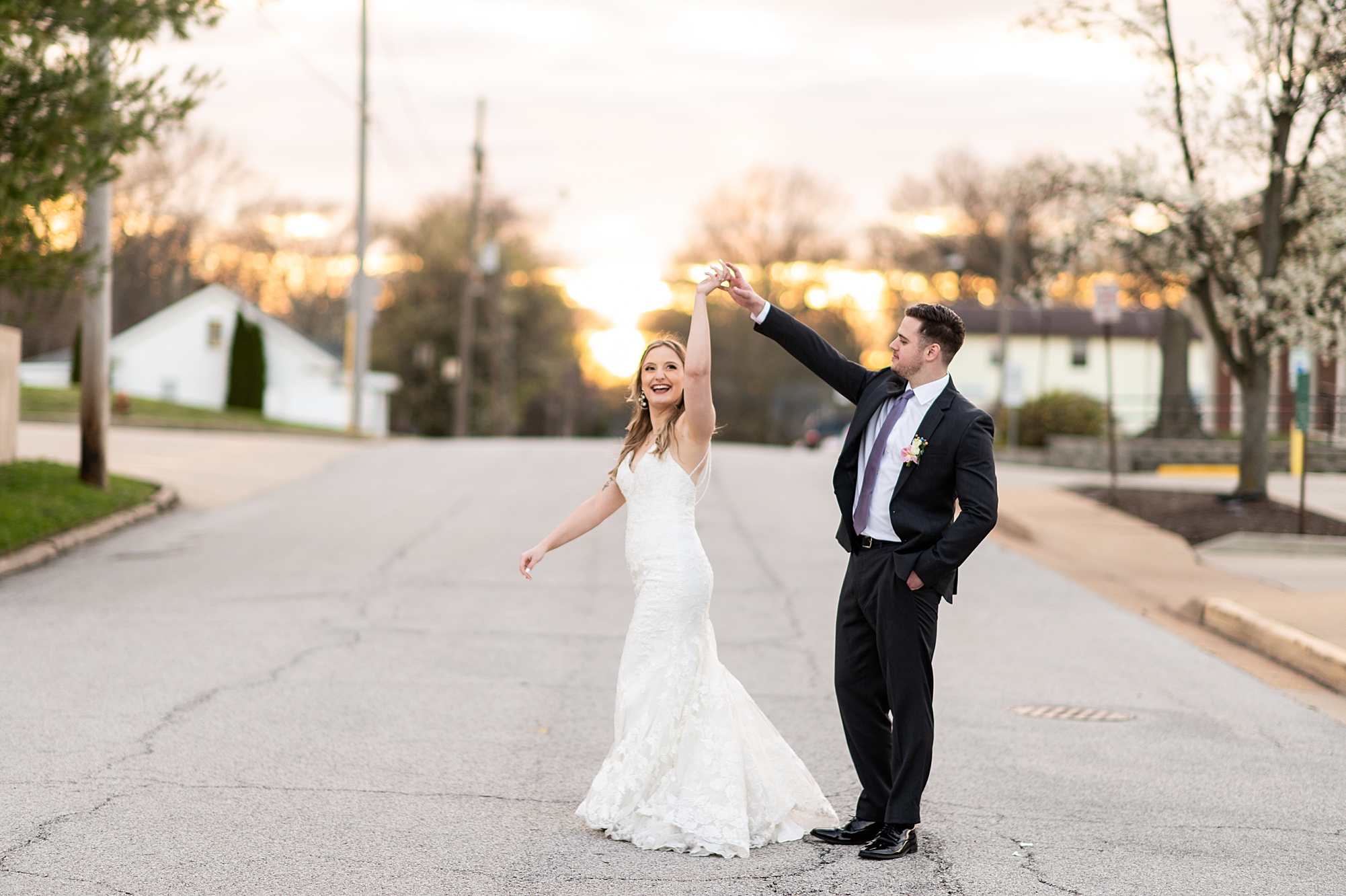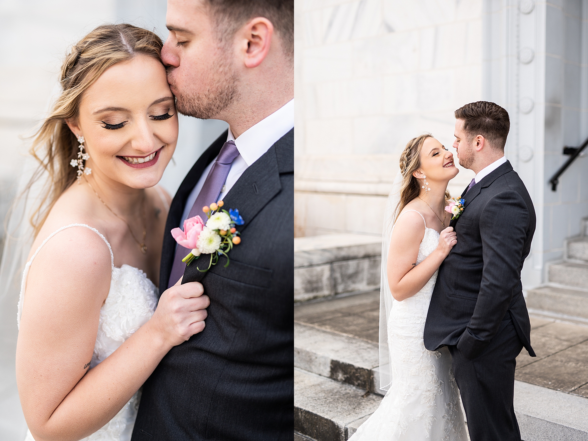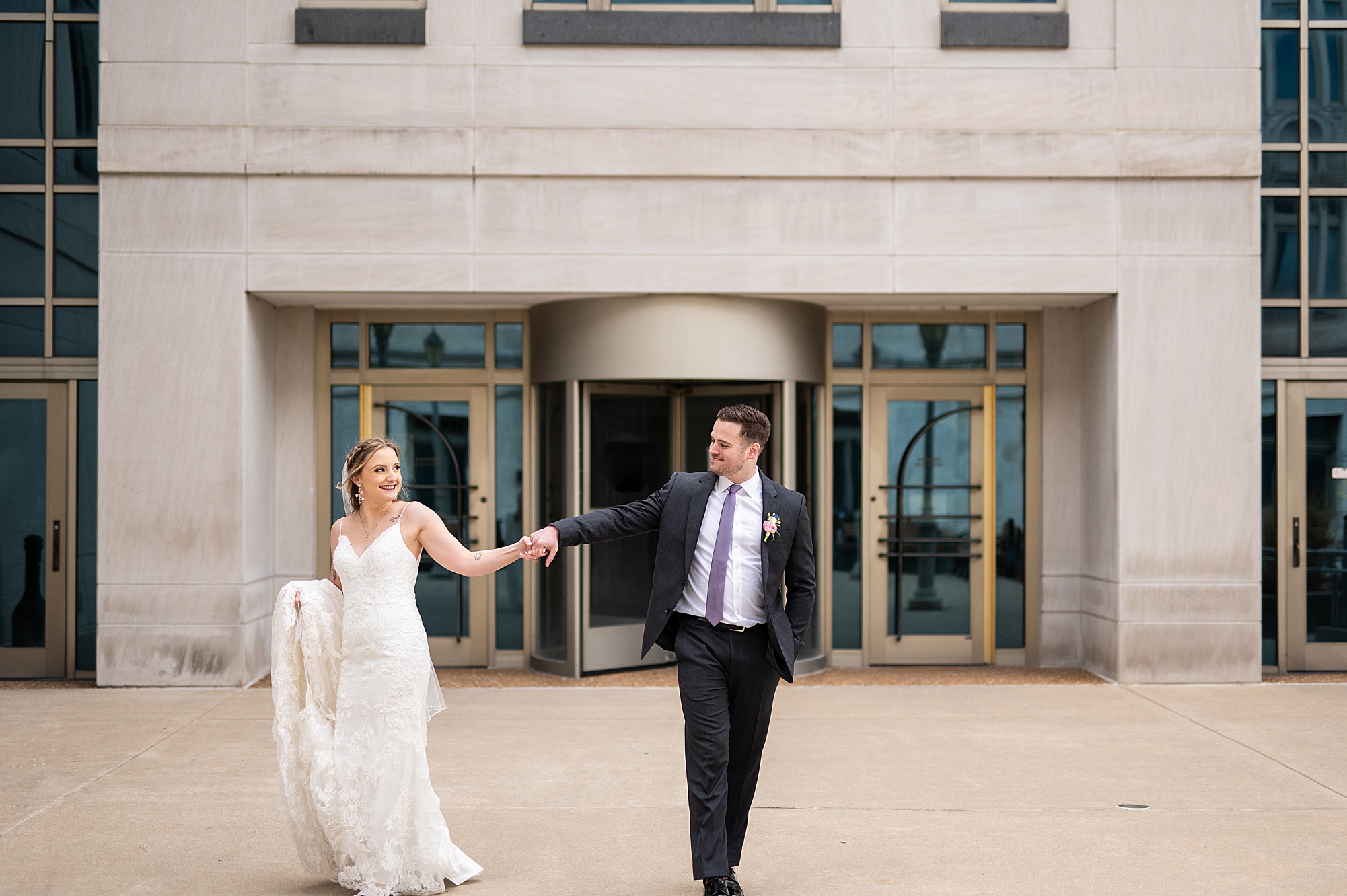 They chose the Ink House in Edwardsville for their venue which was absolutely beautiful and a perfect space for them to welcome all of their close family and friends. The prediction was for clouds and wind throughout the day, but the sun decided to make an appearance giving way to a great spring day. After Kristen spent the morning getting ready with her best friends and mom, we traveled to Edwardsville so she could share a first look with Cameron. They were so sweet seeing each other for the first time, smiles never left their faces. They read private vows to each other and then it was time for portraits! Downtown Edwardsville had some great backdrops and their bridal party came along for some really fun shots!