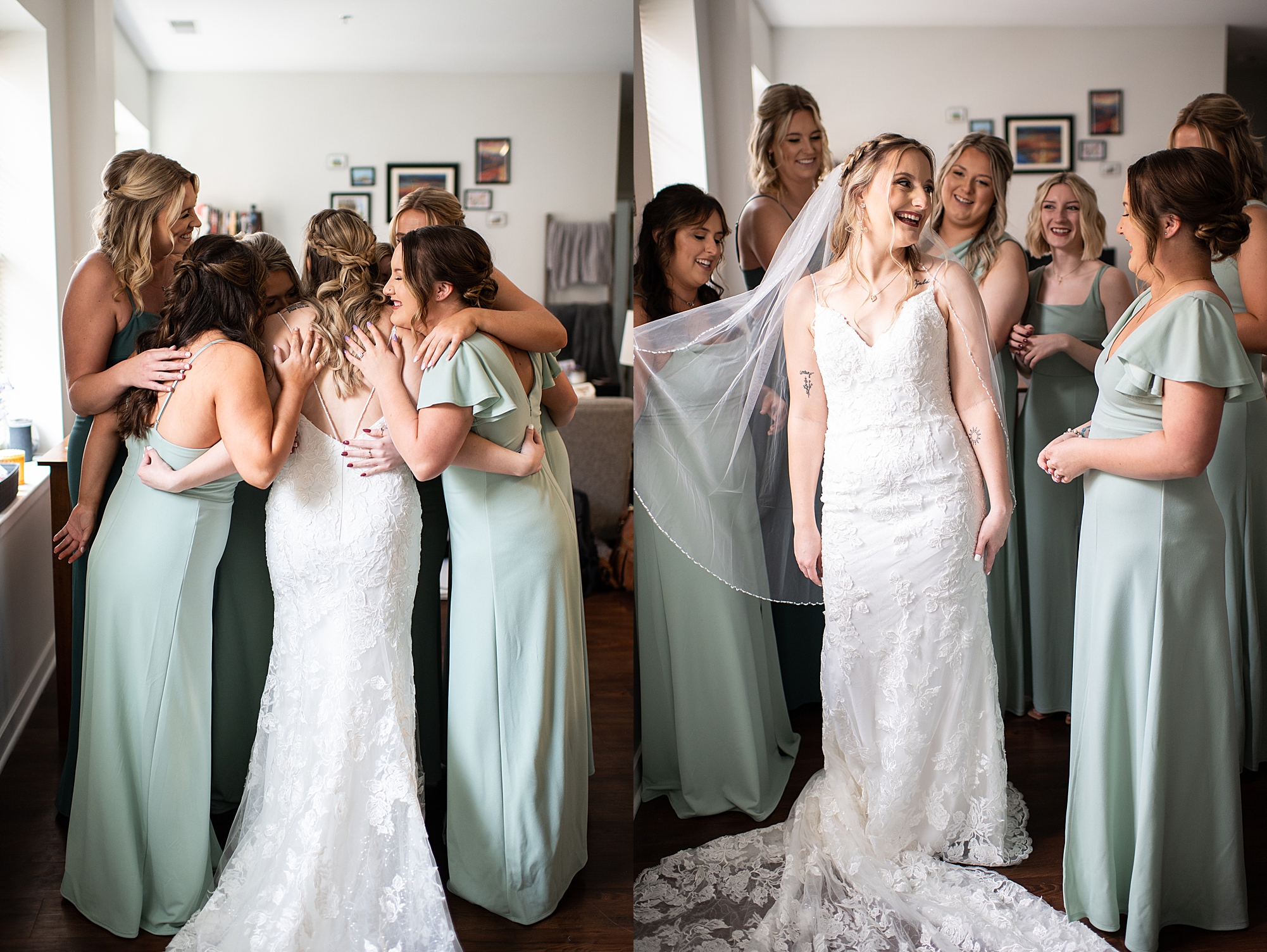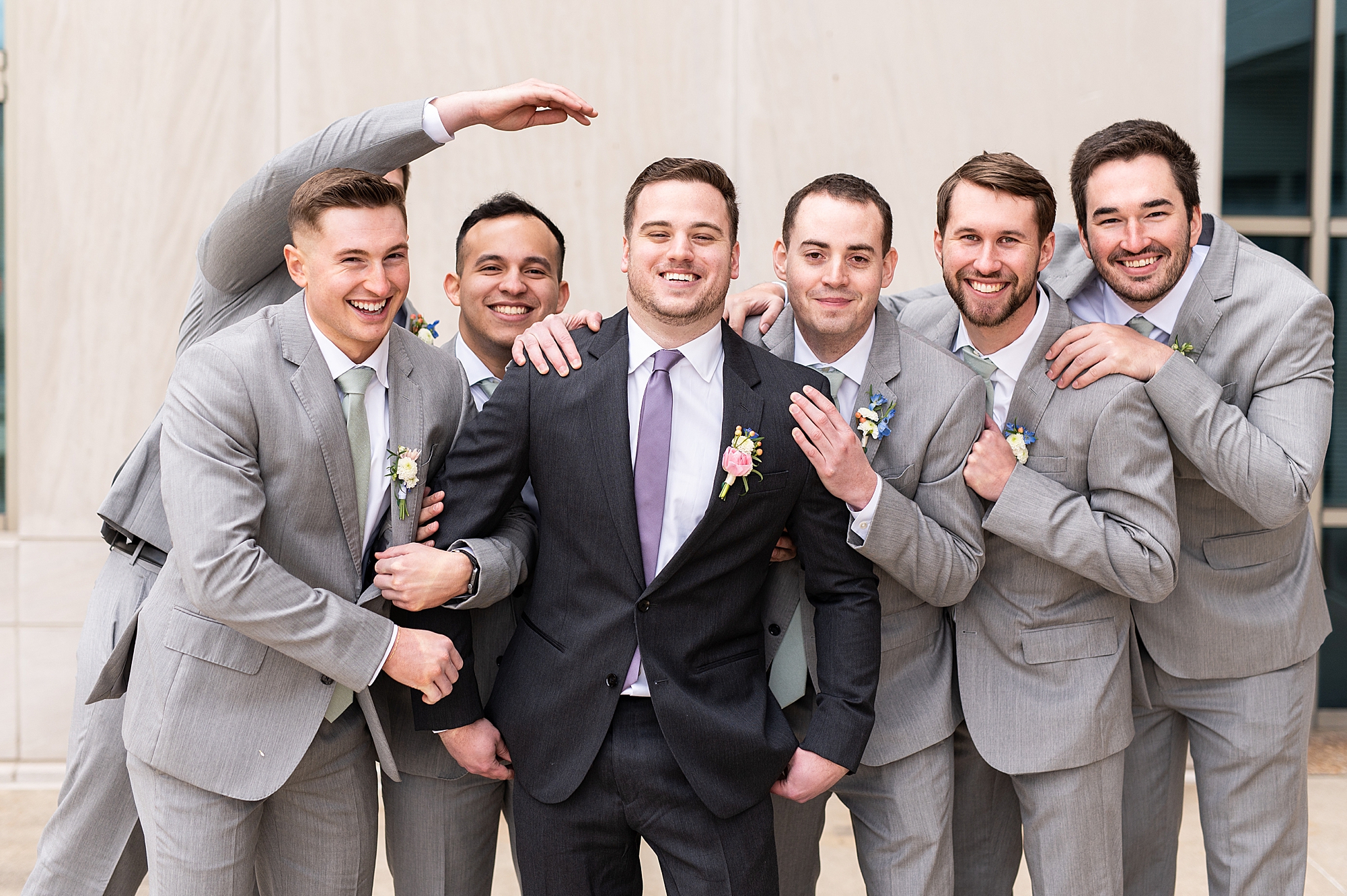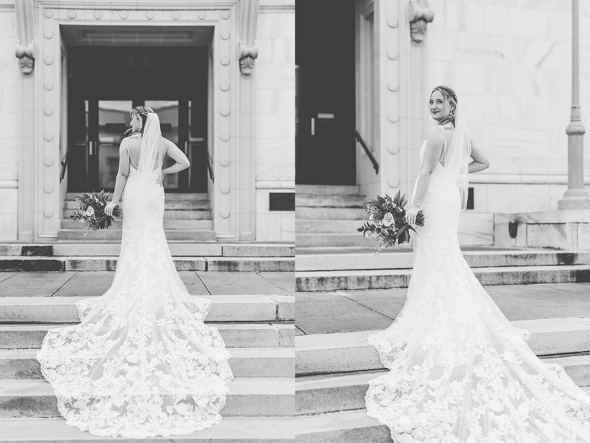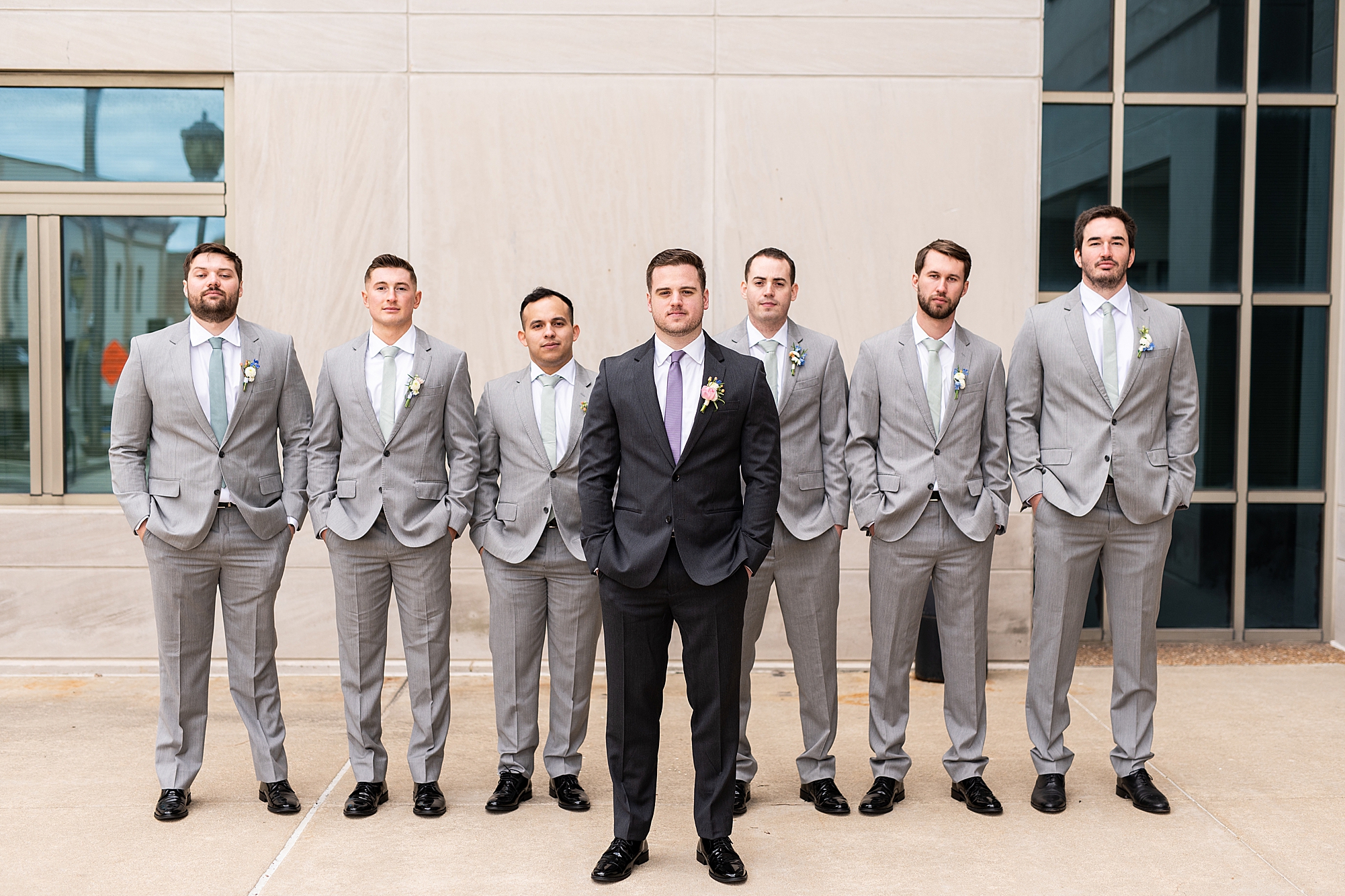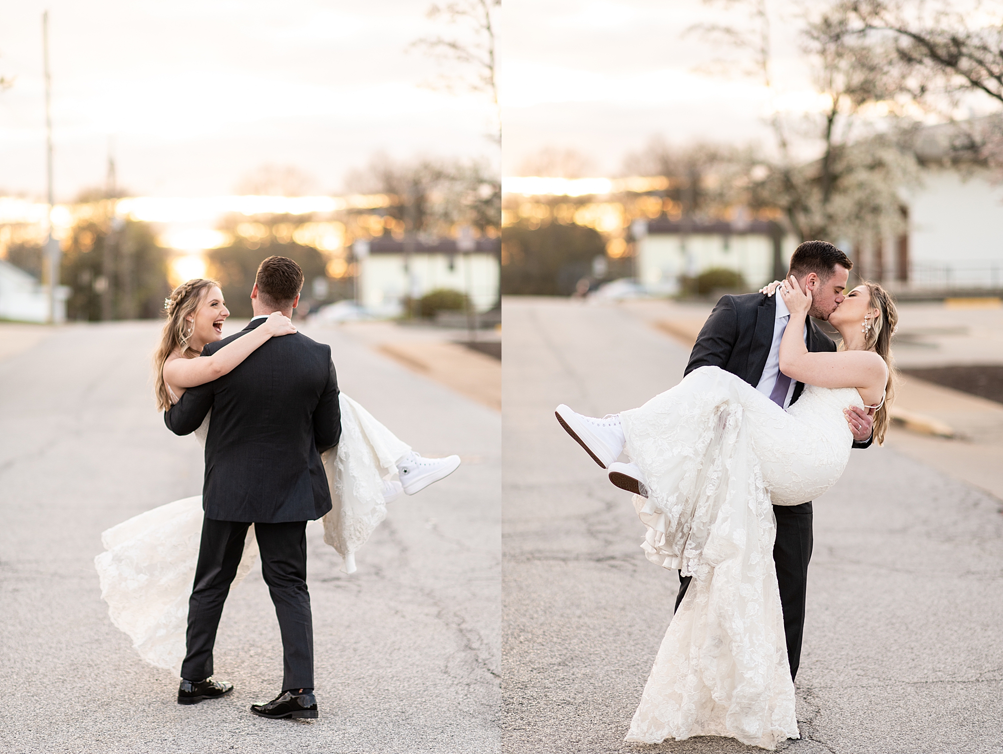 They chose the Ink House in Edwardsville for their venue which was absolutely beautiful and a perfect space for them to welcome all of their close family and friends. The prediction was for clouds and wind throughout the day, but the sun decided to make an appearance giving way to a great spring day. After Kristen spent the morning getting ready with her best friends and mom, we traveled to Edwardsville so she could share a first look with Cameron. They were so sweet seeing each other for the first time, smiles never left their faces. They read private vows to each other and then it was time for portraits! Downtown Edwardsville had some great backdrops and their bridal party came along for some really fun shots!