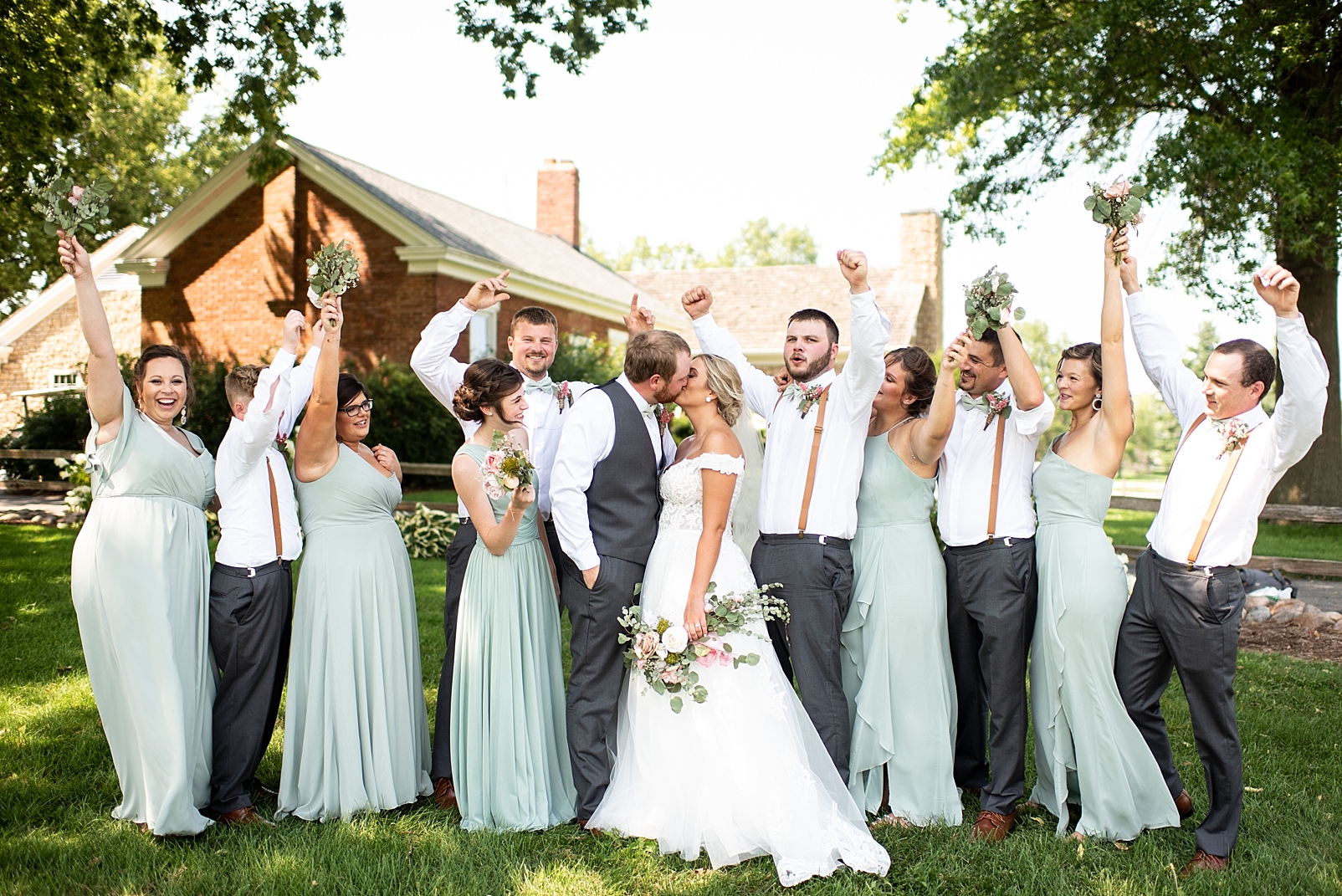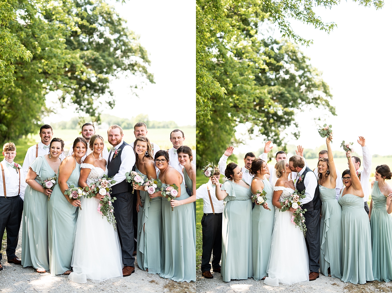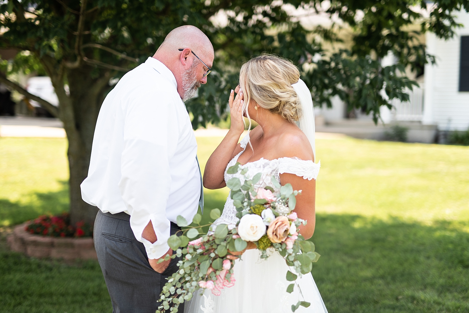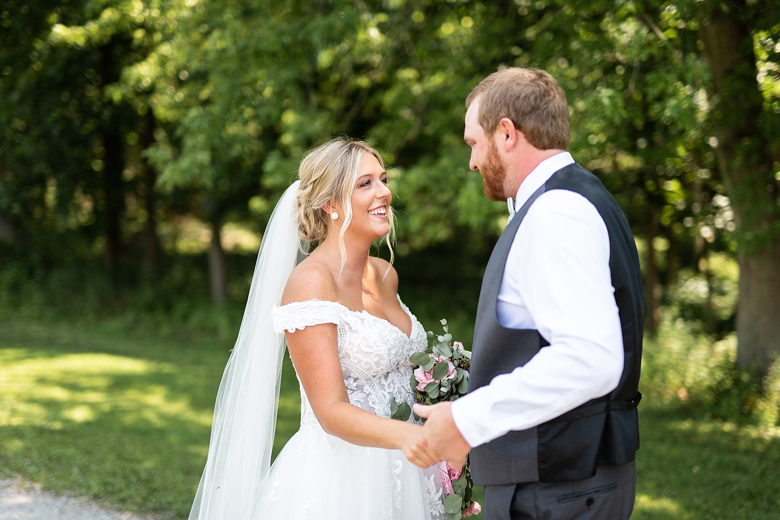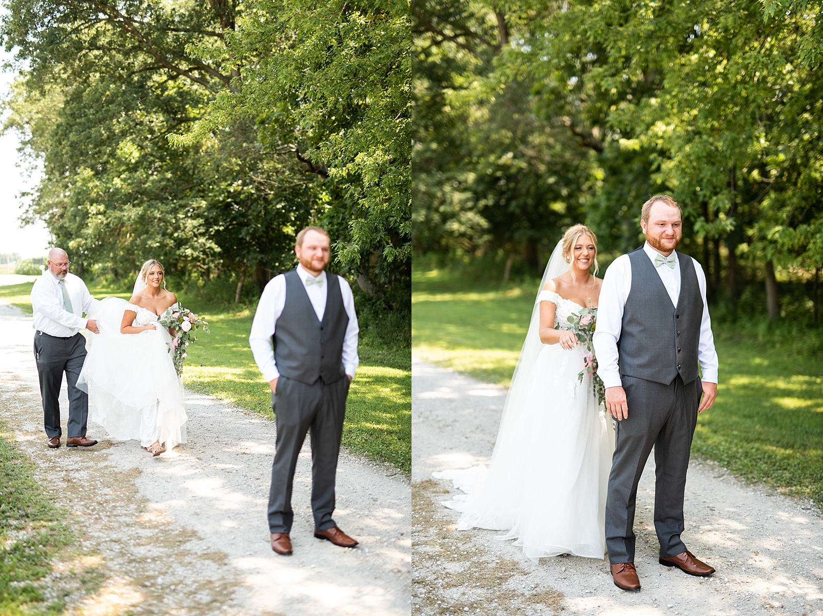 I have been lookin forward to Madison and Jake’s wedding for awhile now. It ended up being a warmer July day, but a nice breeze helped keep it mild! Madison has to be one of the most laid back brides I ever had. She and Jake were so calm and just enjoyed every part of their special day! Madison looked absolutely stunning getting ready and finally it was time to have her first looks. First, with her dad, definitely the most emotional person all day. He was so happy to see her and share this special moment. Then, he drove her up the lane from Jake’s parents house to Madison and Jake’s house to meet Jake for their first look. Jake seemed a little nervous, but was so happy when he finally got to see Madison. We then took the time to grab some photos of them right in their front yard. It was so special to them. We added their bridal party for some photos and then they all hopped on a party bus to head to the Rail Golf Course for their ceremony and reception.