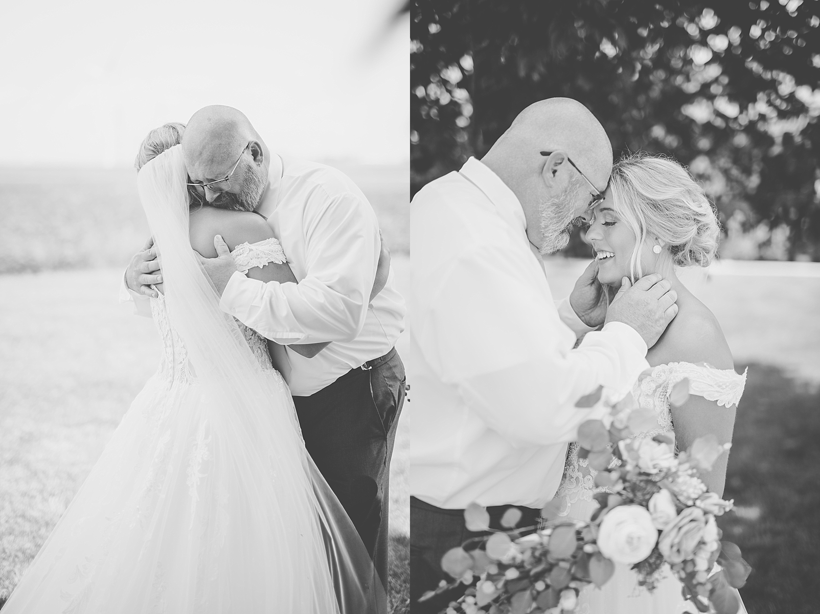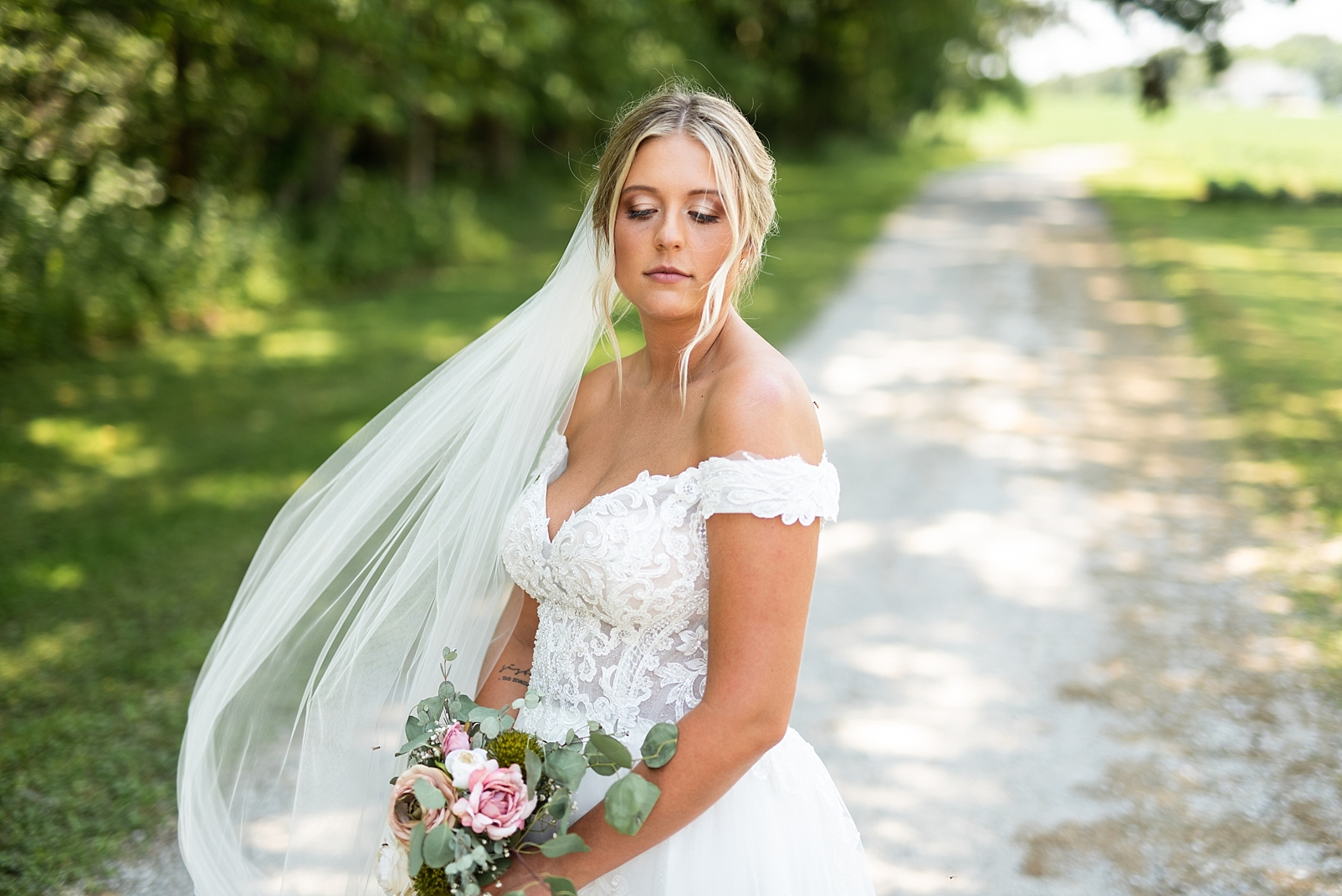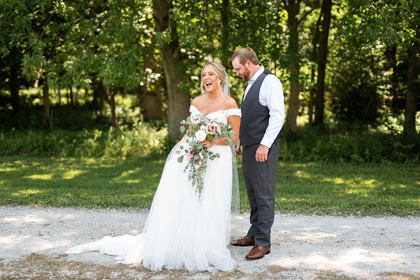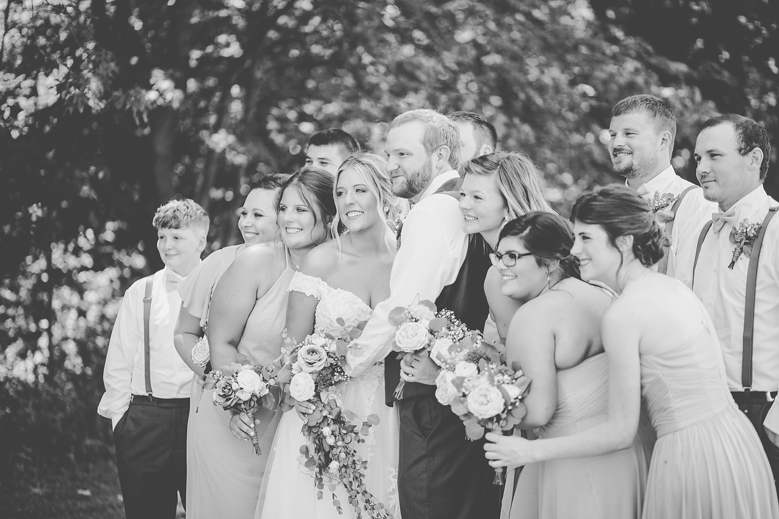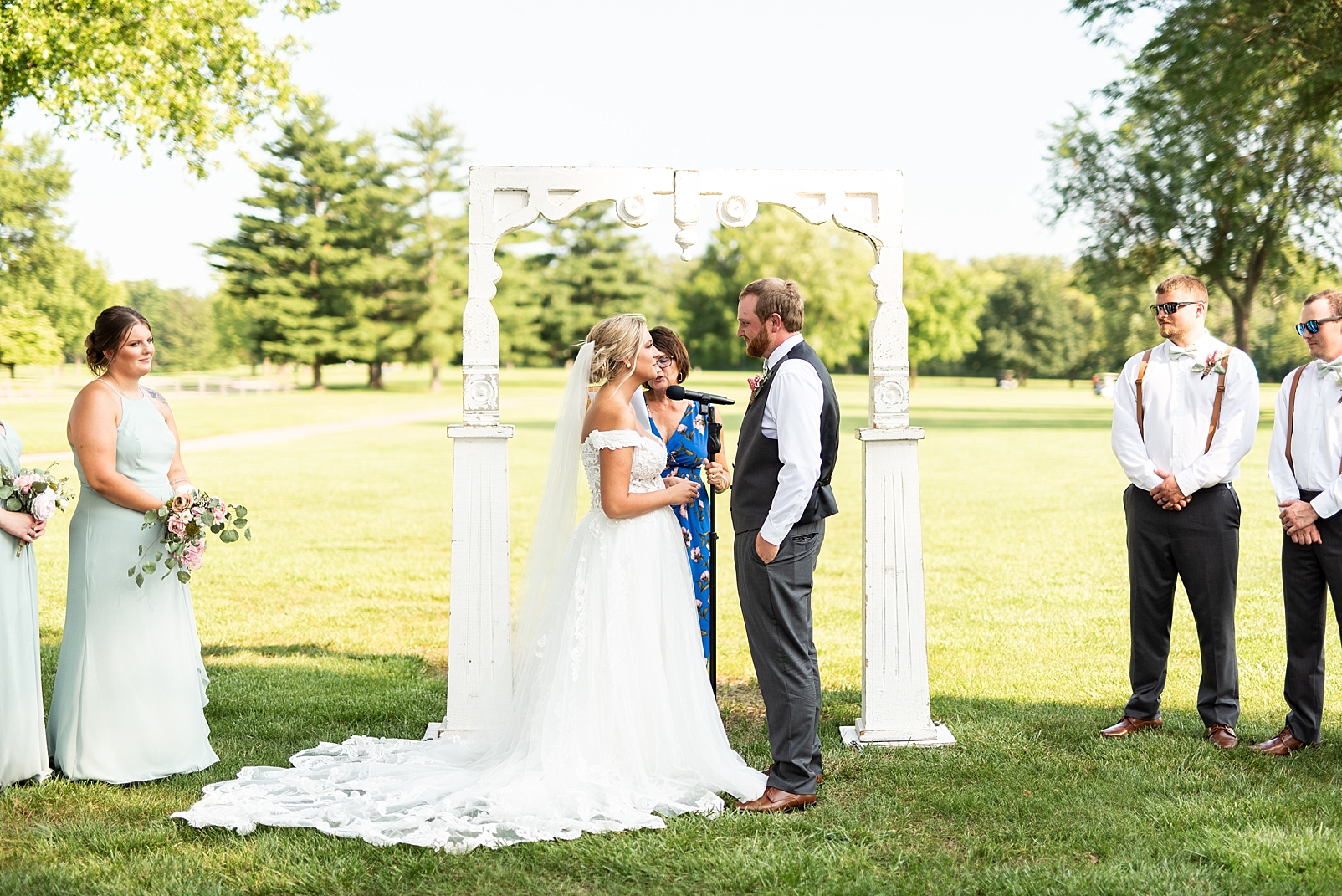 I have been lookin forward to Madison and Jake’s wedding for awhile now. It ended up being a warmer July day, but a nice breeze helped keep it mild! Madison has to be one of the most laid back brides I ever had. She and Jake were so calm and just enjoyed every part of their special day! Madison looked absolutely stunning getting ready and finally it was time to have her first looks. First, with her dad, definitely the most emotional person all day. He was so happy to see her and share this special moment. Then, he drove her up the lane from Jake’s parents house to Madison and Jake’s house to meet Jake for their first look. Jake seemed a little nervous, but was so happy when he finally got to see Madison. We then took the time to grab some photos of them right in their front yard. It was so special to them. We added their bridal party for some photos and then they all hopped on a party bus to head to the Rail Golf Course for their ceremony and reception.