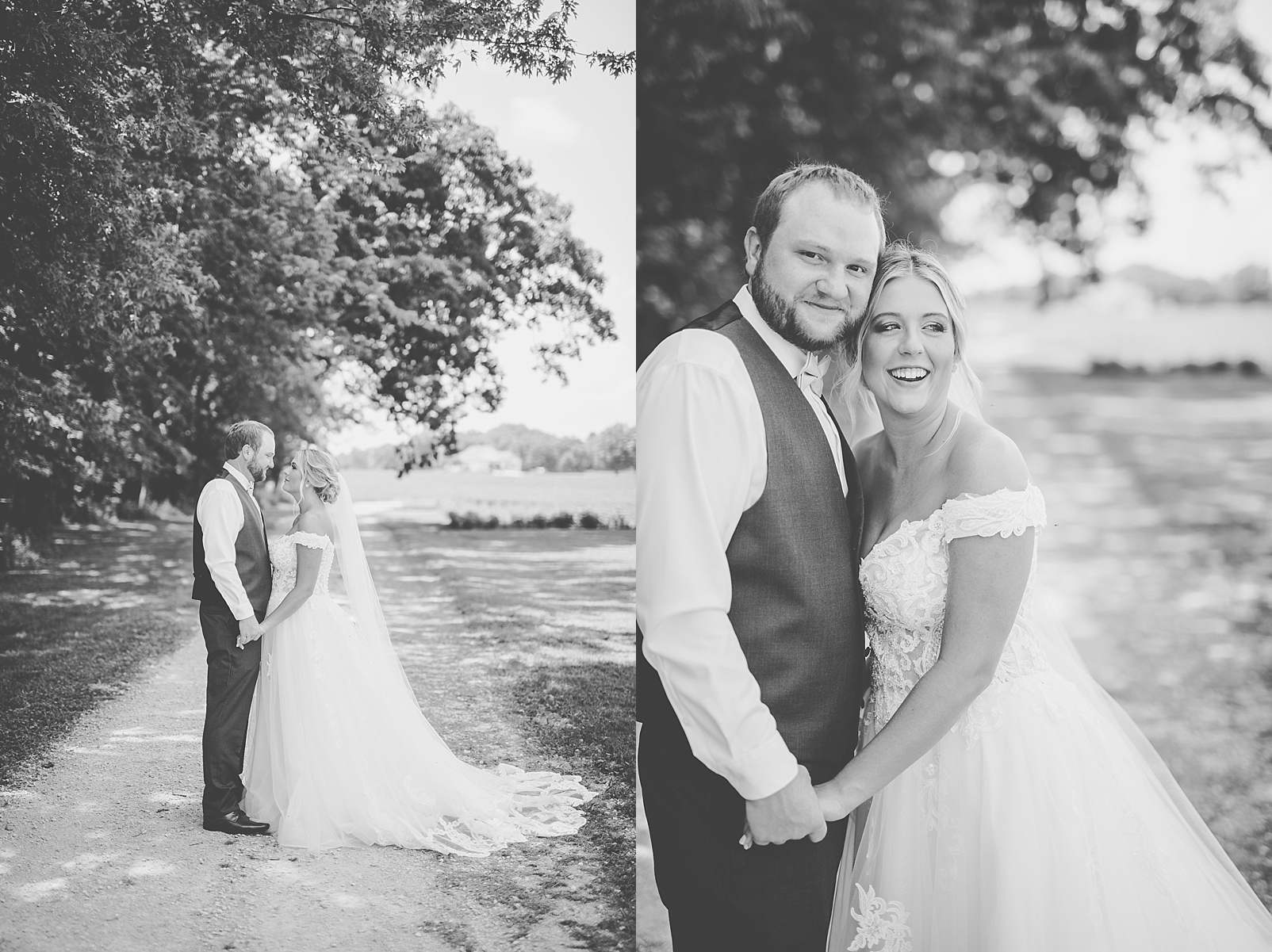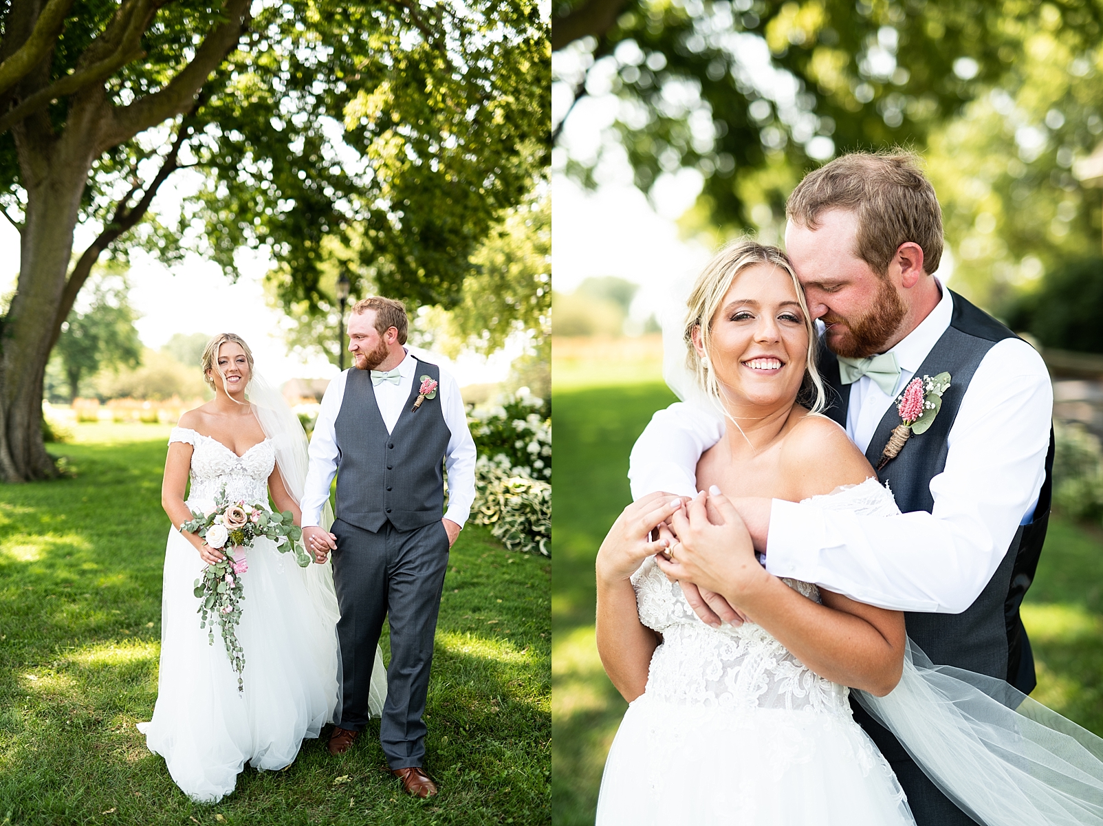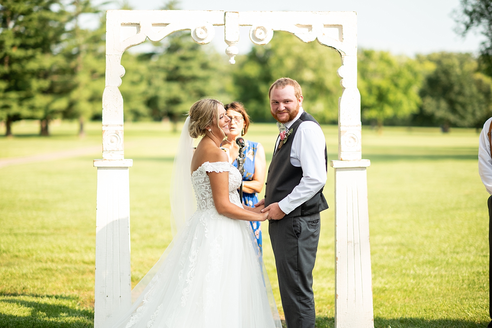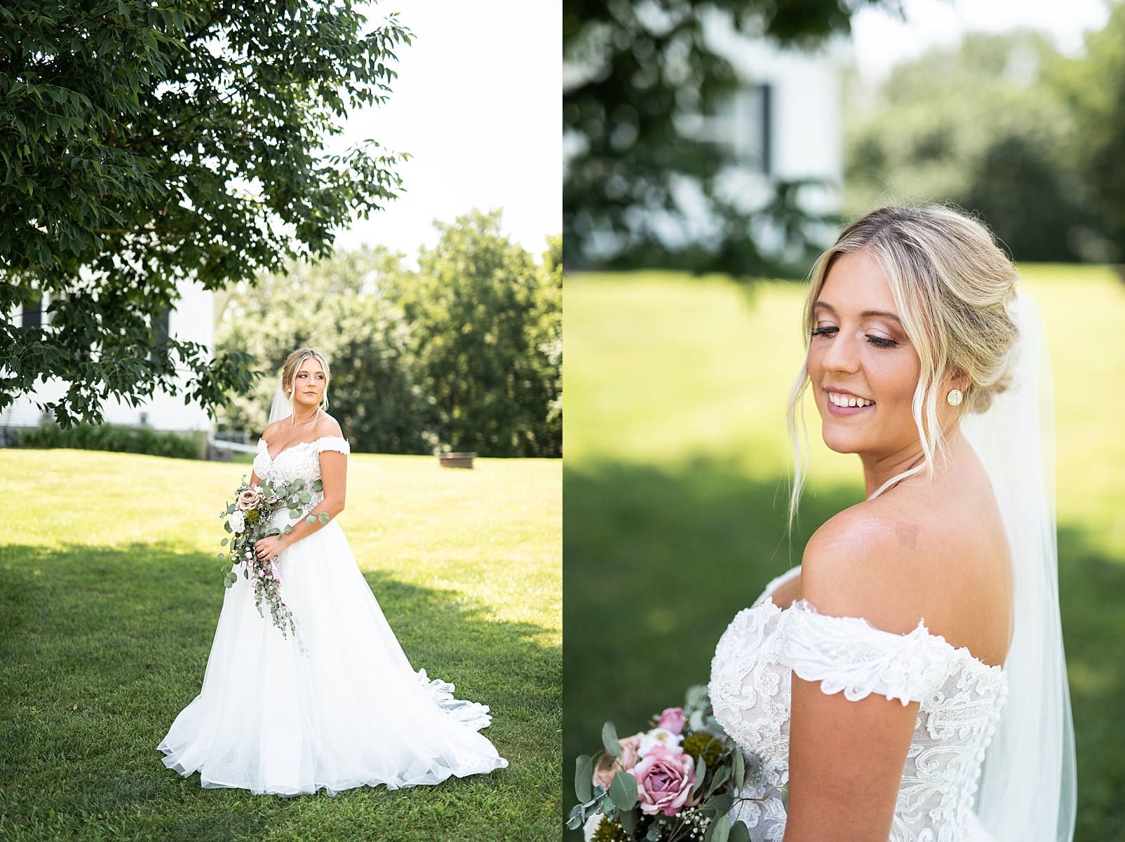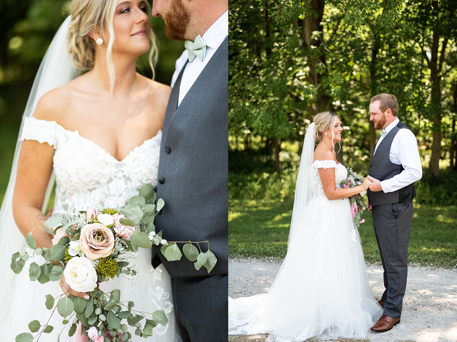 I have been lookin forward to Madison and Jake’s wedding for awhile now. It ended up being a warmer July day, but a nice breeze helped keep it mild! Madison has to be one of the most laid back brides I ever had. She and Jake were so calm and just enjoyed every part of their special day! Madison looked absolutely stunning getting ready and finally it was time to have her first looks. First, with her dad, definitely the most emotional person all day. He was so happy to see her and share this special moment. Then, he drove her up the lane from Jake’s parents house to Madison and Jake’s house to meet Jake for their first look. Jake seemed a little nervous, but was so happy when he finally got to see Madison. We then took the time to grab some photos of them right in their front yard. It was so special to them. We added their bridal party for some photos and then they all hopped on a party bus to head to the Rail Golf Course for their ceremony and reception.