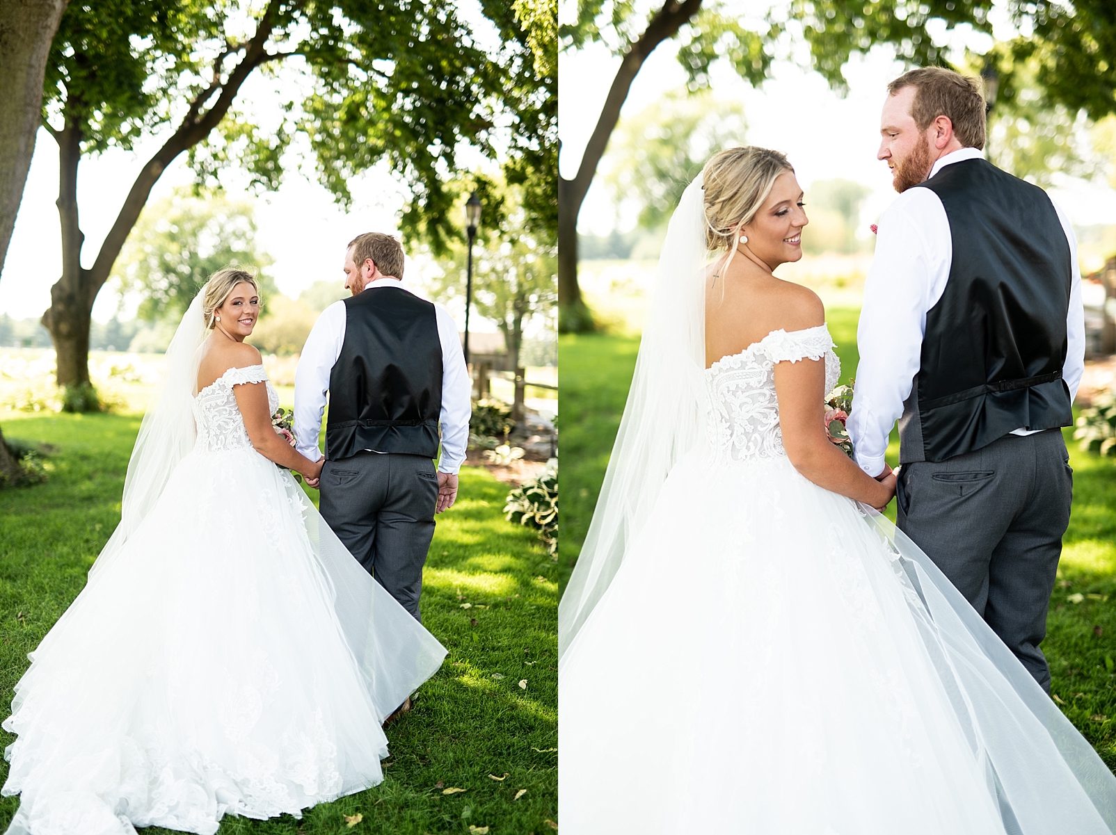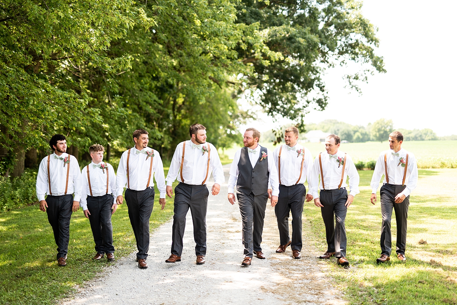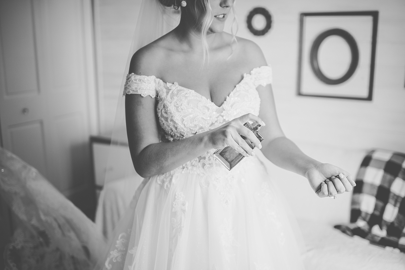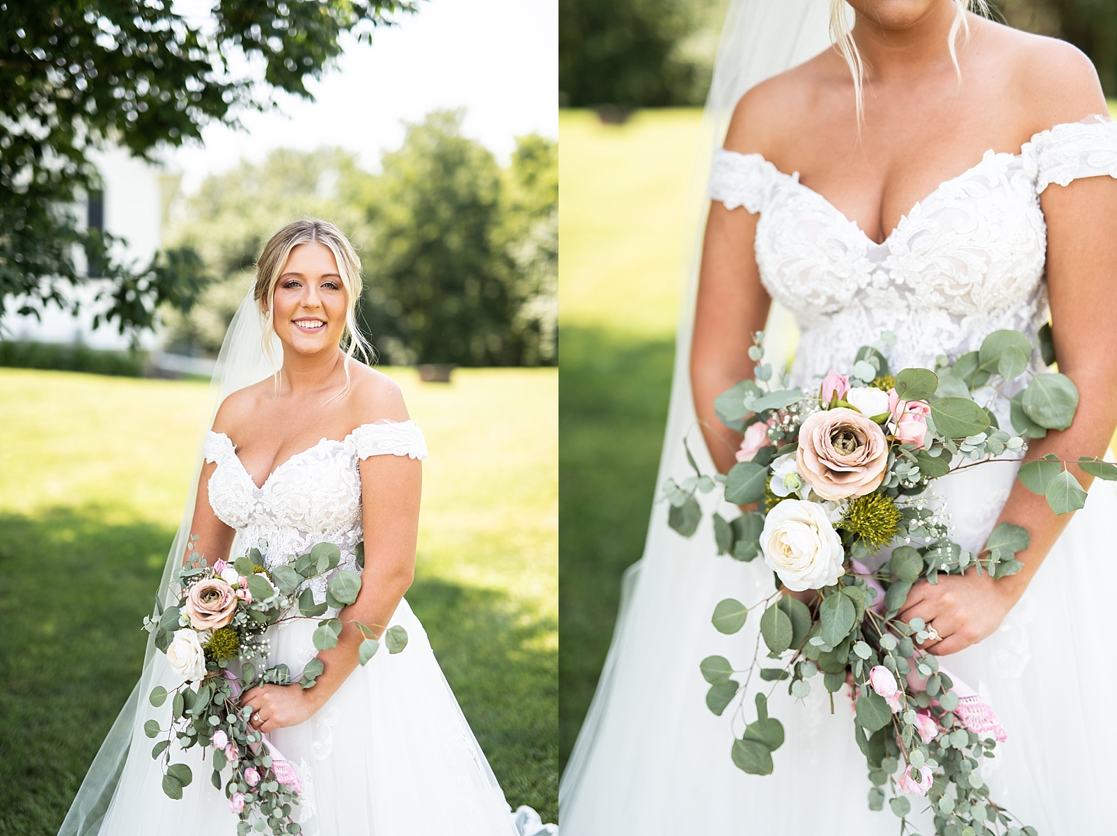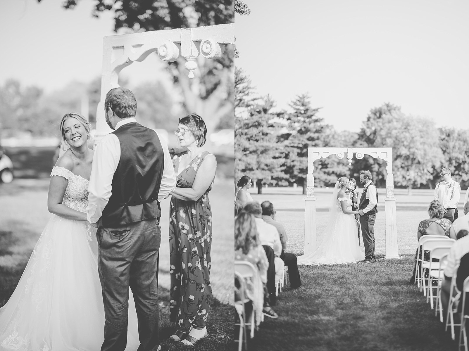 I have been lookin forward to Madison and Jake’s wedding for awhile now. It ended up being a warmer July day, but a nice breeze helped keep it mild! Madison has to be one of the most laid back brides I ever had. She and Jake were so calm and just enjoyed every part of their special day! Madison looked absolutely stunning getting ready and finally it was time to have her first looks. First, with her dad, definitely the most emotional person all day. He was so happy to see her and share this special moment. Then, he drove her up the lane from Jake’s parents house to Madison and Jake’s house to meet Jake for their first look. Jake seemed a little nervous, but was so happy when he finally got to see Madison. We then took the time to grab some photos of them right in their front yard. It was so special to them. We added their bridal party for some photos and then they all hopped on a party bus to head to the Rail Golf Course for their ceremony and reception.