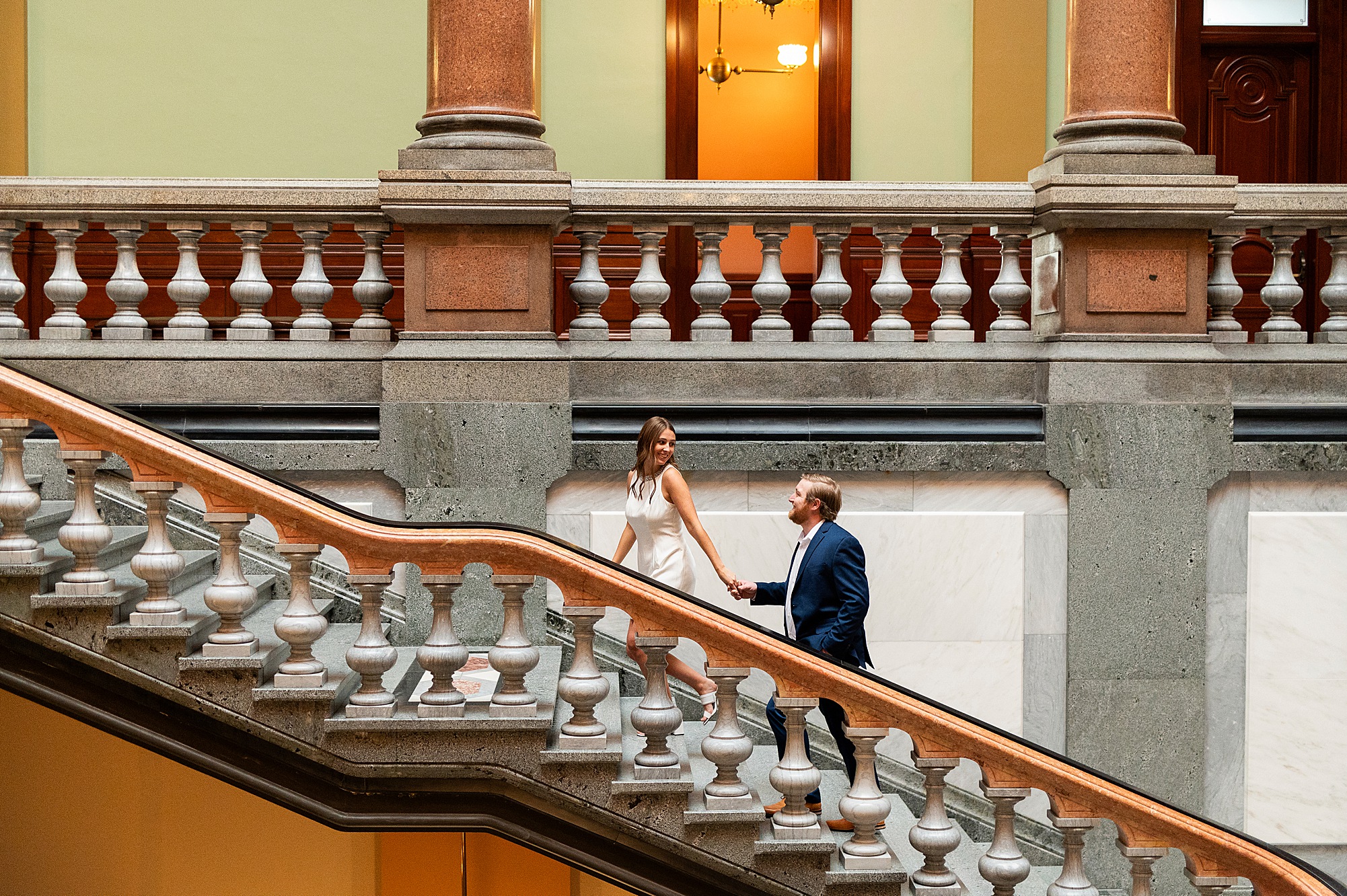 Madison and Nathan told me they thought they were so awkward in front of the camera. Then they SHOWED UP for their session! I felt like I was hanging out with two old friends and had a blast getting to know them both. Thankfully they chose to take half of their engagement photos inside of the beautiful state capitol because it was about 20 degrees out. But they also killed the outdoor photos in the freshly blanketed snow. These two have deep roots in hockey and even had one of their first dates at a Blues game so I knew they could handle the cold flawlessly! Nathan kept Madison laughing the entire time and I loved photographing these two to celebrate their engagement. I cannot wait to see them again this fall for their wedding day!