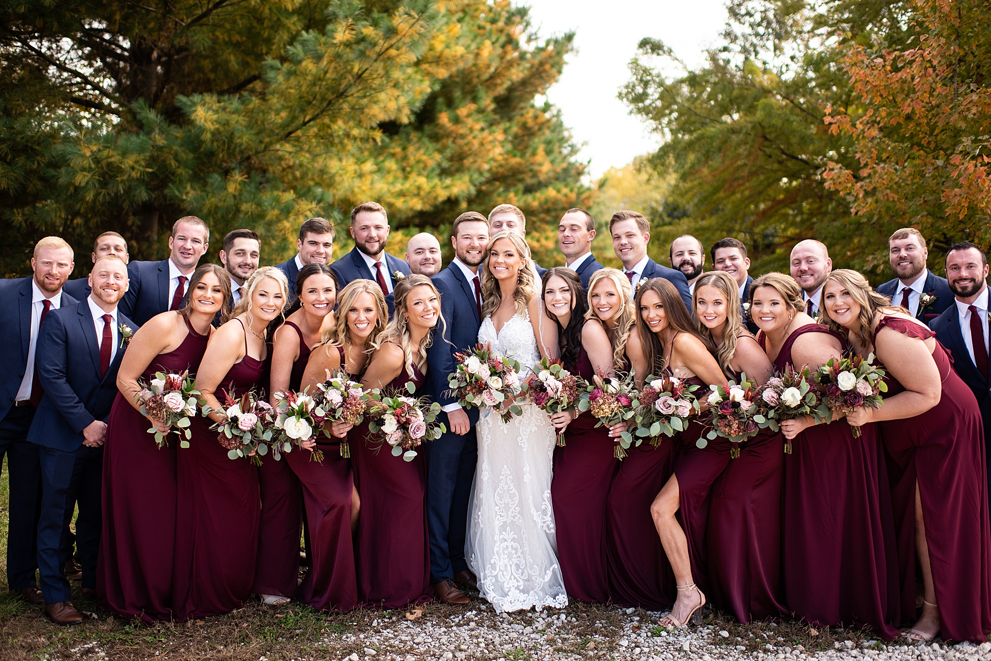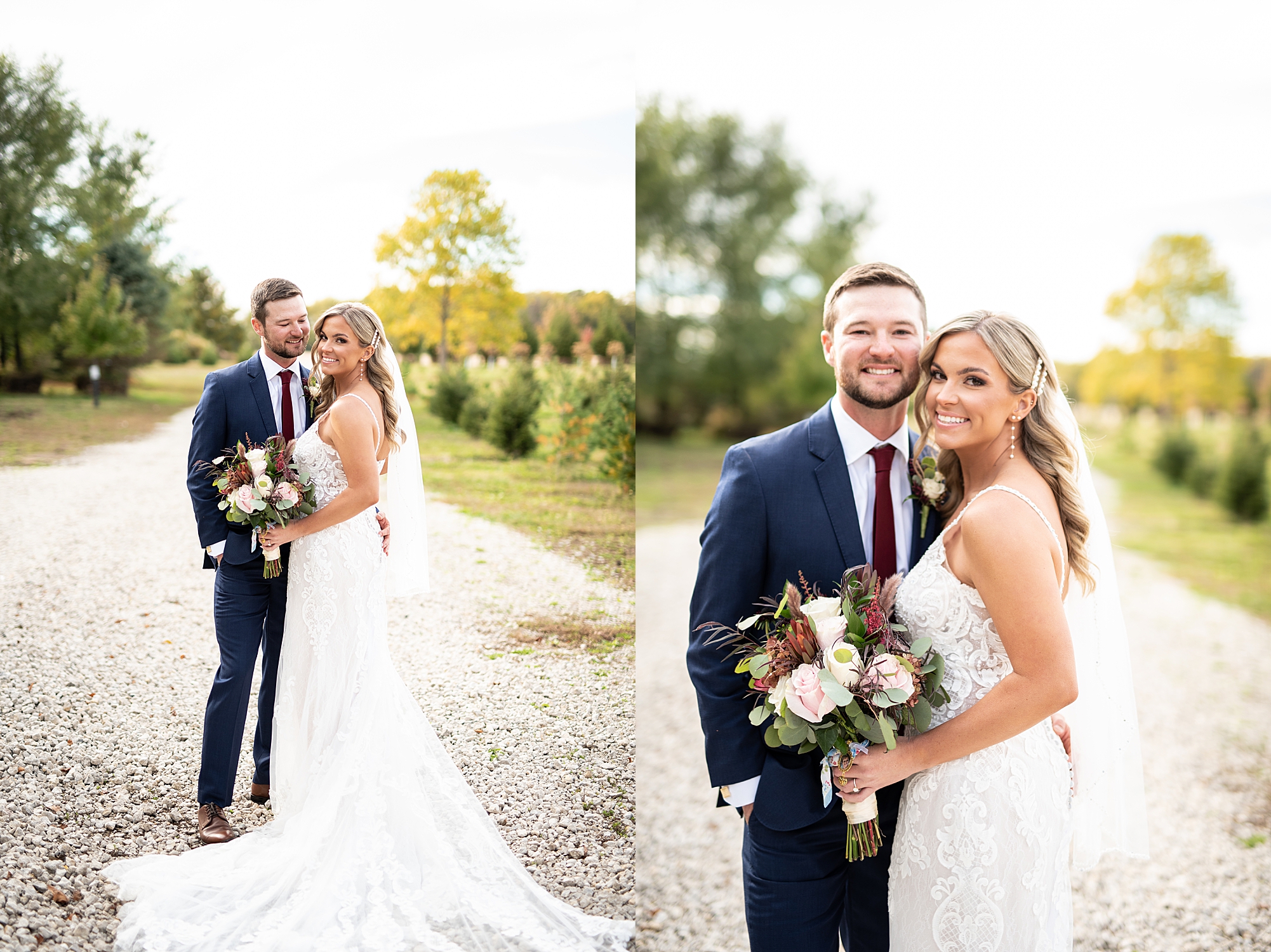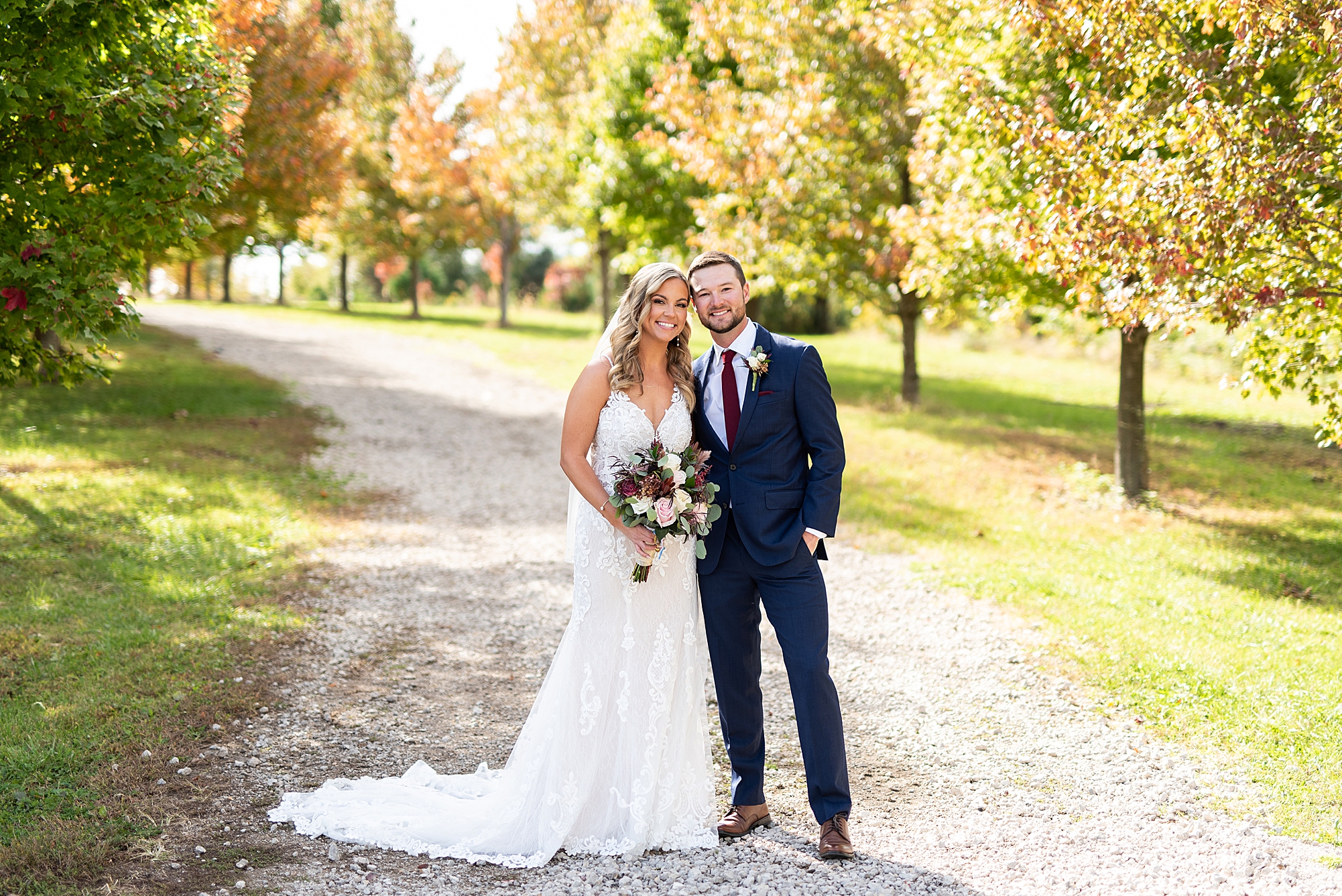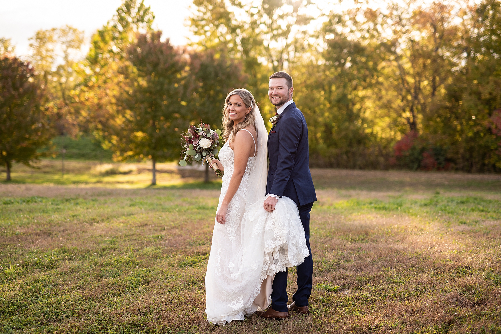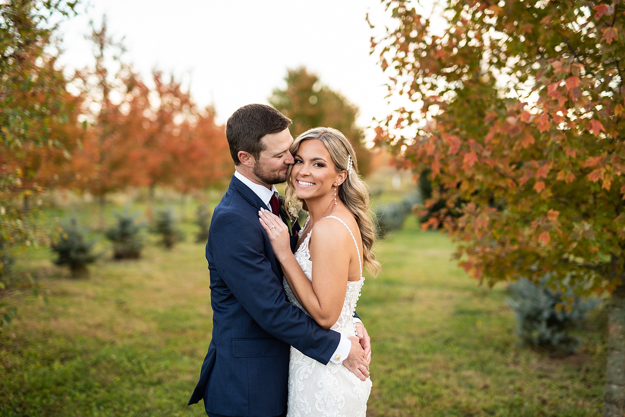 Morgan spent the morning getting ready at home with her bridesmaids and then her mom helped her put on her final touches before it was time to go meet Brett. Brett got ready at the venue, Paul Tree Farms with his groomsmen while he waiting for Morgan’s arrival. They shared a sweet first look overlooking the pond, both of them smiling so big when they saw each other! It was an absolutely beautiful fall day, full of sunshine and warm weather. We spent that afternoon taking photos of them together and then with their wedding party who truly made the whole day so much fun!