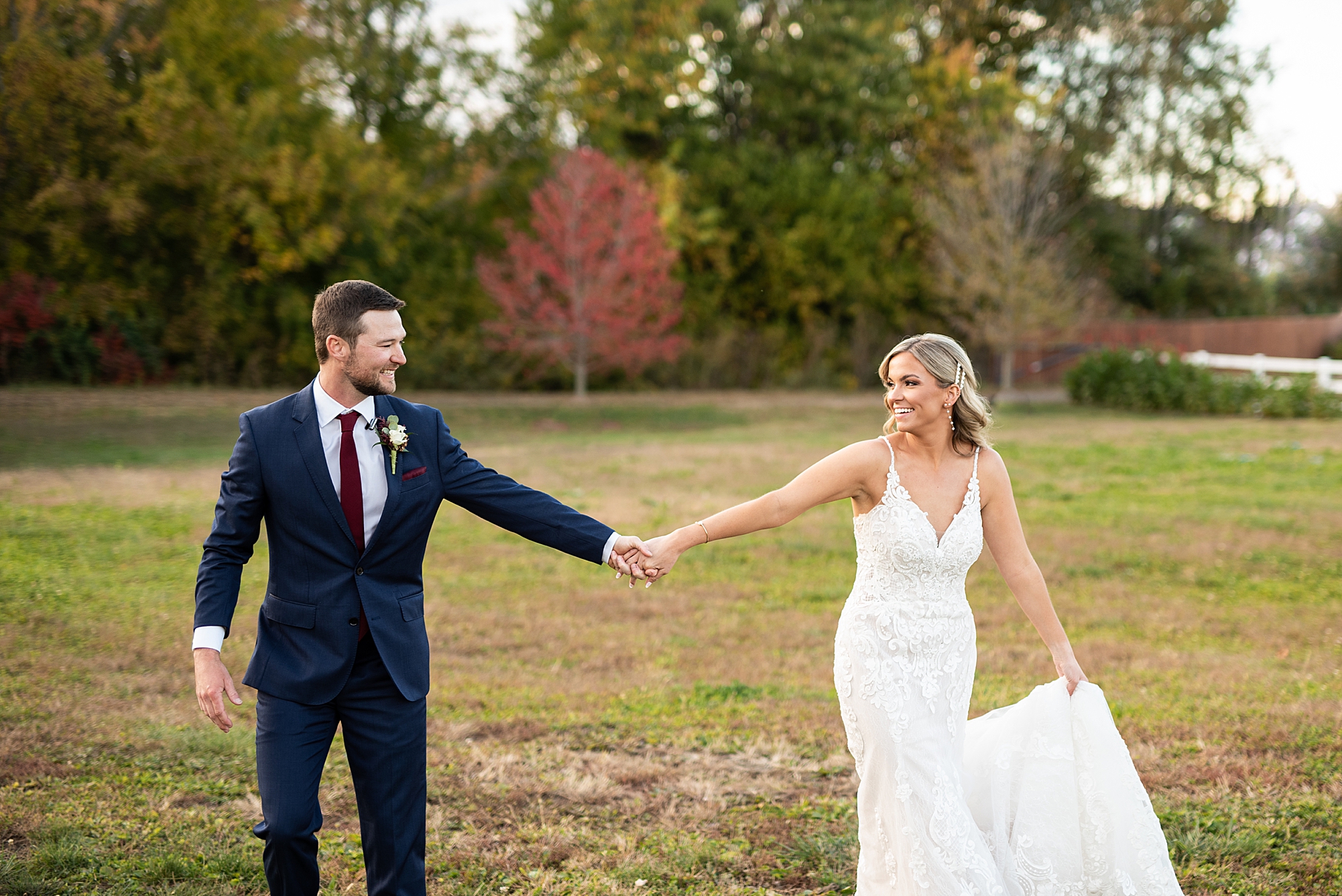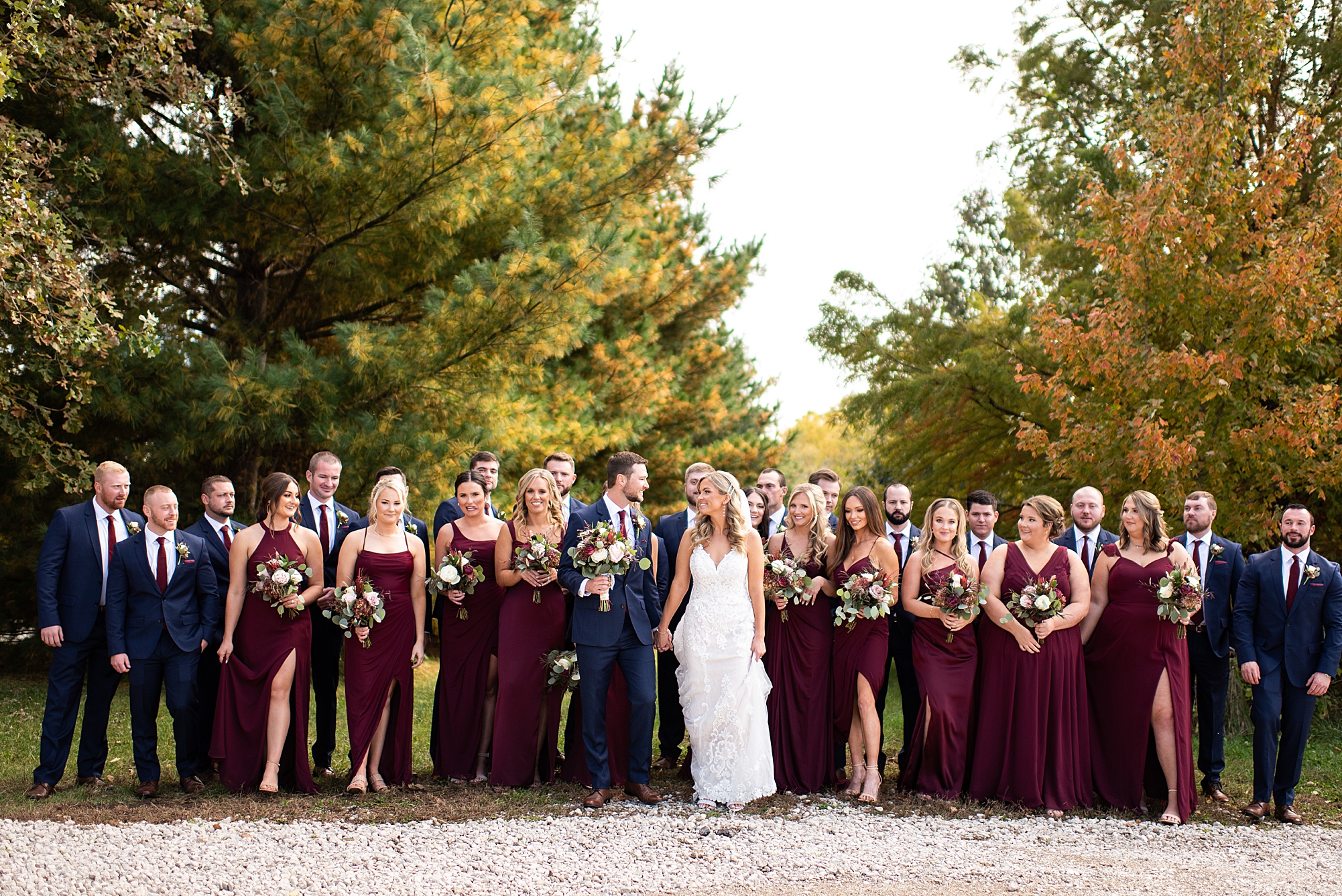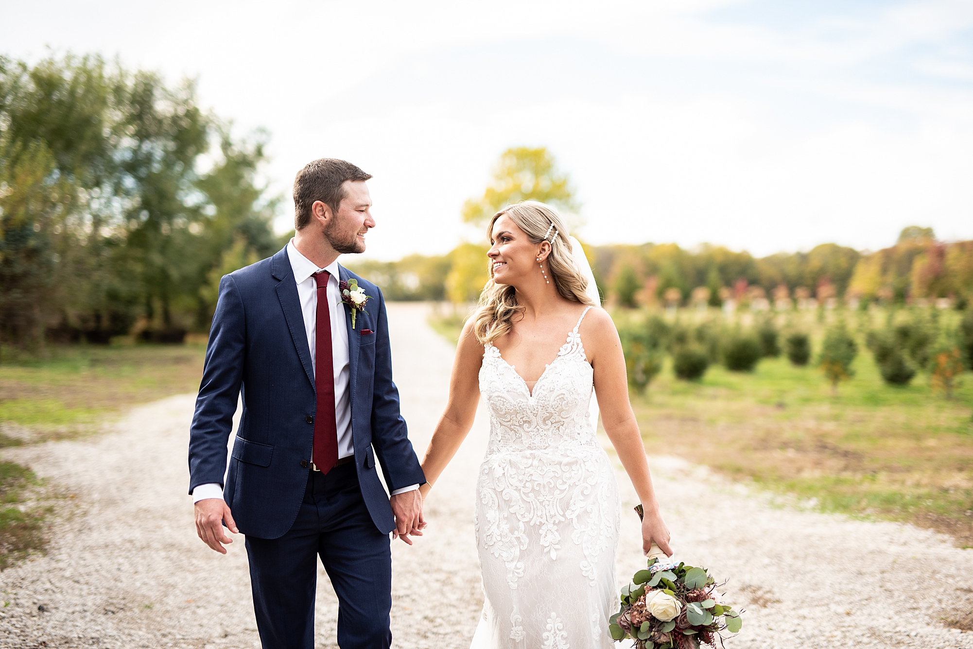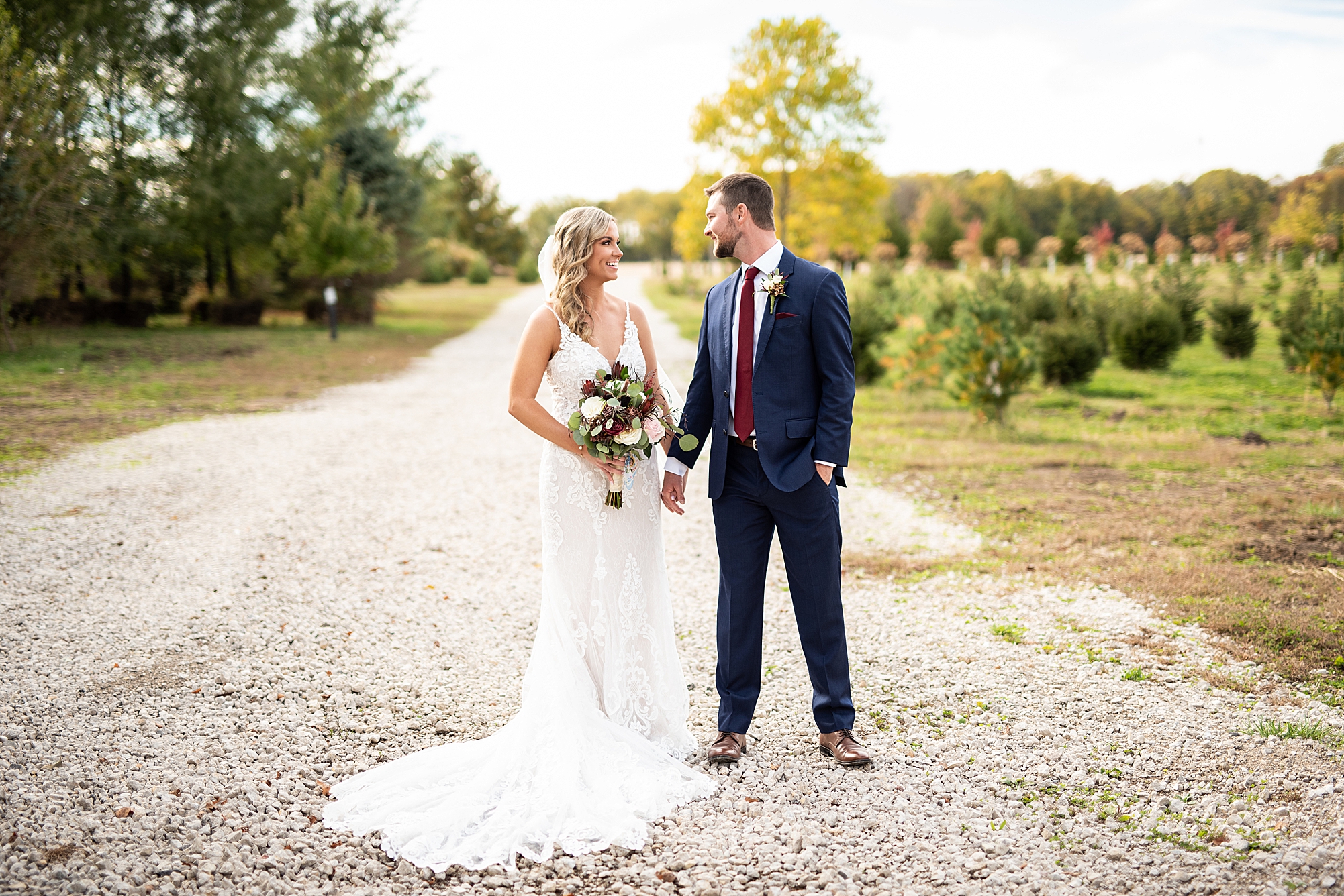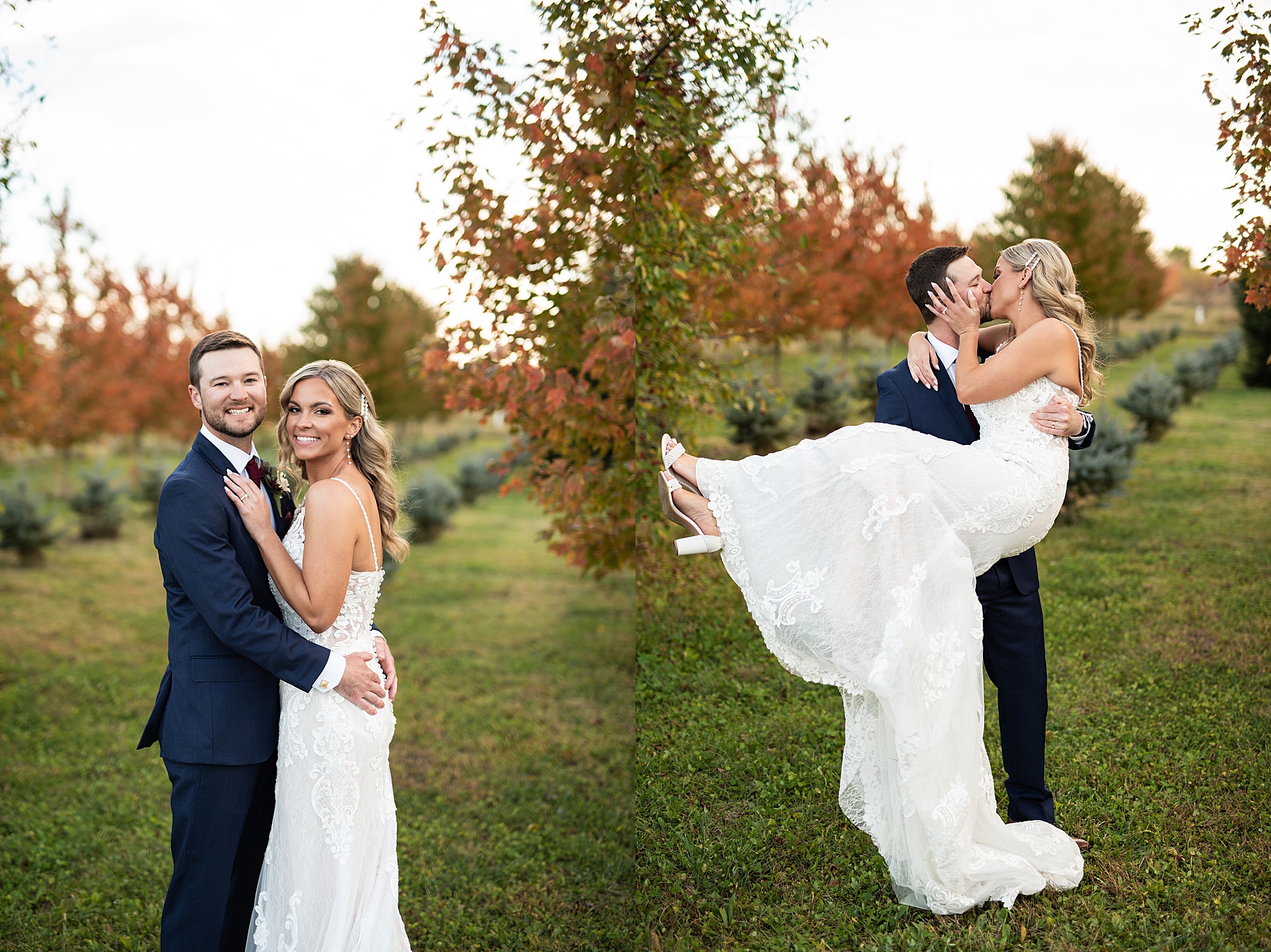 Morgan spent the morning getting ready at home with her bridesmaids and then her mom helped her put on her final touches before it was time to go meet Brett. Brett got ready at the venue, Paul Tree Farms with his groomsmen while he waiting for Morgan’s arrival. They shared a sweet first look overlooking the pond, both of them smiling so big when they saw each other! It was an absolutely beautiful fall day, full of sunshine and warm weather. We spent that afternoon taking photos of them together and then with their wedding party who truly made the whole day so much fun!